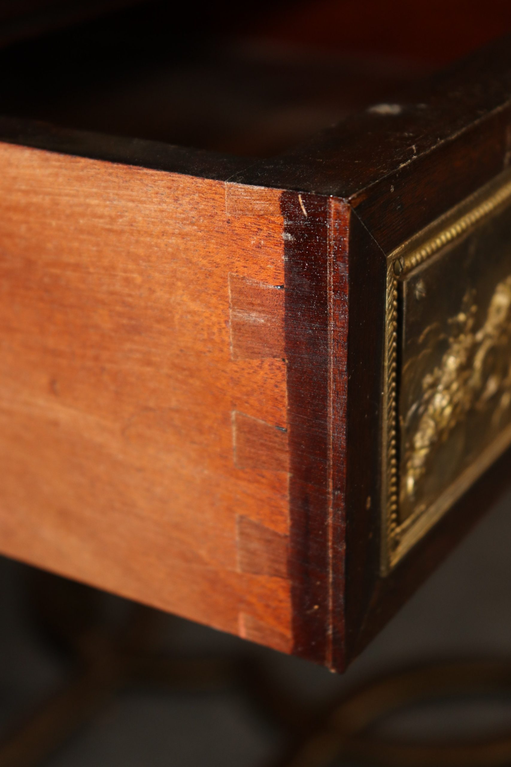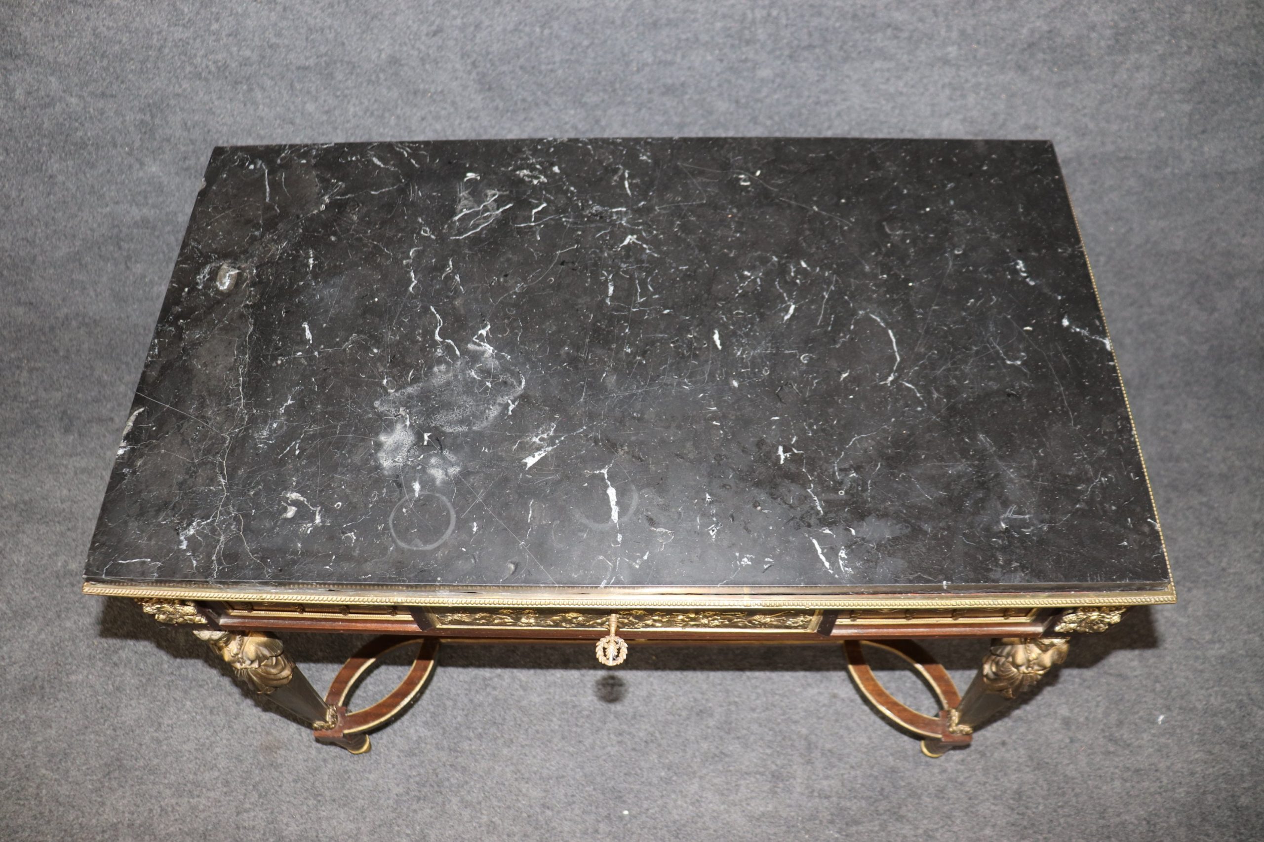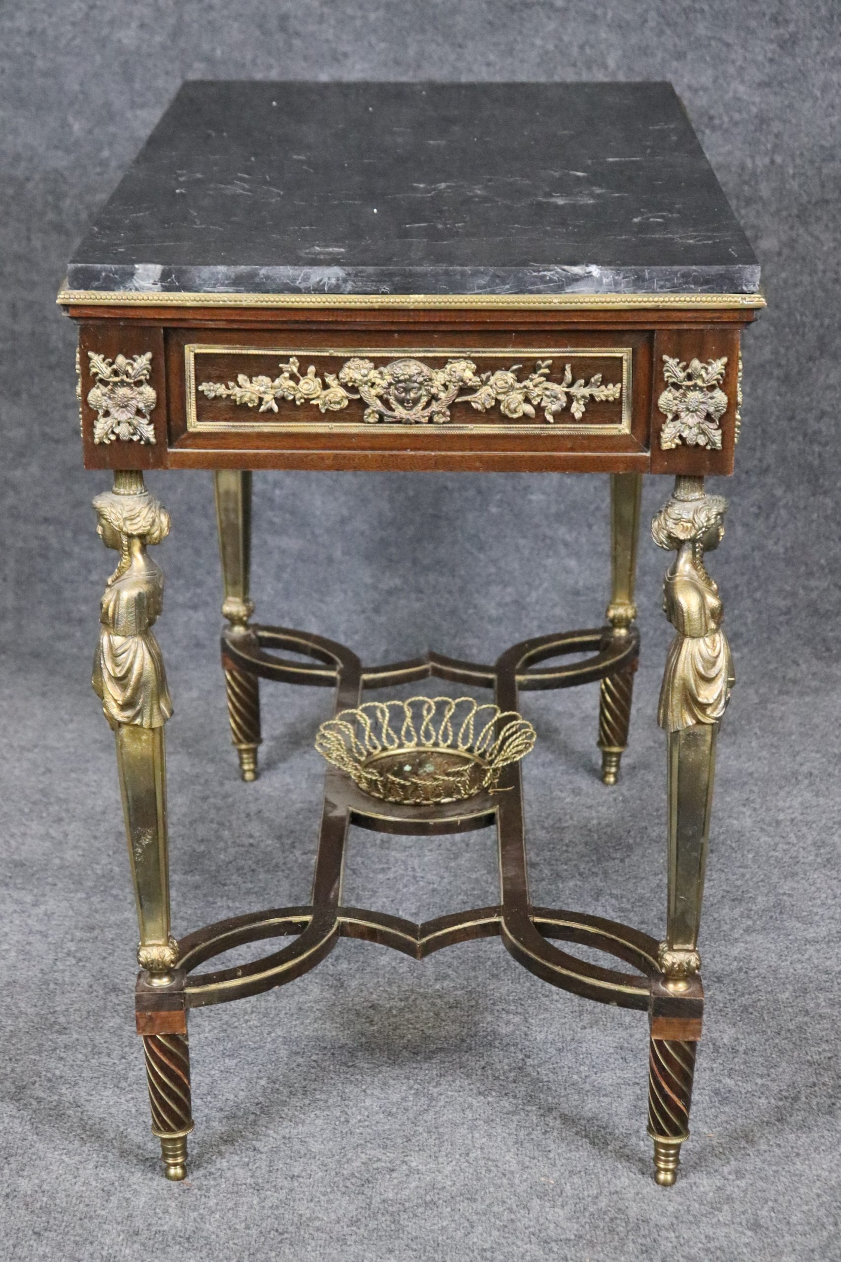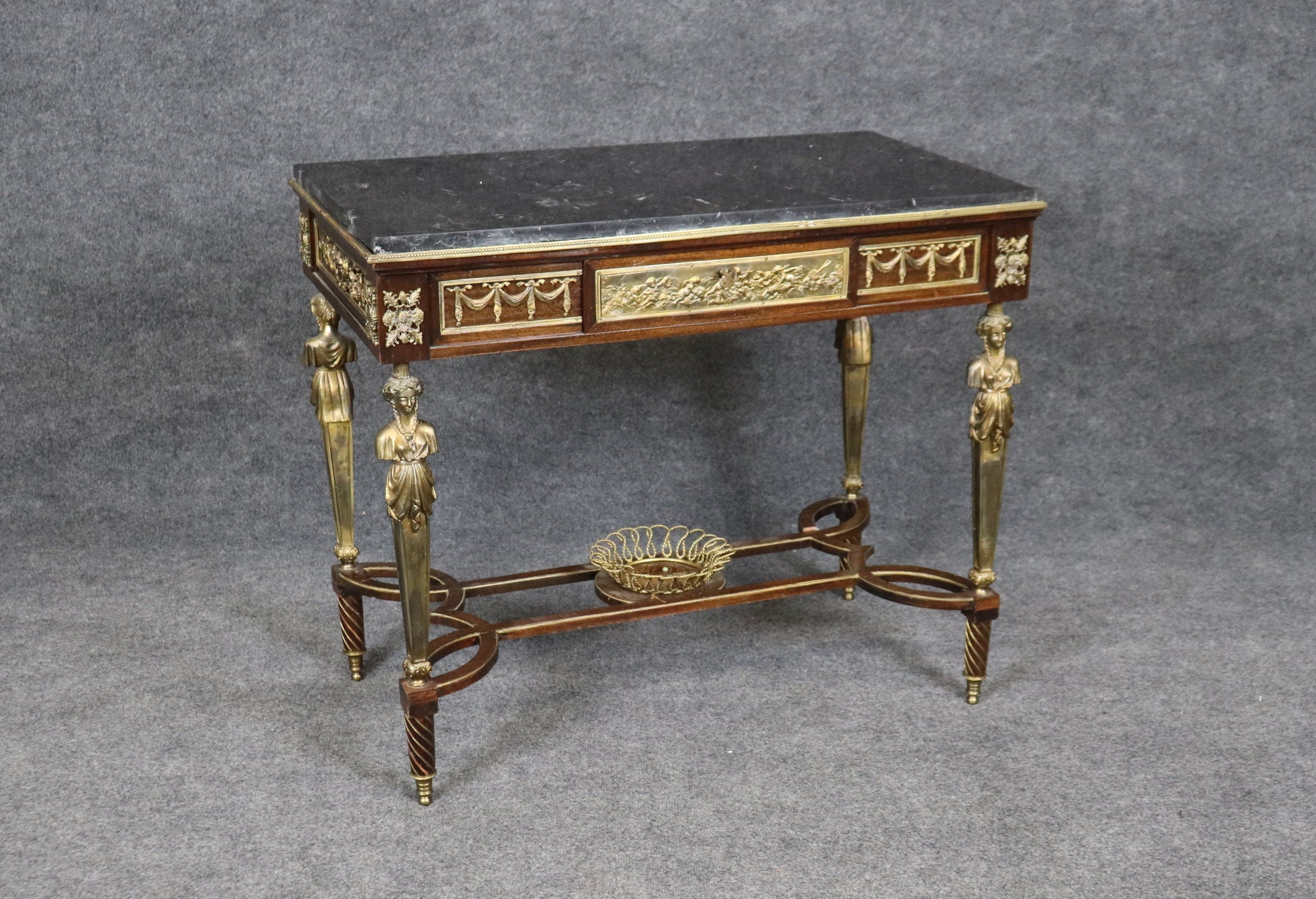 This Vintage Louis XVI style style marble top accent table, in the manner of Adam Weisweiler, is of the highest quality! Adam Weisweiler was a pre-eminent French master cabinetmaker in the Louis XVI period, working in Paris. If you look at the photos provided, you can see the attention to detail in the figural supports. This table is bound to bring a sense of luxury and sophistication into your living room, office or place of choosing and will surely be a conversation starter at your next gathering. Antique Furniture and vintage pieces have stood the test of time and this marble top table is no exception! With its quality materials and good craftsmanship this table will last you and your family for many years to come. The table is in vintage used condition with finish loss, surface scratches and tarnishing to the metal. This is an opportunity to own an extremely rare item in your home or place of choosing.