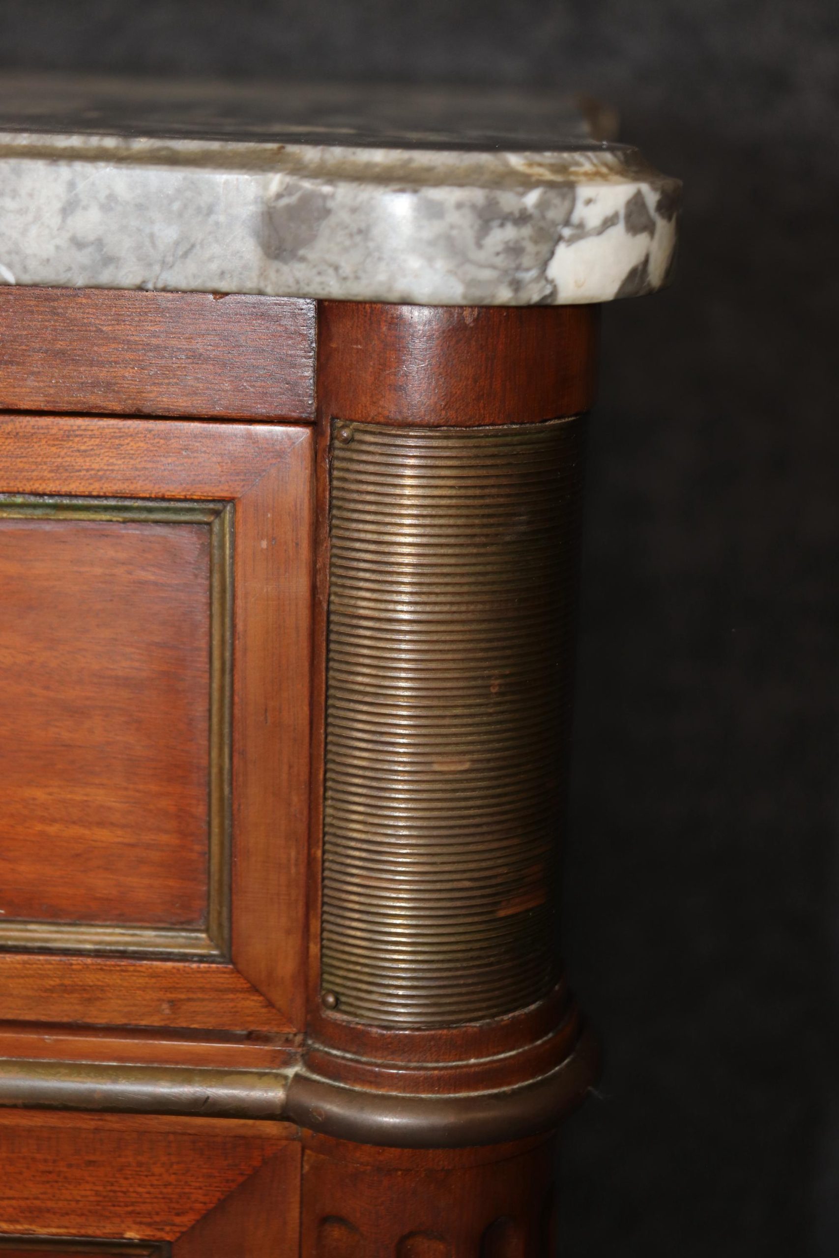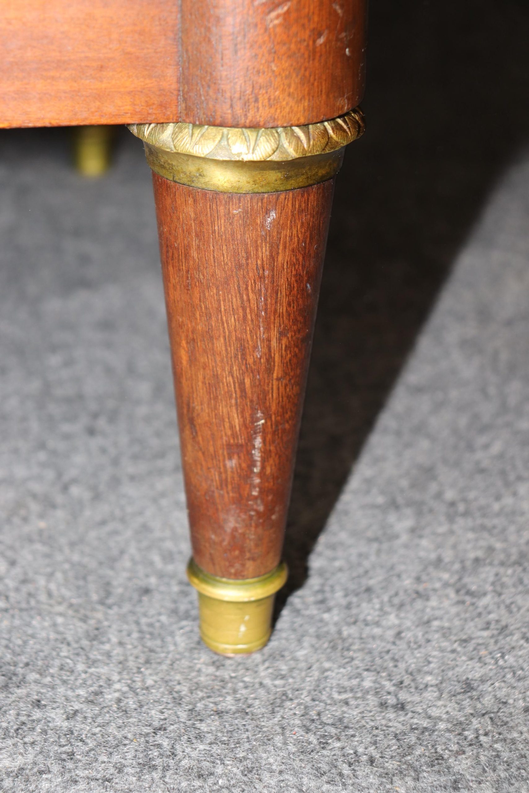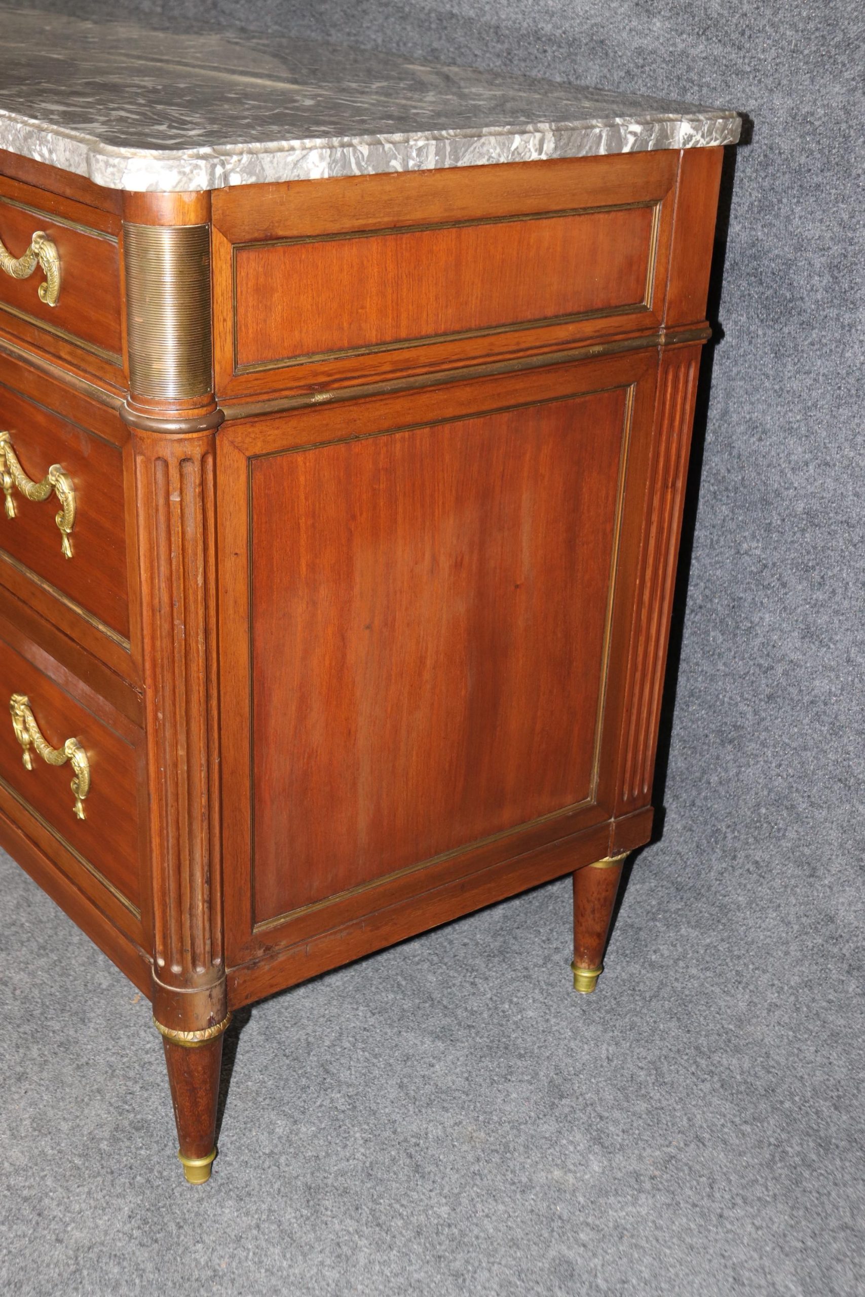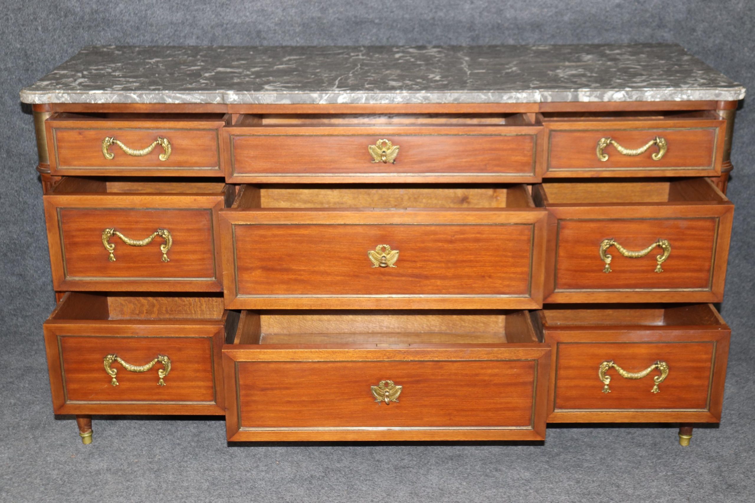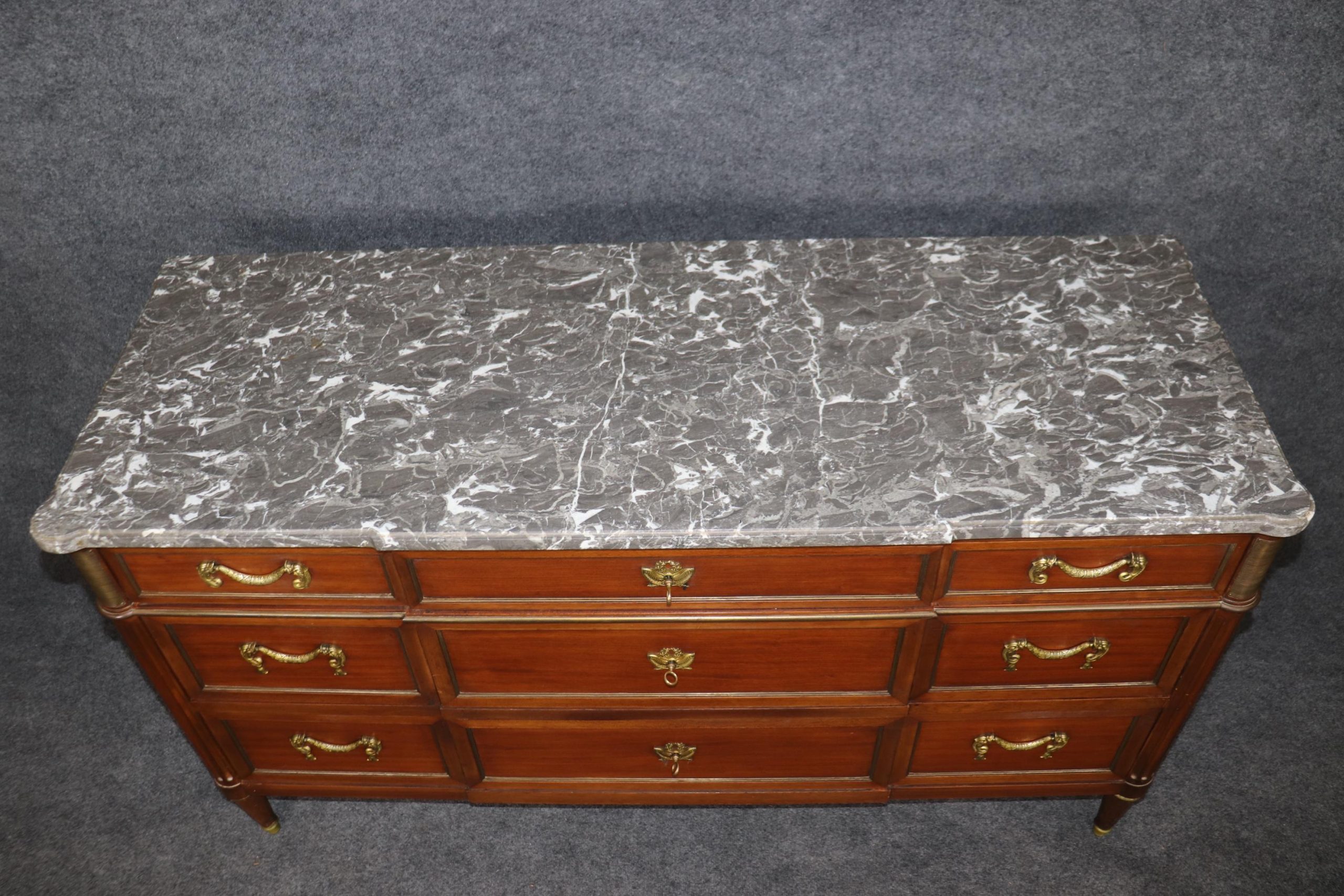 This Louis XVI style marble top commode/dresser by Maison Jansen is made of the highest quality! This piece is perfect for your living room, bedroom, dining room, entryway or office and will certainly bring a sense of sophistication and luxury into your home or place of choosing! This piece will without a doubt be a pinnacle point to wherever you may place it, and will have your guests mesmerized. The dresser has 9 drawers, 3 of which lock – perfect for storing your personal belongings all while keeping them safe and out of reach! This is not a piece you want…. Its a piece you need… Antique furniture and vintage pieces have stood the test of time and this marble top dresser is no exception! With its quality materials and great craftsmanship this piece is bound to last you and your family for many years to come. The dresser is in good vintage condition with some surface scratches and finish loss, as to be expected.