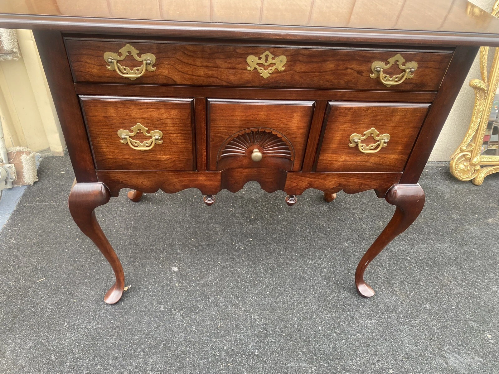 This charming Mahogany Queen Anne low boy dresser chest embodies the elegance and craftsmanship of mid-20th century design. Handcrafted with care, it features four spacious dovetailed drawers that glide smoothly, perfect for keeping your belongings organized. The rich mahogany finish showcases the wood’s natural beauty, while the graceful curves and delicate legs reflect the timeless Queen Anne style. This piece not only serves as a functional addition to your home but also carries a sense of history and warmth, making it a delightful focal point in any room.