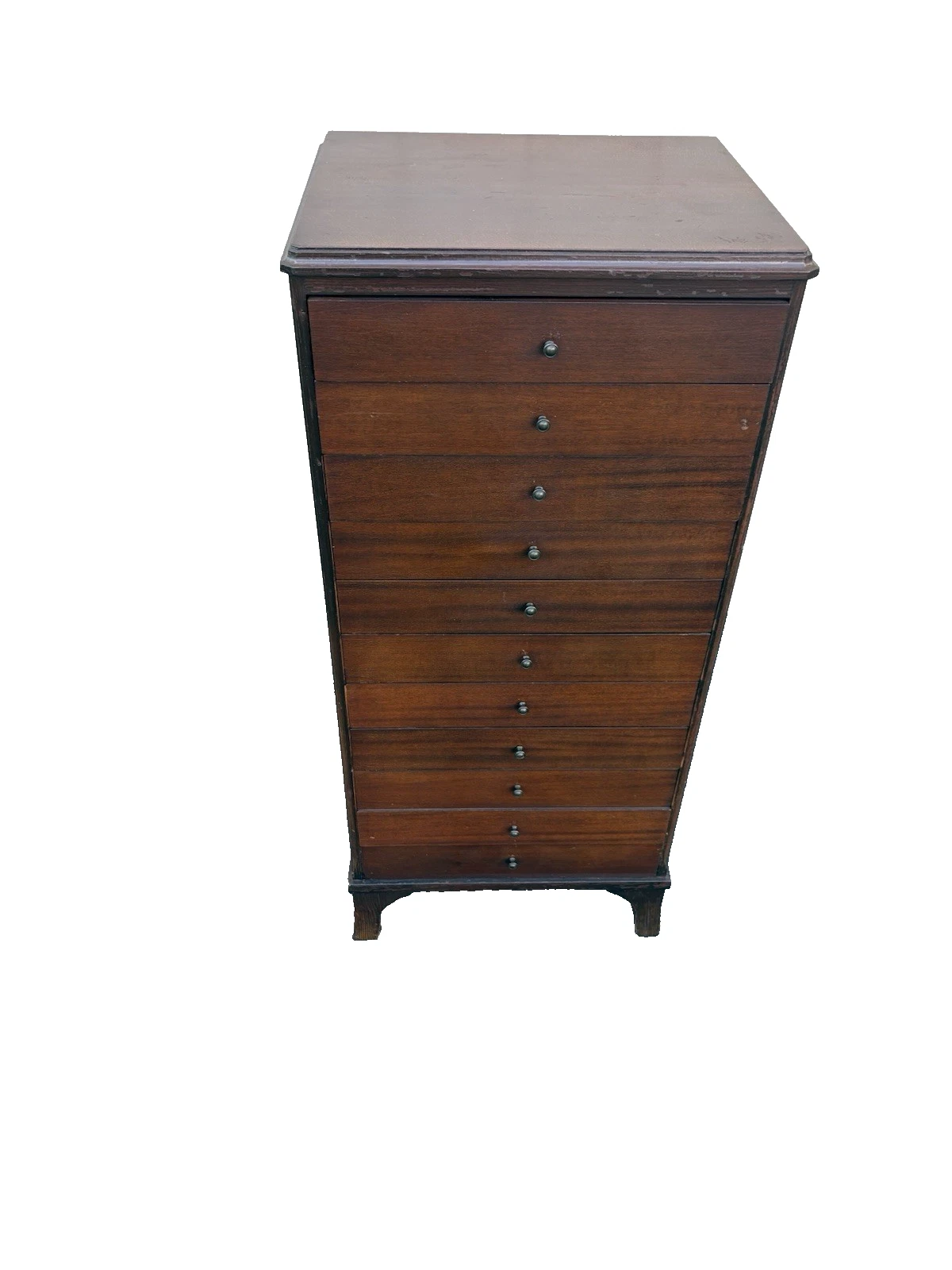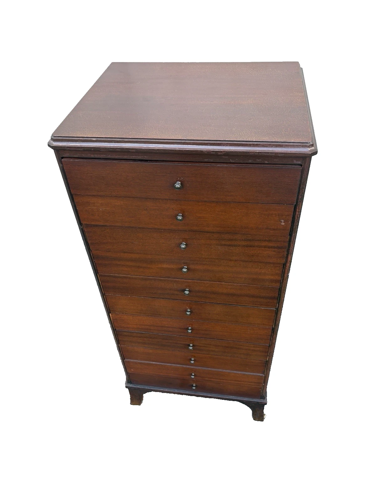 This charming mahogany sheet music cabinet beautifully embodies the craftsmanship of the 1970s, showcasing a traditional design that adds warmth to any space. Handcrafted with care, its multi-drawer structure offers ample storage for cherished records and sheet music, while the rich patina of the mahogany speaks to decades of history. The subtle wear on the top lends a sense of character, inviting you to imagine the melodies that once filled the air. This cabinet is not just a functional piece; it’s a delightful conversation starter that captures the essence of a bygone era.