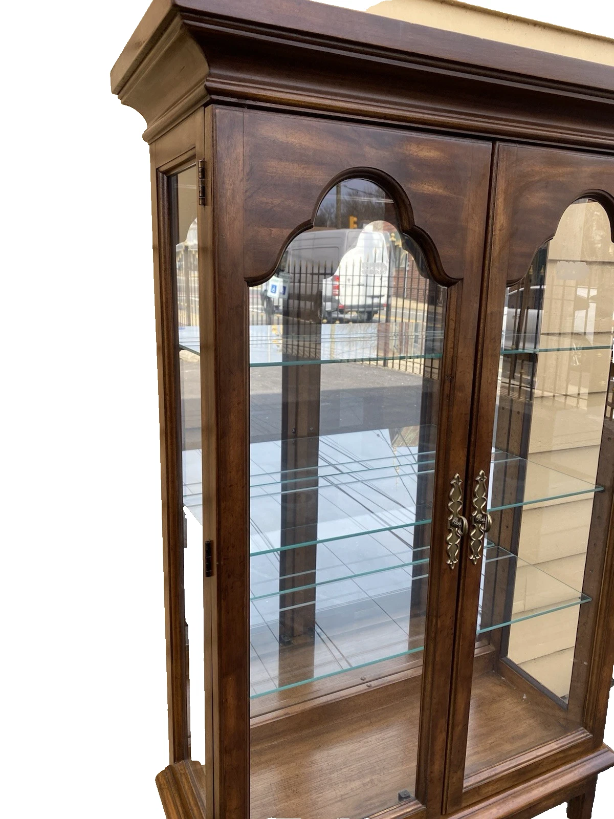 This exquisite Maple curio cabinet from American Drew brings a touch of classic charm to any space. Handmade with meticulous attention to detail, its warm wood tones and elegant lines showcase the craftsmanship that defines traditional American furniture. The two doors reveal four spacious plate glass shelves, perfect for displaying your cherished china or collectibles, while its sturdy construction ensures it will be a beloved piece for years to come. A wonderful addition to your home, this cabinet reflects the timeless beauty and practicality that families have enjoyed since the 1980s.