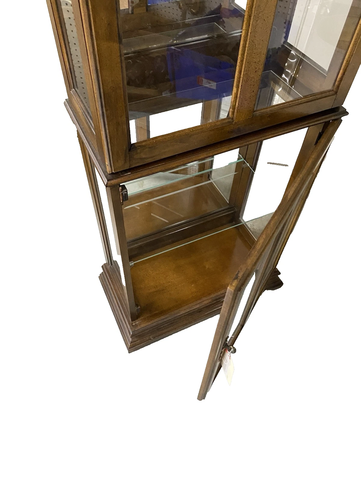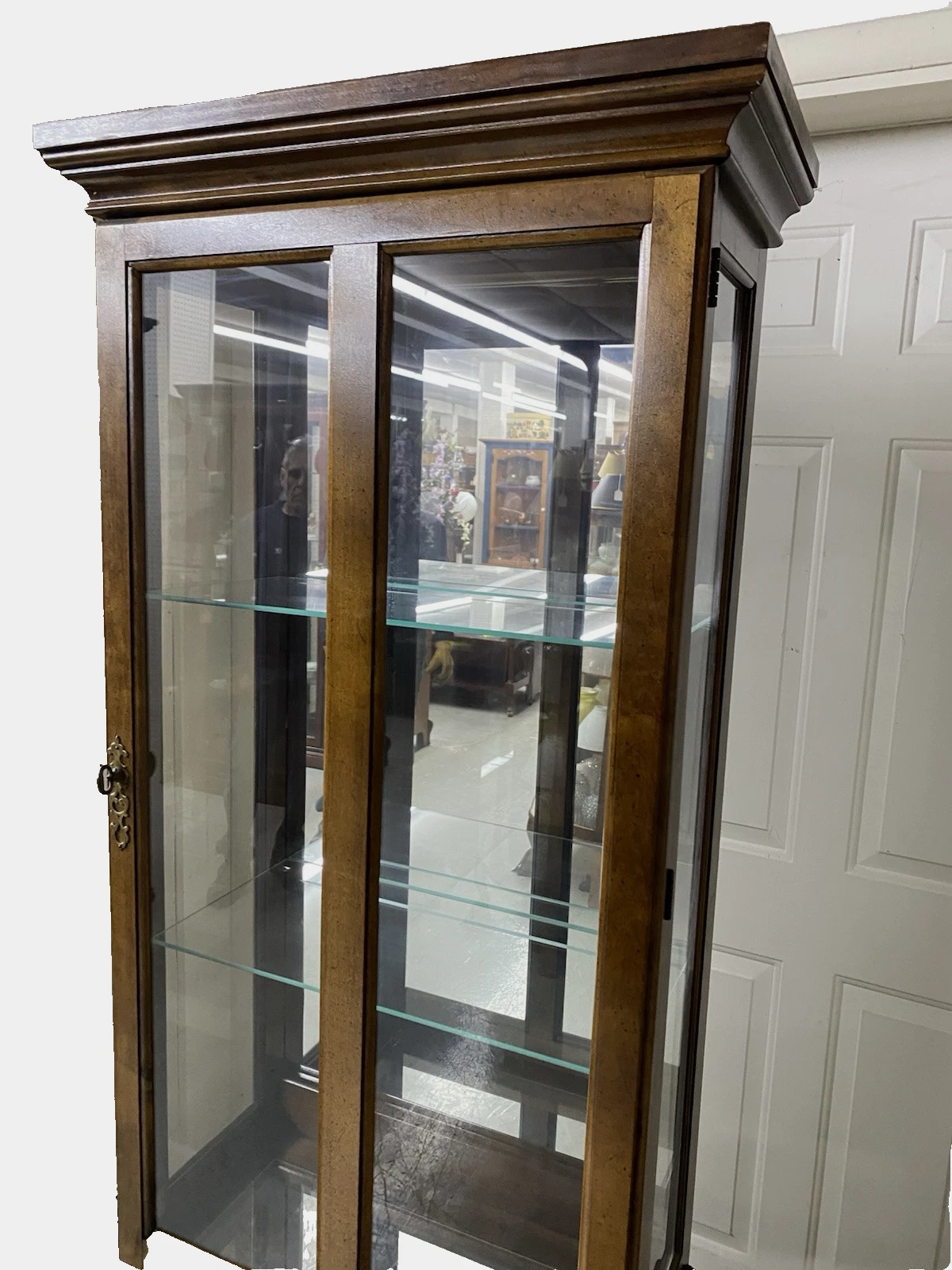 This exquisite handmade maple curio china cabinet embodies the timeless charm of traditional craftsmanship, expertly constructed to showcase your most treasured items. With its warm wood tones and elegant design, it invites warmth and character into any room. The three shelves and two doors not only provide ample storage but also create a beautiful display space for your favorite collectibles. This cabinet, lovingly made in the USA post-1950, is more than just furniture; it’s a piece of history that adds a touch of nostalgia to your home.
