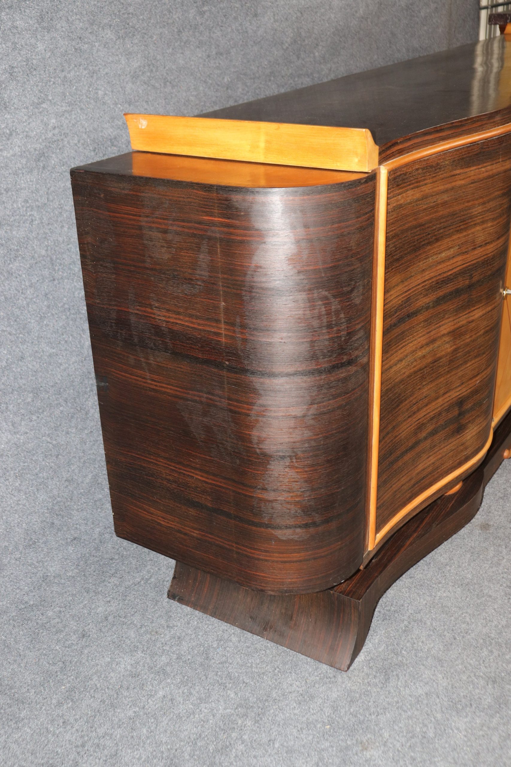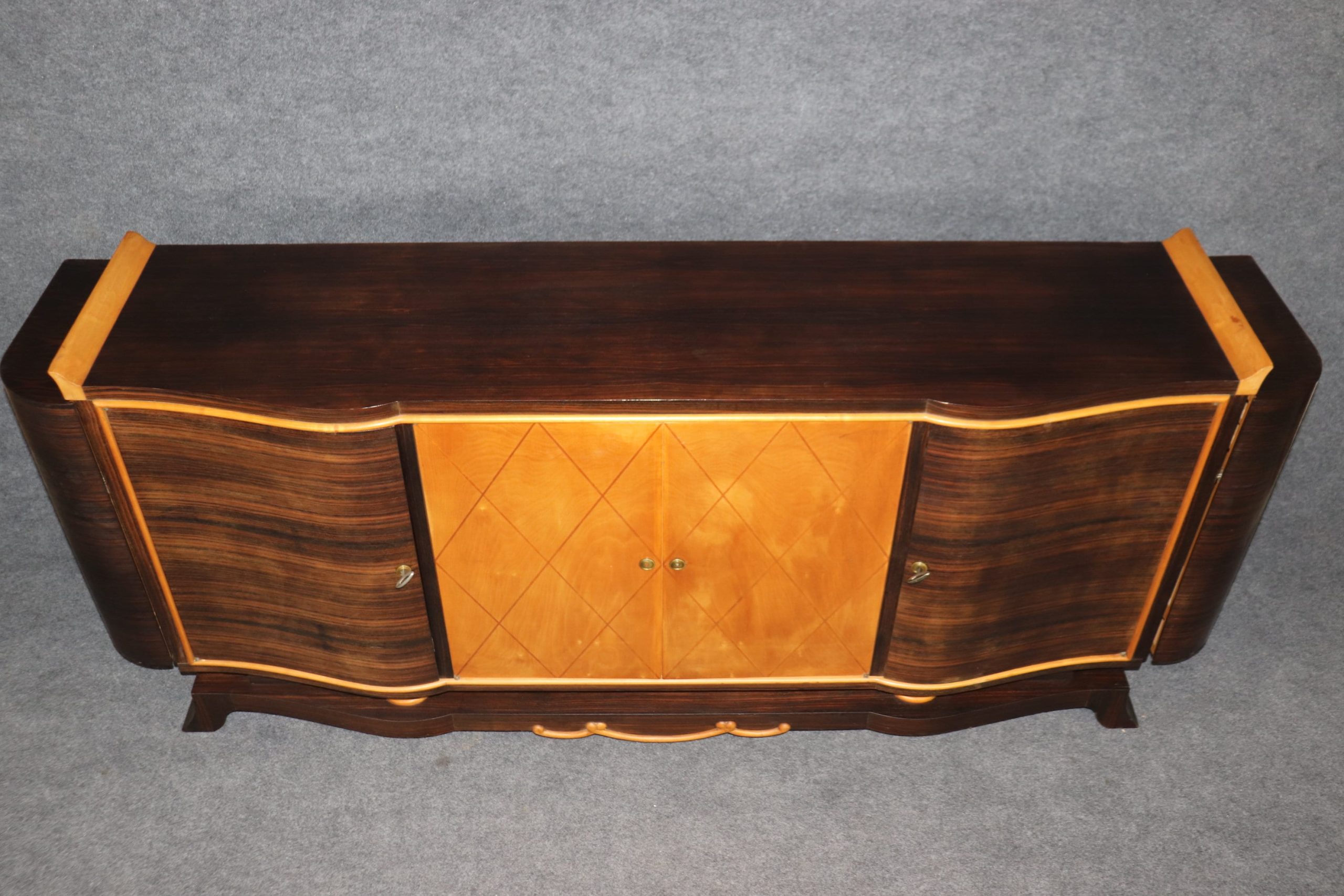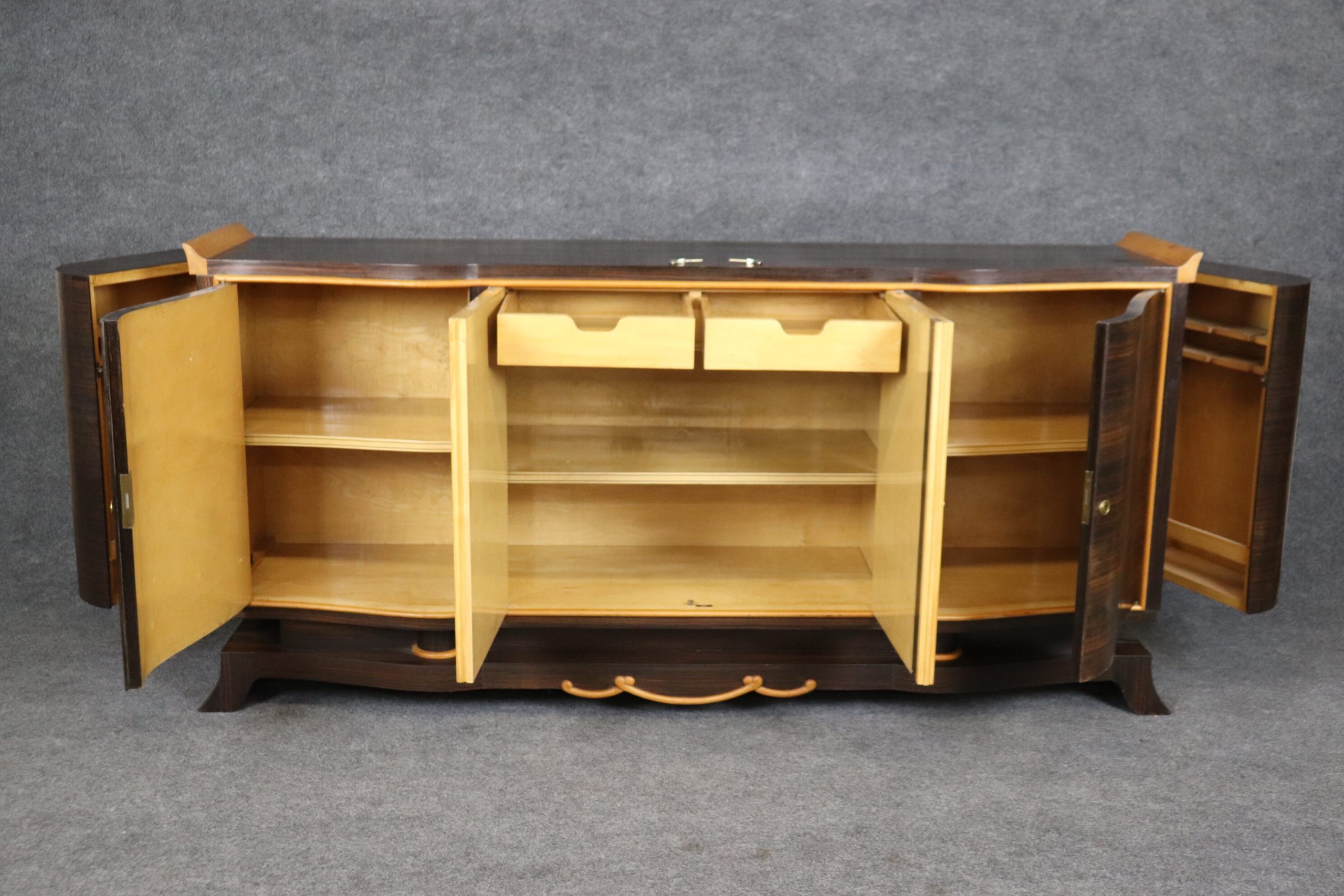 This vintage French Art Deco sideboard or bar, in the manner of Jules Leleu, is made of the highest quality! Jules Leleu (June 17, 1883 – 1961), was a French furniture designer. Leleu was very prolific, and was also constantly evolving and developing his styles. If you look at the photos provided, you can see the luxurious satinwood interior. This piece is equipped with bar cabinet side doors, perfect for entertaining guests. This is perfect for your living room, dining room, entryway, office or place of your choosing! The cabinet is in good vintage condition with minor surface scratches and finish loss as to be expected.