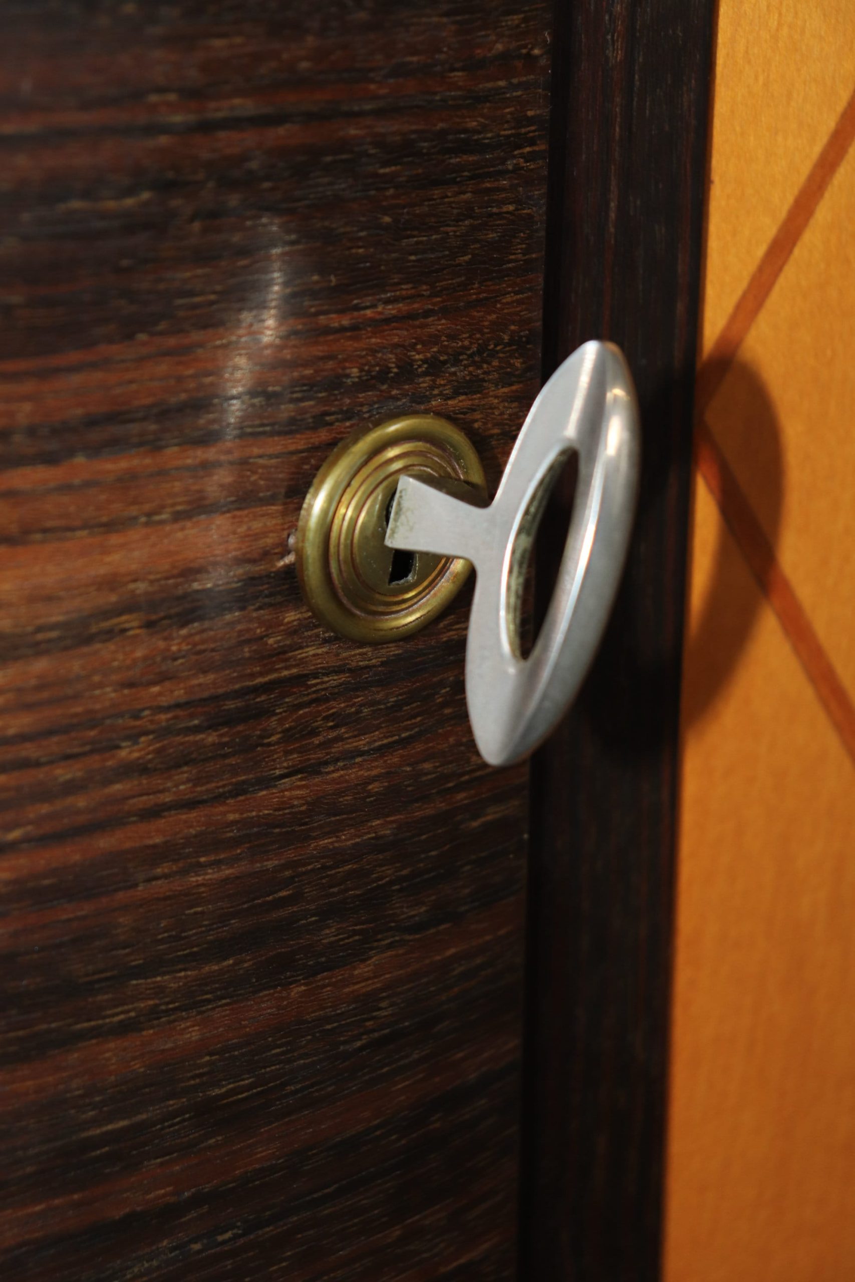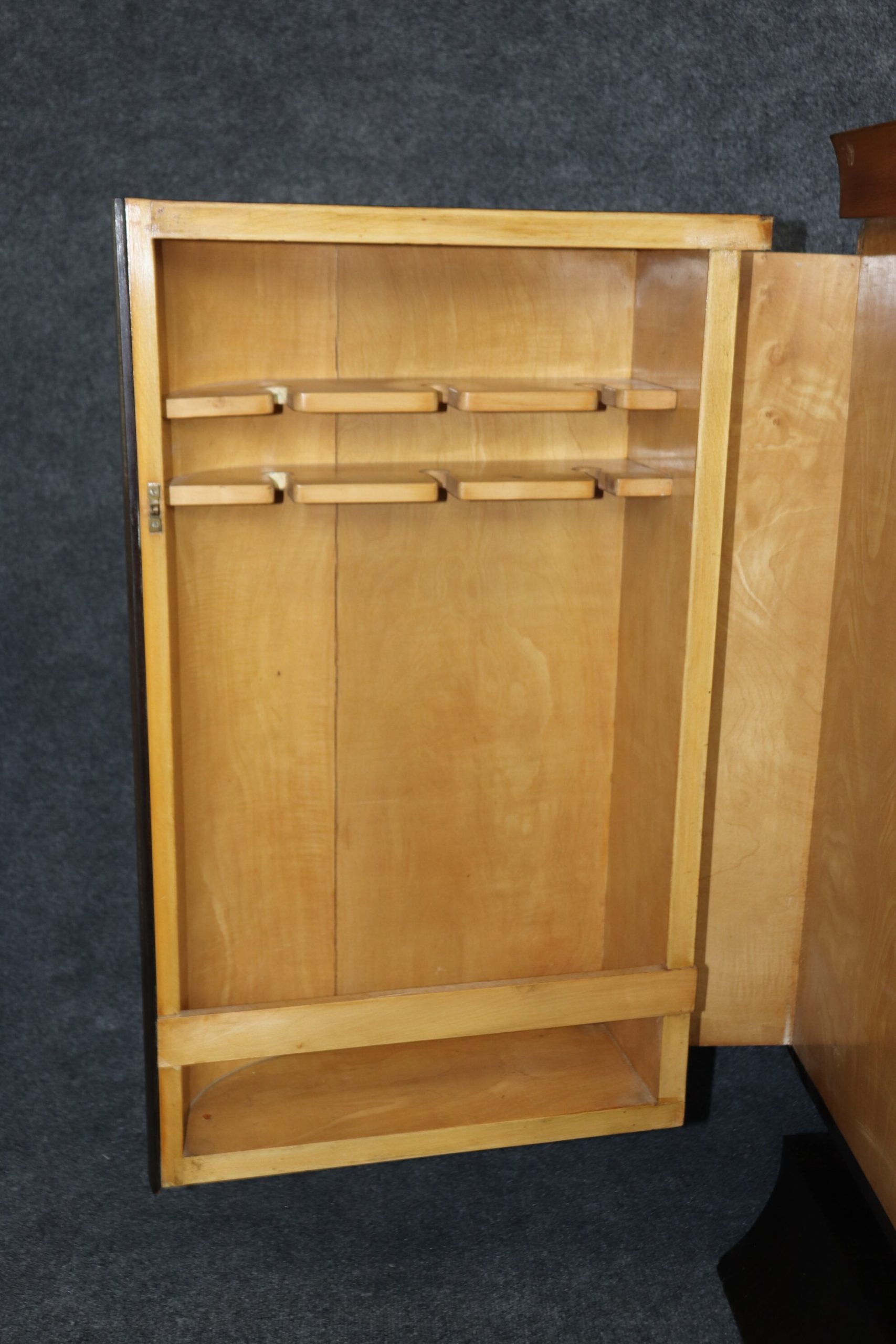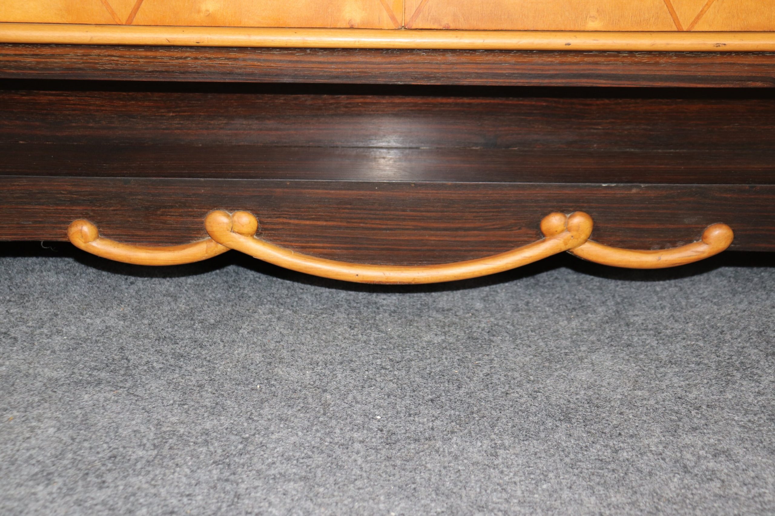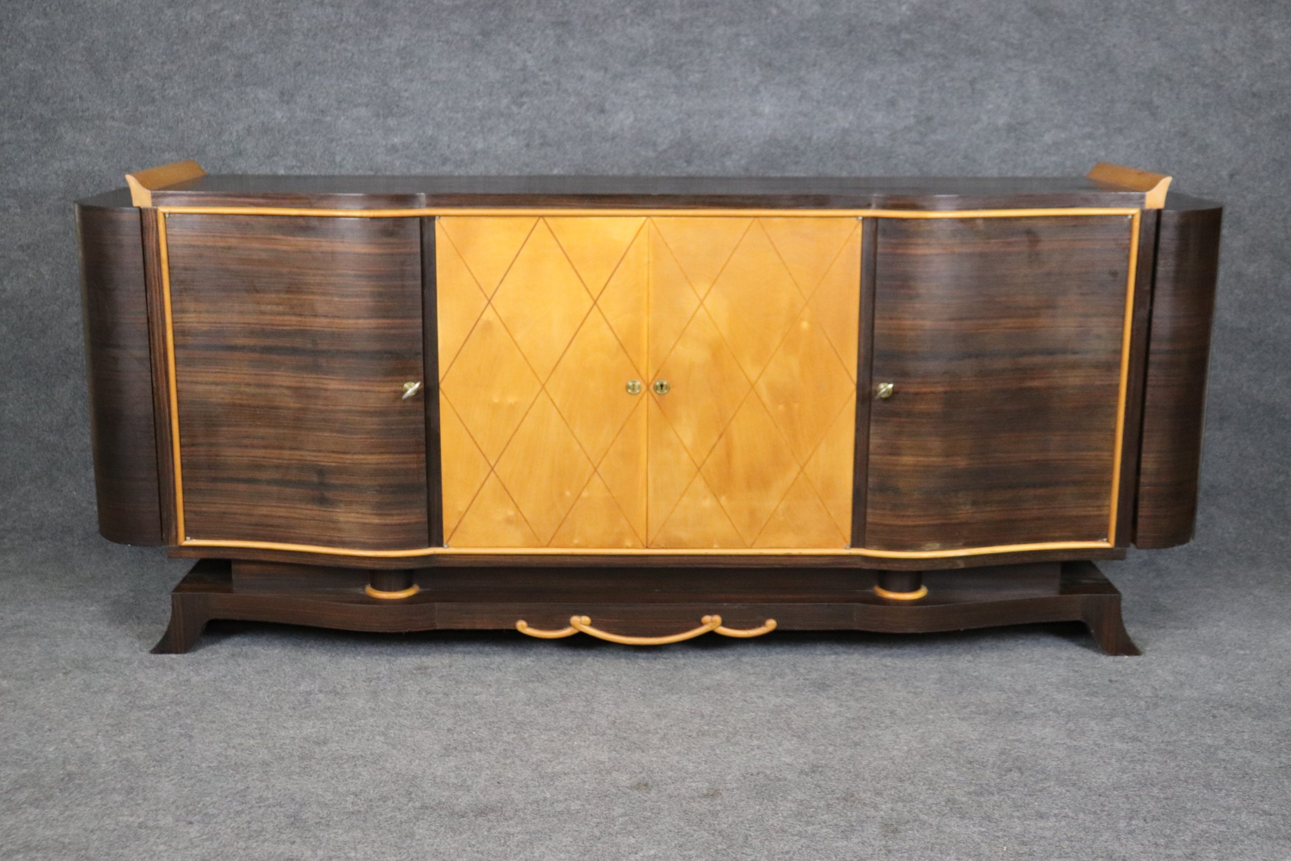 This vintage French Art Deco sideboard or bar, in the manner of Jules Leleu, is made of the highest quality! Jules Leleu (June 17, 1883 – 1961), was a French furniture designer. Leleu was very prolific, and was also constantly evolving and developing his styles. If you look at the photos provided, you can see the luxurious satinwood interior. This piece is equipped with bar cabinet side doors, perfect for entertaining guests. This is perfect for your living room, dining room, entryway, office or place of your choosing! The cabinet is in good vintage condition with minor surface scratches and finish loss as to be expected.
