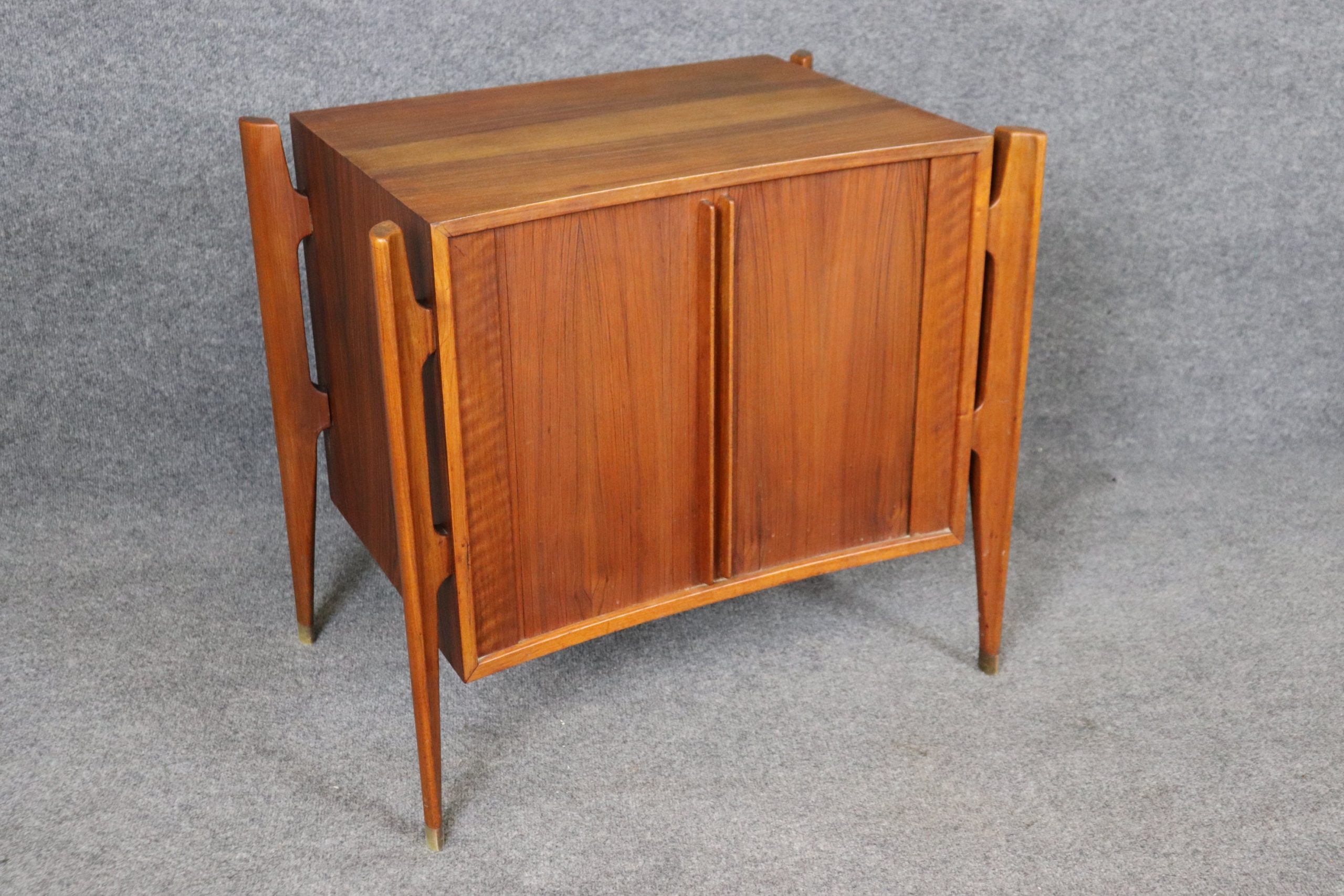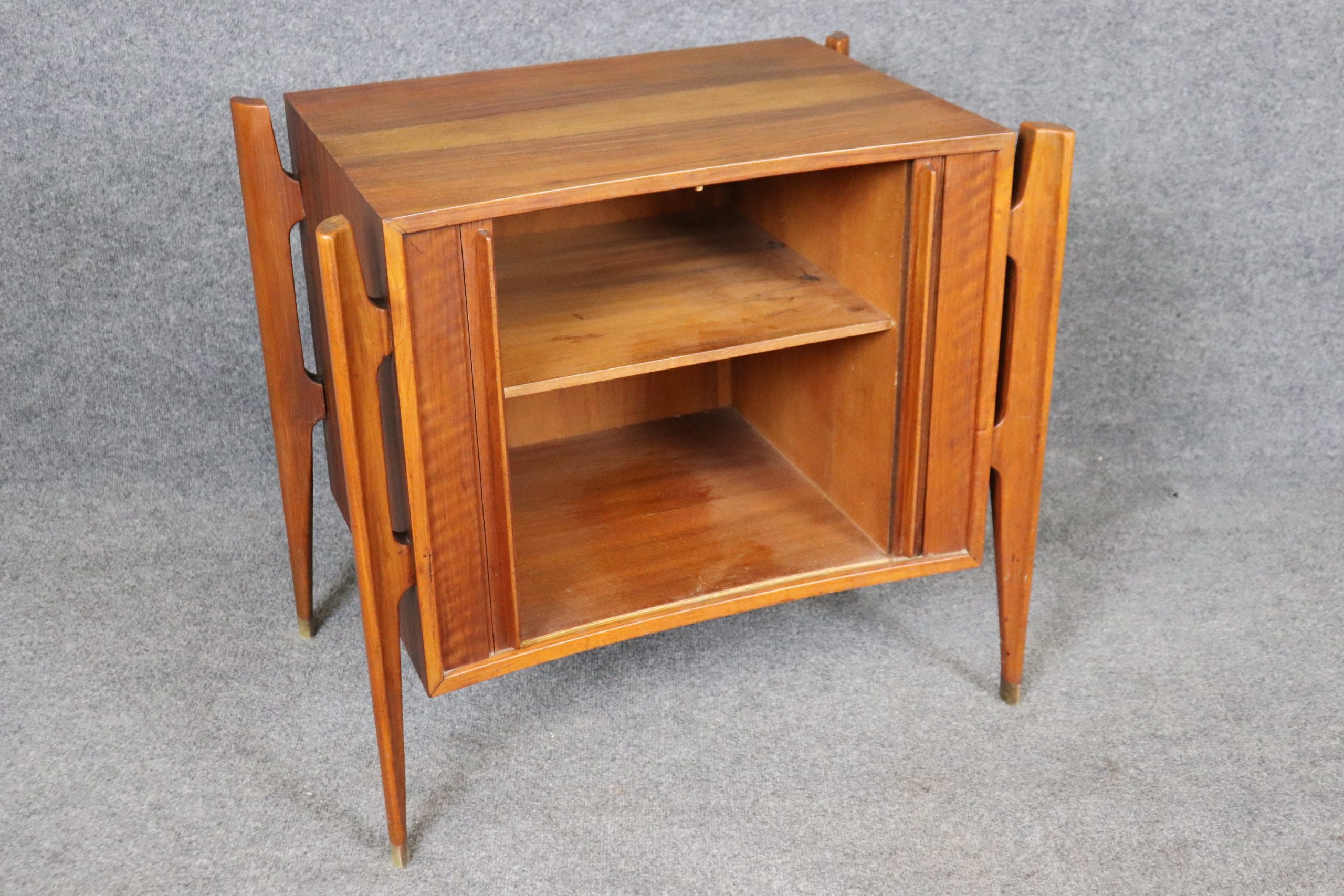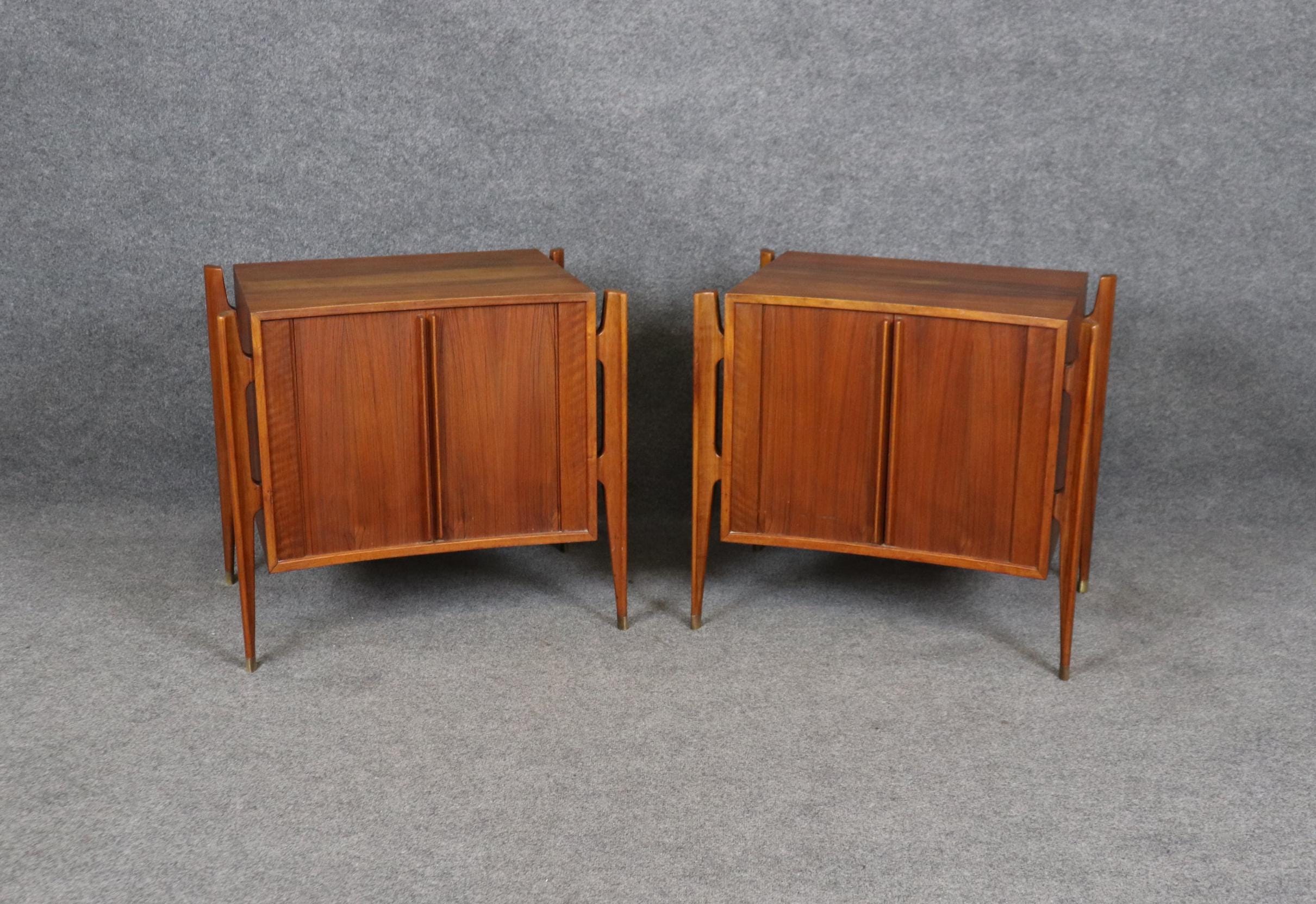 This outstanding pair of Mid Century Modern exoskeleton nightstands by William Hinn is made of the highest quality! These pieces will certainly bring a sense of sophistication and luxury into your MCM home or place of choosing! The nightstands have 2 tamber front sliding doors containing 1 shelf, perfect for storing your personal belongings all while keeping them safe and out of reach! Antique furniture and vintage pieces have stood the test of time and this pair of nightstands is no exception! With their quality materials and great craftsmanship this pair is bound to last you and your family for many years to comeThe nightstands are in great vintage condition and have some minor surface scratches.