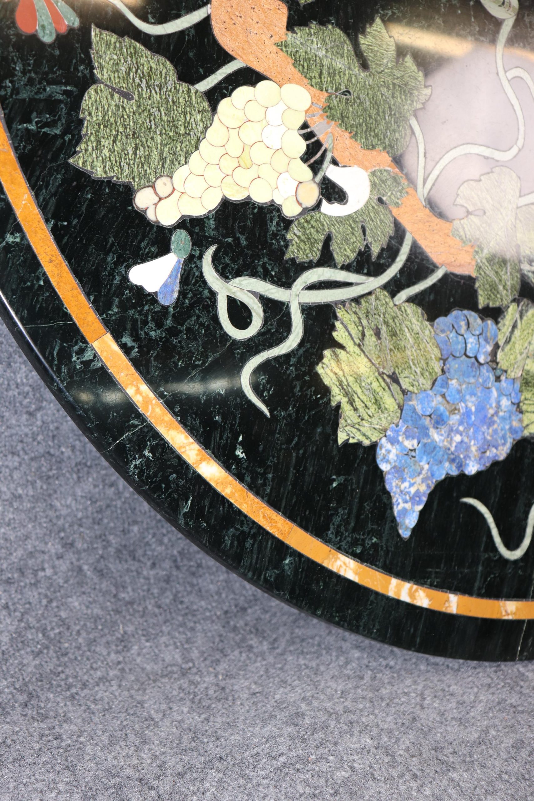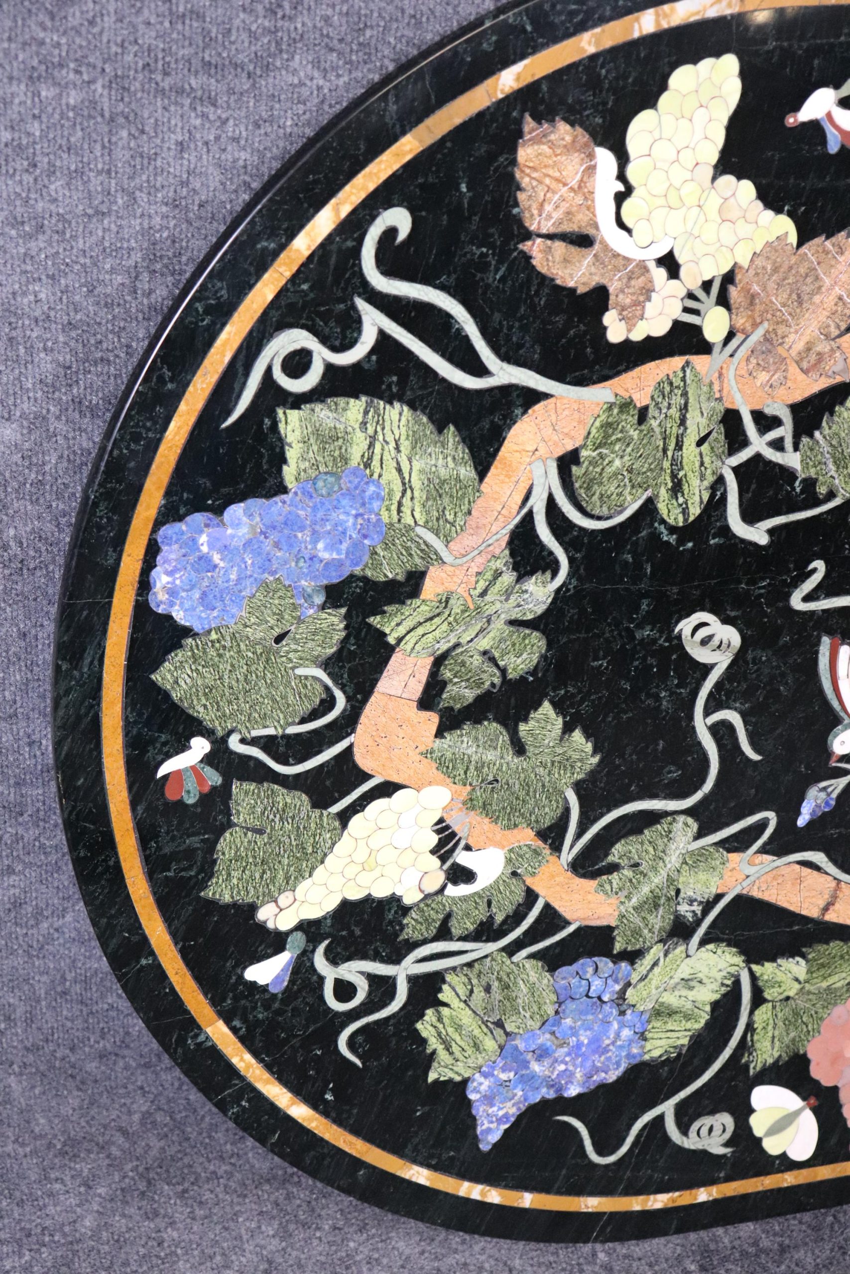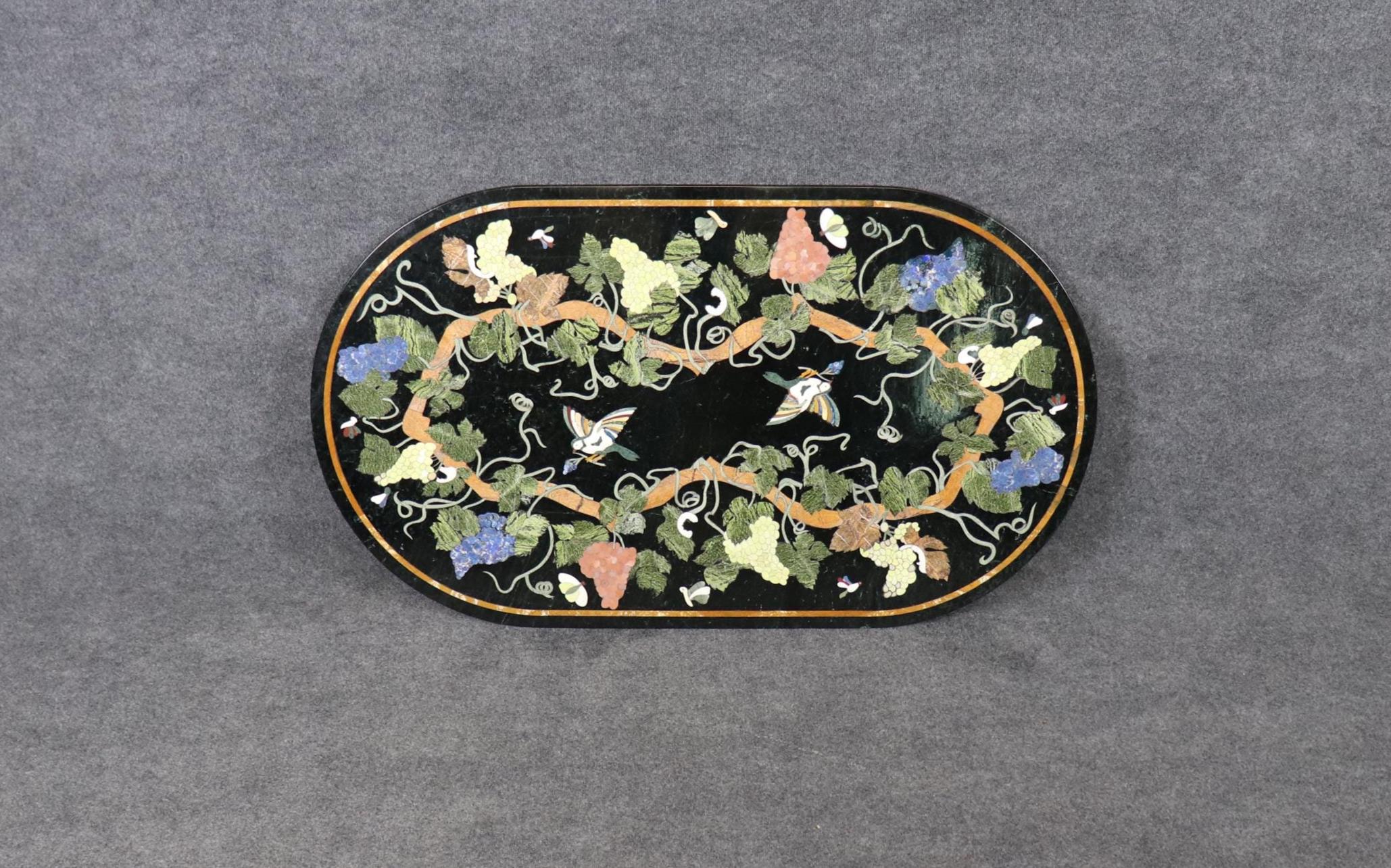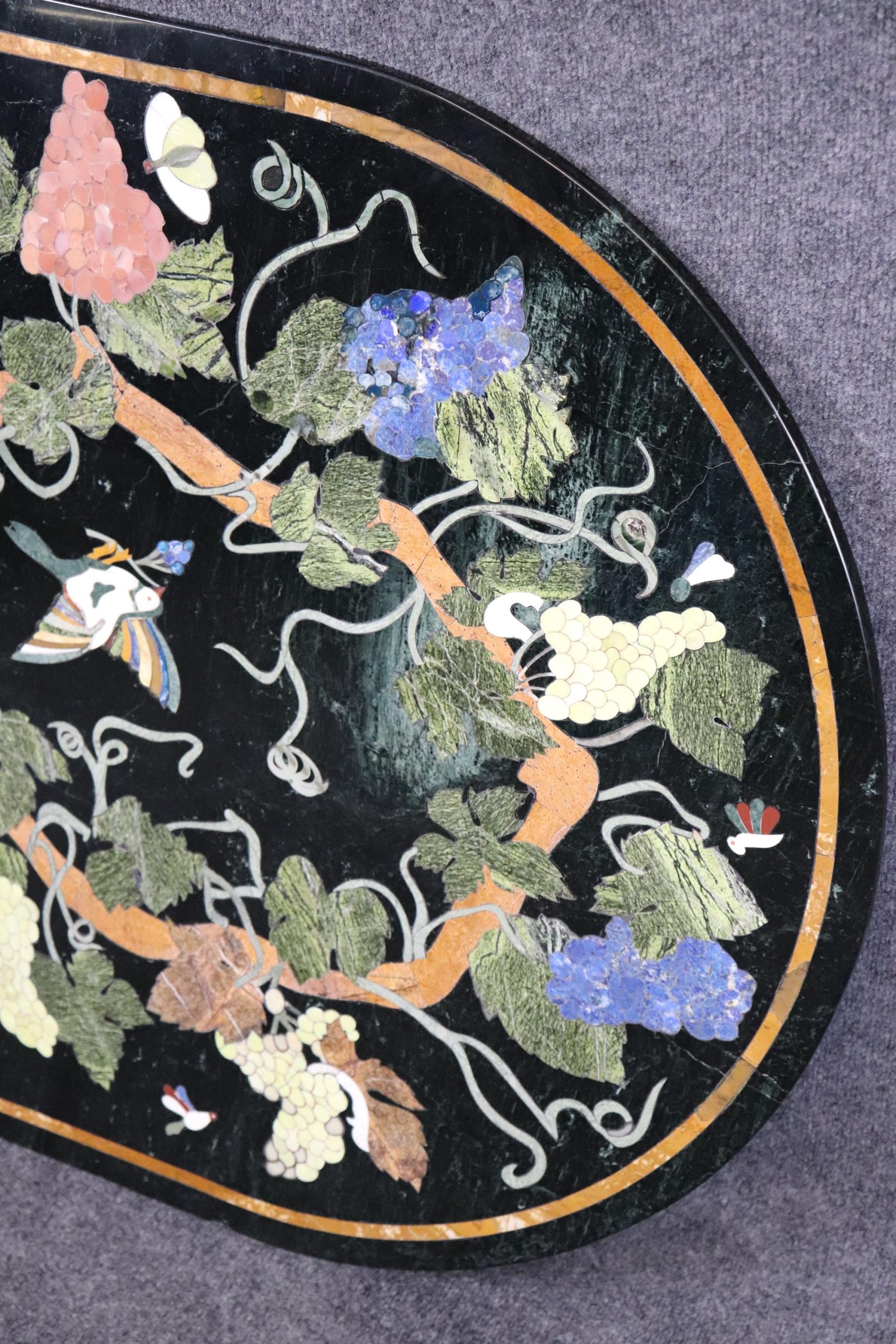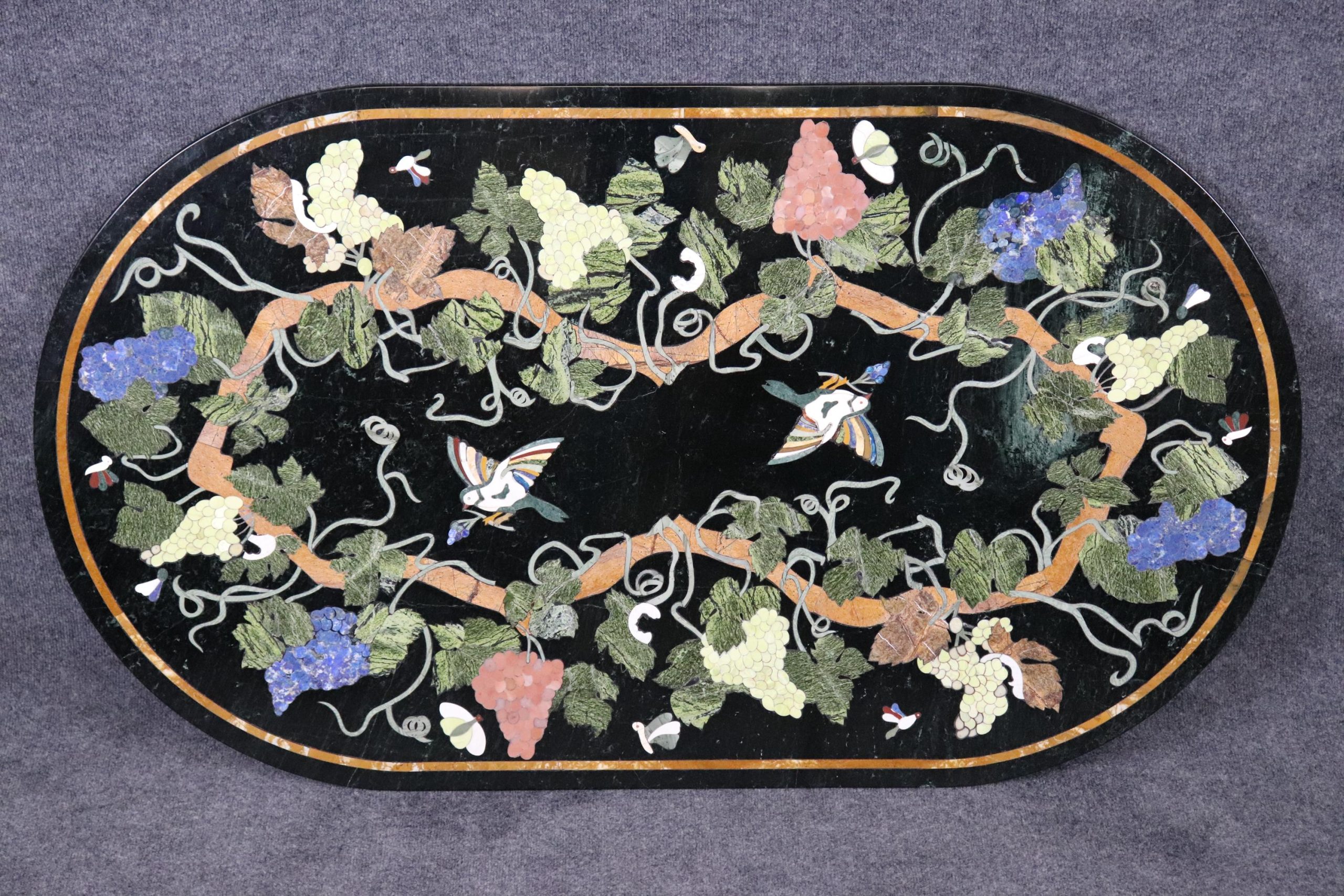 This Mid Century Pietra Dura marble table top is truly incredible and is made of the highest quality! Pietra Dura is a term for the inlay technique of using cut and fitted, highly polished colored stones to create images. The table top would look perfect in any kitchen, dining room or patio !This piece screams elegance and luxury and detail was the only thing on the makers mind! A piece that will without a doubt be a conversation starter and will have your guests wondering how you acquired such a beautiful item! This piece is perfect for any kitchen or entryway and can be paired with a variety of other styles! This is not a table top you want this is the kind of table top that you need. The table is in good vintage condition with minor surface scratches as to be expected with an item with this age.