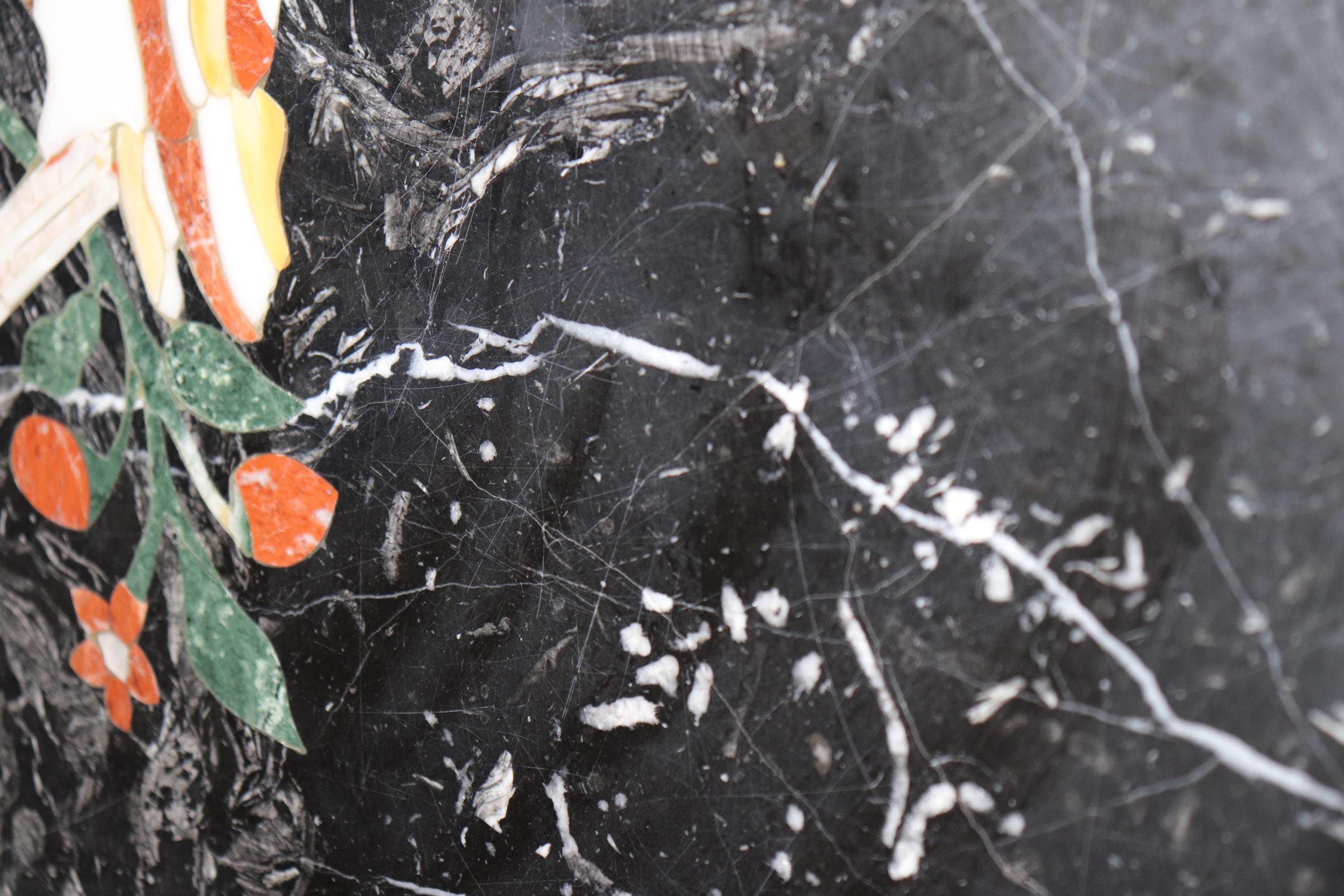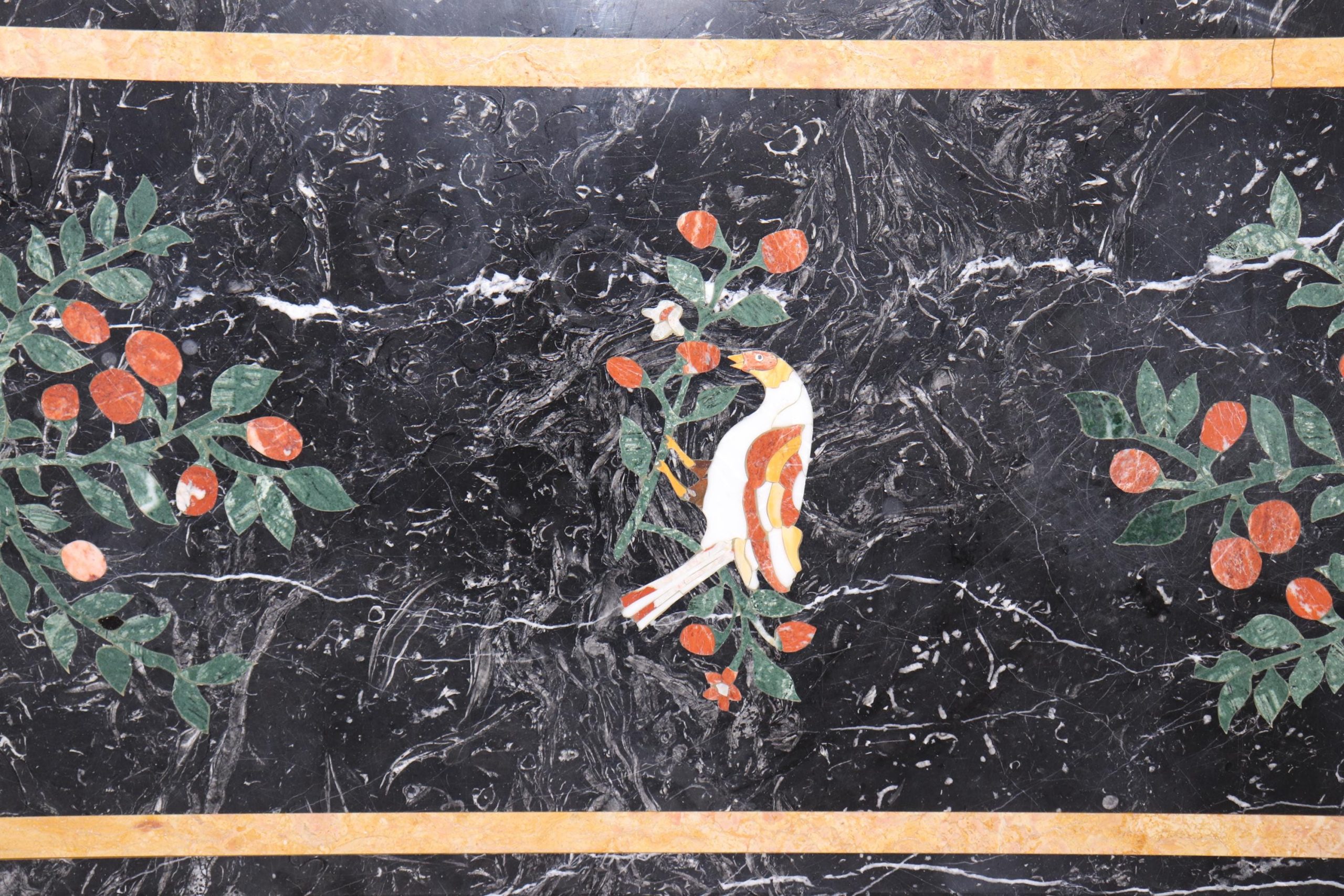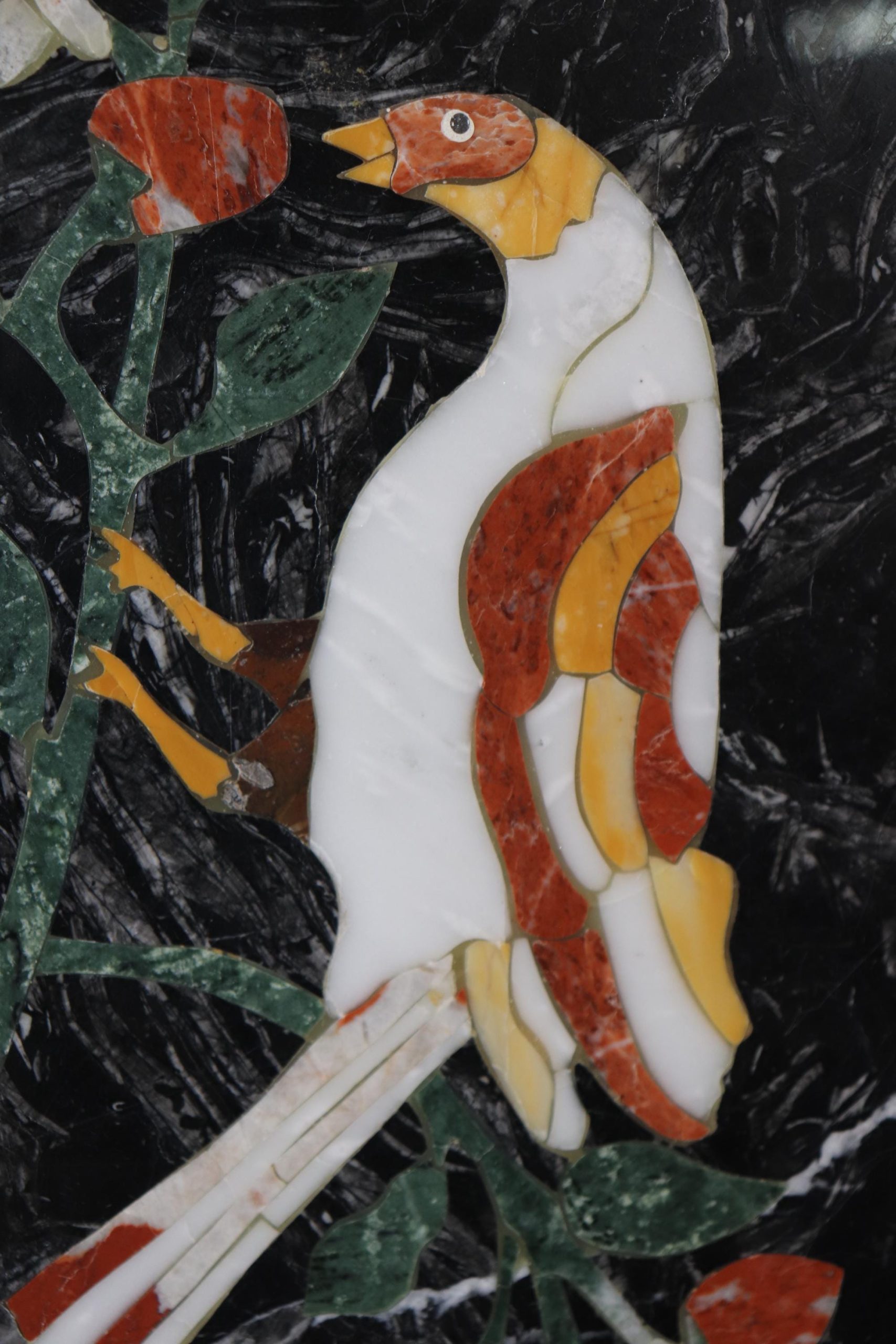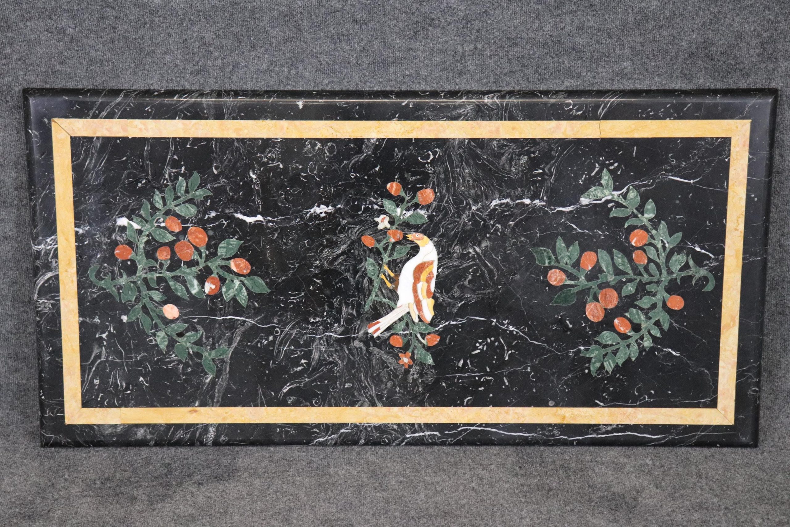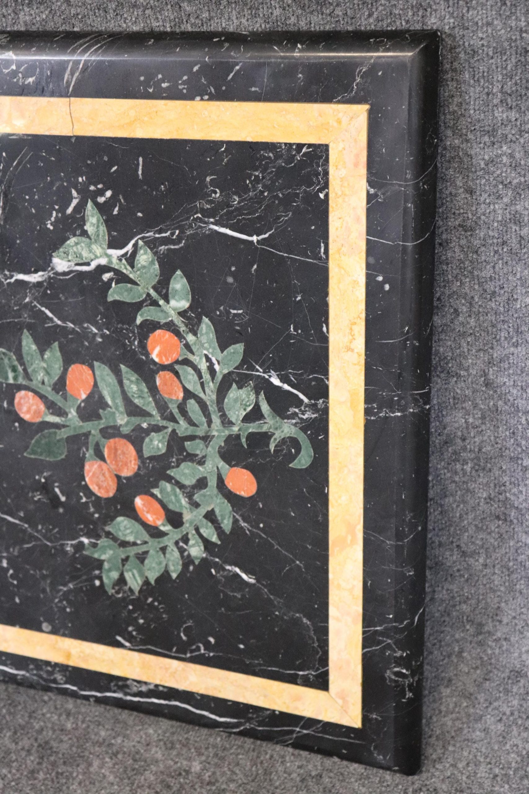 This Mid Century Pietra Dura marble table top is truly incredible and is made of the highest quality! Pietra Dura is a term for the inlay technique of using cut and fitted, highly polished colored stones to create images. The table top would look perfect in any kitchen, dining room or patio! This piece screams elegance and luxury and detail was the only thing on the makers mind! A piece that will without a doubt be a conversation starter and will have your guests wondering how you acquired such a beautiful item! This piece is perfect for any kitchen or entryway and can be paired with a variety of other styles! This is not a table top you want this is the kind of table top that you need. The table is in good vintage condition with surface scratches as to be expected with an item with this age.