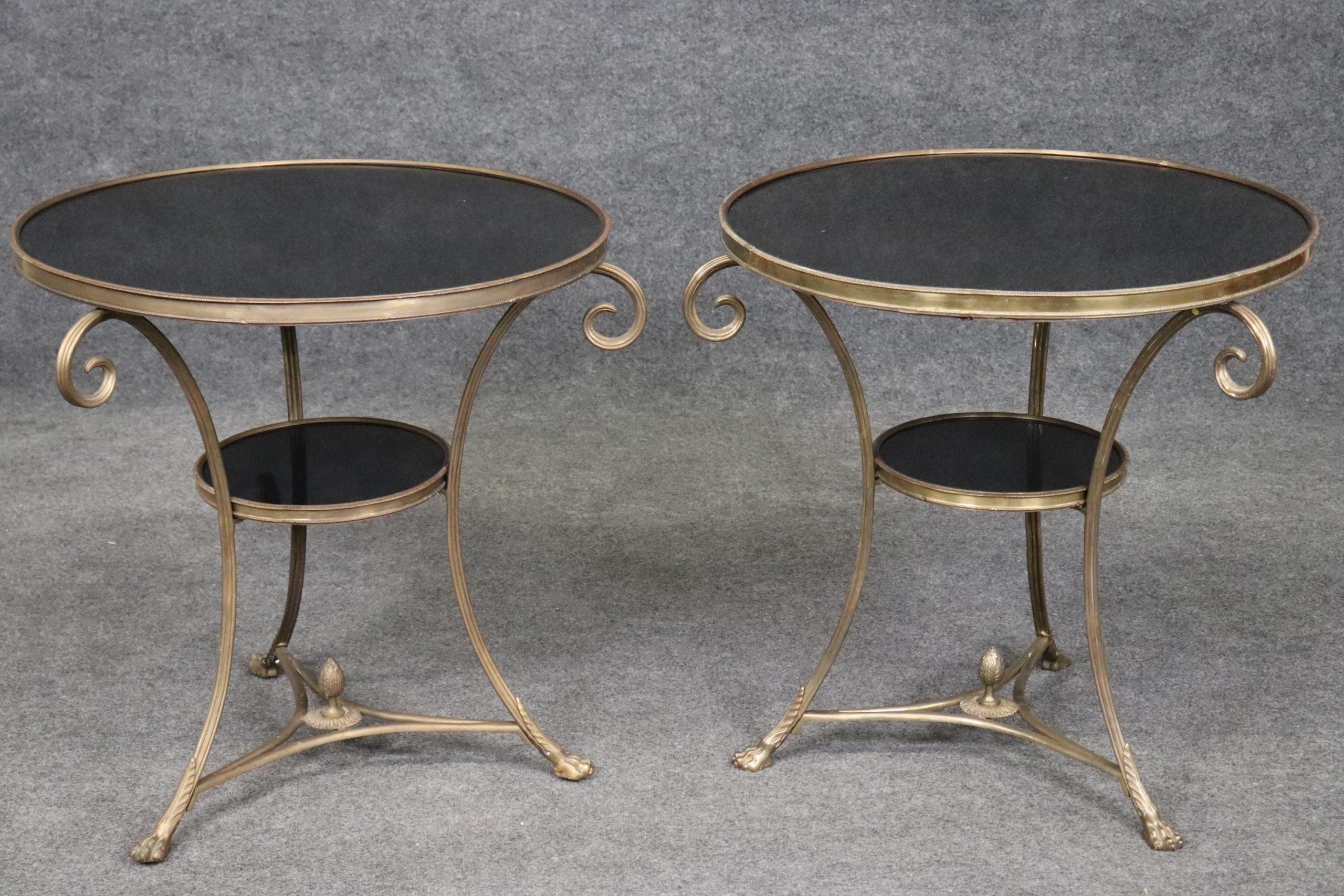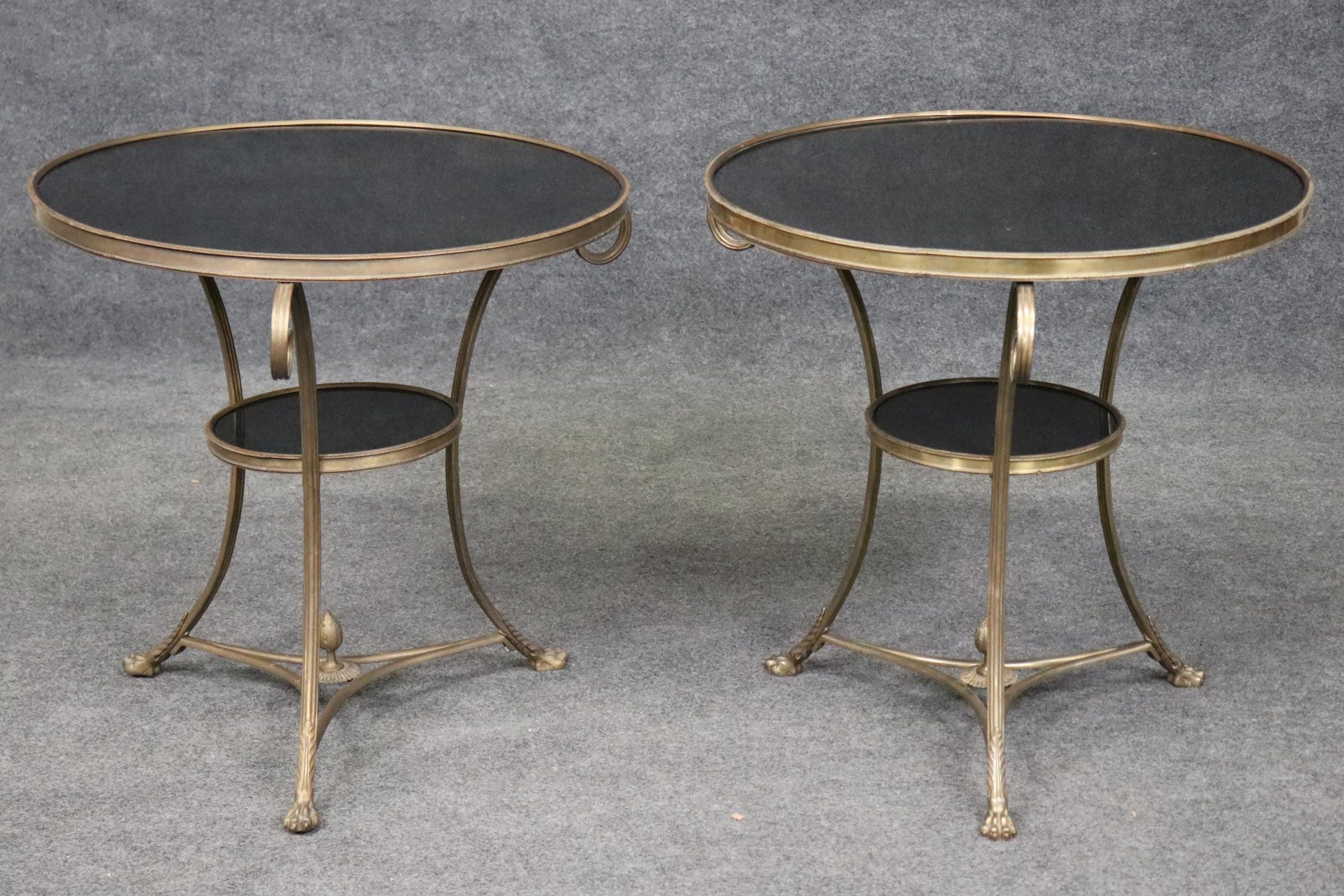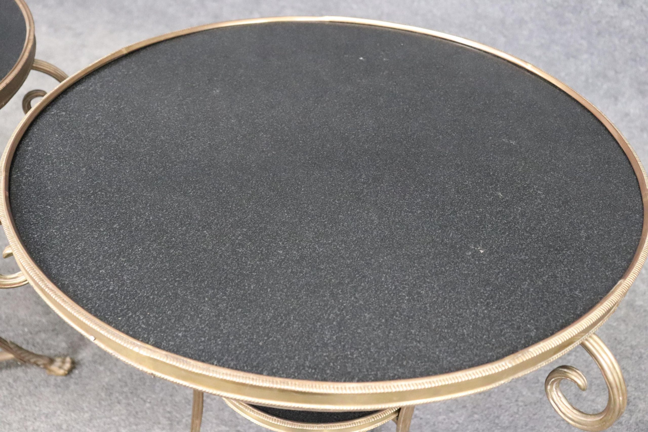 This mid century pair of Regency style bronze marble to gueridons packs a big punch! This pair of gueridons is made of the highest quality and is perfect for you and your home or place of choosing. This pair is perfect to be used as a pair of end tables or side tables for your living room, or they can be used on each opposing side of an entry way as accent tables and can also be used as night stands if you’d like. A really nice quality about these tables is their ability to be paired with a variety of other styles you may already have in your home and will certainly be a conversation starter at your next gathering! Antique furniture and vintage pieces have stood the test of time and this pair of tables is no exception! With their quality materials and great craftsmanship this pair is bound to last you and your family for many years to come. The pair is in good vintage condition with light surface scratches and some minor oxidation to the base as to be expected with items of age but otherwise good condition.
