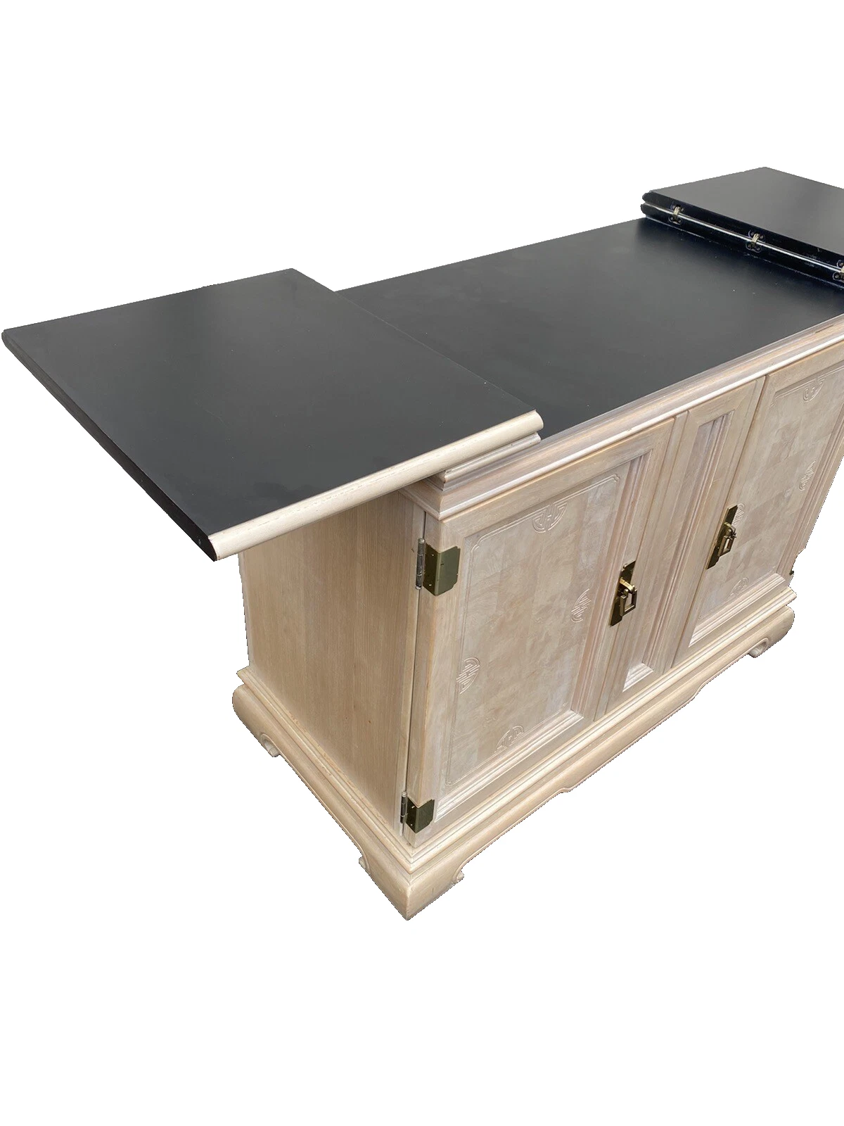 This charming modern bar cart server sideboard cabinet, crafted in the United States, beautifully marries functionality with a touch of mid-century design. Its sleek lines and rich wood finish invite you to host gatherings, while the sturdy construction ensures it will stand the test of time. With two spacious doors revealing ample storage, this piece not only serves drinks but also adds a warm, inviting element to your home. Perfect for both everyday use and special occasions, it reflects the craftsmanship of a bygone era, making it a lovely addition to any space.