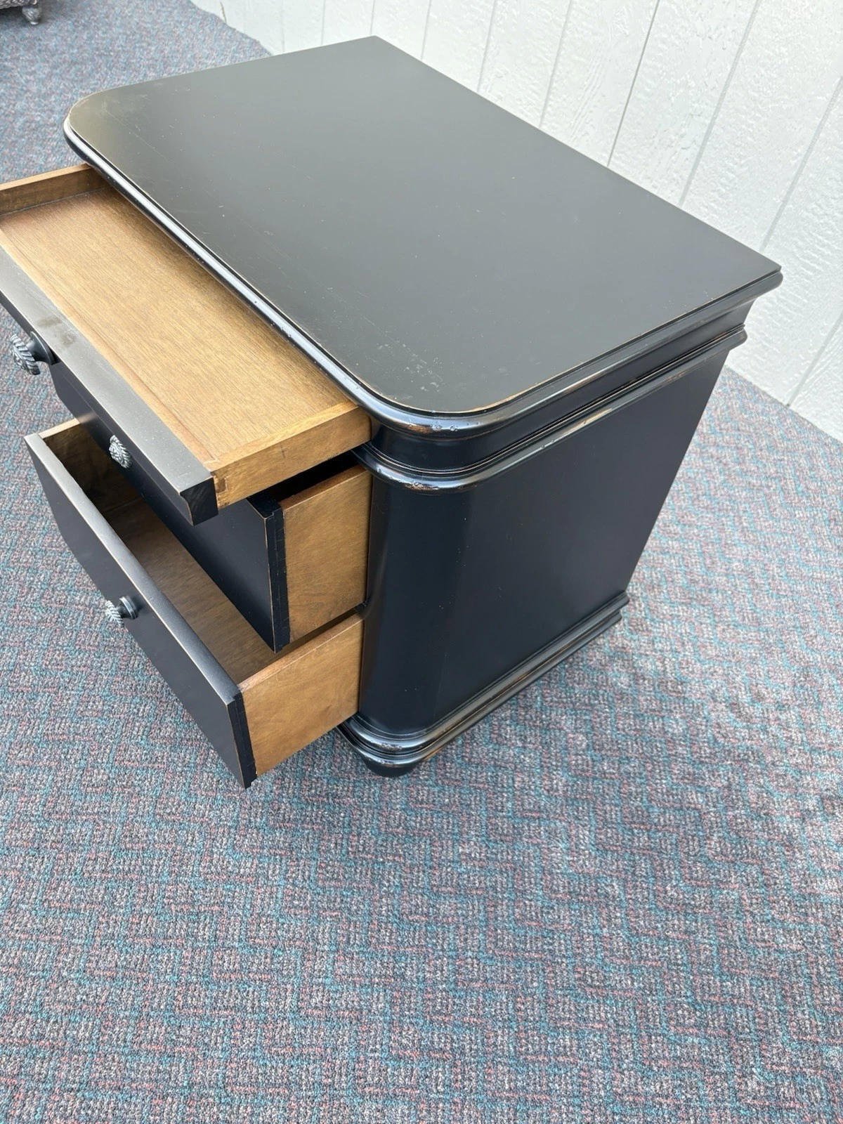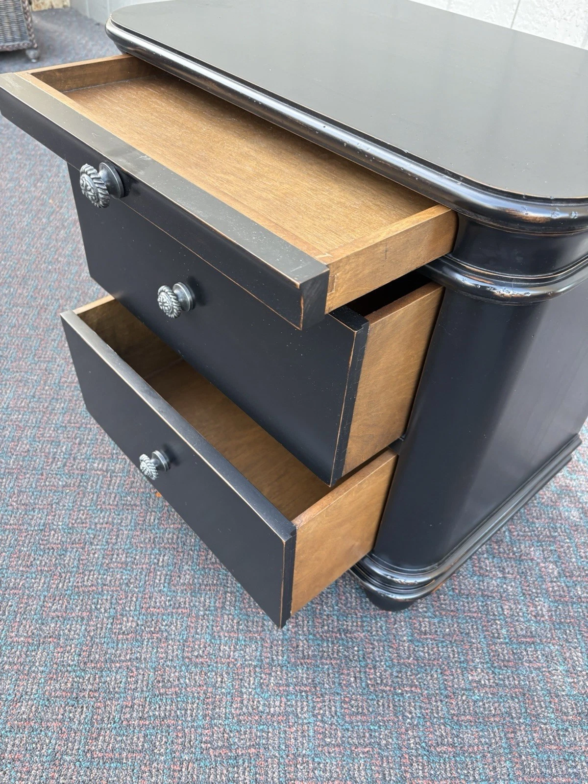 This modern ebony black nightstand is a striking addition to any bedroom, showcasing a sleek design that effortlessly blends style and functionality. Crafted with care, its three dovetailed drawers provide ample storage while highlighting the expert craftsmanship of its era, circa 1990. The rich black finish brings a touch of sophistication, making it a versatile piece that complements a variety of decor styles. With its clean lines and practical design, this nightstand is not just a piece of furniture, but a testament to timeless modern aesthetics.