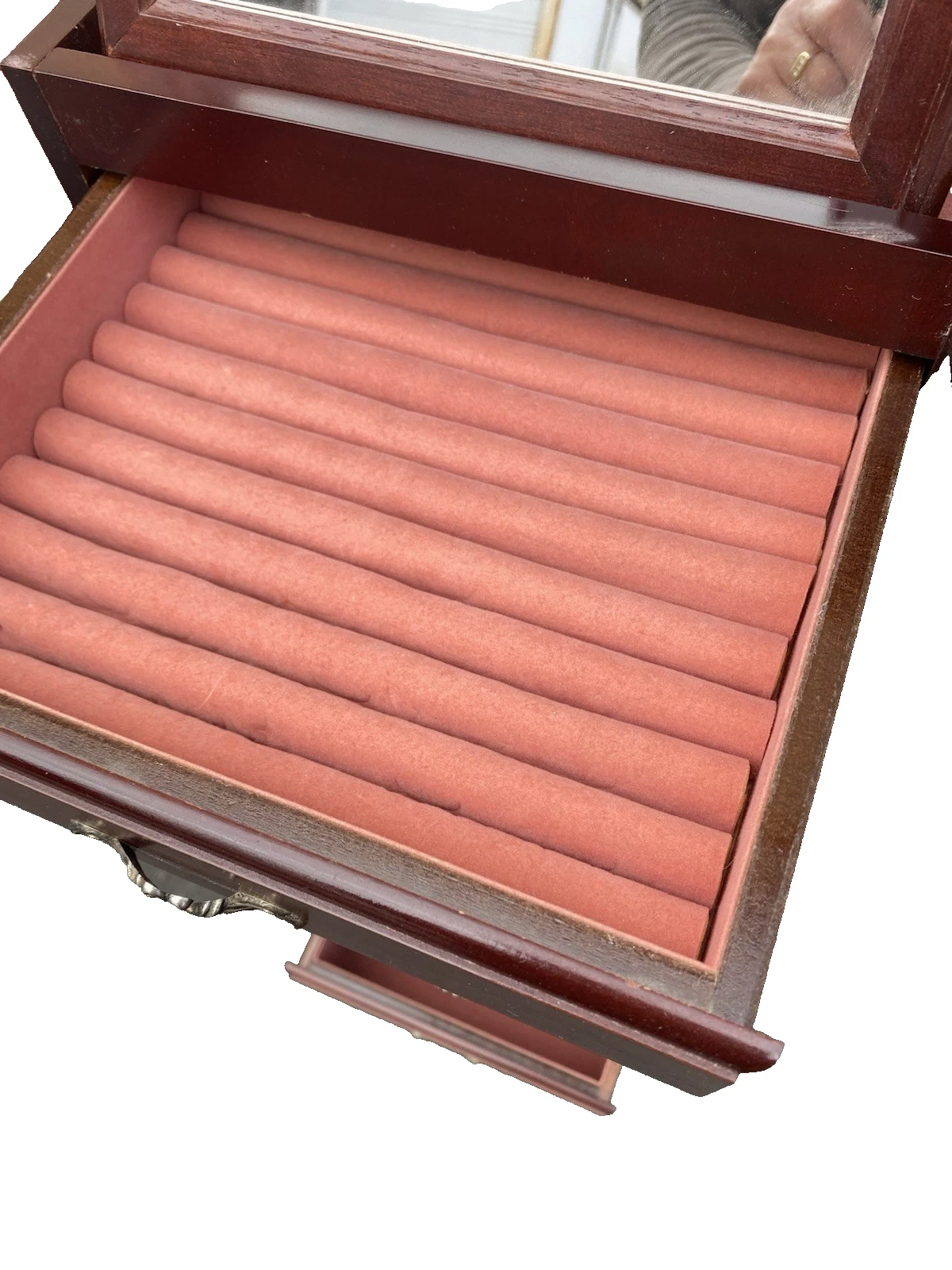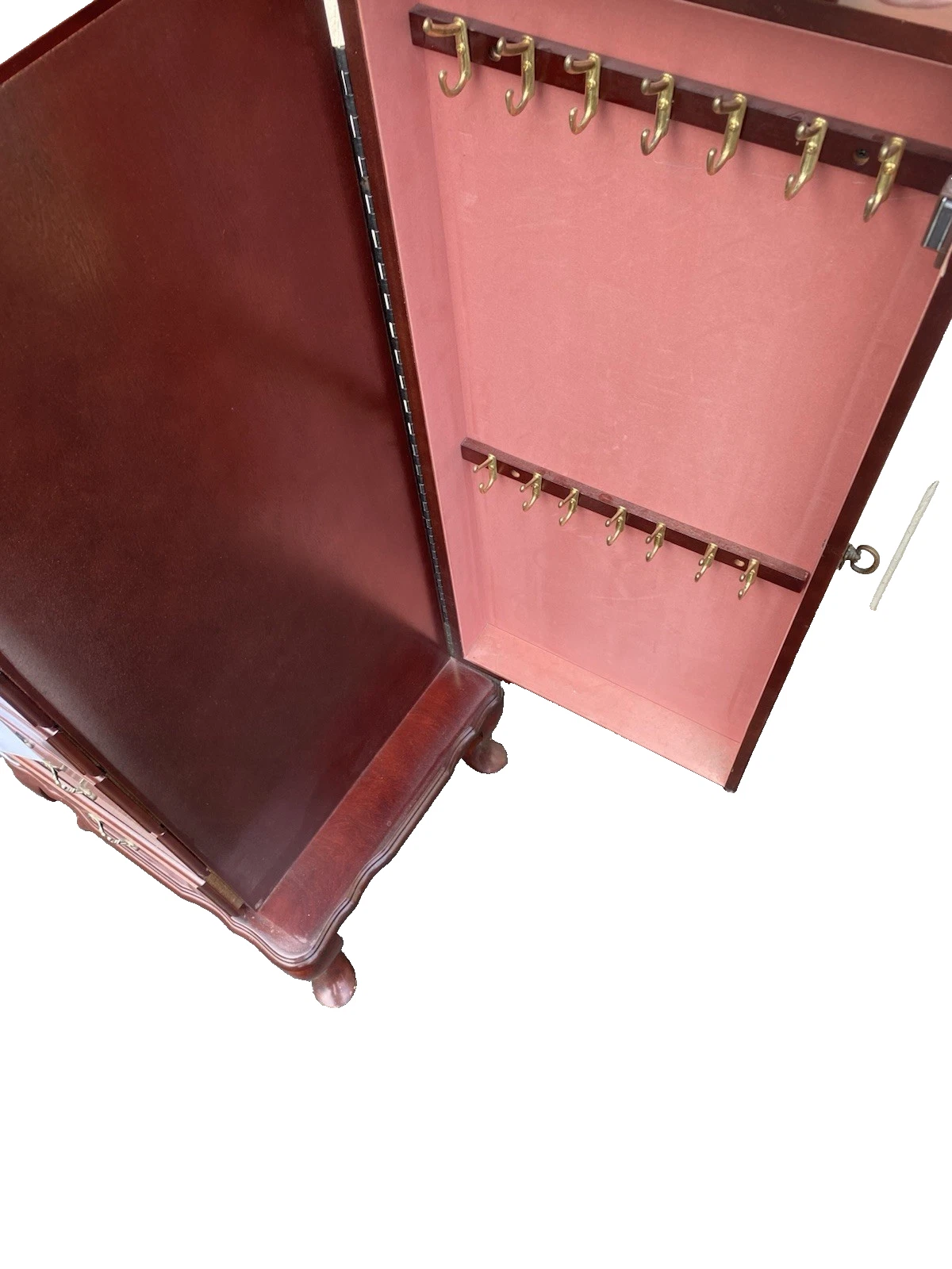 This charming jewelry cabinet display curio is a delightful blend of modern design and vintage appeal, showcasing the craftsmanship of its era. The sleek lines are beautifully complemented by a full-length mirror, adding both functionality and elegance to your space. With its warm wood finish and well-maintained interior, this piece not only offers a stylish way to organize your treasures but also serves as a lovely accent that tells a story of cherished memories and timeless beauty. Perfect for those who appreciate both form and function in their home decor.