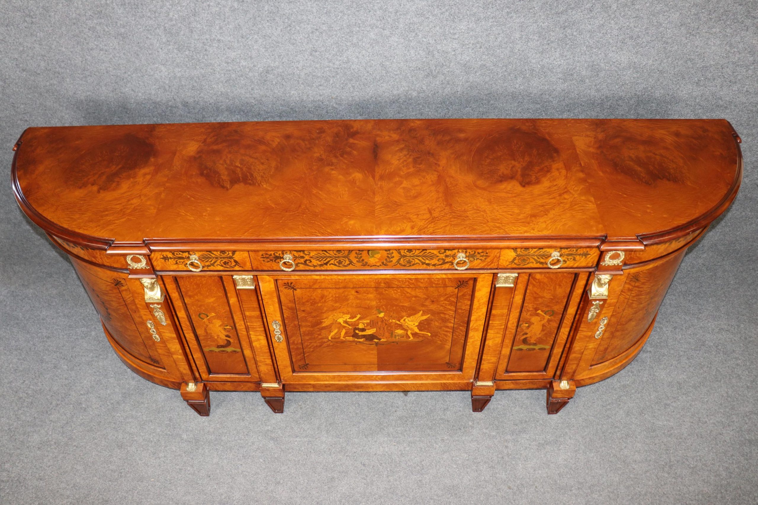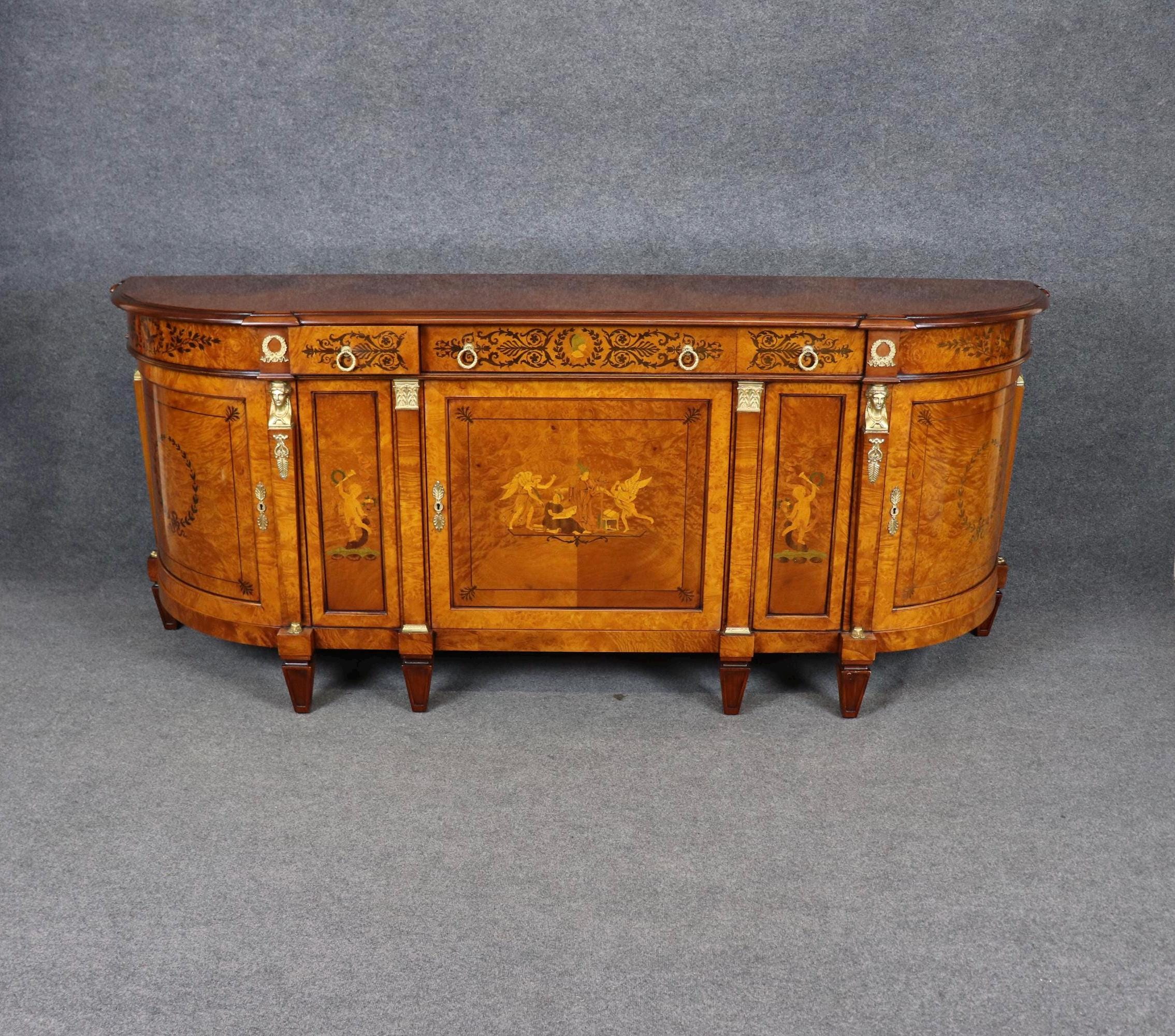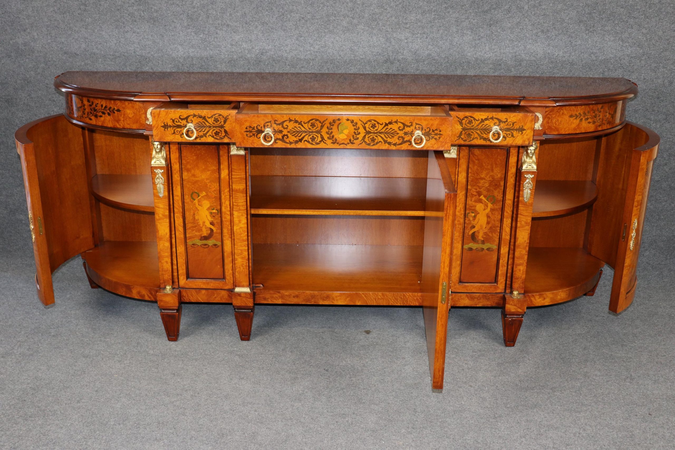 This vintage monumental Italian French Empire style sideboard by Rho Moili D’Epoca is made of the highest quality and is bound to bring a sense of class and luxury into your home or place of choosing! This piece has 3 doors that open to spacious storage areas each containing one shelf, perfect for storing away your personal belongings! This will definitely be a conversation starter in any entryway, living room, dining room or office. Antique furniture and vintage pieces have stood the test of time and this sideboard is no exception! With its quality materials and great craftsmanship this is bound to last you and your family for many years to come. This piece is in good vintage condition with the exception of some light surface scratches and some minor finish loss as to be expected with an item of this age but otherwise good condition.