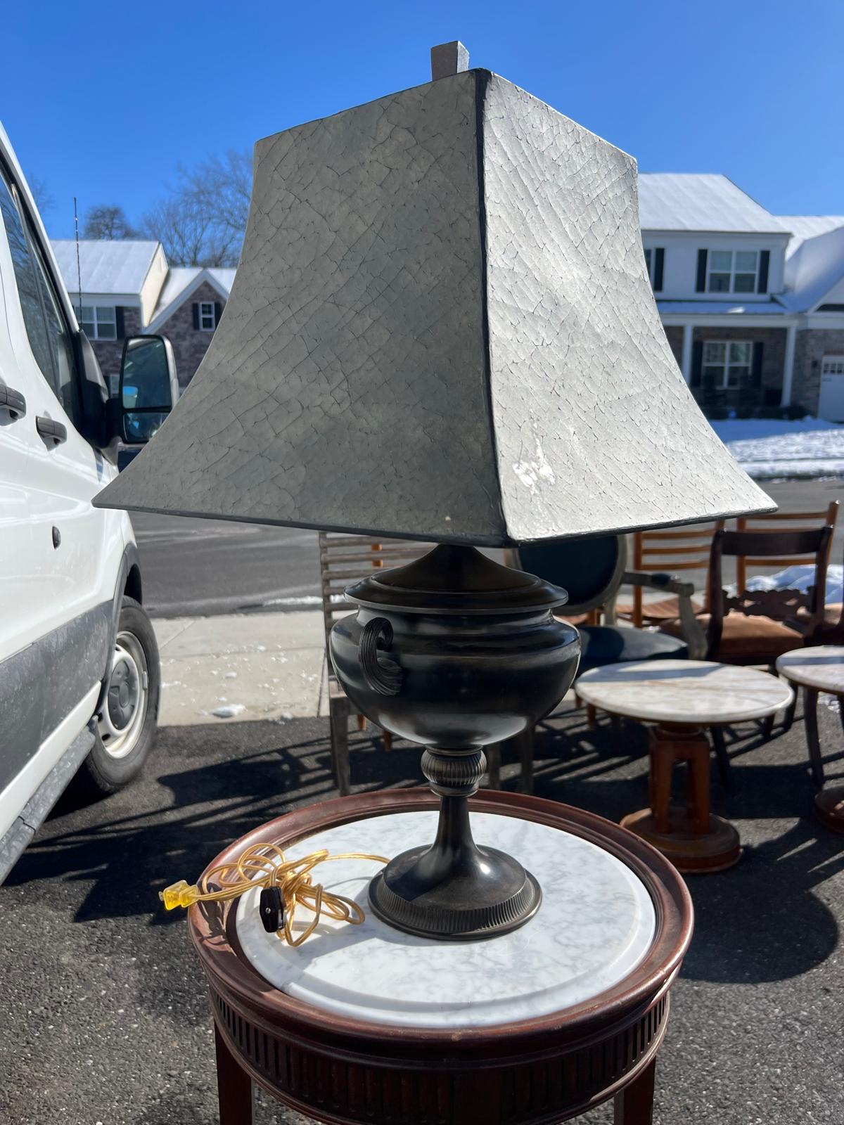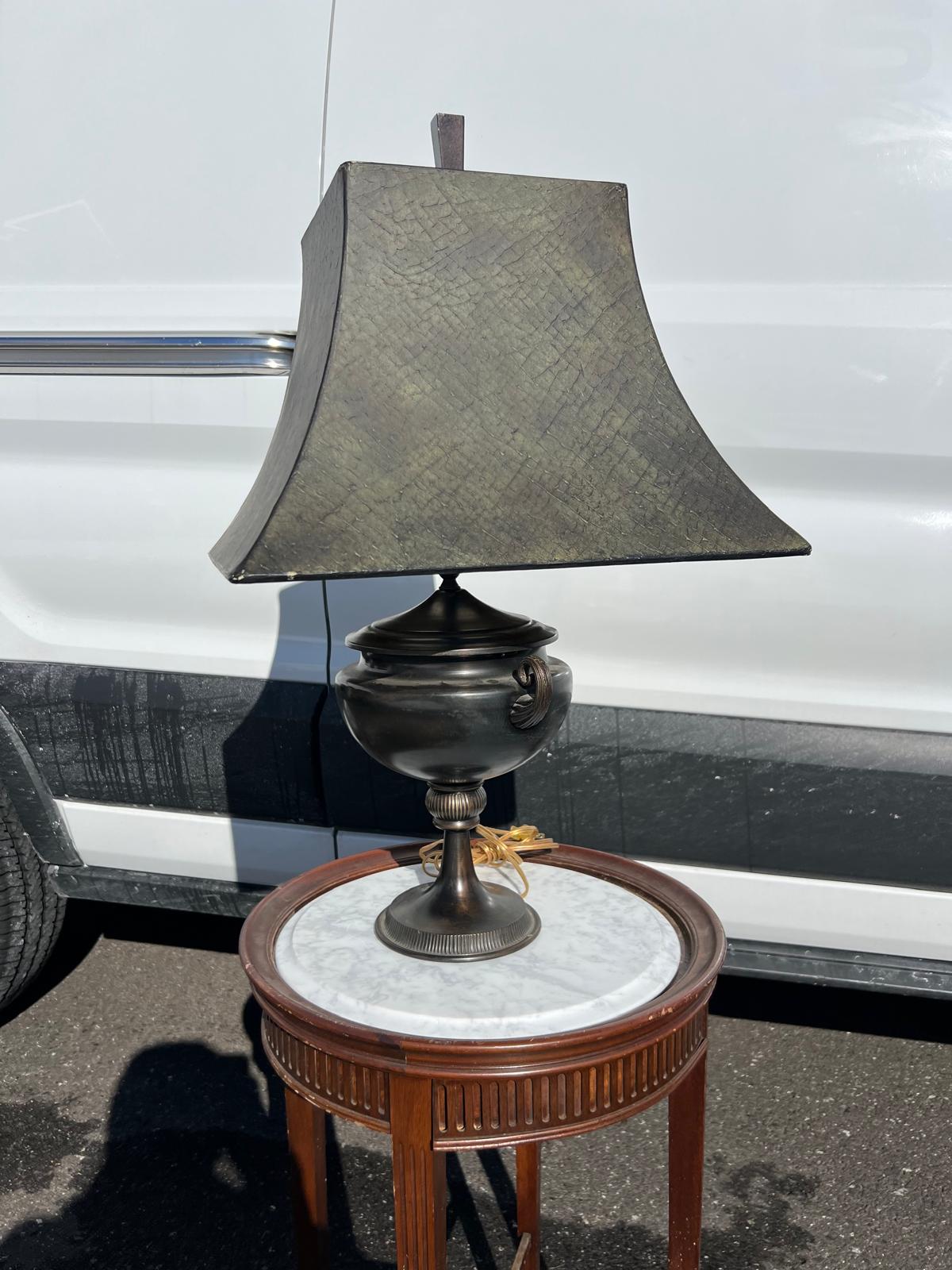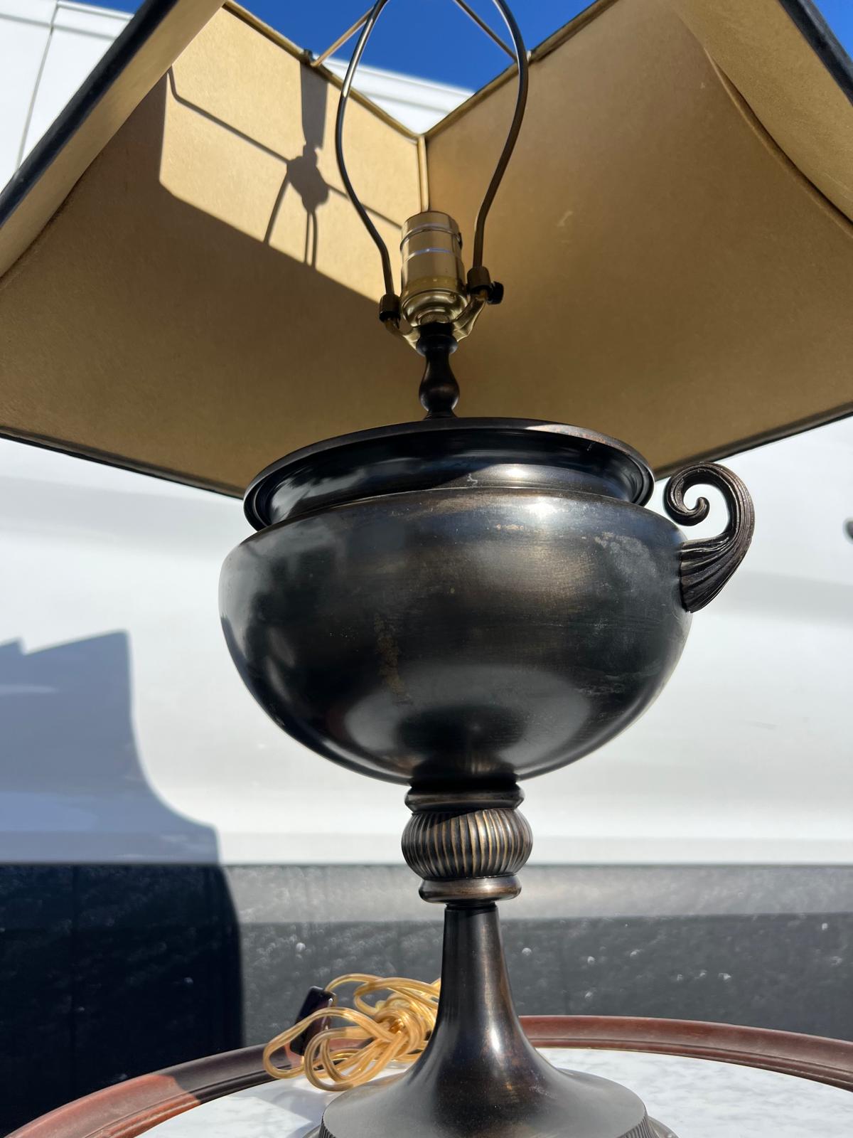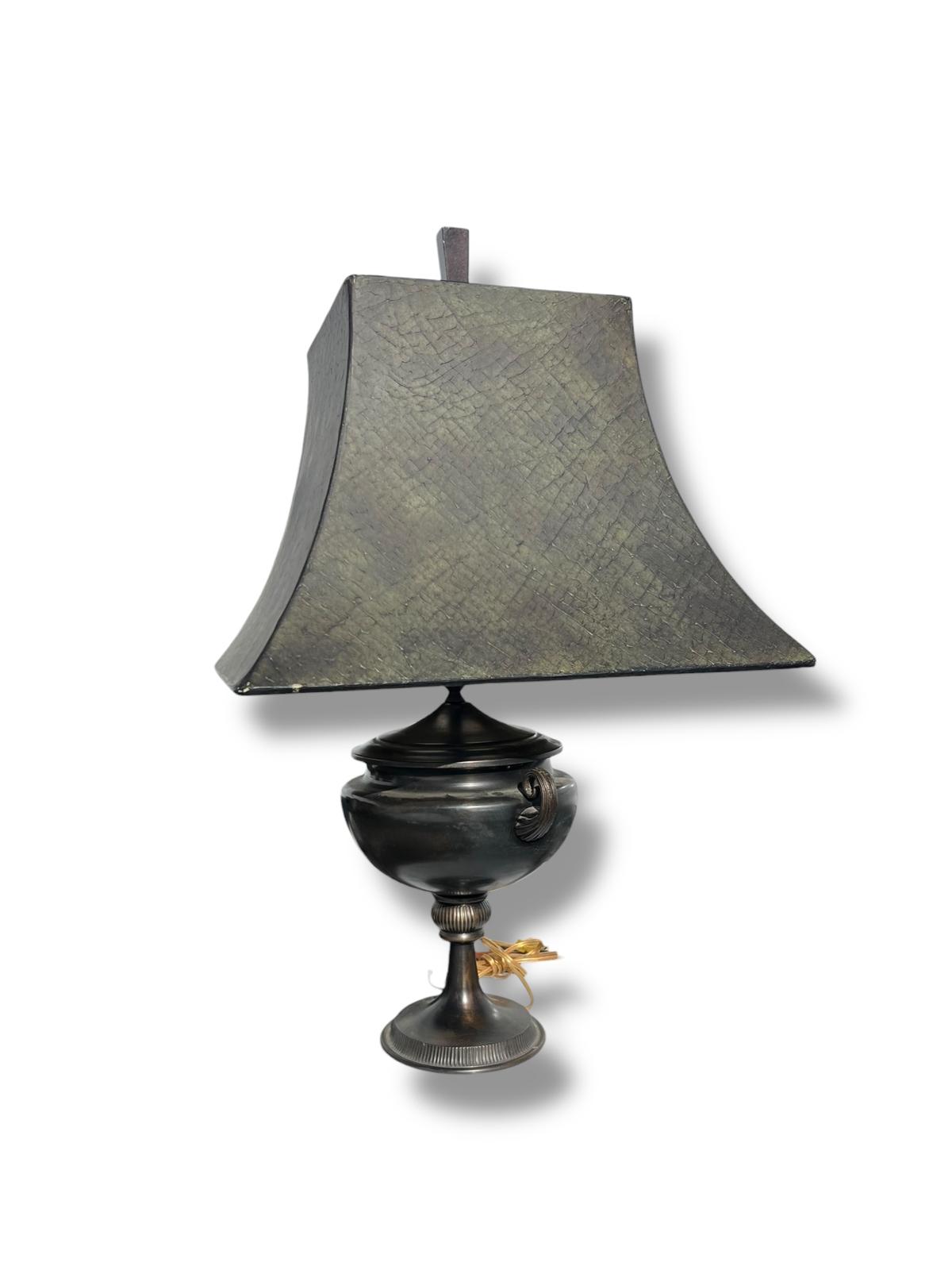 This table lamp from the 1990s features a refined neoclassical design, modeled after classical urn forms. The lamp is finished in a deep, dark patinated tone that reads as bronze-black, giving it a timeless and architectural presence. It is paired with a structured gray and black square shade that complements the classic silhouette while keeping the overall look tailored and versatile for both traditional and transitional interiors. The shade shows one small spot that would benefit from light cleaning, while the lamp body itself is in good condition, with only minor surface wear consistent with age and use. The size is 28.5”High to the finial X 6.5” Round Base.