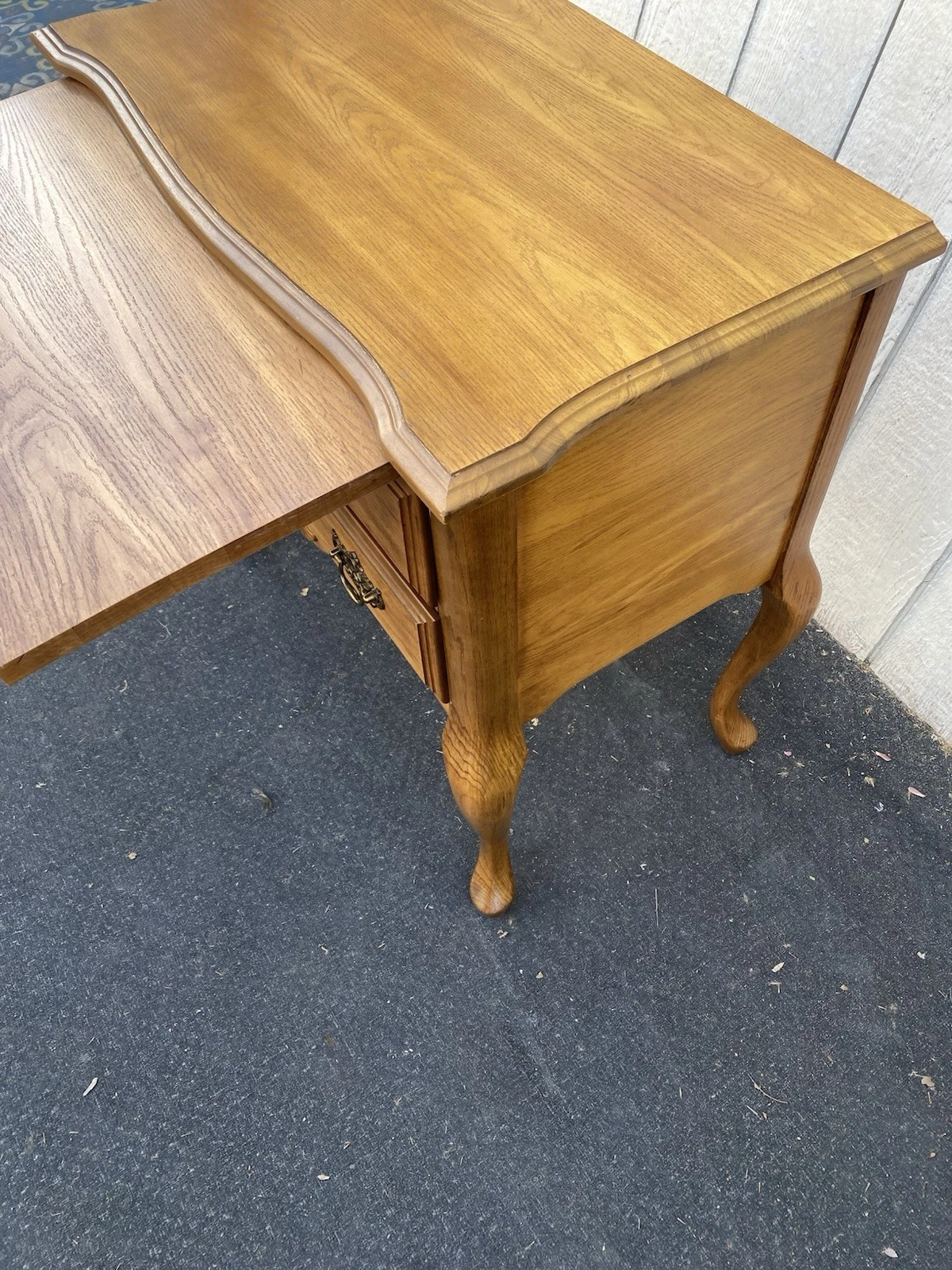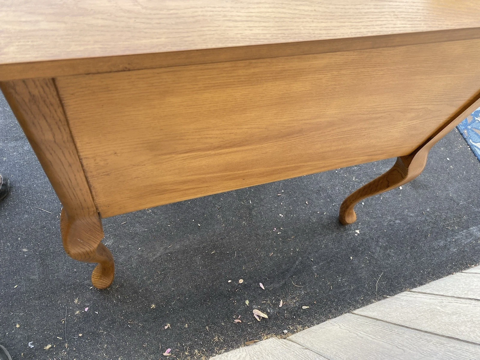 Crafted with care in the post-war era, this charming oak low boy dresser exudes a classic Queen Anne style, making it a delightful addition to any space. Its two sturdy drawers provide ample storage, while the convenient pull-out extension offers an added workspace, perfect for writing or displaying cherished items. With its warm oak finish and timeless design, this piece not only showcases fine craftsmanship but also brings a touch of history and character into your home, reflecting the enduring quality of handmade furniture.