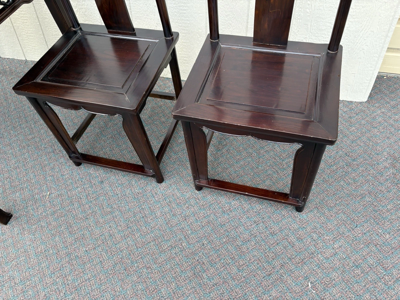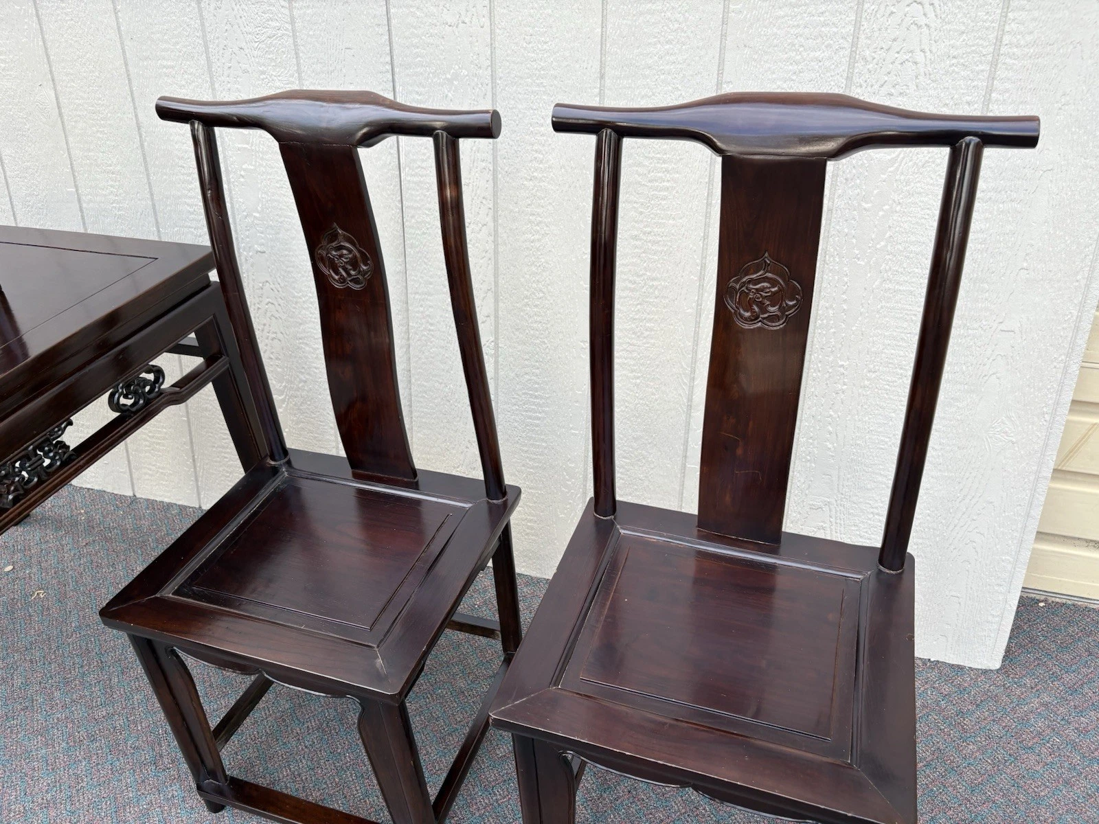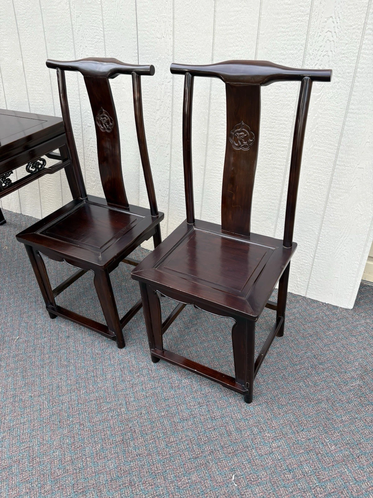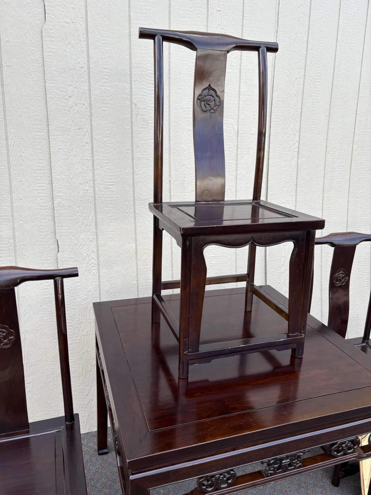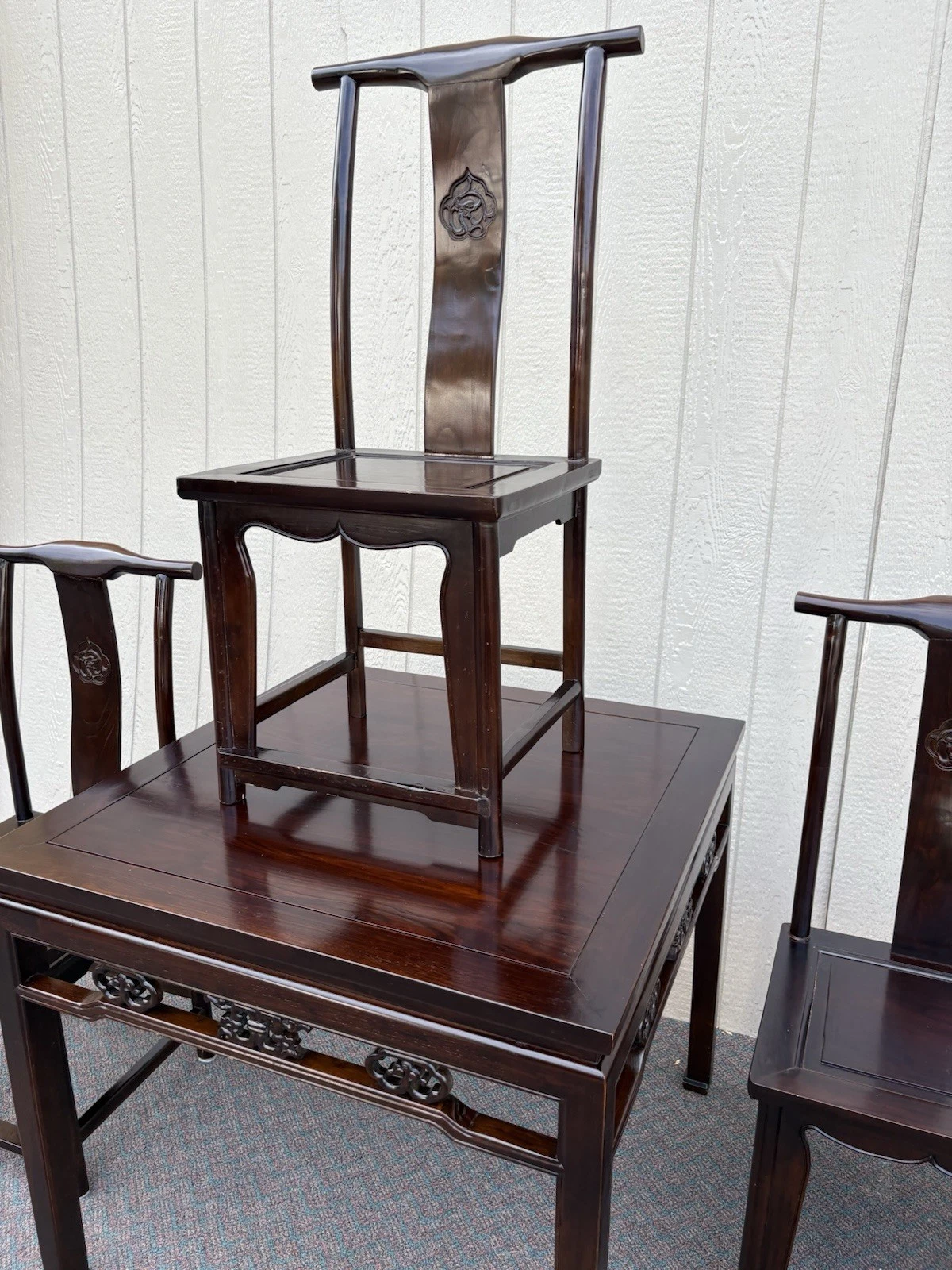 Embrace the elegance of this post-1950s Oriental dining set, featuring a beautifully crafted ebony table accompanied by four matching side chairs. Each piece showcases meticulous craftsmanship, with the table’s smooth surface inviting shared meals and memorable gatherings. The graceful lines and intricate details reflect a timeless design that enhances any dining space, while the sturdy construction promises years of enjoyment. Perfect for family dinners or intimate entertaining, this set embodies both warmth and sophistication, making it a cherished addition to your home.