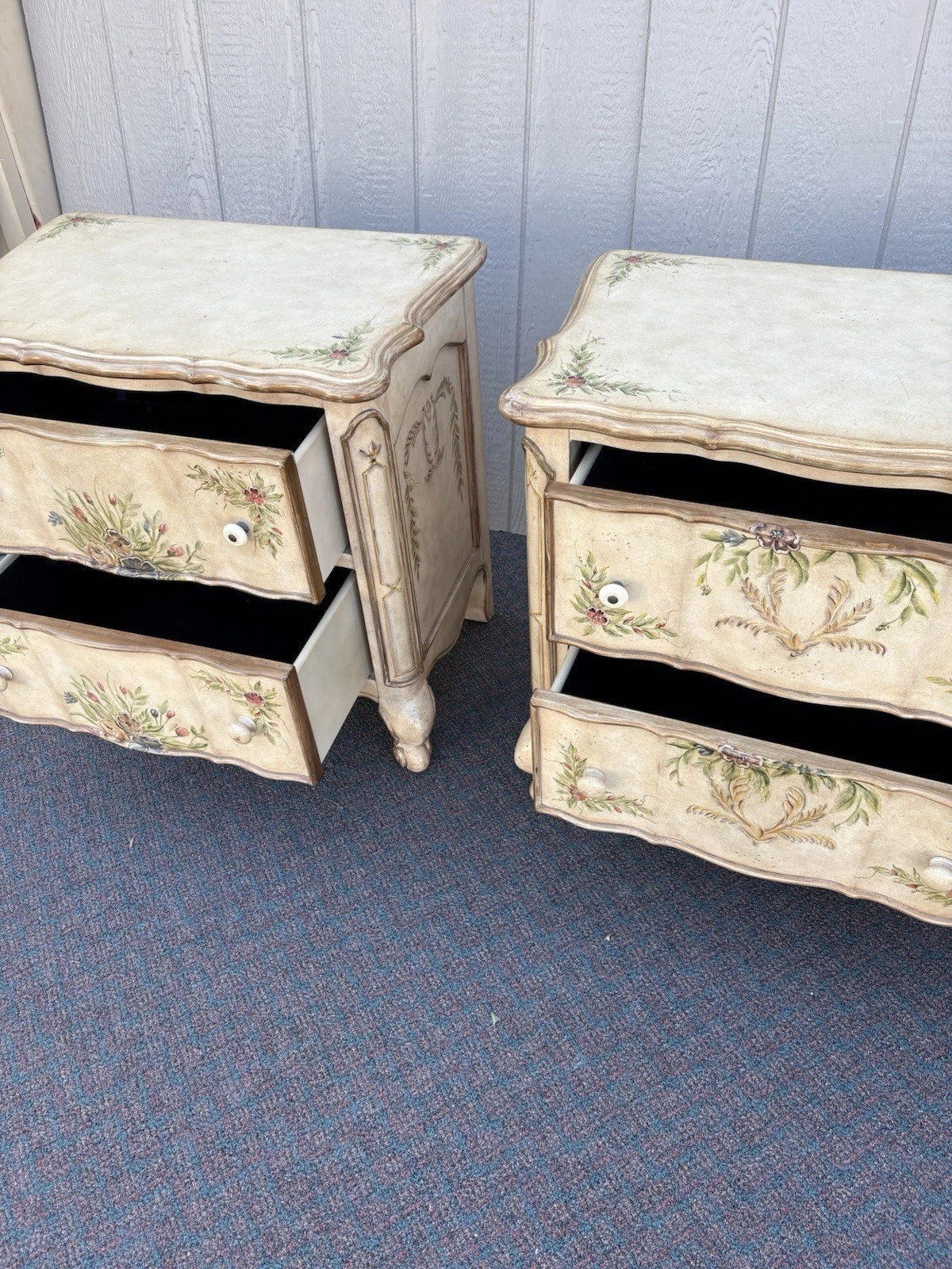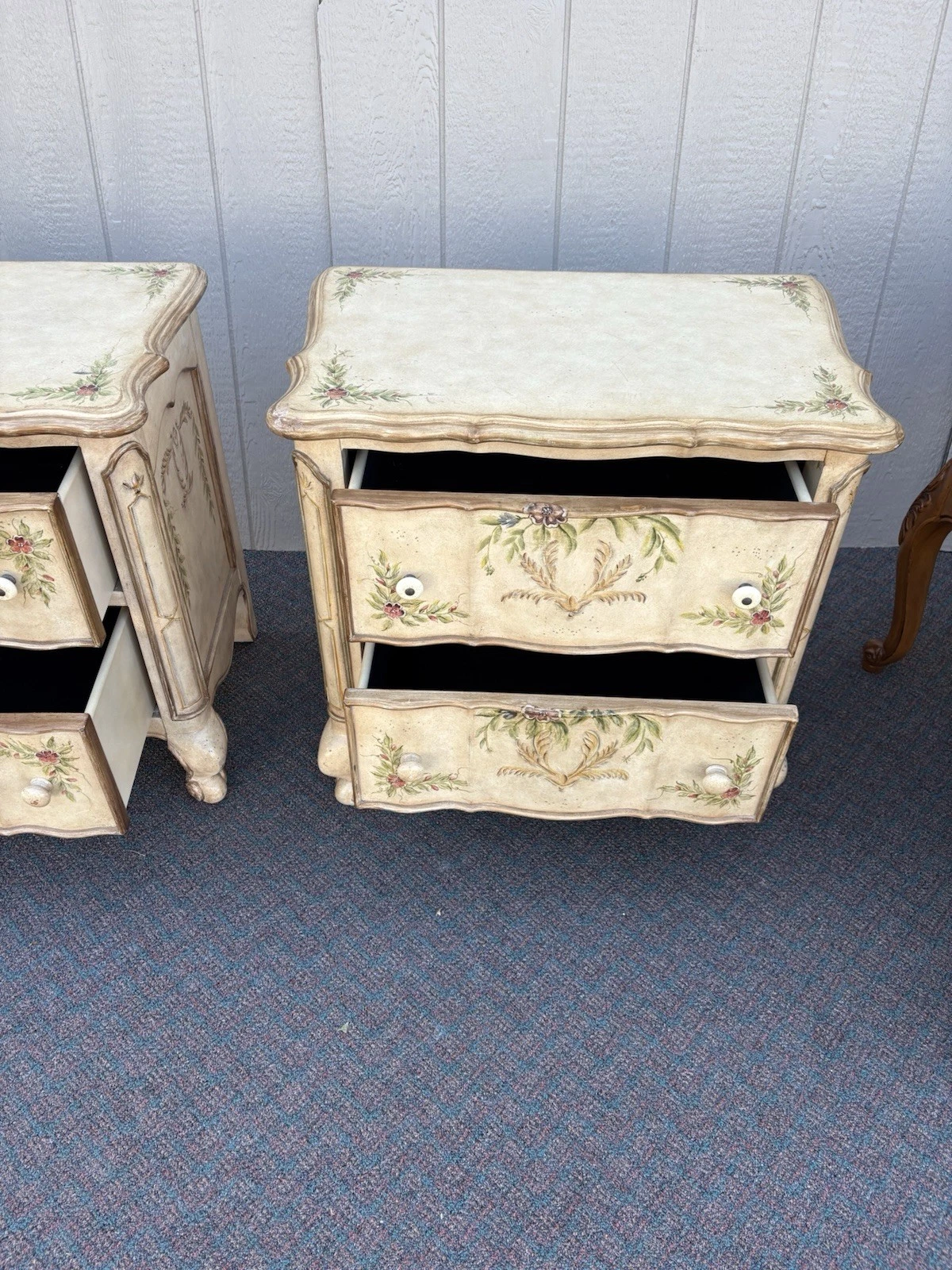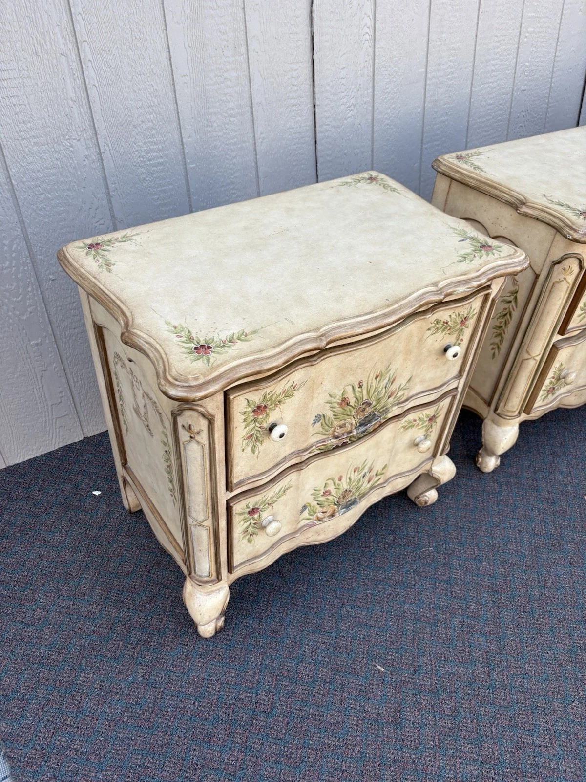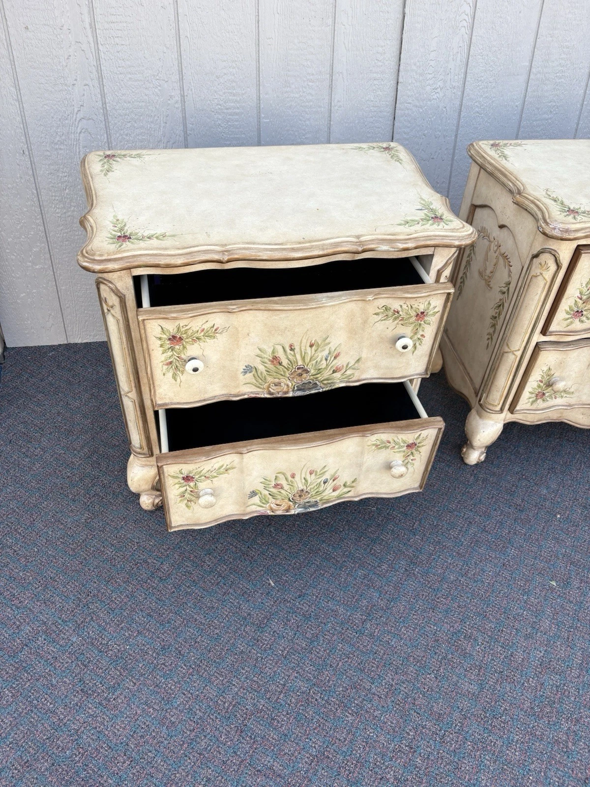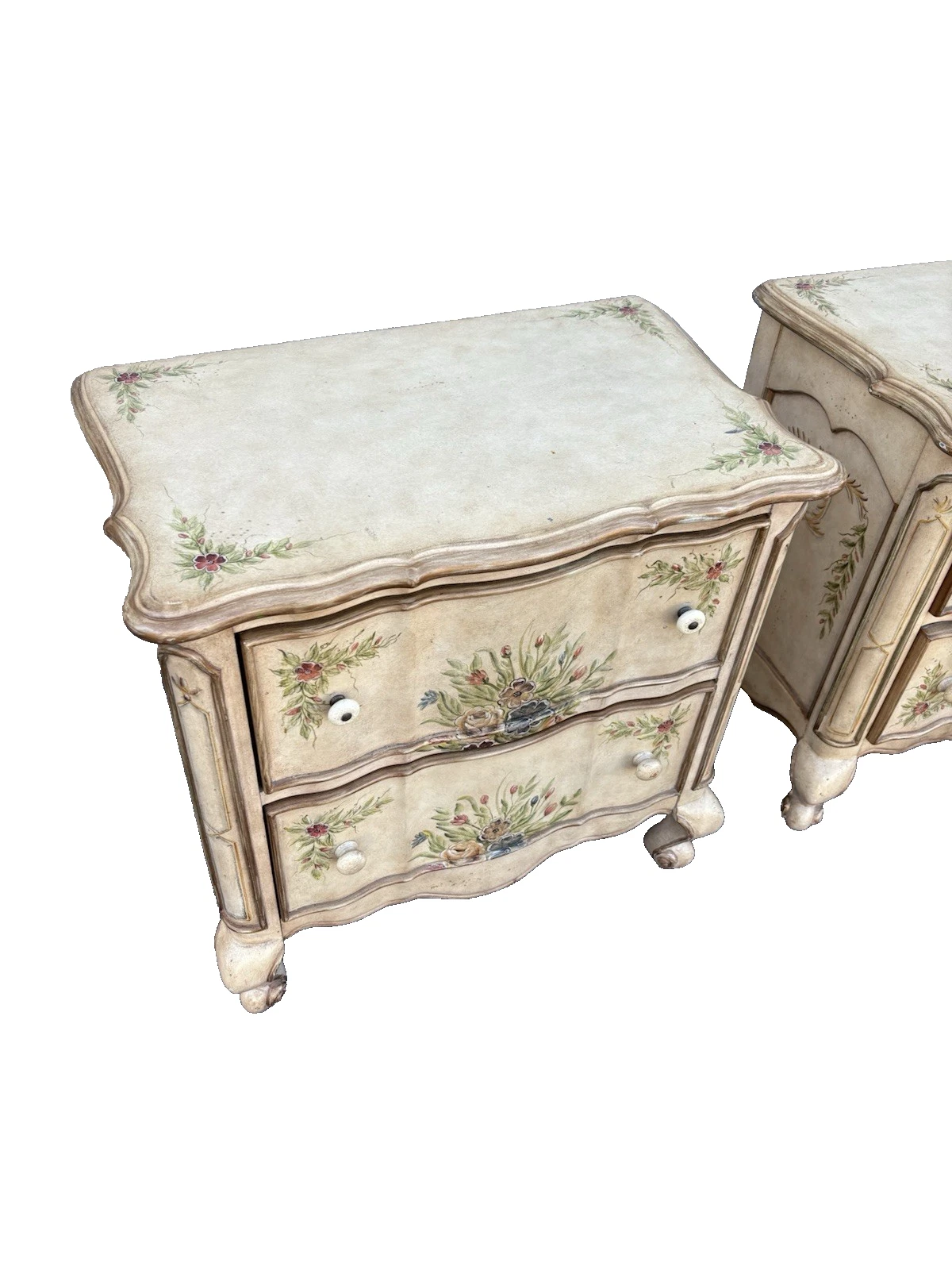 This charming pair of French country nightstands exudes a warm, rustic elegance that adds character to any bedroom. Crafted with care, each table features two sturdy drawers adorned with a delightful multicolor finish, showcasing the unique craftsmanship of the era. Their solid construction promises durability while the quaint design invites a touch of vintage charm into your home. Perfect for both function and style, these nightstands are not just furniture; they are pieces of history that can tell a story for generations to come.