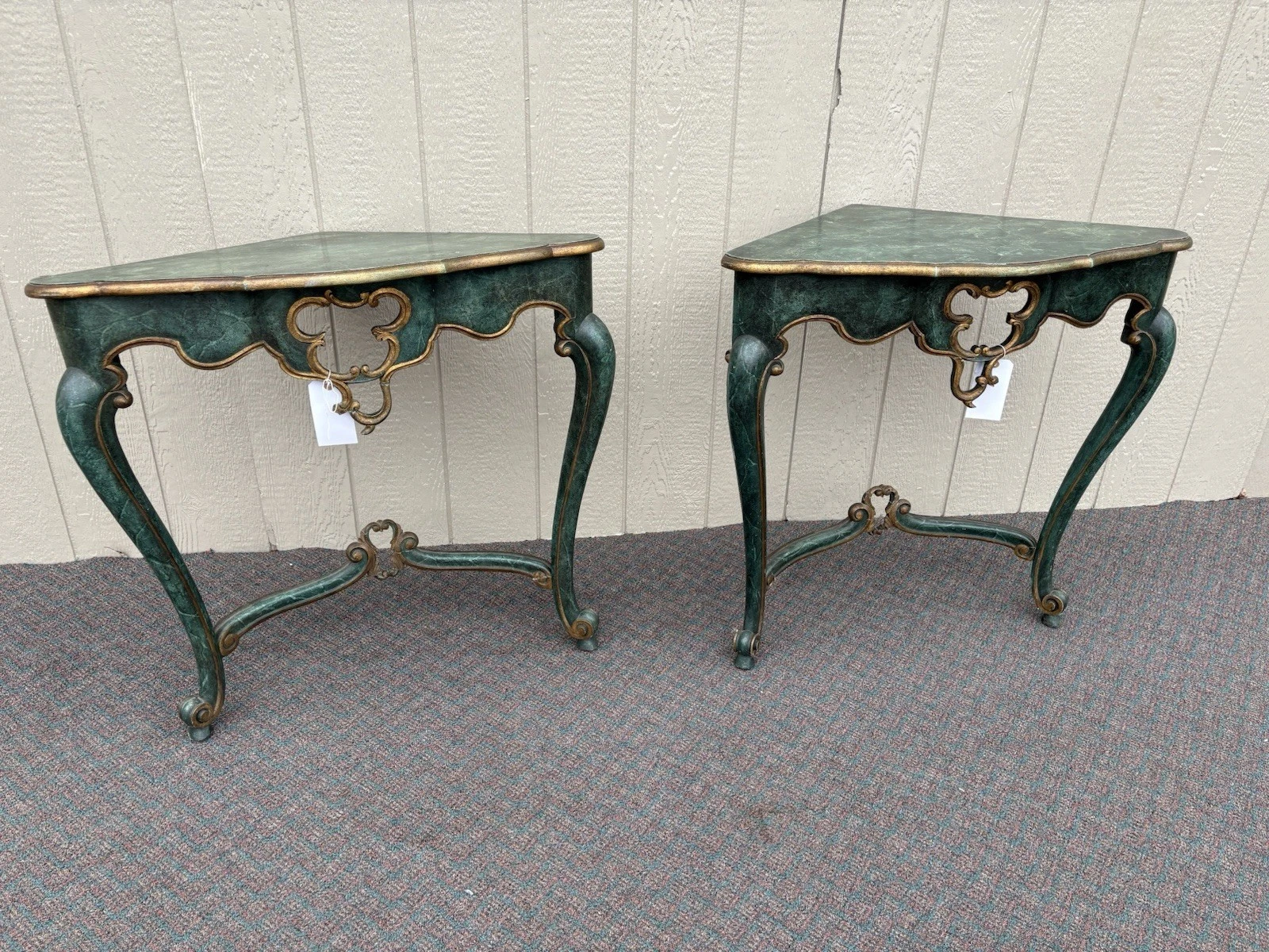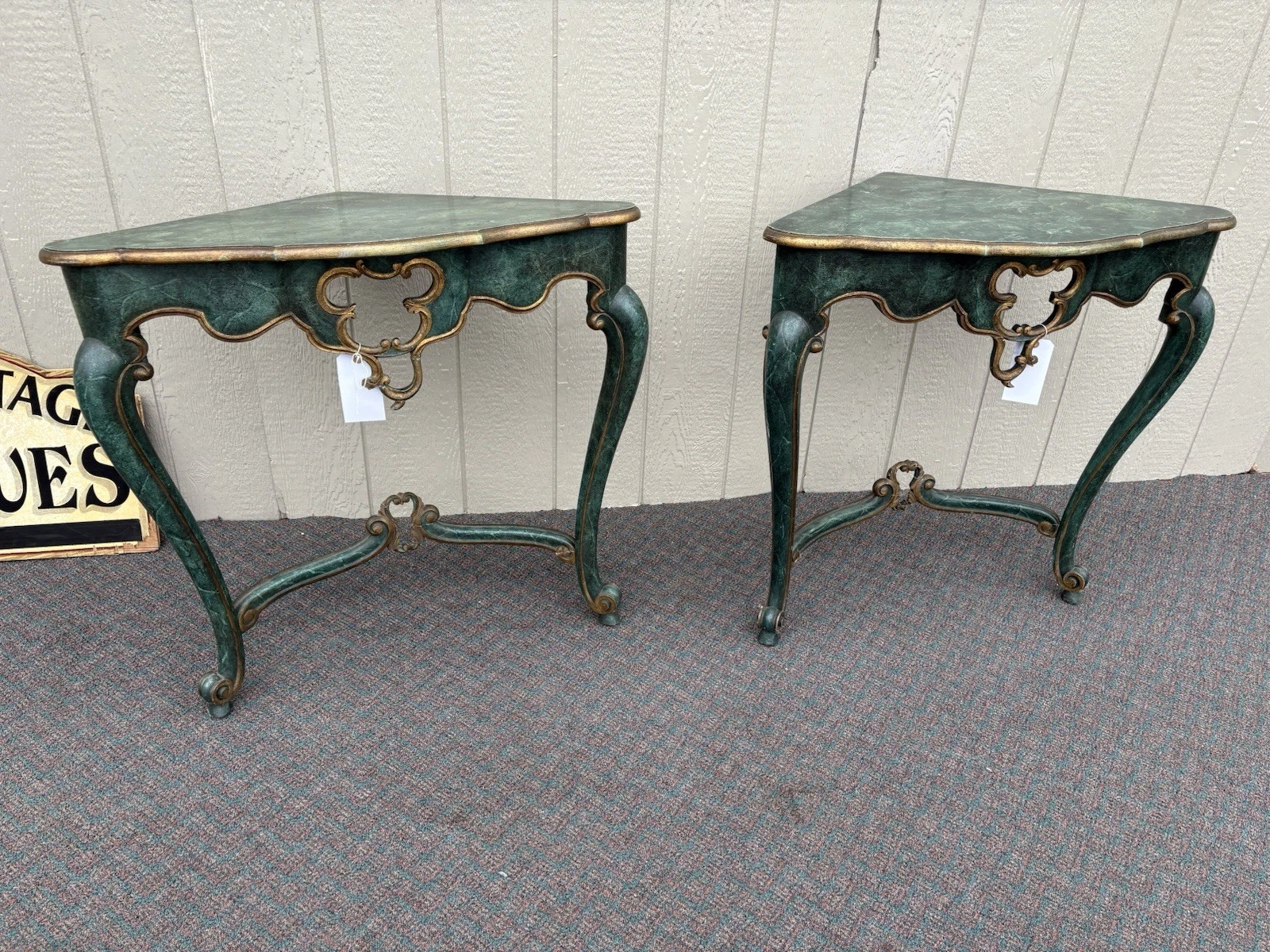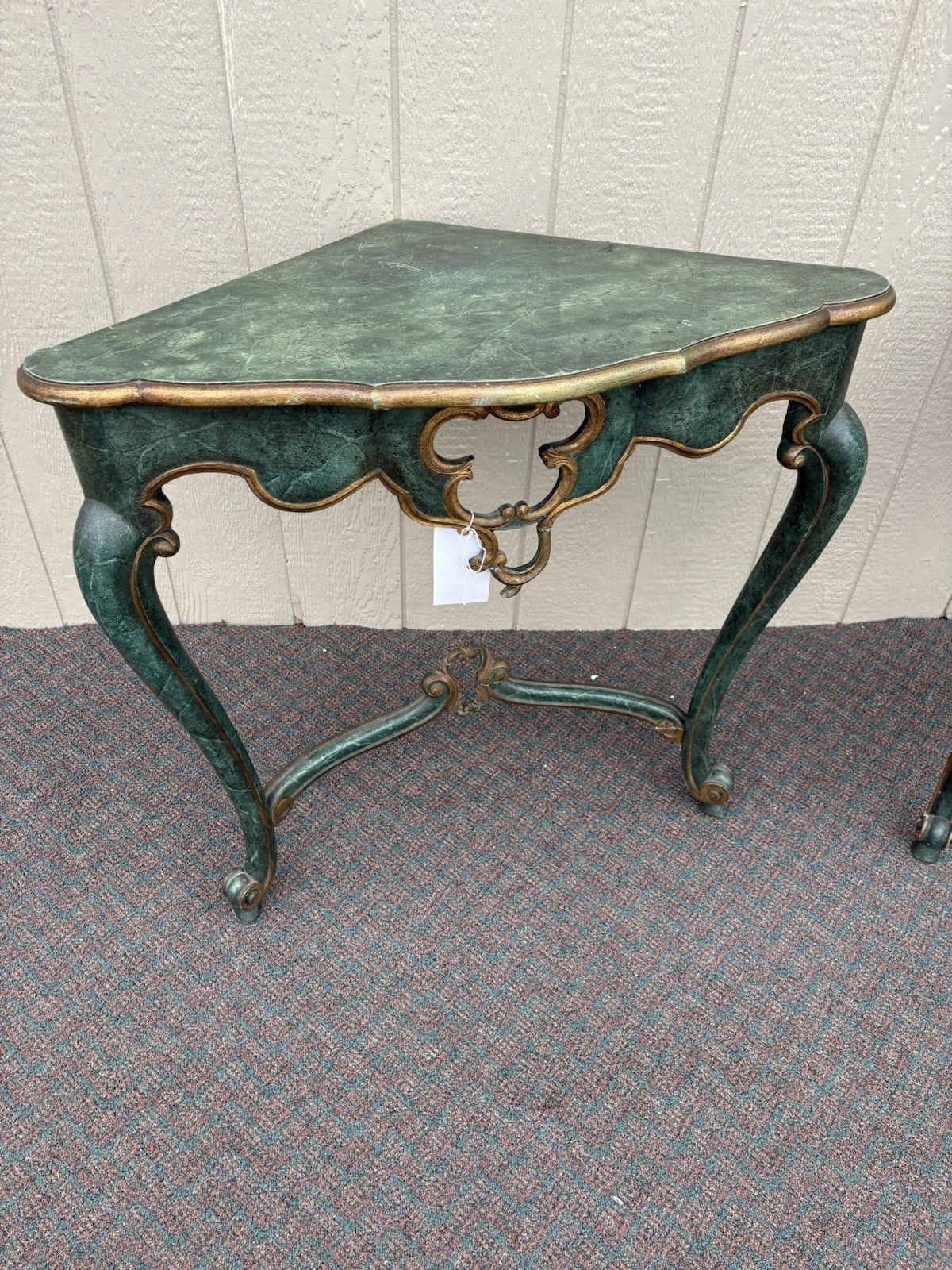 This charming pair of handmade corner tables exudes a delightful mix of character and craftsmanship, perfect for adding a touch of warmth to any room in your home. With their vibrant hand-painted finish and sturdy construction, these tables stand as a testament to skilled craftsmanship from the post-1950 era. Each piece not only serves as a functional surface but also as a unique decorative accent, inviting conversation and admiration from all who encounter them. The subtle wear adds to their vintage charm, making them a cherished addition to your decor.