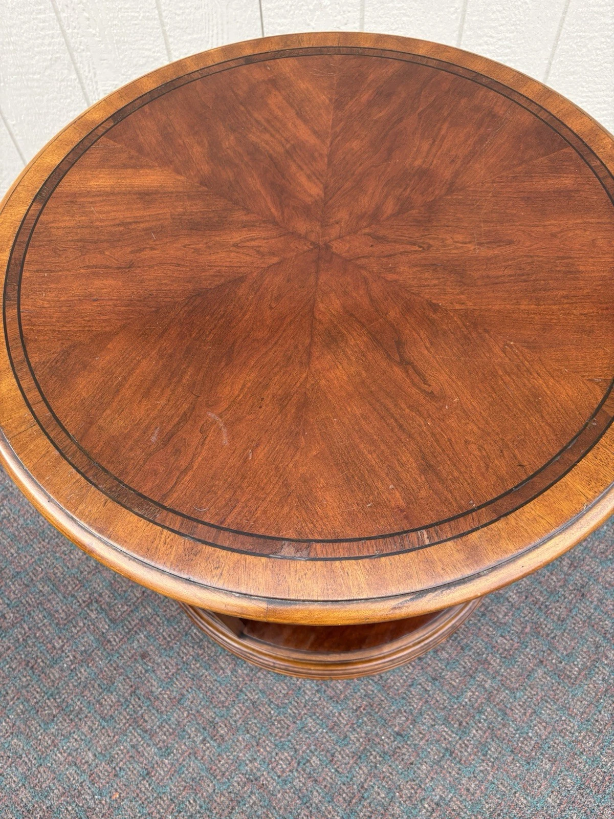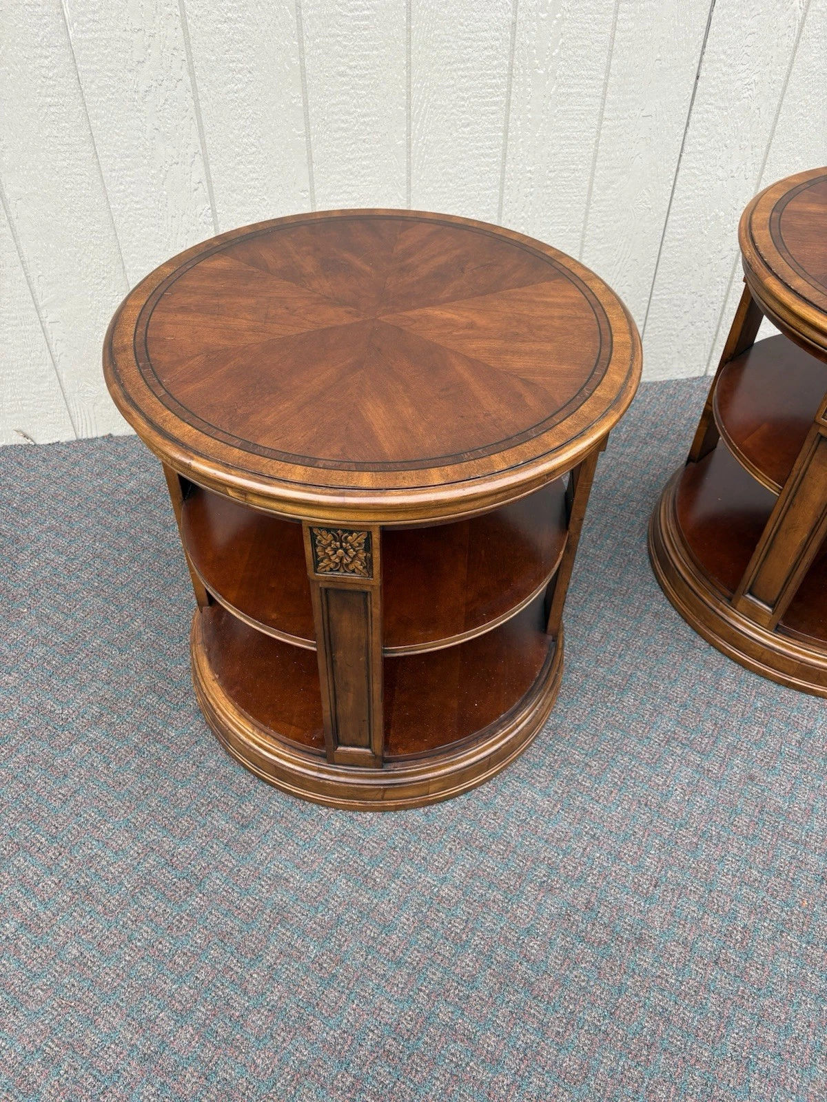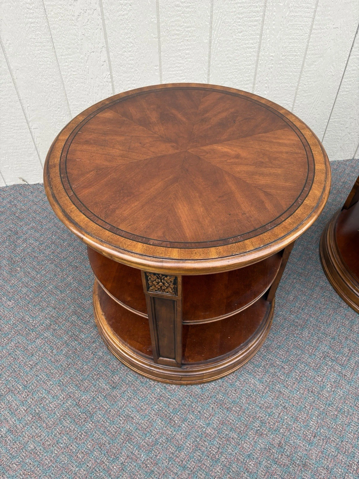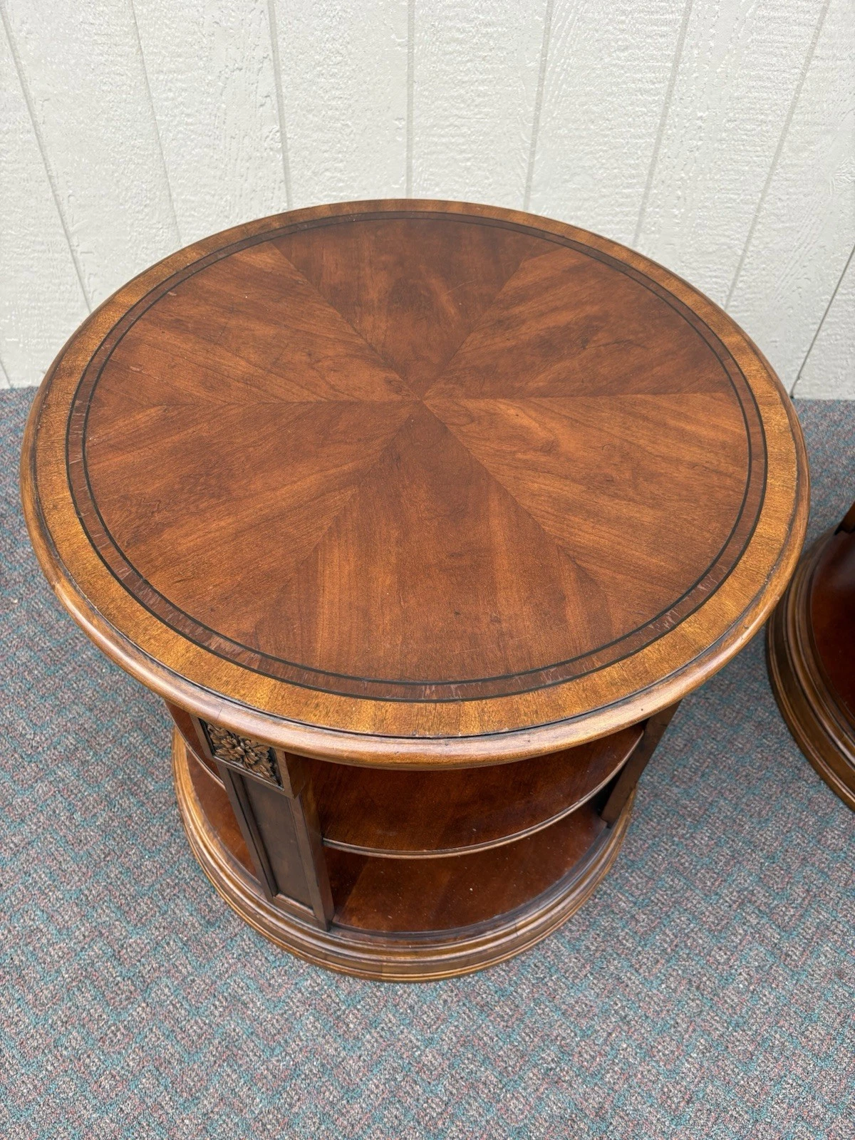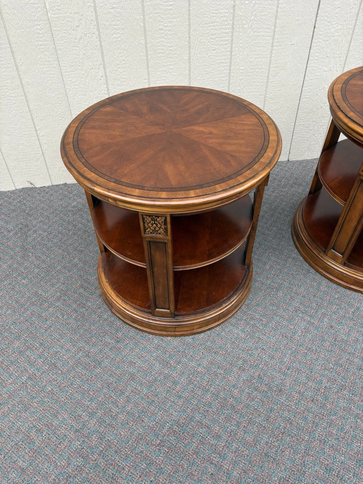 This charming pair of Ethan Allen Townhouse round lamp tables showcases the timeless beauty of banded mahogany, a material renowned for its rich hues and elegant grain. Each table, with its classic round shape, embodies a blend of modern style and enduring craftsmanship, making them versatile additions to any room. While one table presents in very good condition, the other tells a story with slight imperfections that add to its character. Together, they offer a delightful touch of sophistication and warmth, perfect for enhancing your living space.