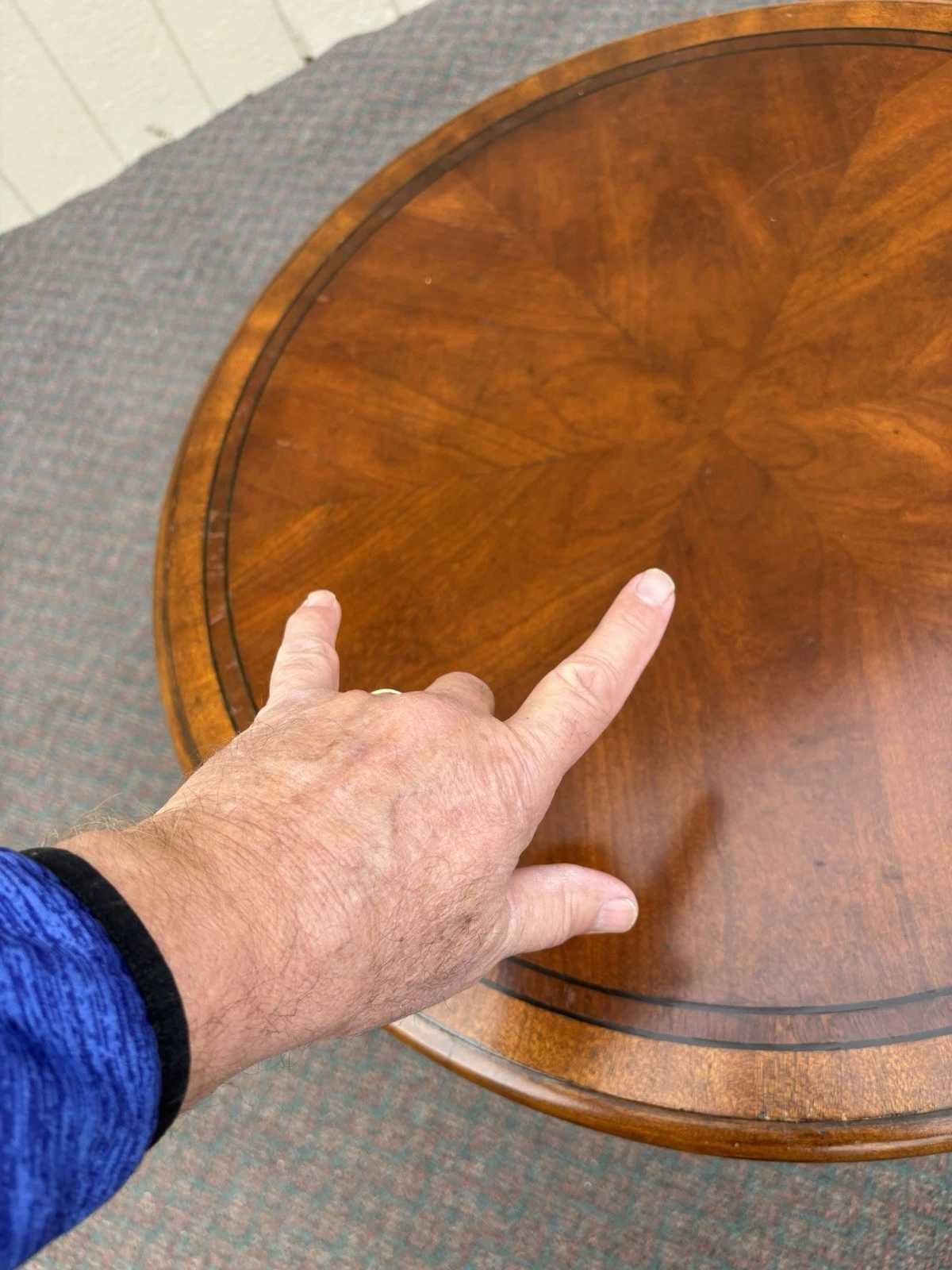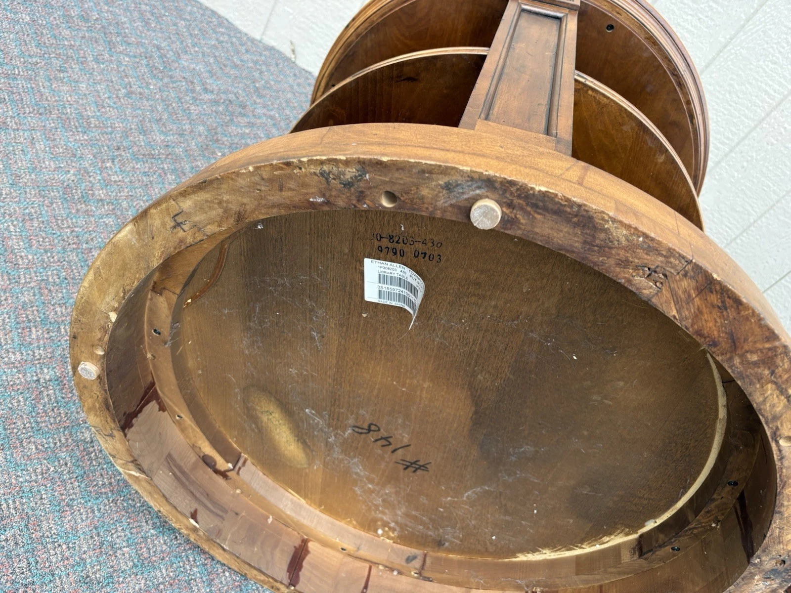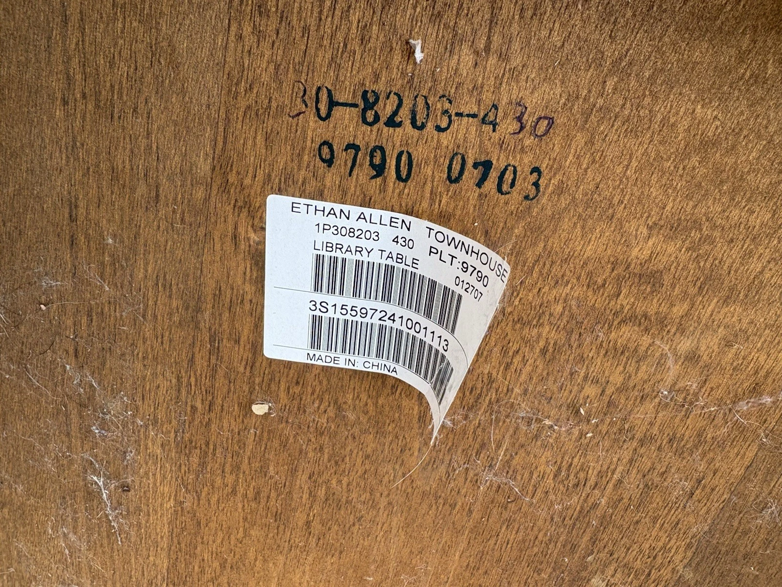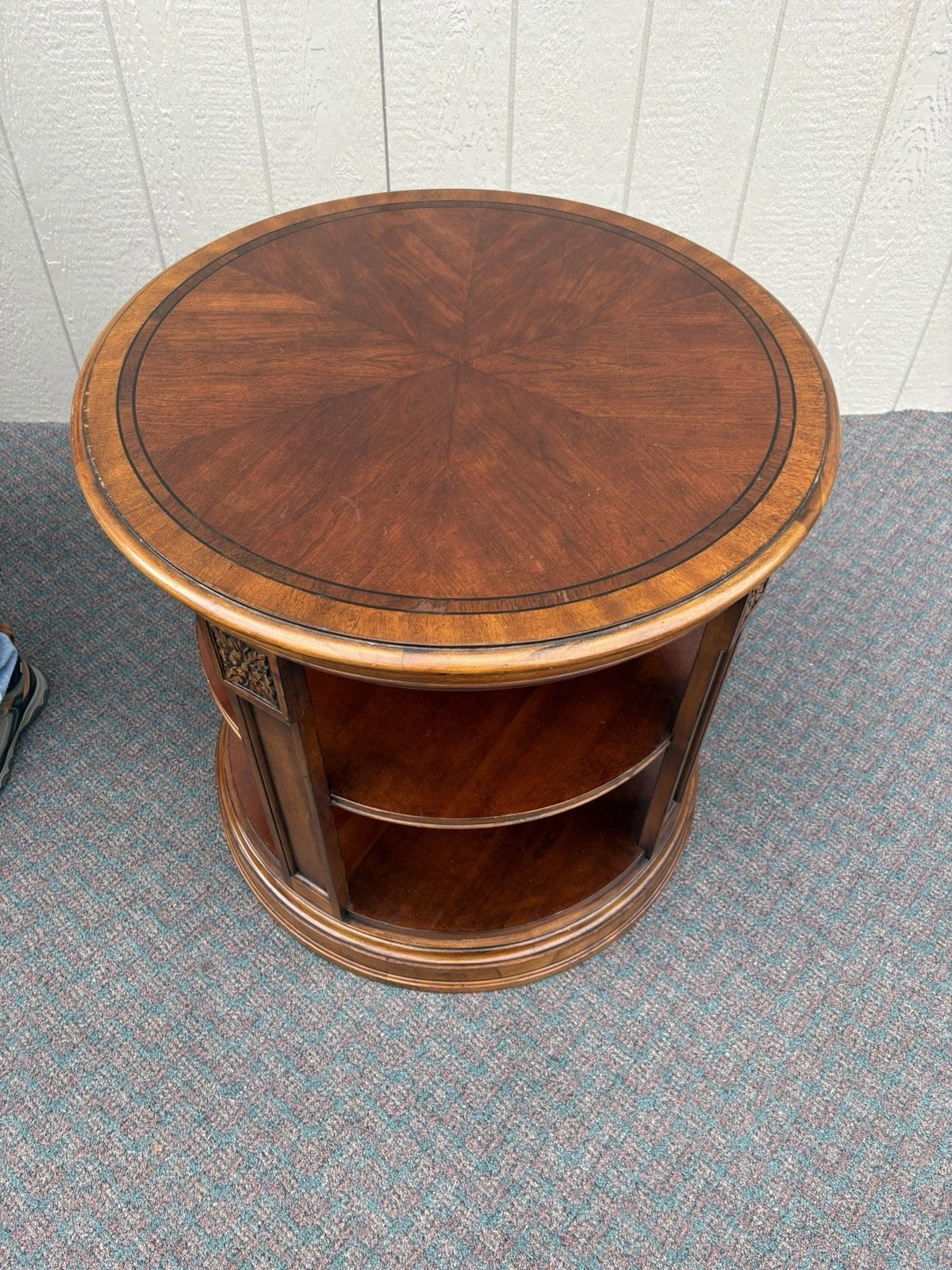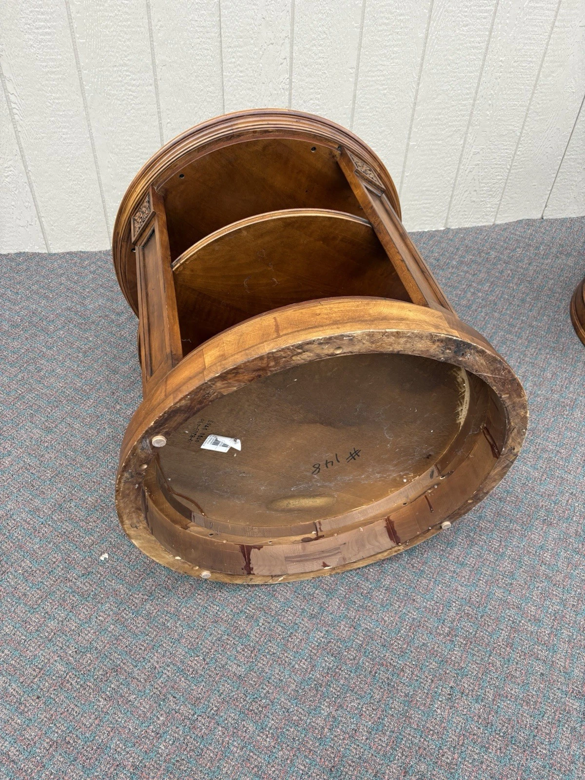 This charming pair of Ethan Allen Townhouse round lamp tables showcases the timeless beauty of banded mahogany, a material renowned for its rich hues and elegant grain. Each table, with its classic round shape, embodies a blend of modern style and enduring craftsmanship, making them versatile additions to any room. While one table presents in very good condition, the other tells a story with slight imperfections that add to its character. Together, they offer a delightful touch of sophistication and warmth, perfect for enhancing your living space.