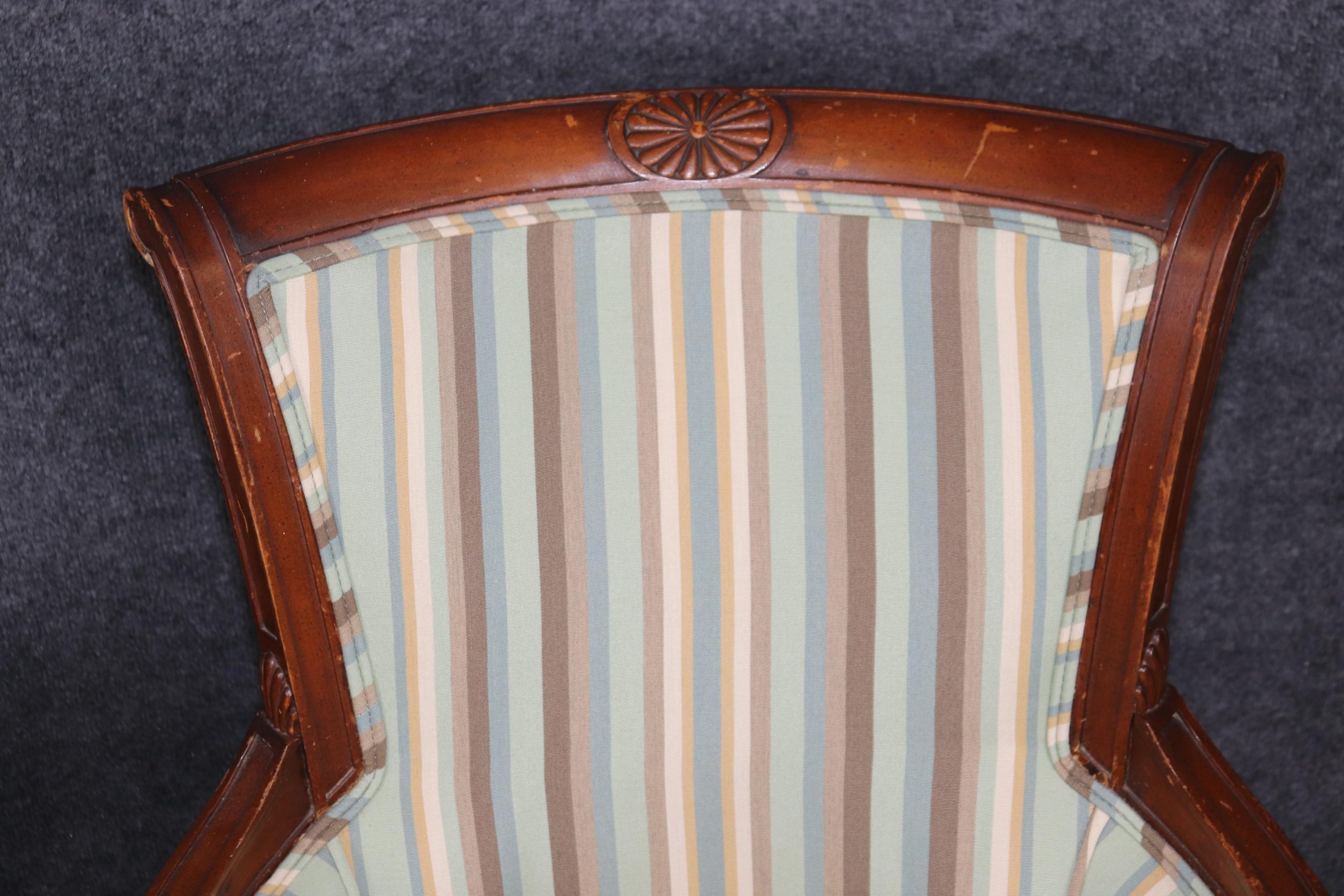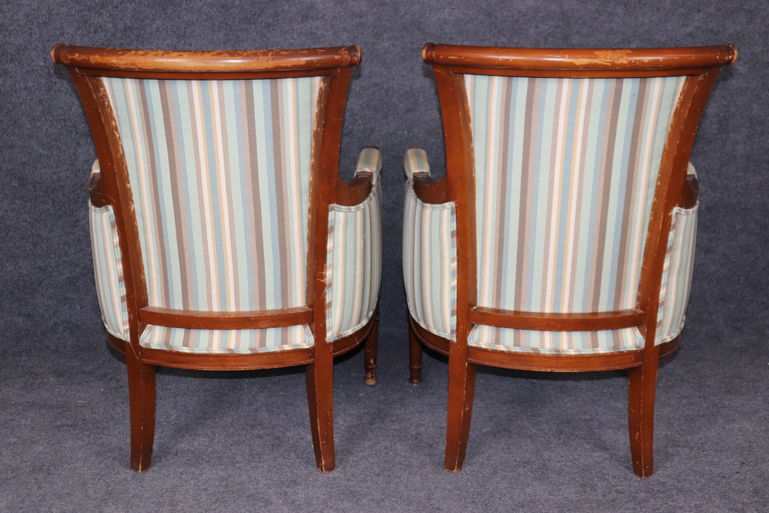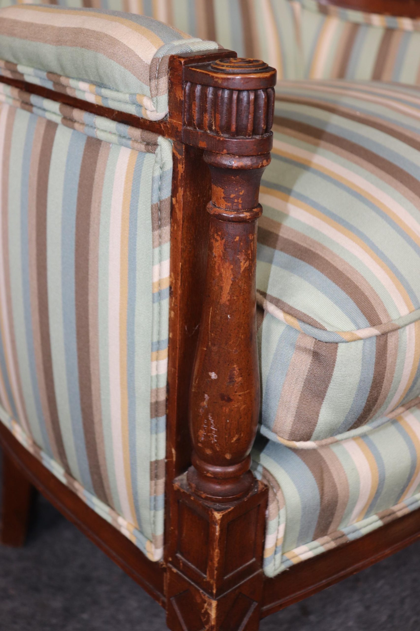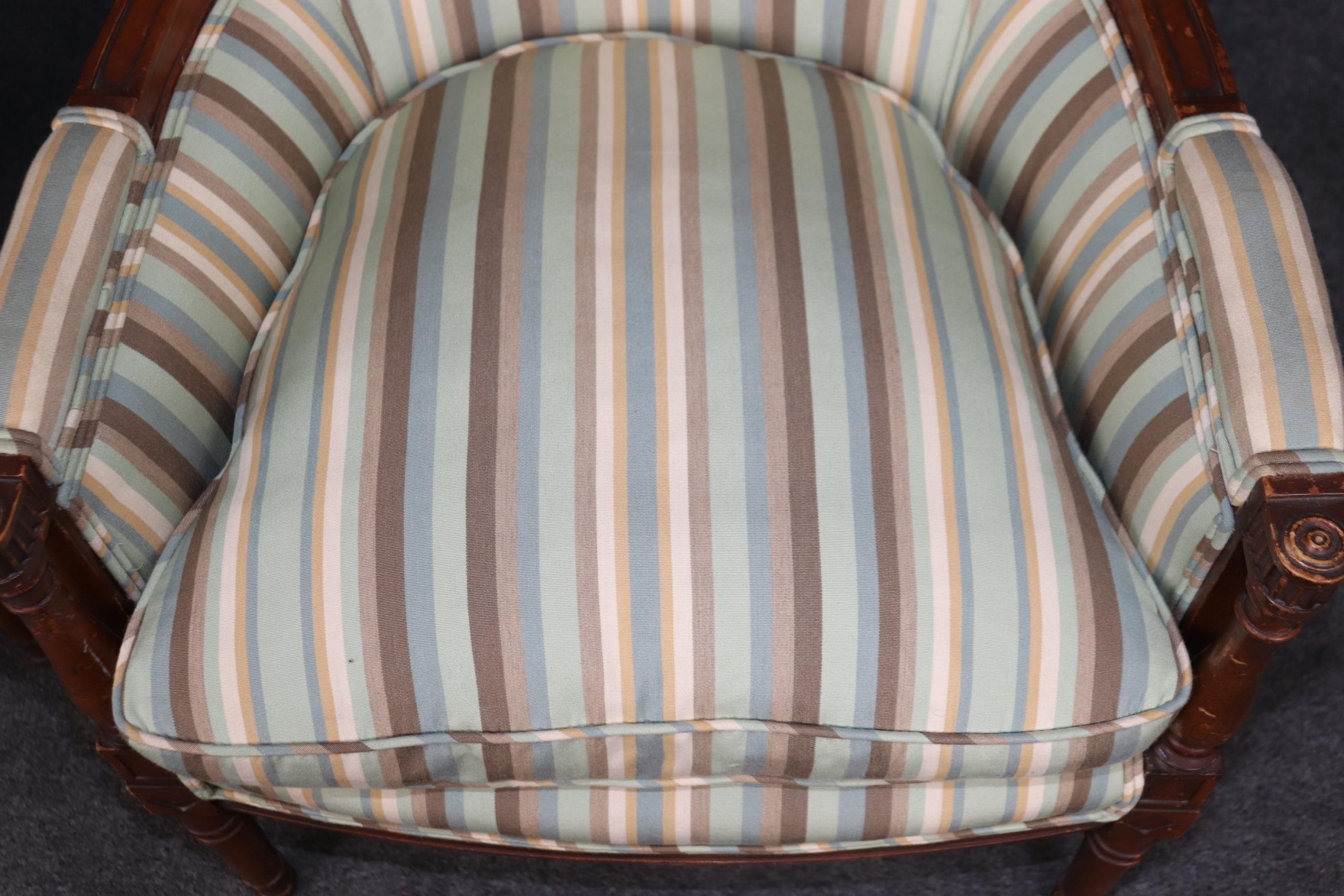 Pair Louis XVI Style Bergere Chairs: Distressed Wood, Striped Upholstery
