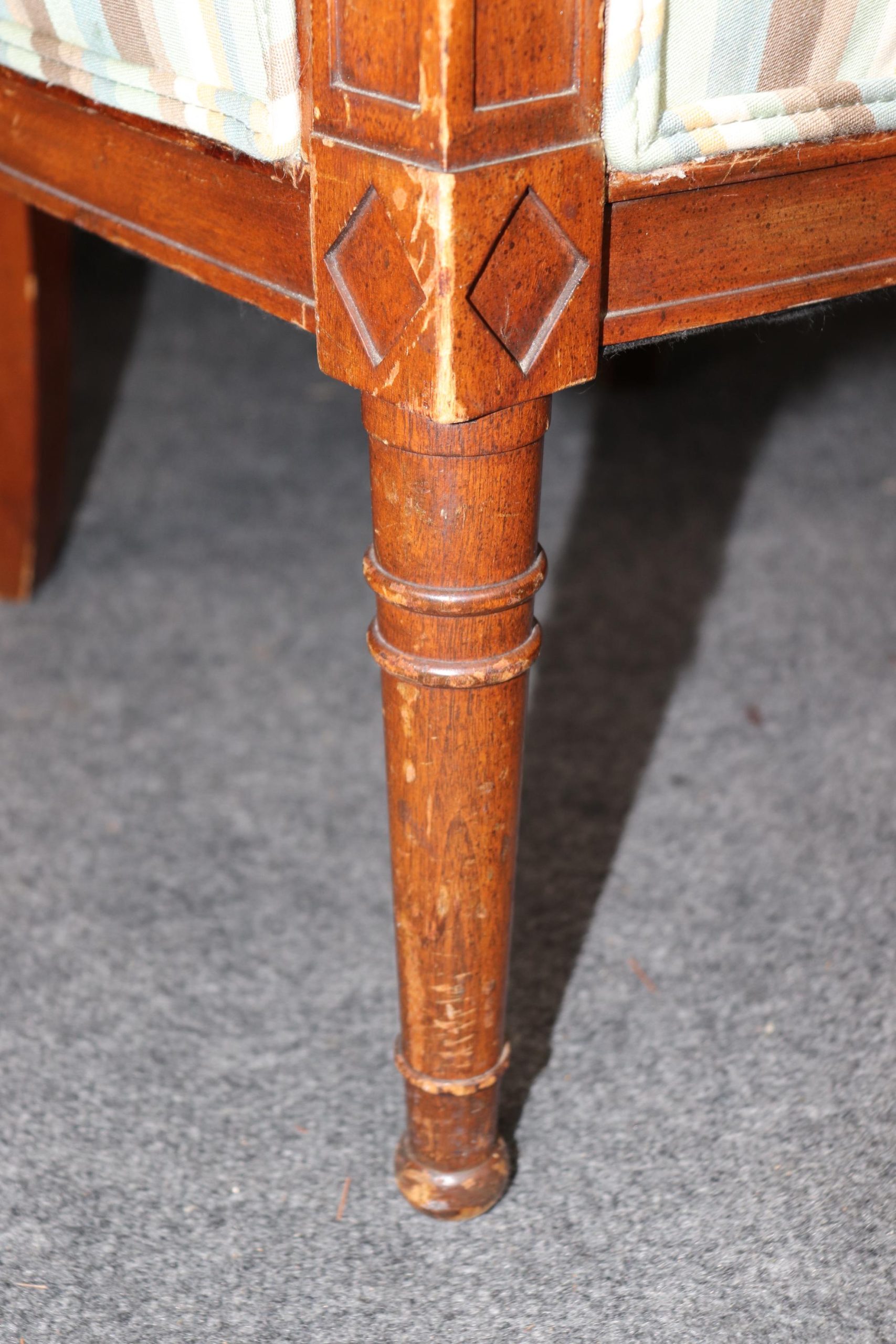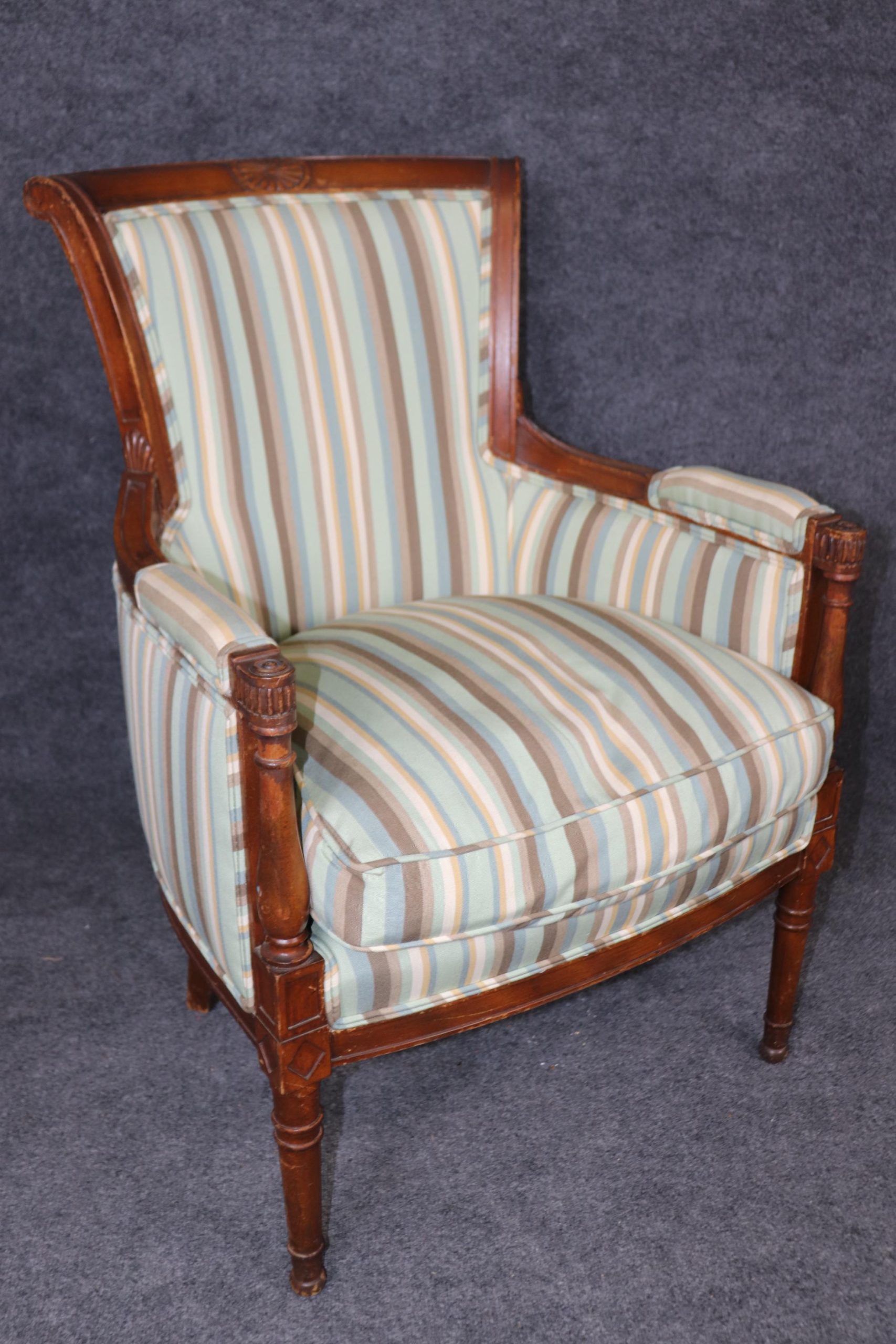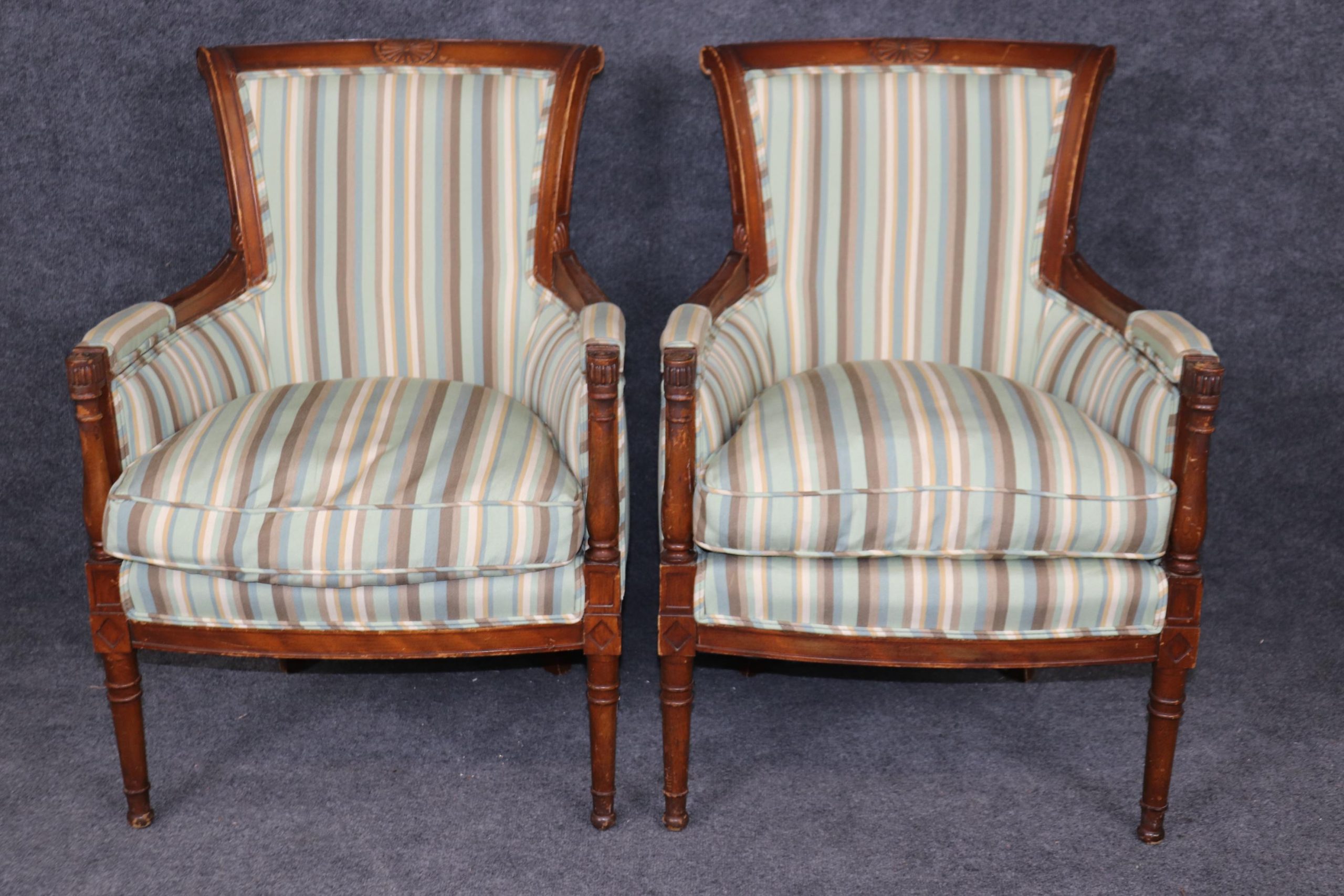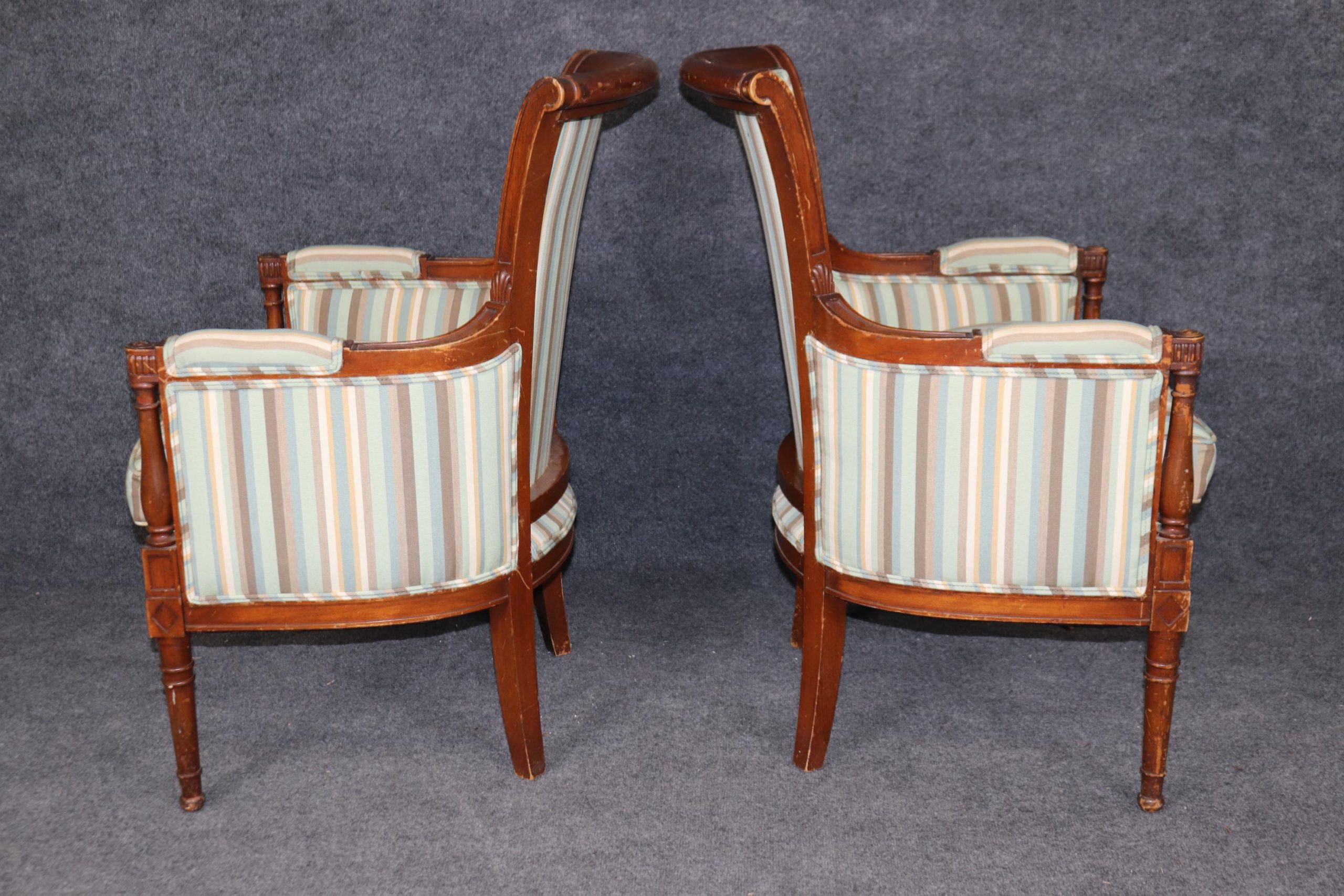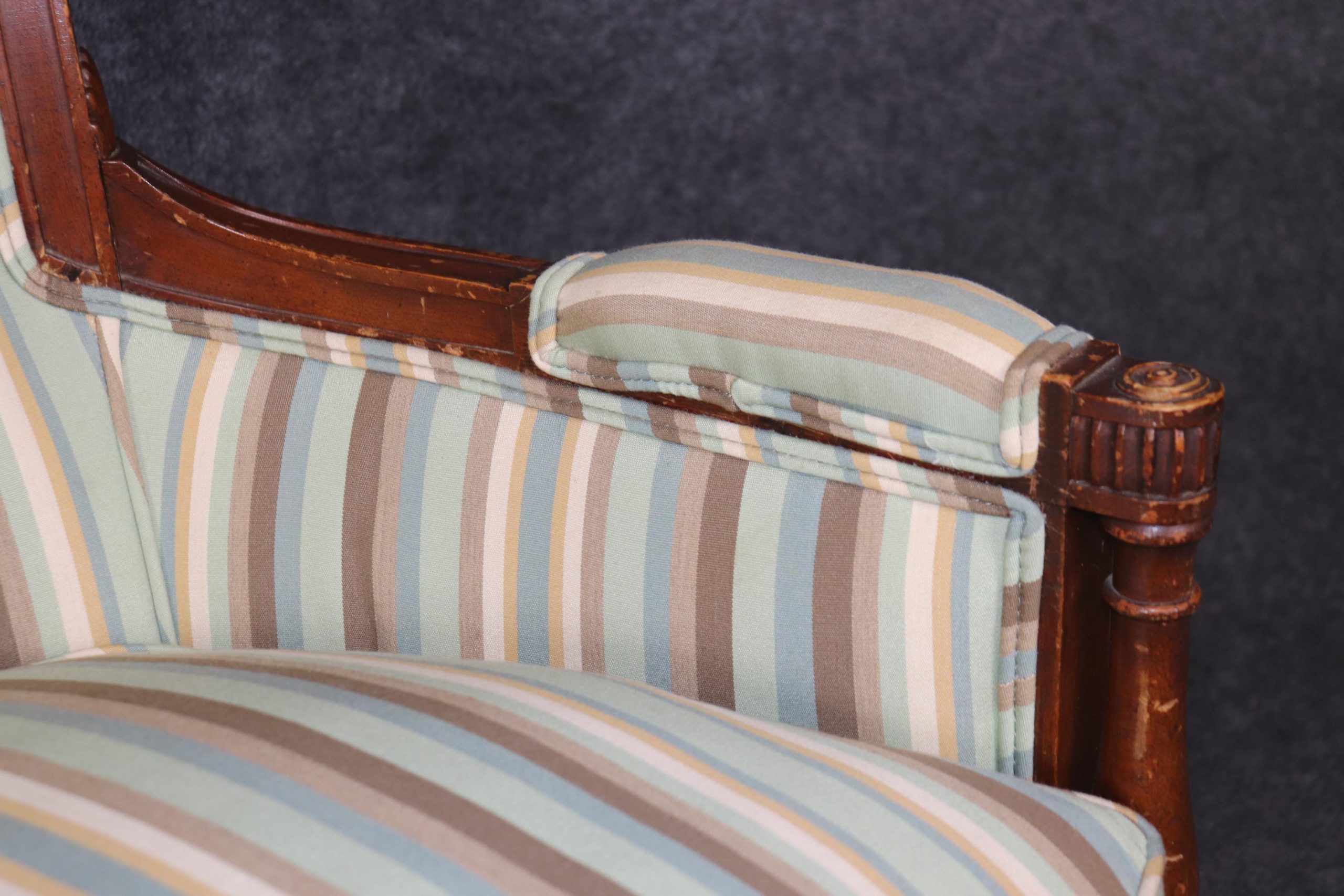 Pair Louis XVI Style Bergere Chairs: Distressed Wood, Striped Upholstery