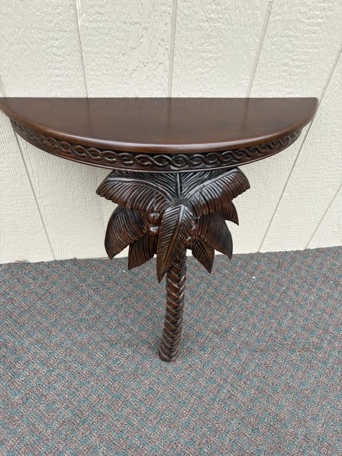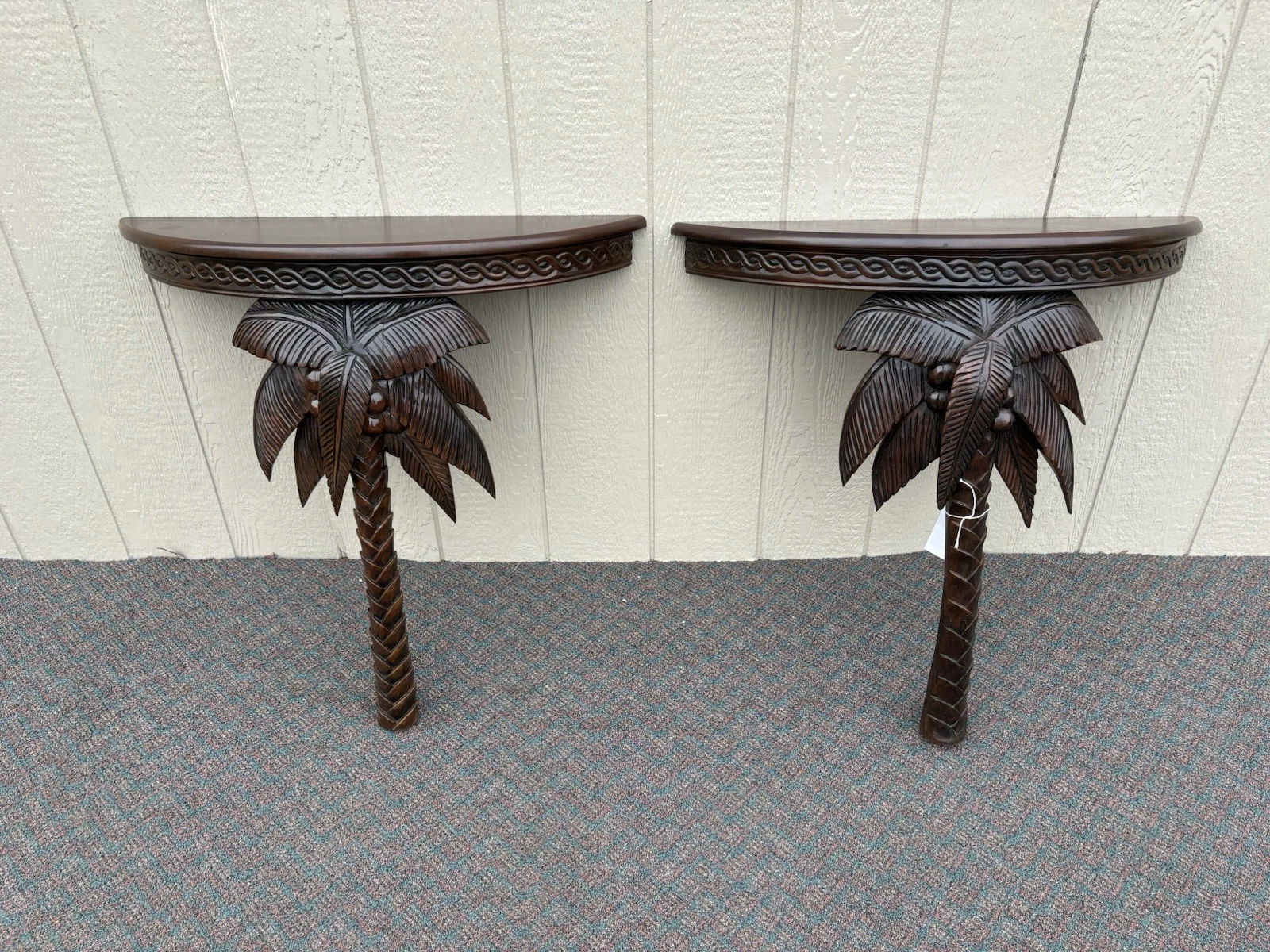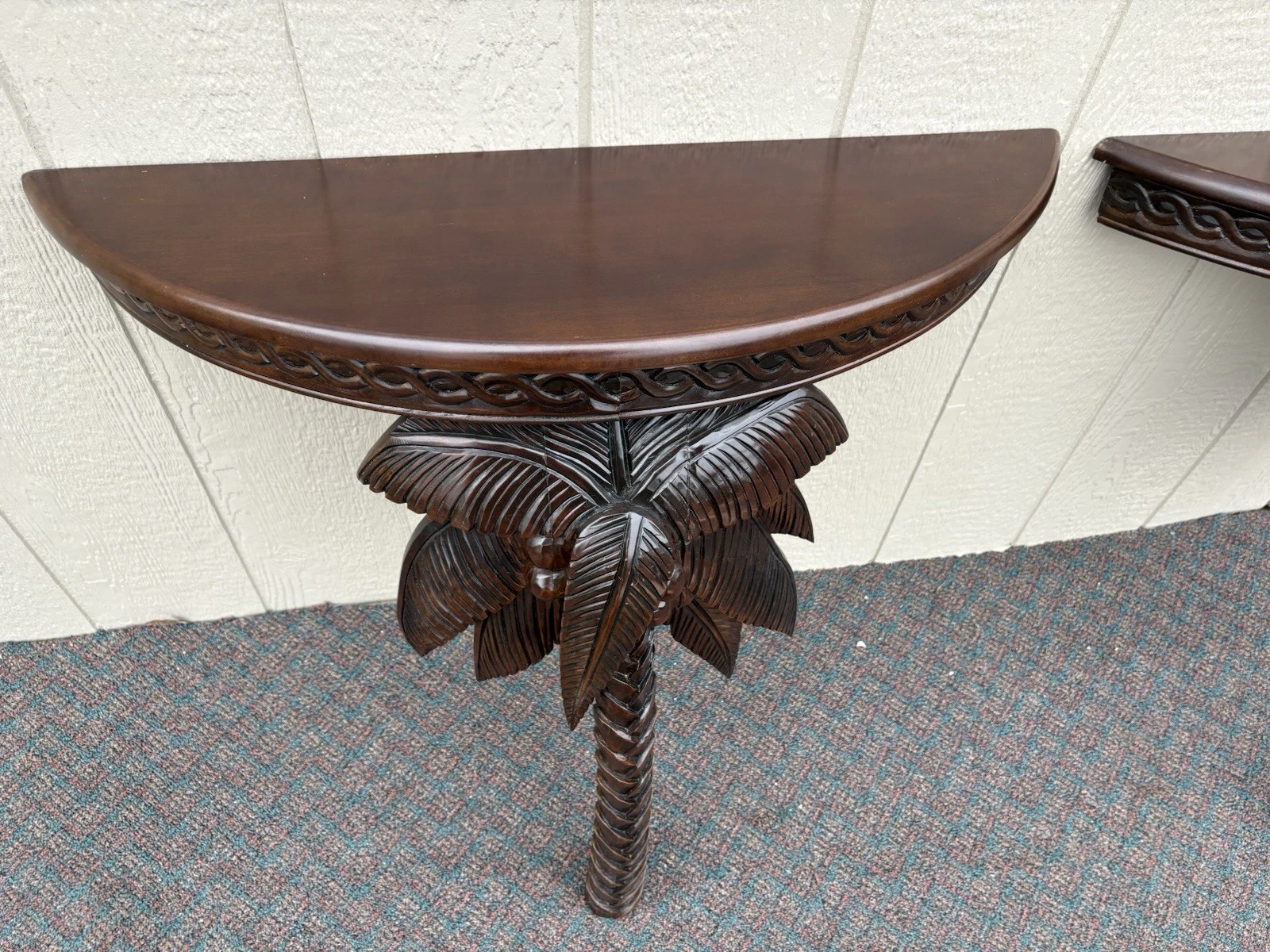 This charming pair of mahogany palm tree wall tables brings a touch of tropical elegance to any space. Each half-round table is expertly crafted from solid mahogany, showcasing the rich, warm tones and subtle grain patterns unique to the wood. Their sturdy construction and tasteful design make them not only functional but also a delightful accent that adds character to your home. Perfect for displaying cherished treasures or fresh blooms, these tables embody a blend of classic craftsmanship and timeless appeal.