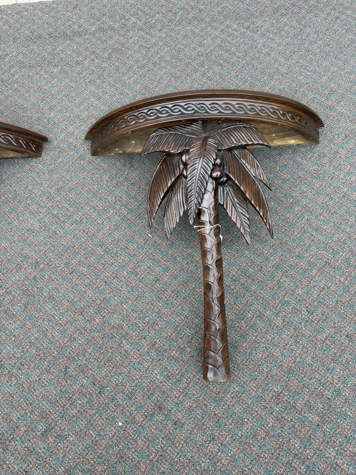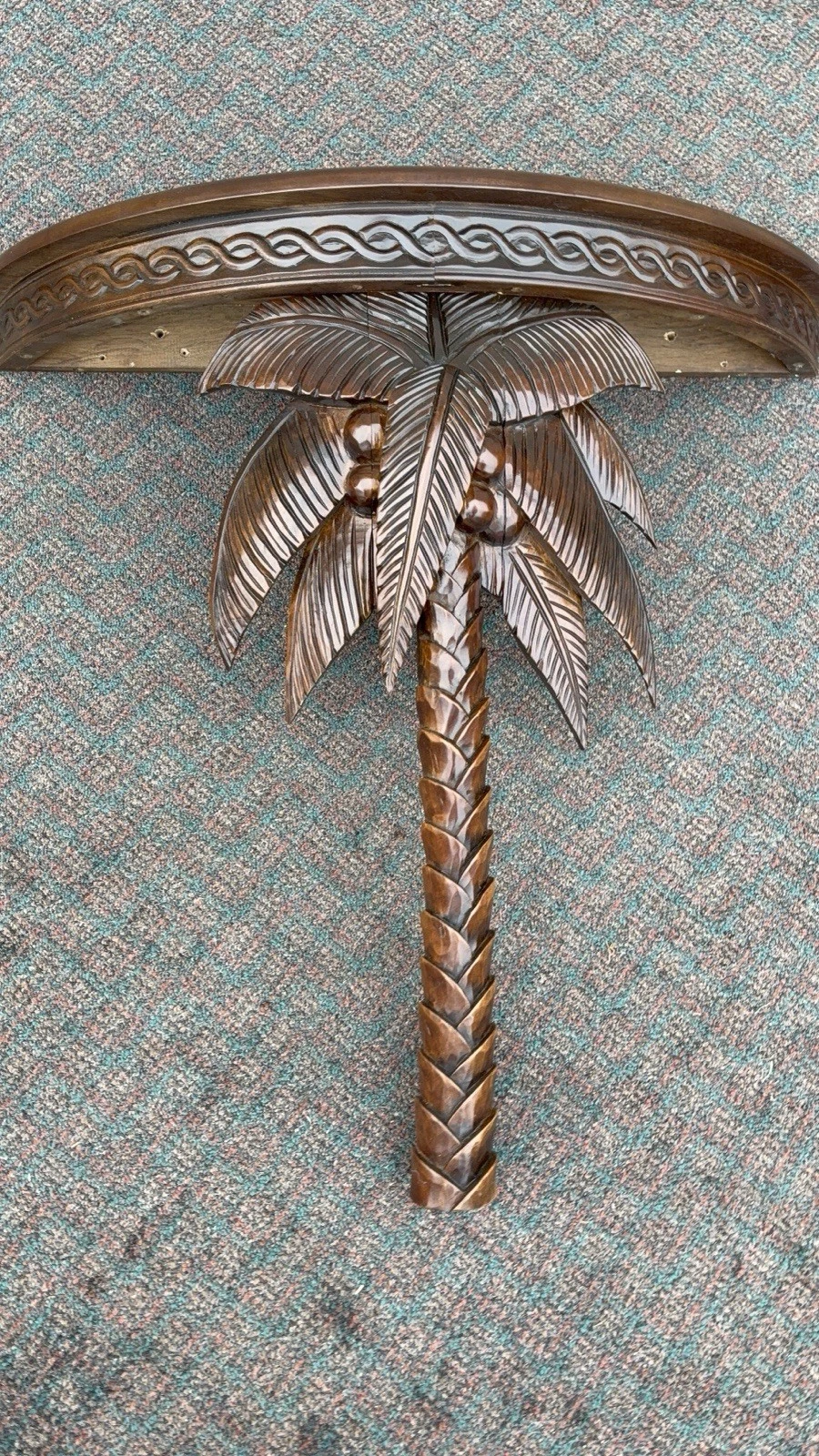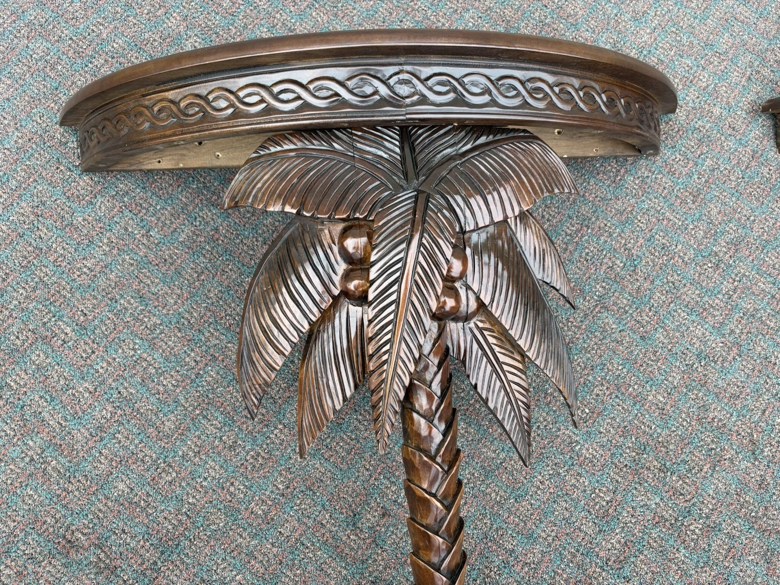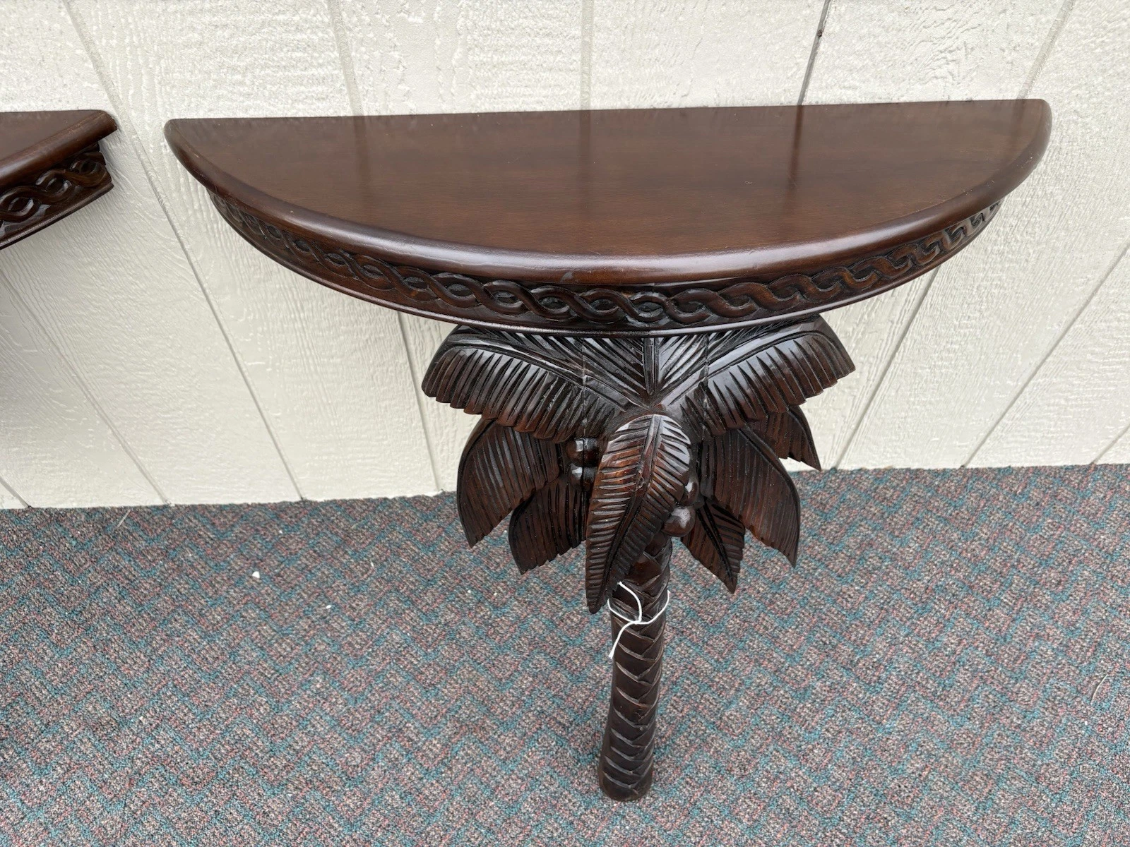 This charming pair of mahogany palm tree wall tables brings a touch of tropical elegance to any space. Each half-round table is expertly crafted from solid mahogany, showcasing the rich, warm tones and subtle grain patterns unique to the wood. Their sturdy construction and tasteful design make them not only functional but also a delightful accent that adds character to your home. Perfect for displaying cherished treasures or fresh blooms, these tables embody a blend of classic craftsmanship and timeless appeal.