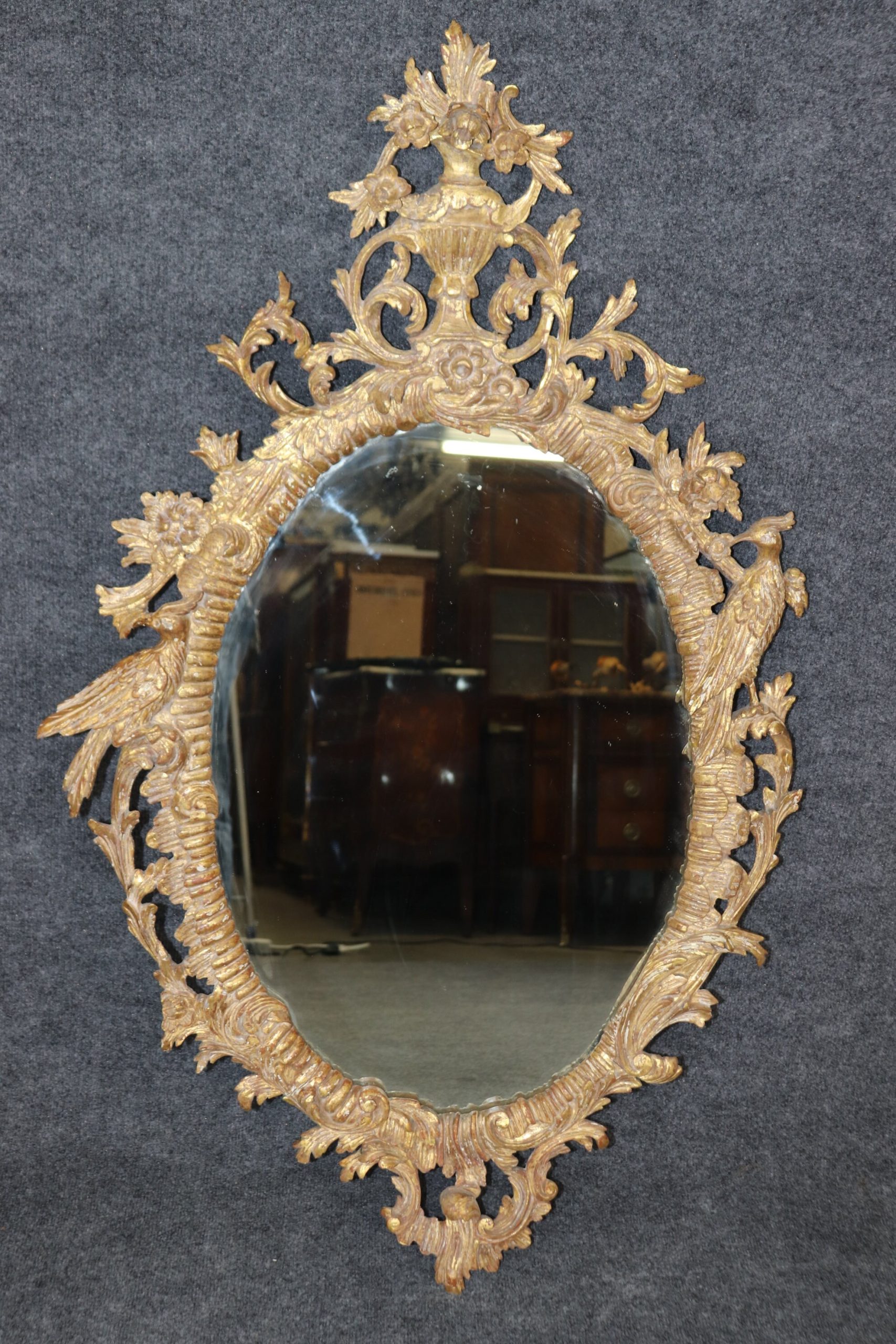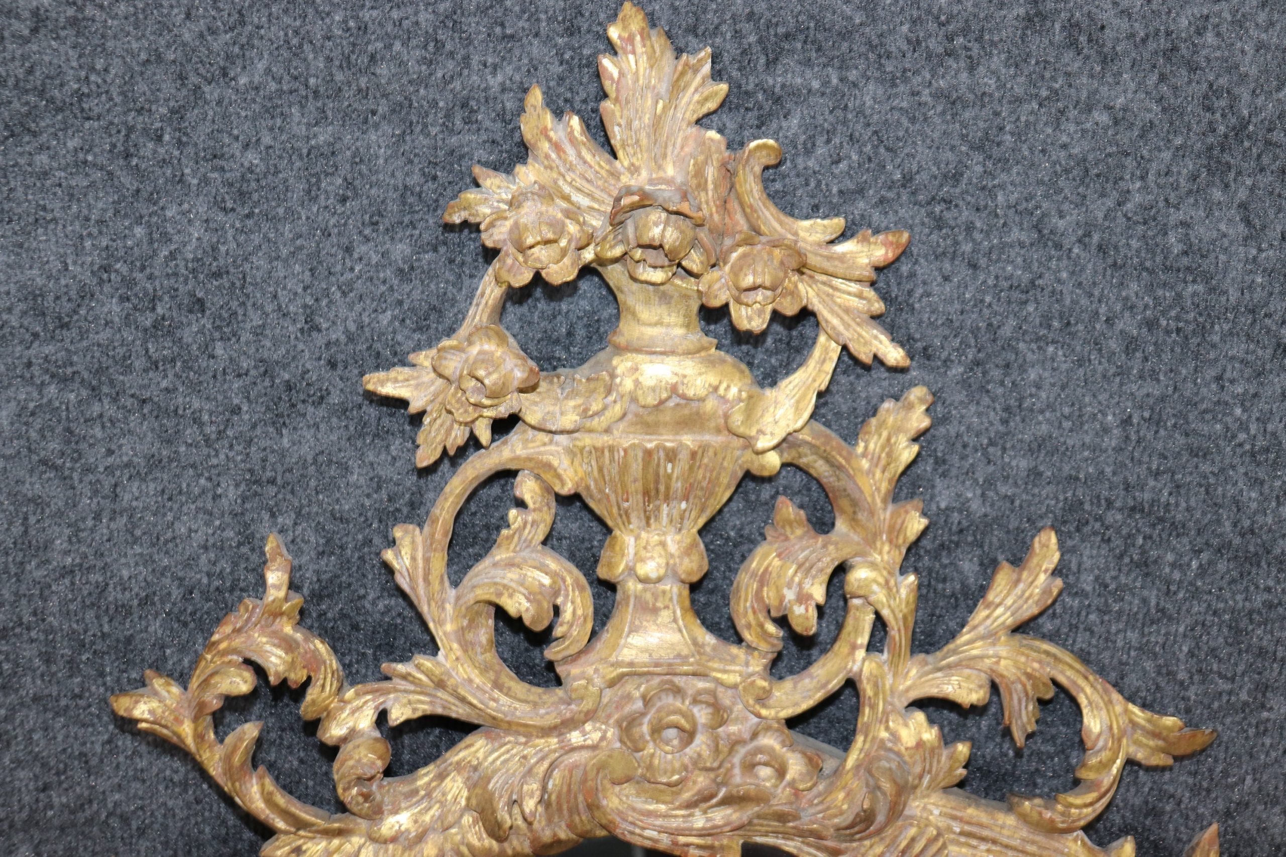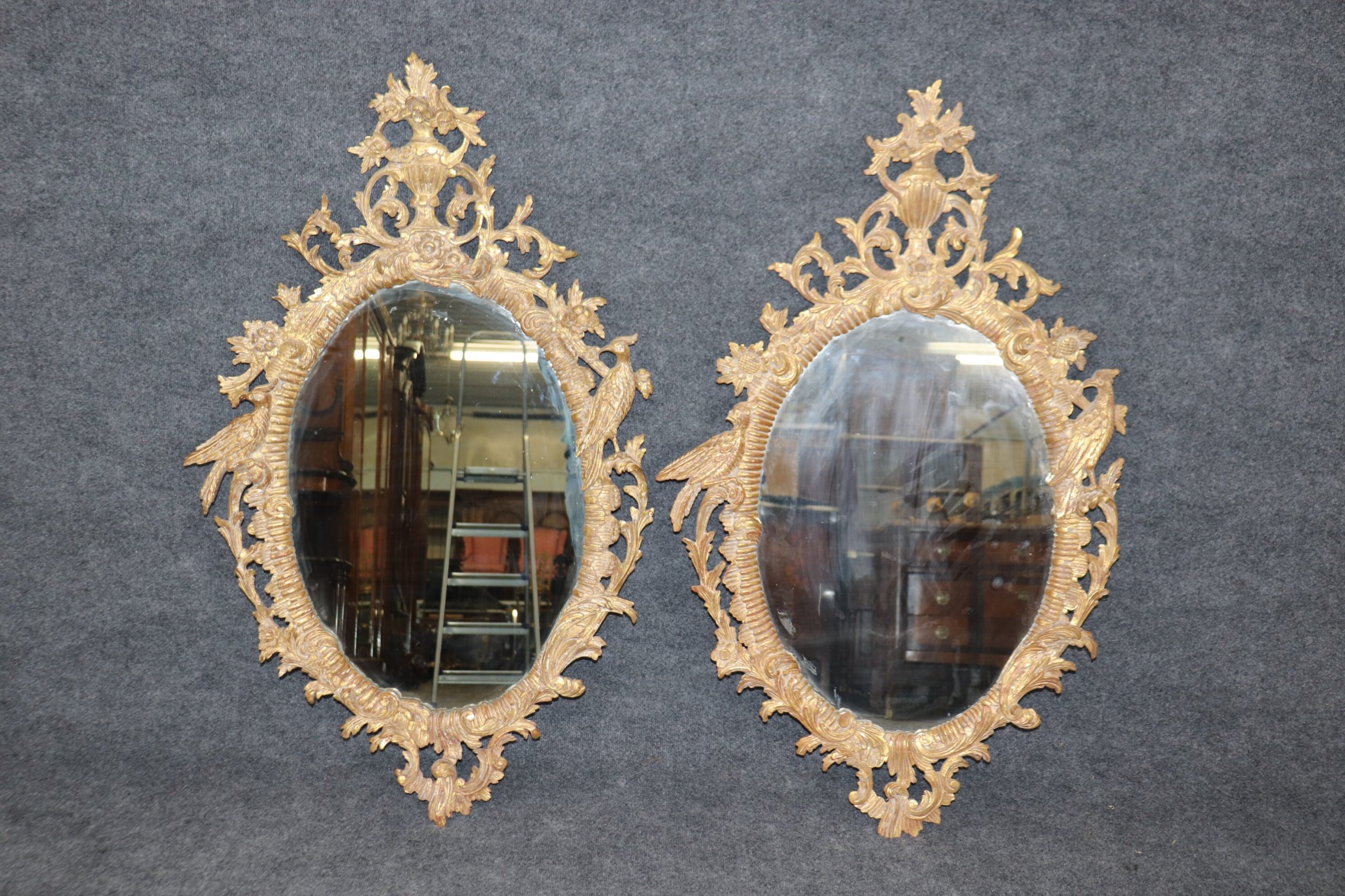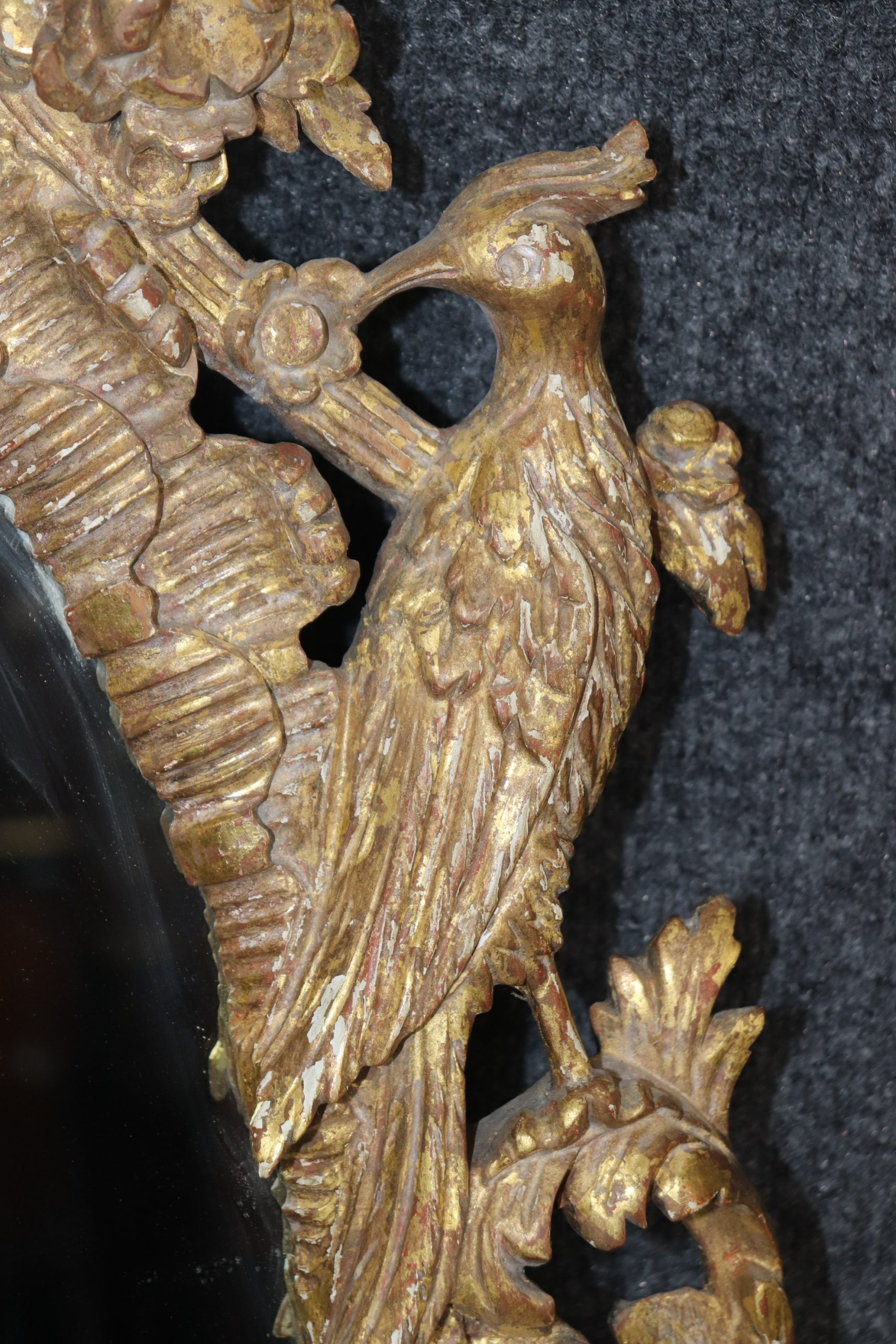 This pair of antique 19th century Italian distressed gilt carved hanging wall mirrors is truly exceptional! If you take a look at the photos provided, you’ll see the exceptional attention to detail within the carved birds and flowers in the gilt frames. This pair of mirrors is perfect to be used as bathroom mirrors, bedroom mirrors, entryway mirrors, or kitchen mirrors and can be paired with a variety of other styles due to their simplistic yet luxurious design. These mirrors are in good antique condition with the exception of some light surface scratches and scuffs but otherwise good condition considering age.