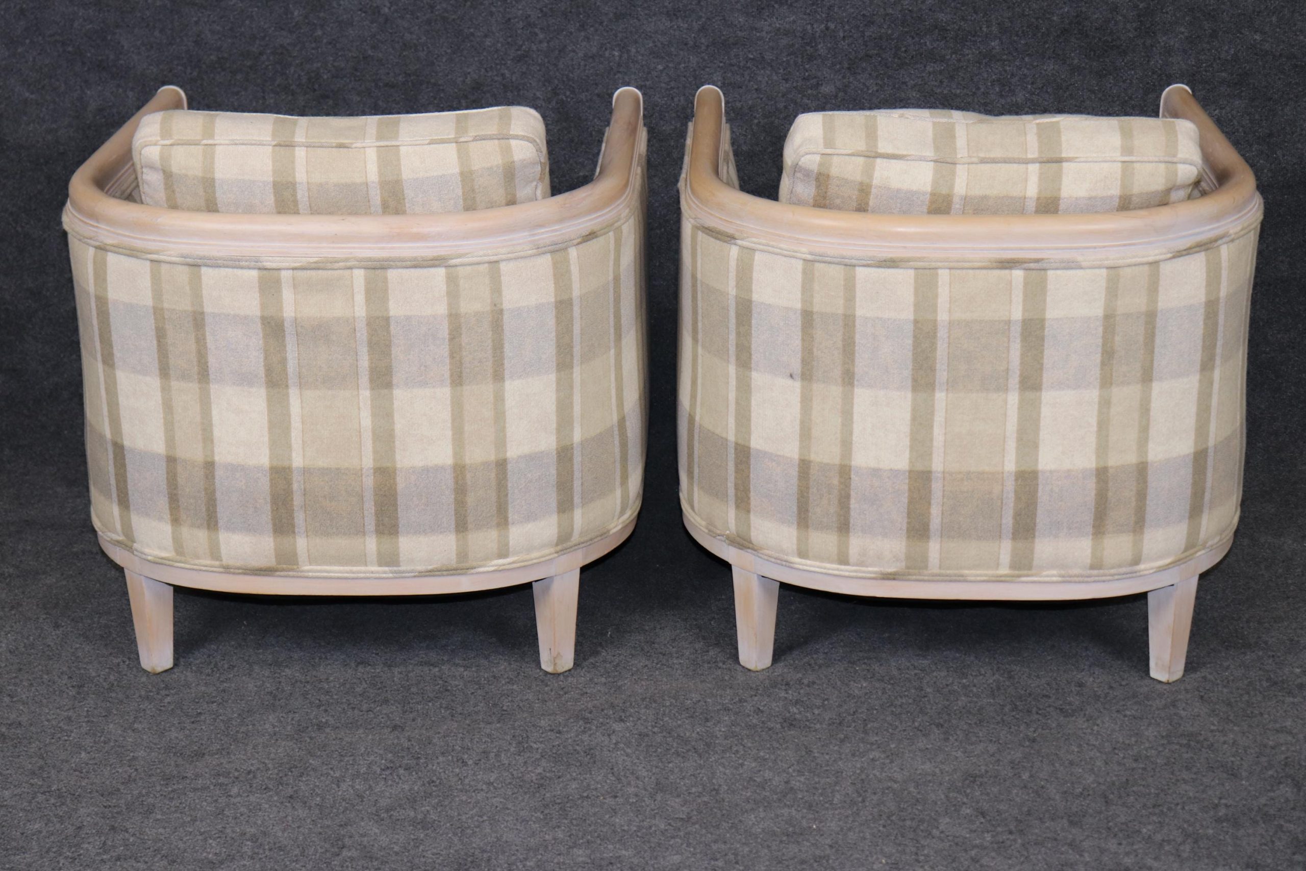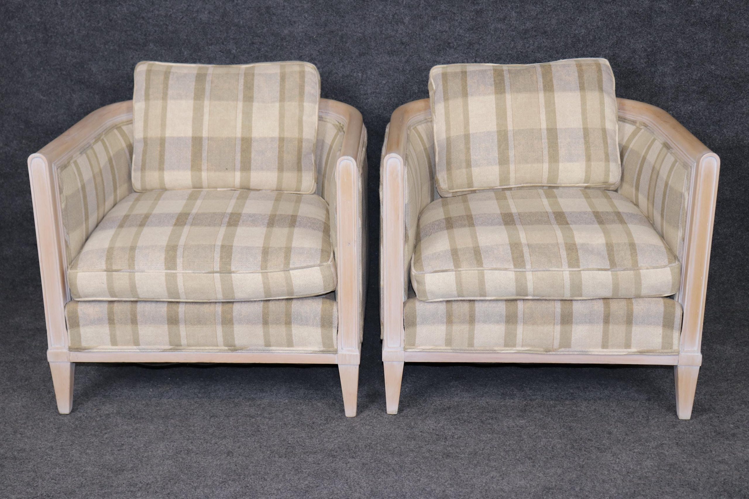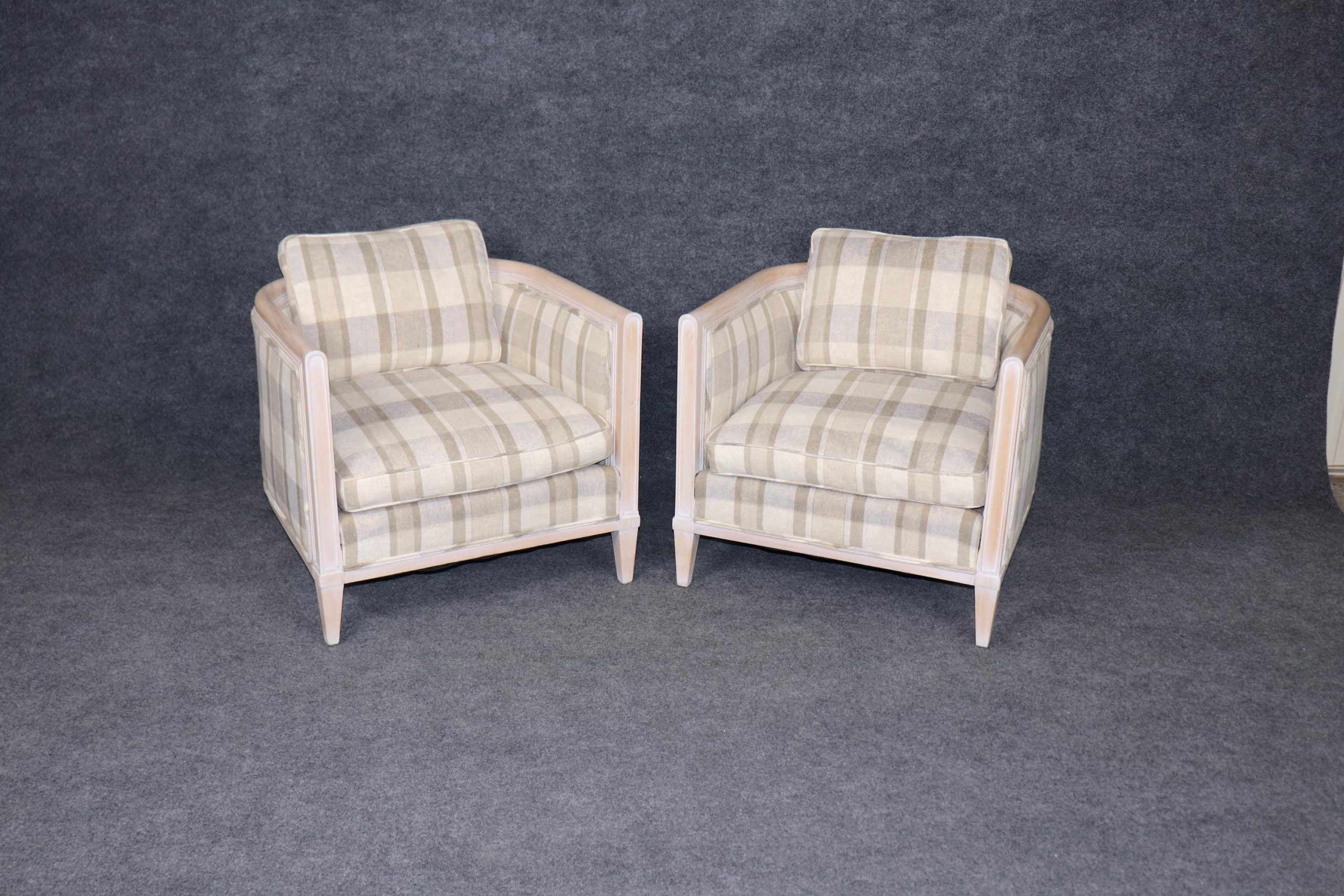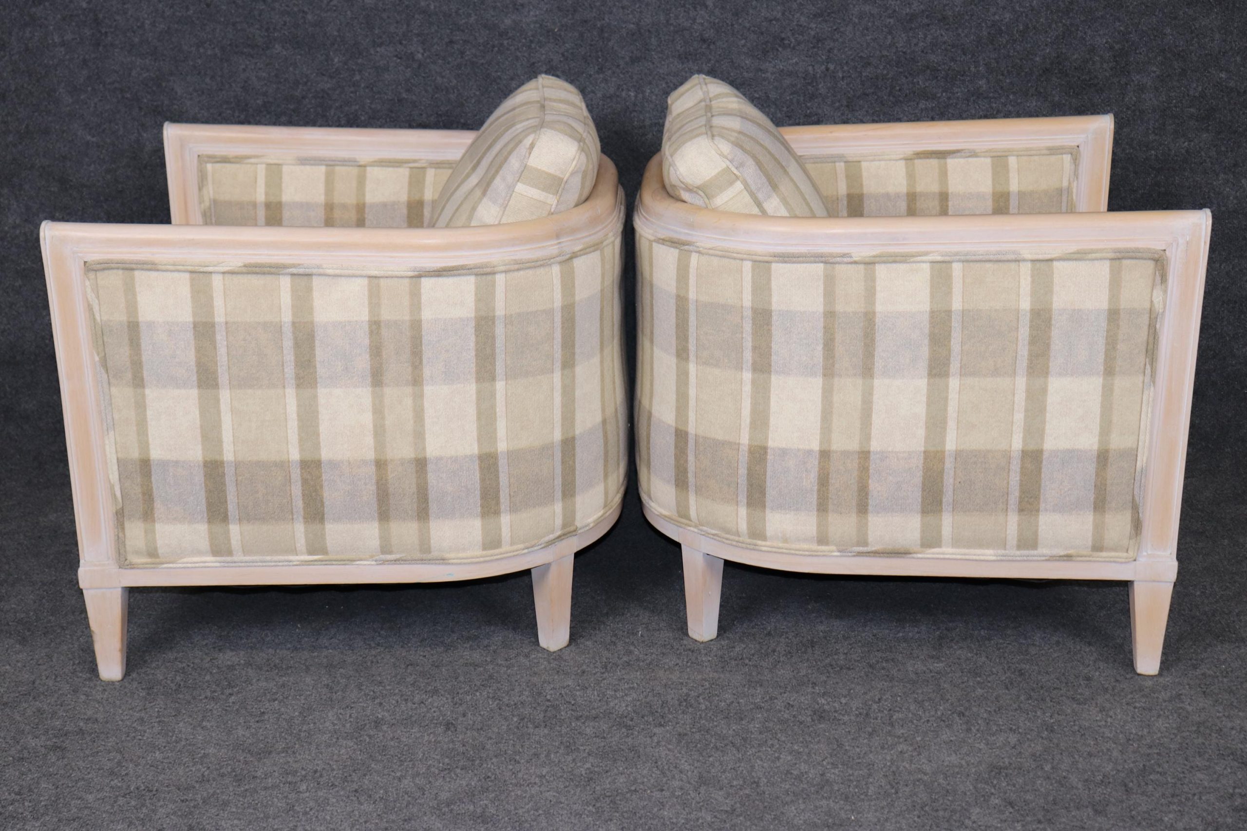 Pair of Directoire Style White Washed and Plaid Upholstered Club Chairs, Accent Chairs