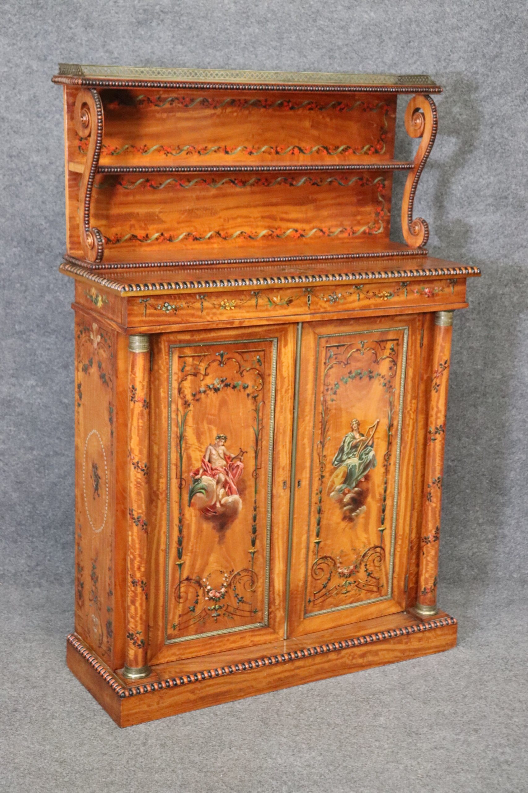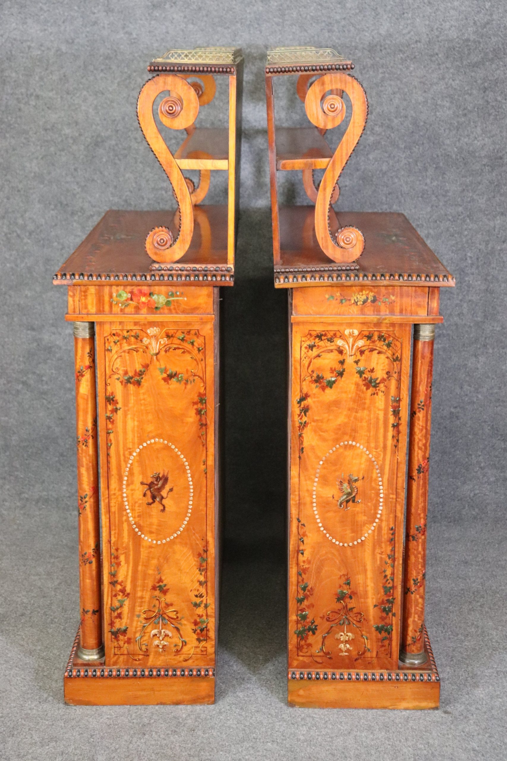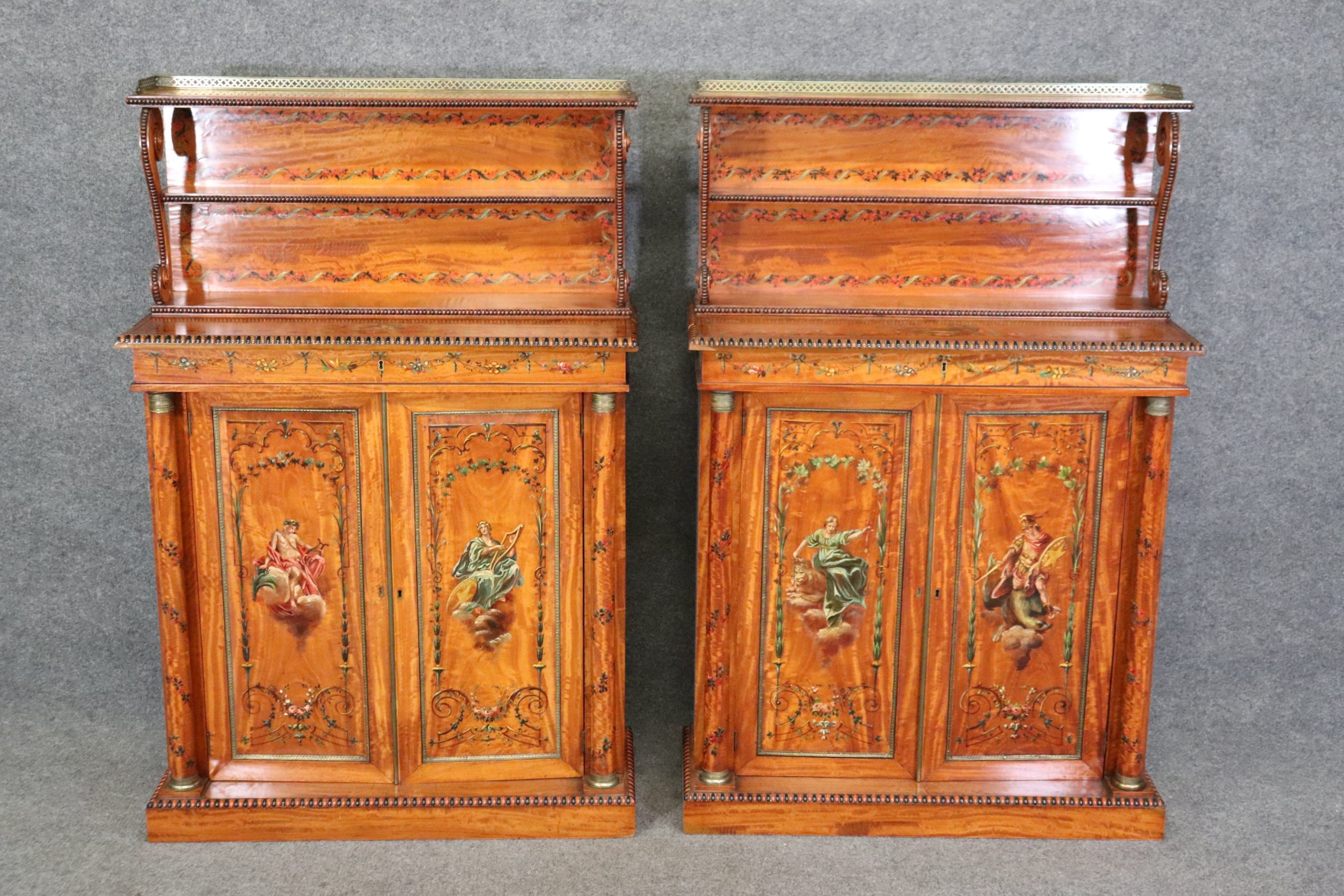 This exceptional pair of 19th century Adams paint decorated cabinets are of the highest quality! If you look closely at the photos provided, you will see the extensive detail in the paint decoration throughout both pieces! These pieces are truly a show stopper and will certainly be a conversation starter at your next gathering! These are perfect for any bedroom, living room, foyer, entryway or office! They give off an overwhelming sense of luxury and glamour and can be paired with a variety of other styles you may already have in your home or place of choosing! The cabinets are in good vintage condition with minor surface scratches and finish loss to the legs, but no significant imperfections. As to be expected with antiques of this age. This pair is a once in a lifetime opportunity to own a pair of museum quality Adams style cabinets!