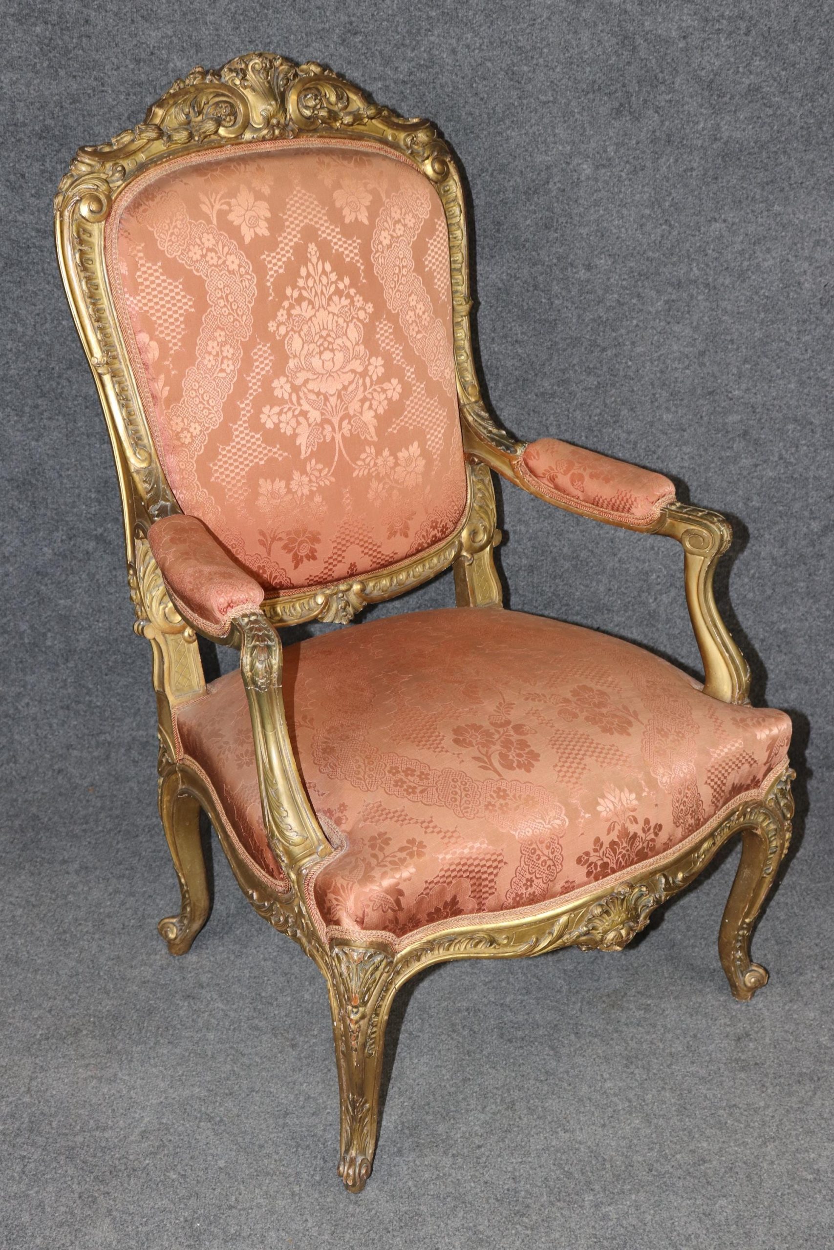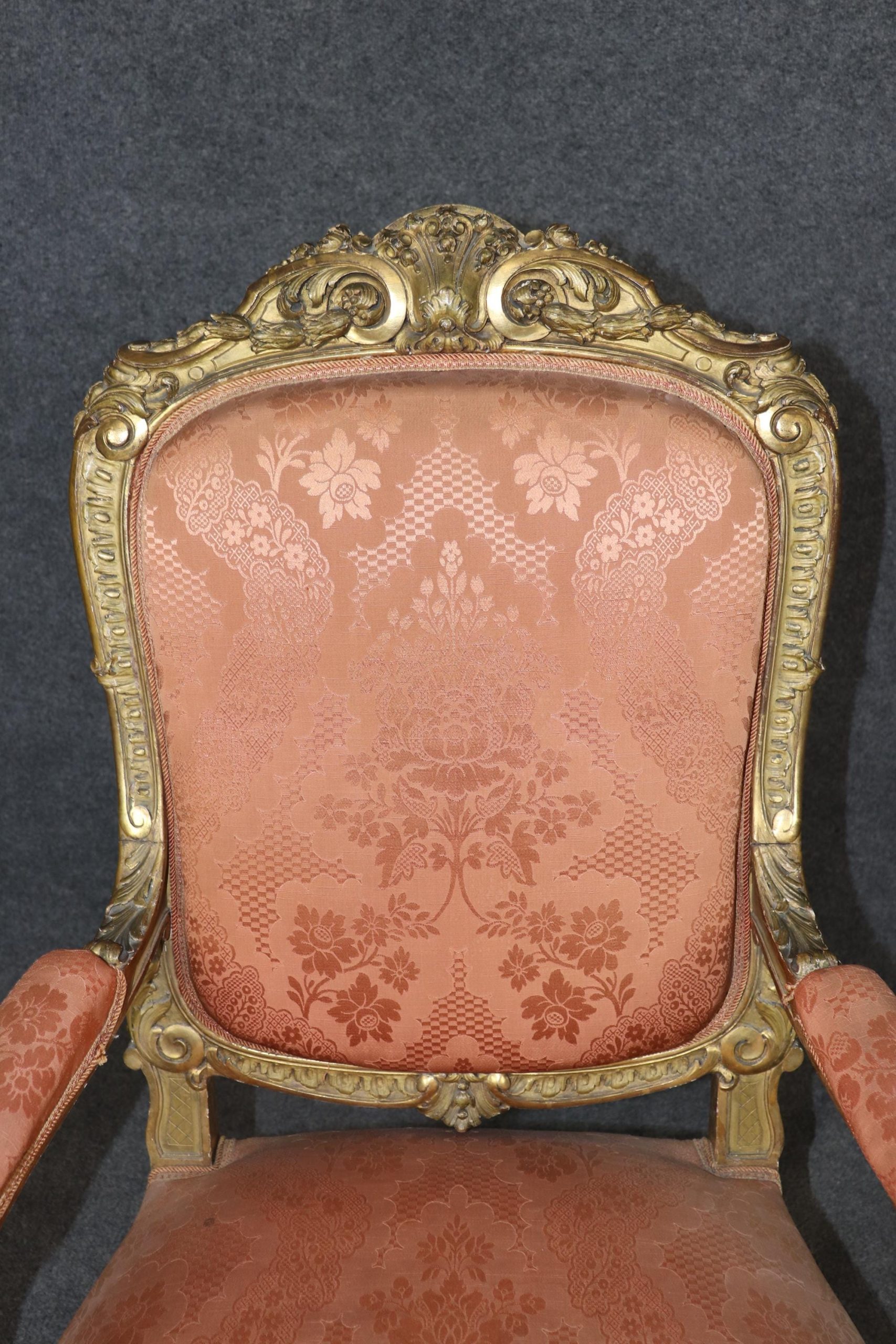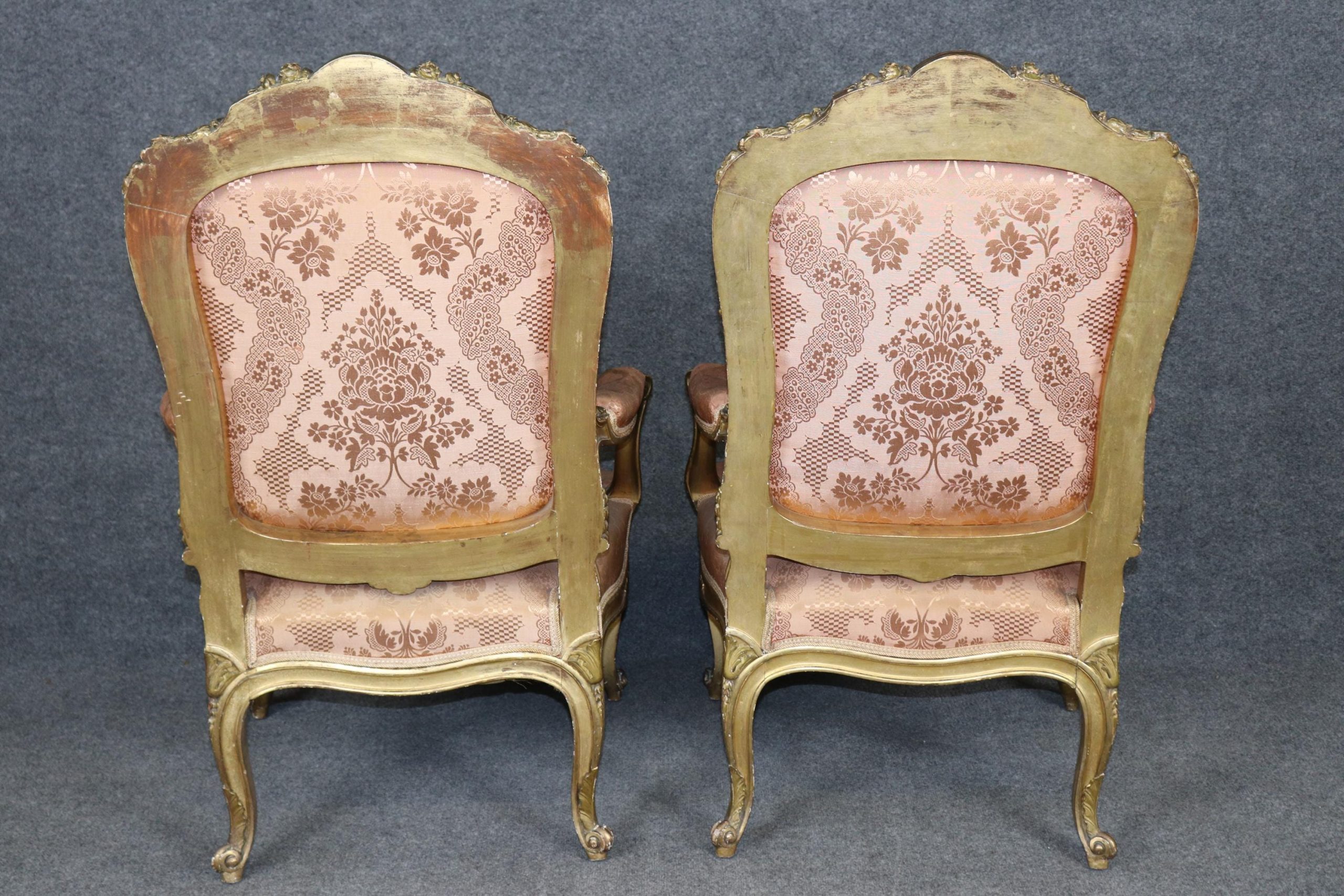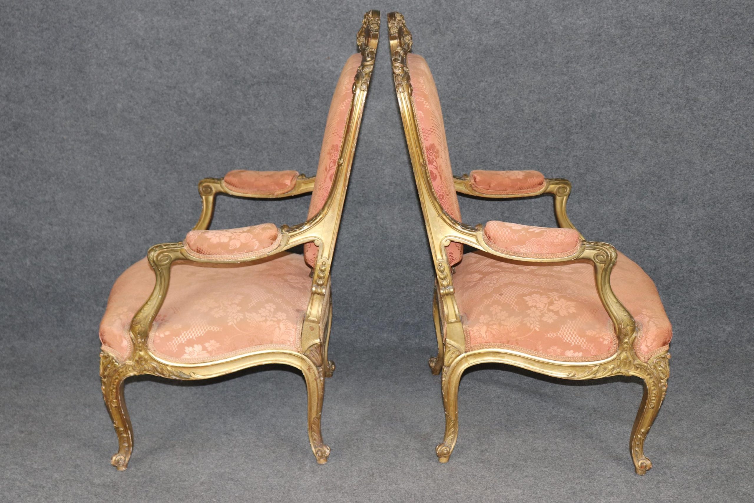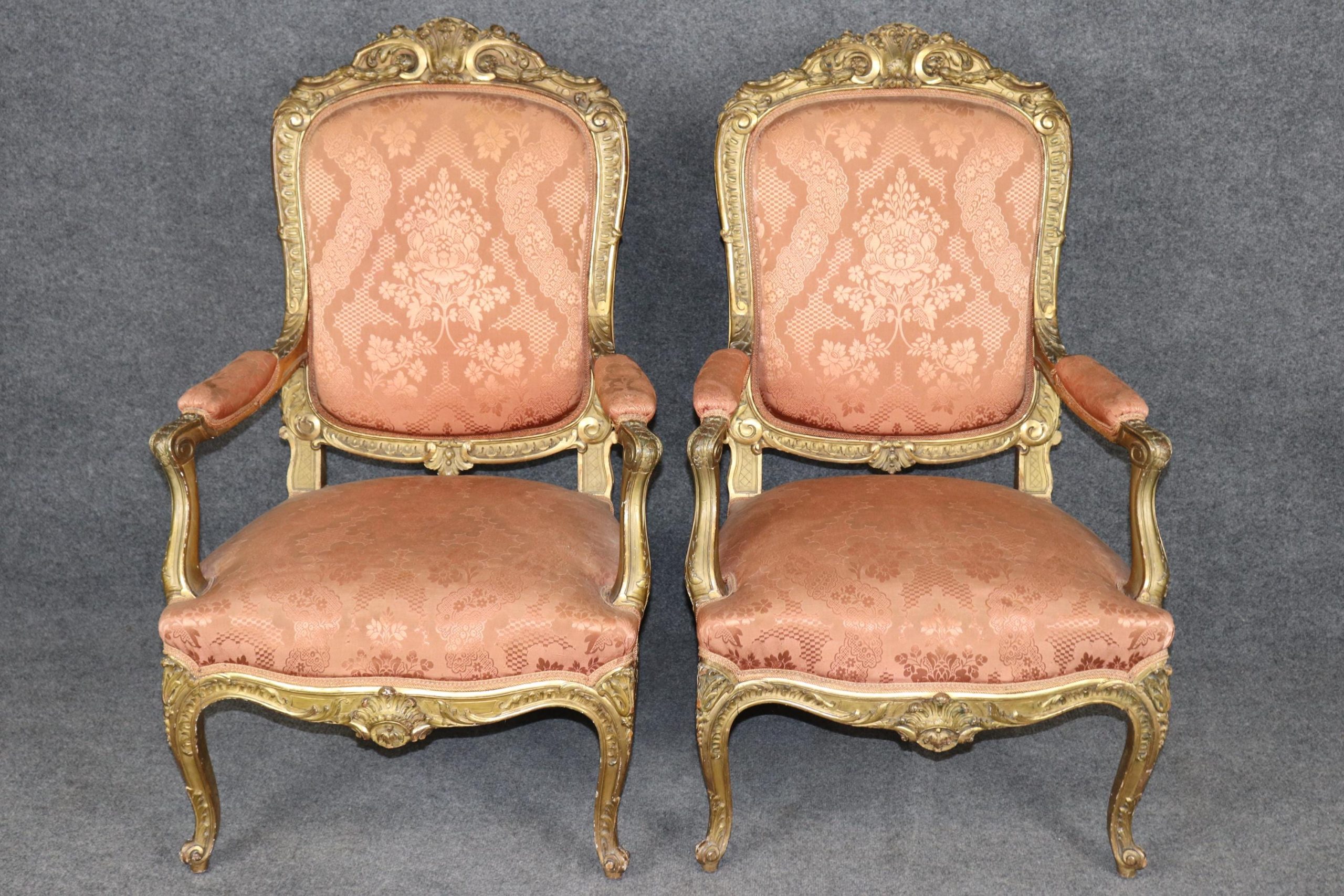 Pieces of this caliber are increasingly rare and highly sought after by collectors and designers alike. These gilt Louis XV style armchairs would make a luxurious addition to any refined interior, whether traditional or eclectic. The pair is in good antique condition with the exception of some light surface scratches, Minor finish/gilt loss and normal age related wear. As to be expected with items of age and use. the upholstery has some minor wear but nothing major.