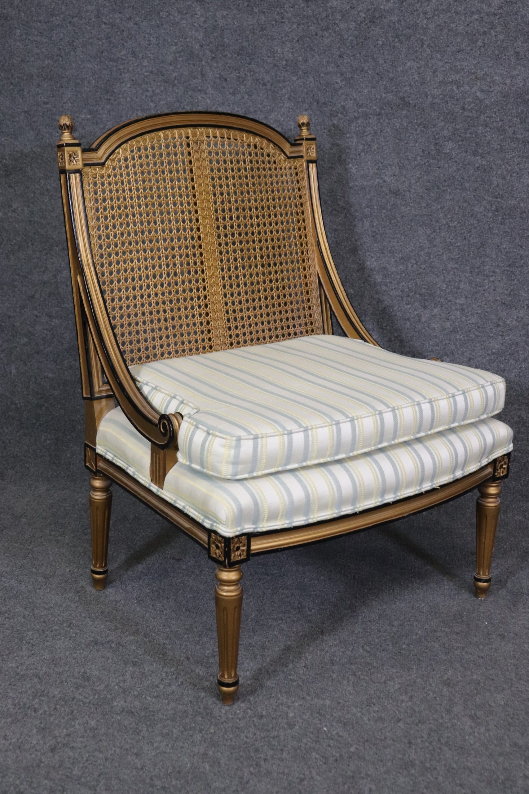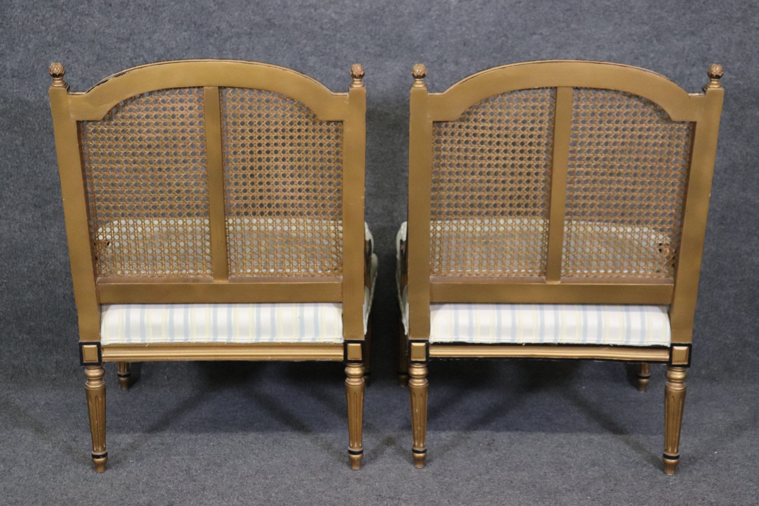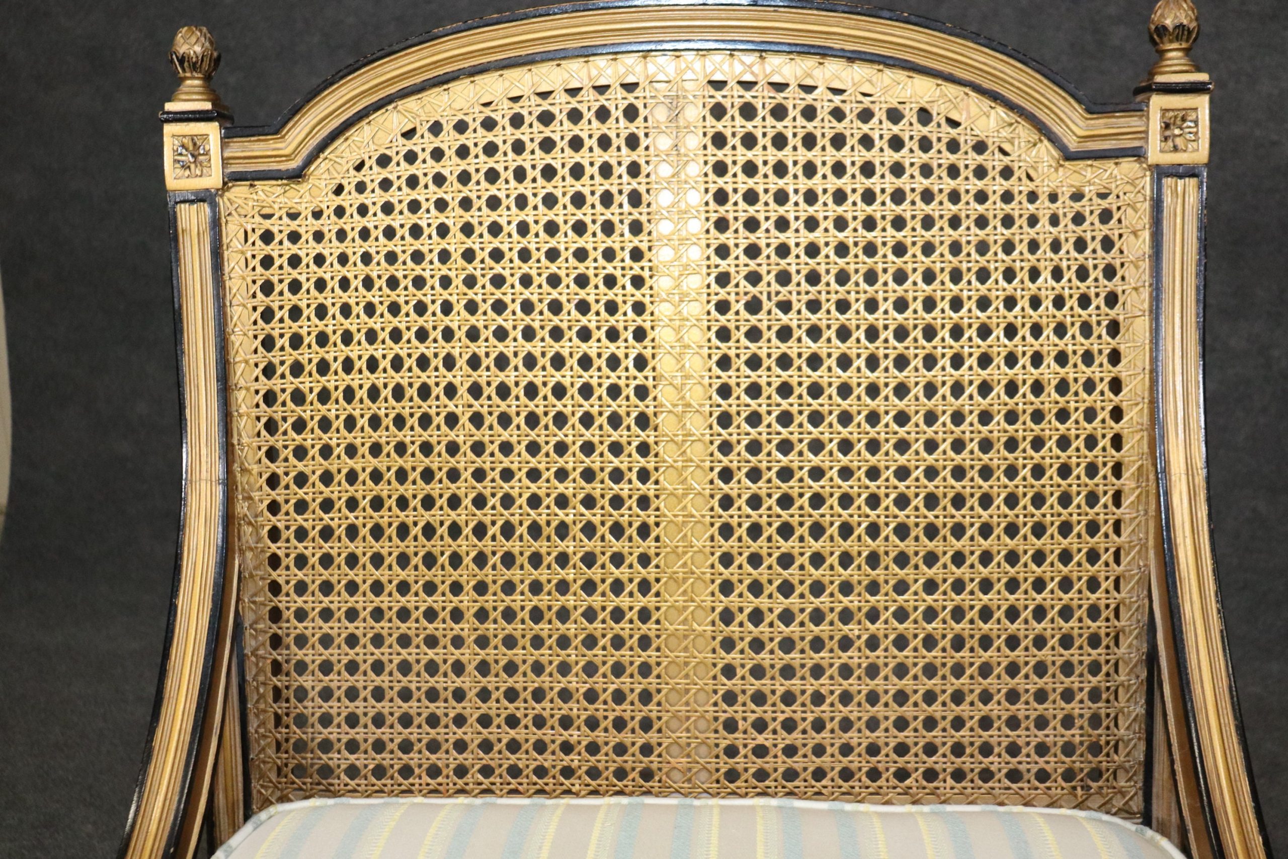 This Pair of French Louis XVI Style Cane Back Bergeres, Lounge Chairs are perfect for you and your home and are a lovely example of high quality furniture from the late 20th century! If you look at the photos provided you will see the attention to detail within the carved frames as well as the fine cane backs which do not have any holes or breaks. The pair is accompanied by luxurious striped upholstery as well as two cushions for your back that can be removed if you desire. This pair is perfect for any entryway, living room, bedroom or office and is bound to bring that little extra sense of character and class into your home. One nice thing about this pair is their ability to be paired with a variety of other styles including, Art Deco, Art Nouveau, Louis XV, Louis XVI, Mid Century Modern and Contemporary! The chairs are in good antique/vintage condition with light surface scratches and minor finish loss to the frames but otherwise good condition. Upholstery appears to be in good shape as I do not see any rips or stains however this is used antique furniture so do not expect them to be perfect!