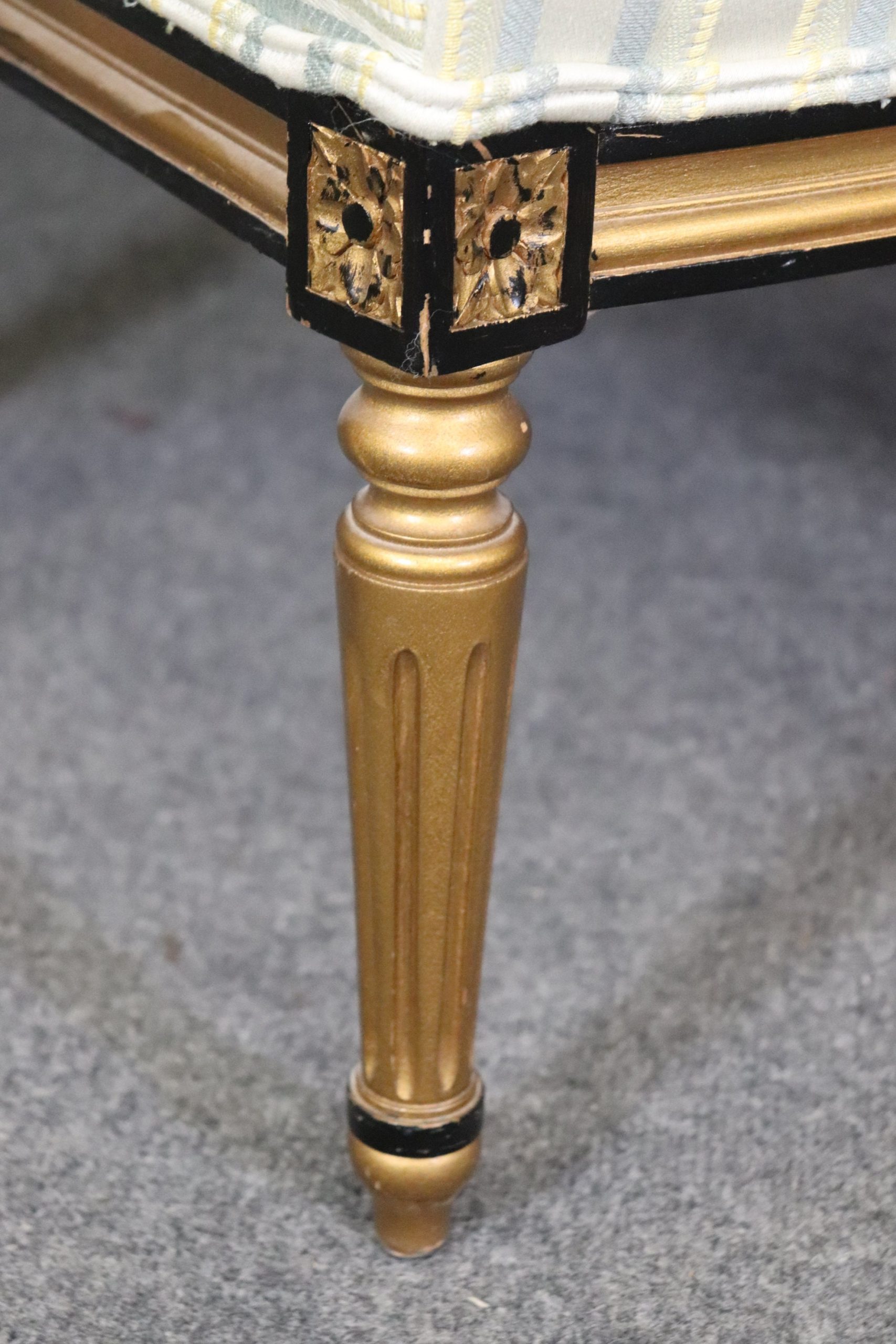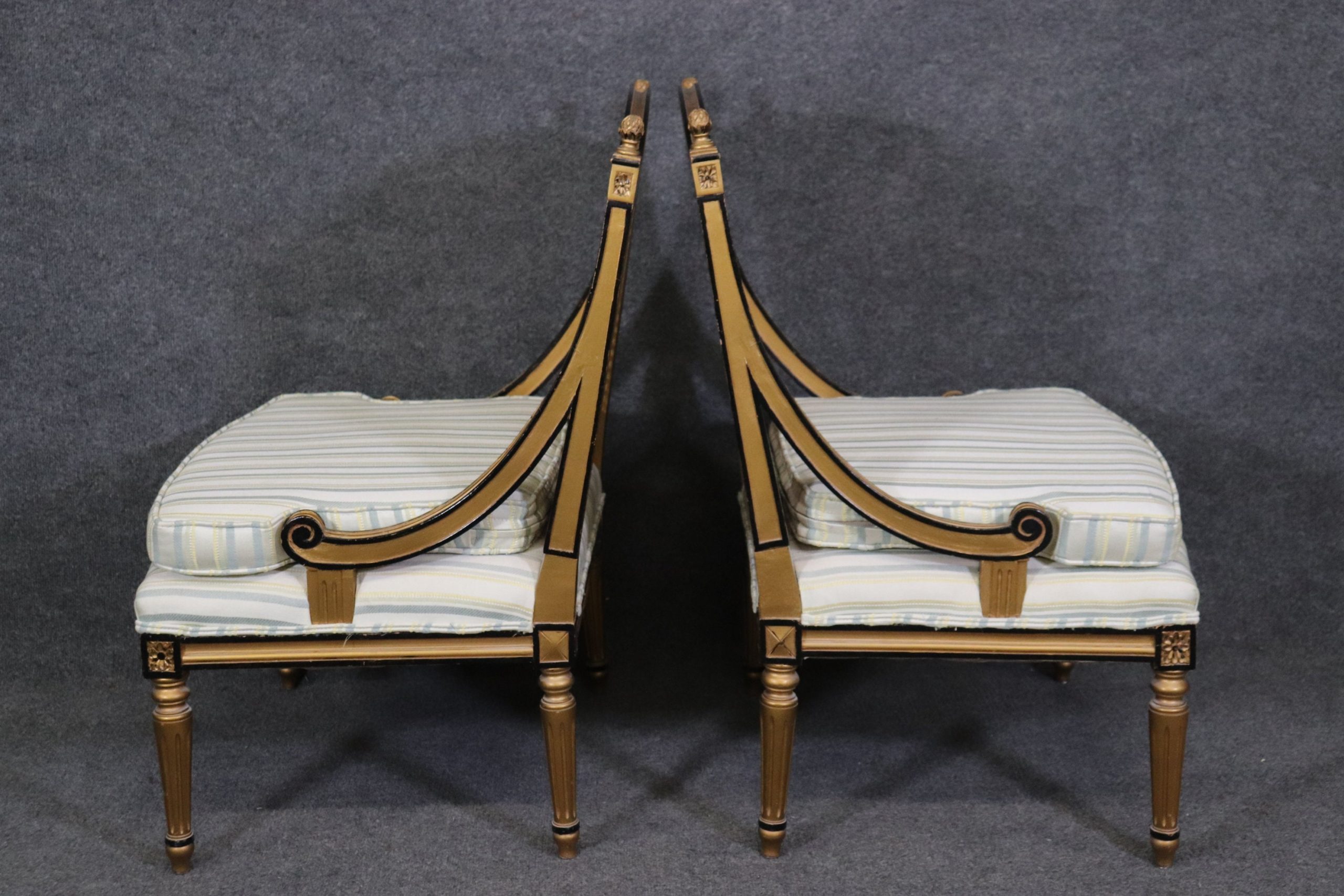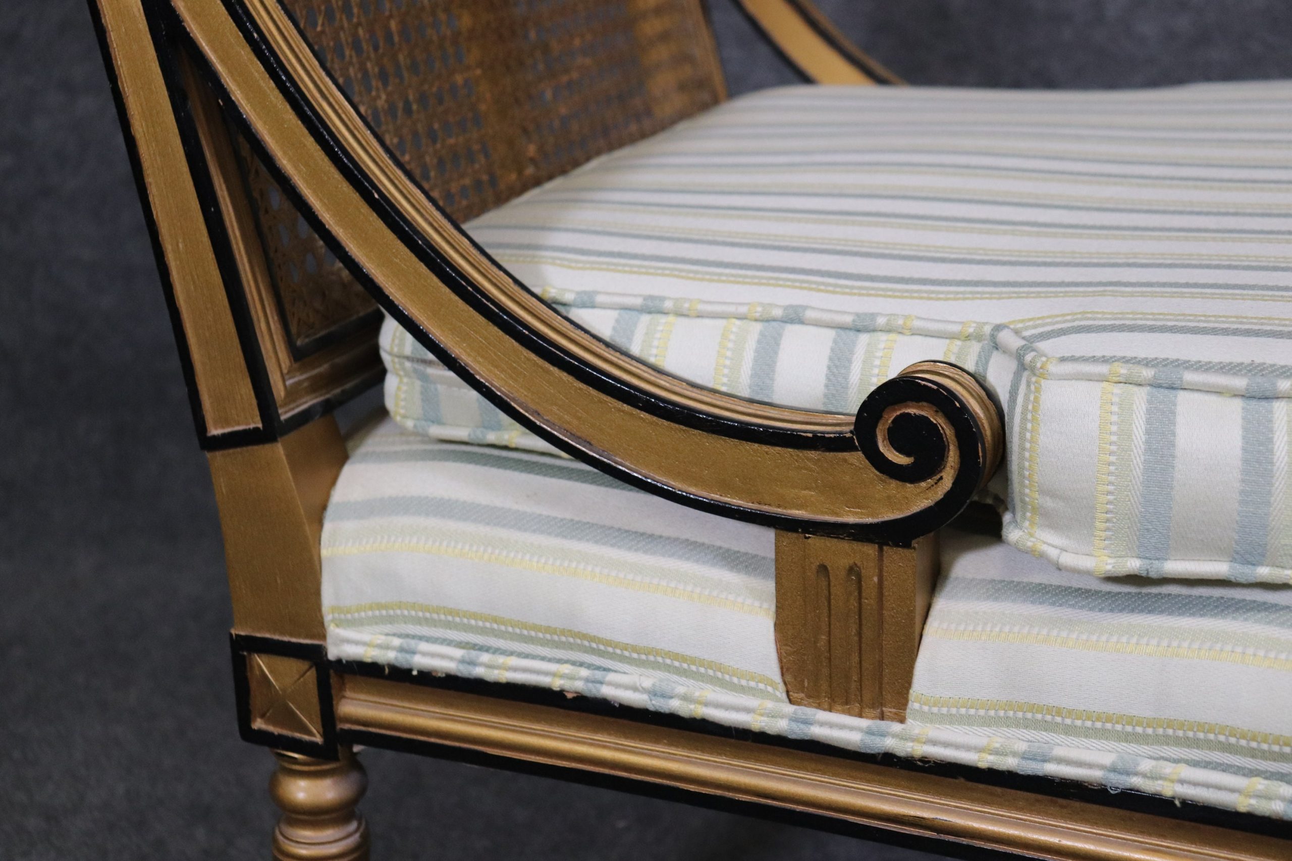 This Pair of French Louis XVI Style Cane Back Bergeres, Lounge Chairs are perfect for you and your home and are a lovely example of high quality furniture from the late 20th century! If you look at the photos provided you will see the attention to detail within the carved frames as well as the fine cane backs which do not have any holes or breaks. The pair is accompanied by luxurious striped upholstery as well as two cushions for your back that can be removed if you desire. This pair is perfect for any entryway, living room, bedroom or office and is bound to bring that little extra sense of character and class into your home. One nice thing about this pair is their ability to be paired with a variety of other styles including, Art Deco, Art Nouveau, Louis XV, Louis XVI, Mid Century Modern and Contemporary! The chairs are in good antique/vintage condition with light surface scratches and minor finish loss to the frames but otherwise good condition. Upholstery appears to be in good shape as I do not see any rips or stains however this is used antique furniture so do not expect them to be perfect!