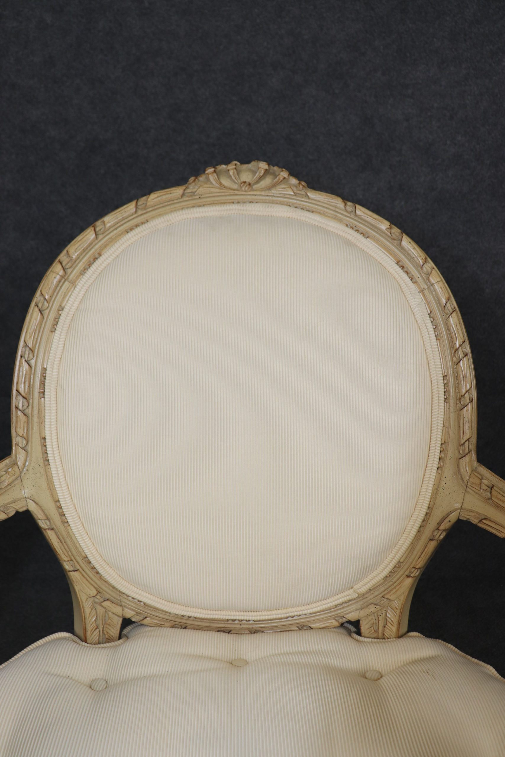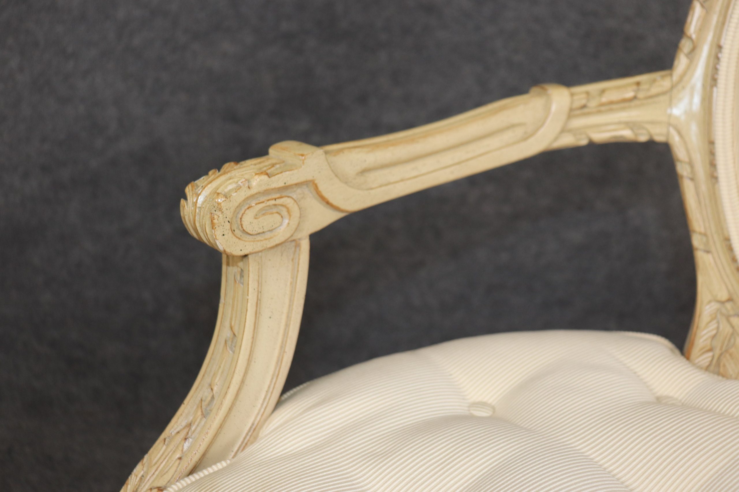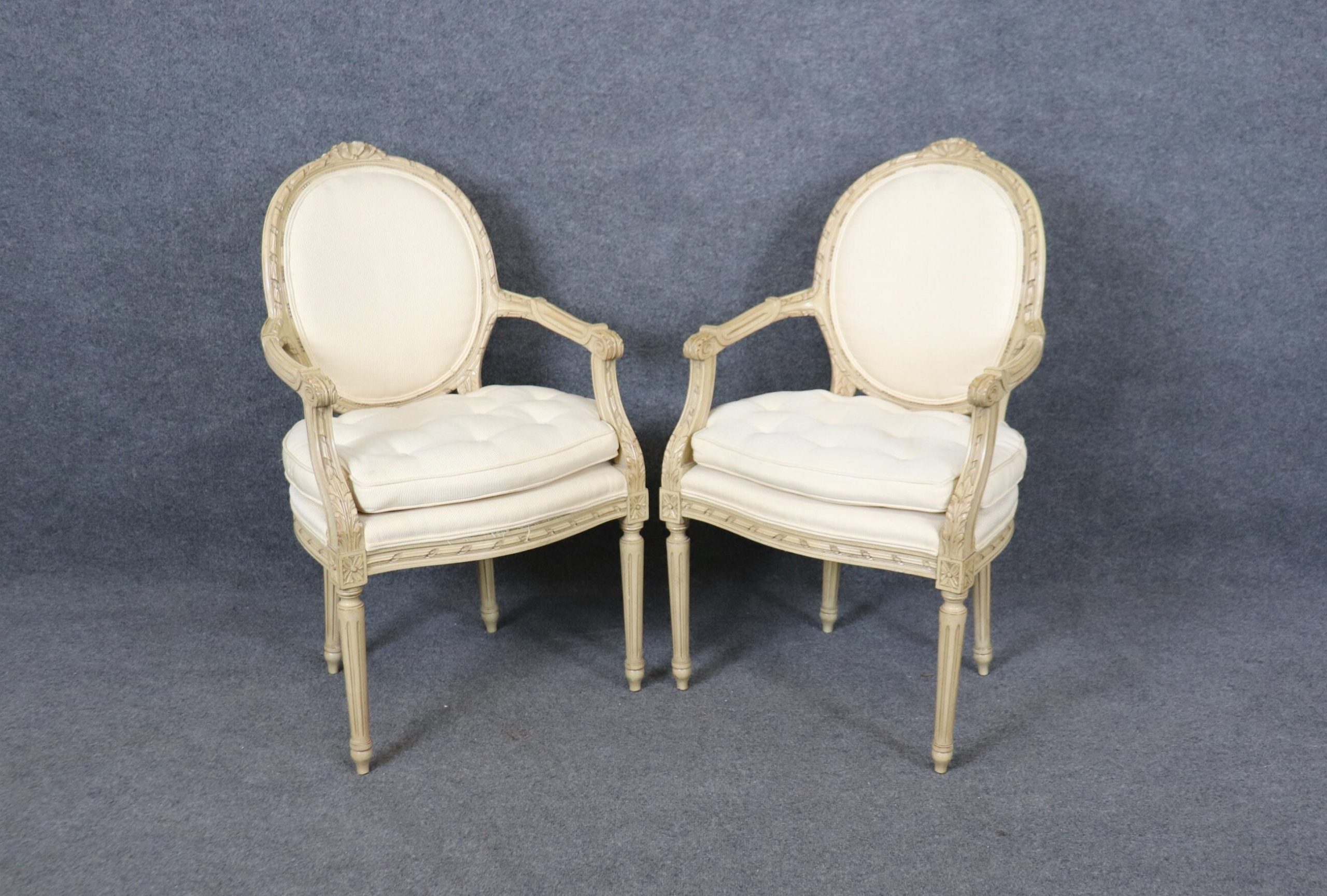 This vintage pair of Louis XVI style distressed paint decorated armchairs accent chairs is perfect for you and your home and is a lovely example of high quality furniture from the 20th century! If you look at the photos provided, you will see the luxurious tufted upholstery on the seats. This pair is perfect for any entryway, living room, bedroom or office and is bound to bring that little extra sense of character and class into your home! One nice thing about this pair is the ability to be paired with a variety of other styles including Art Deco, Art Nouveau, Louis XV, Louis XVI, Mid Century Modern and Contemporary! The chairs are in good vintage condition with light surface scratches and minor finish loss to the frames, but otherwise good condition. Upholstery is in good condition, with the exception of a stain on one chair. Reupholstery is recommended.