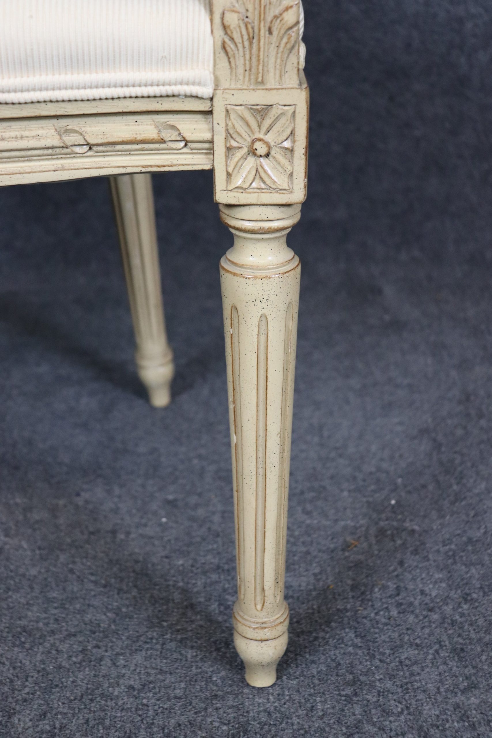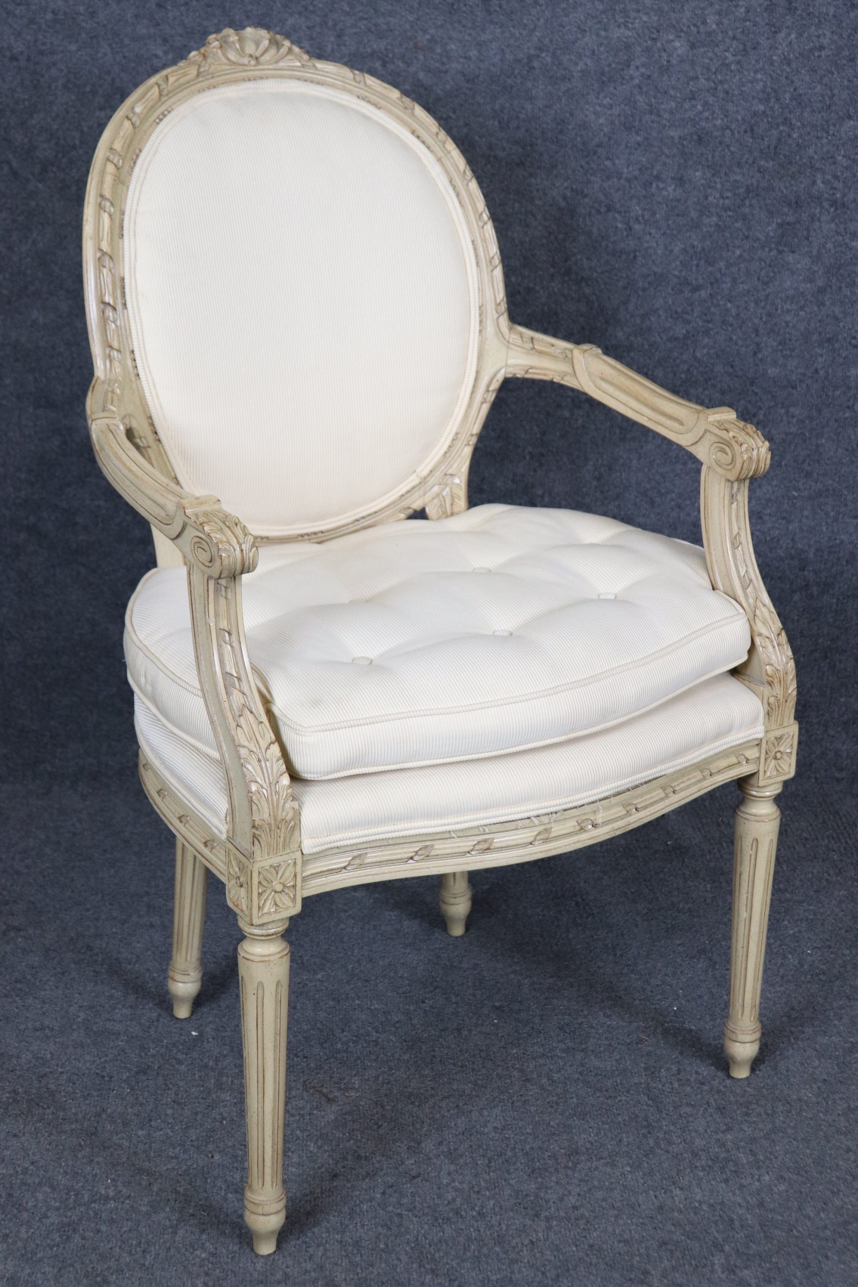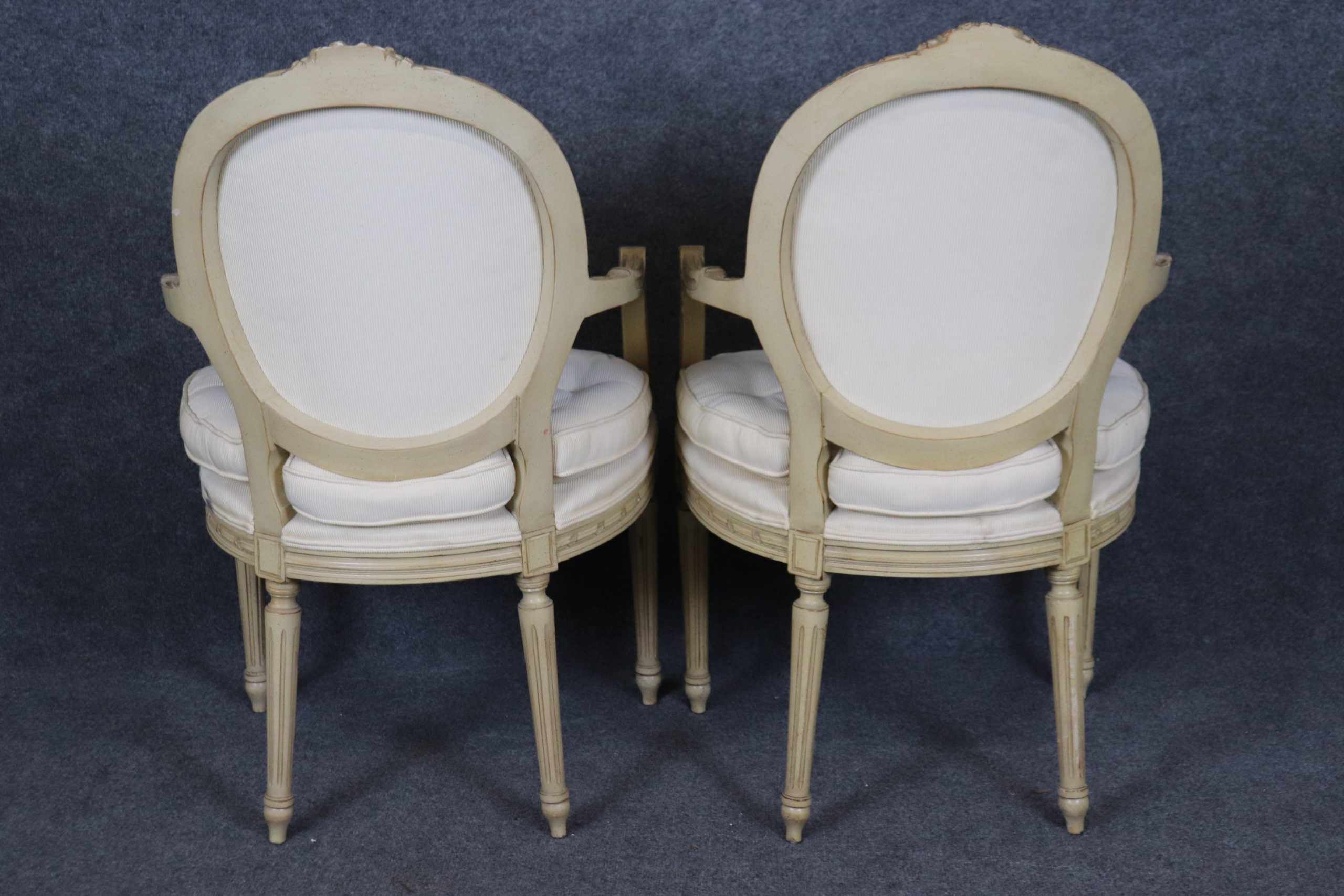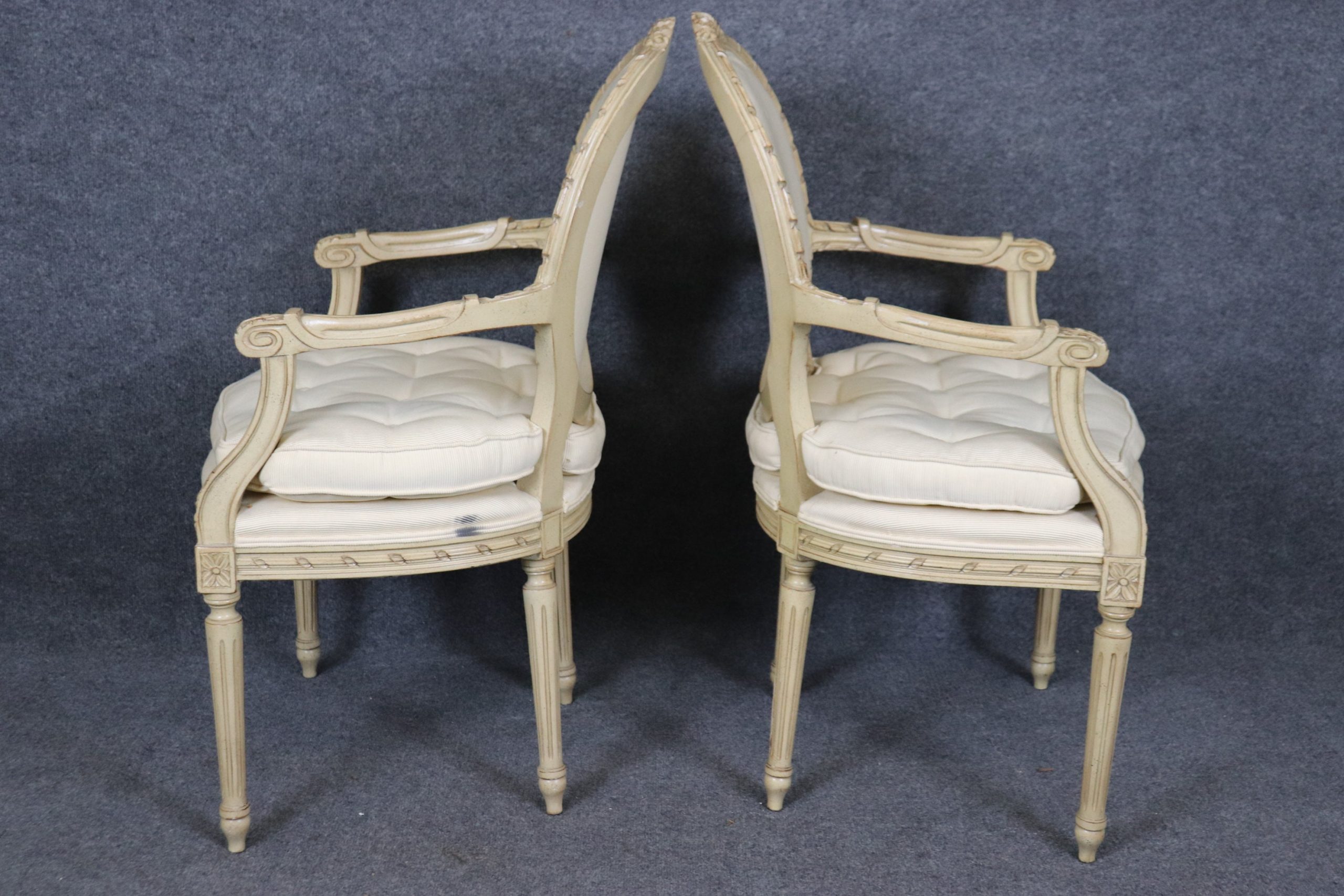 This vintage pair of Louis XVI style distressed paint decorated armchairs accent chairs is perfect for you and your home and is a lovely example of high quality furniture from the 20th century! If you look at the photos provided, you will see the luxurious tufted upholstery on the seats. This pair is perfect for any entryway, living room, bedroom or office and is bound to bring that little extra sense of character and class into your home! One nice thing about this pair is the ability to be paired with a variety of other styles including Art Deco, Art Nouveau, Louis XV, Louis XVI, Mid Century Modern and Contemporary! The chairs are in good vintage condition with light surface scratches and minor finish loss to the frames, but otherwise good condition. Upholstery is in good condition, with the exception of a stain on one chair. Reupholstery is recommended.