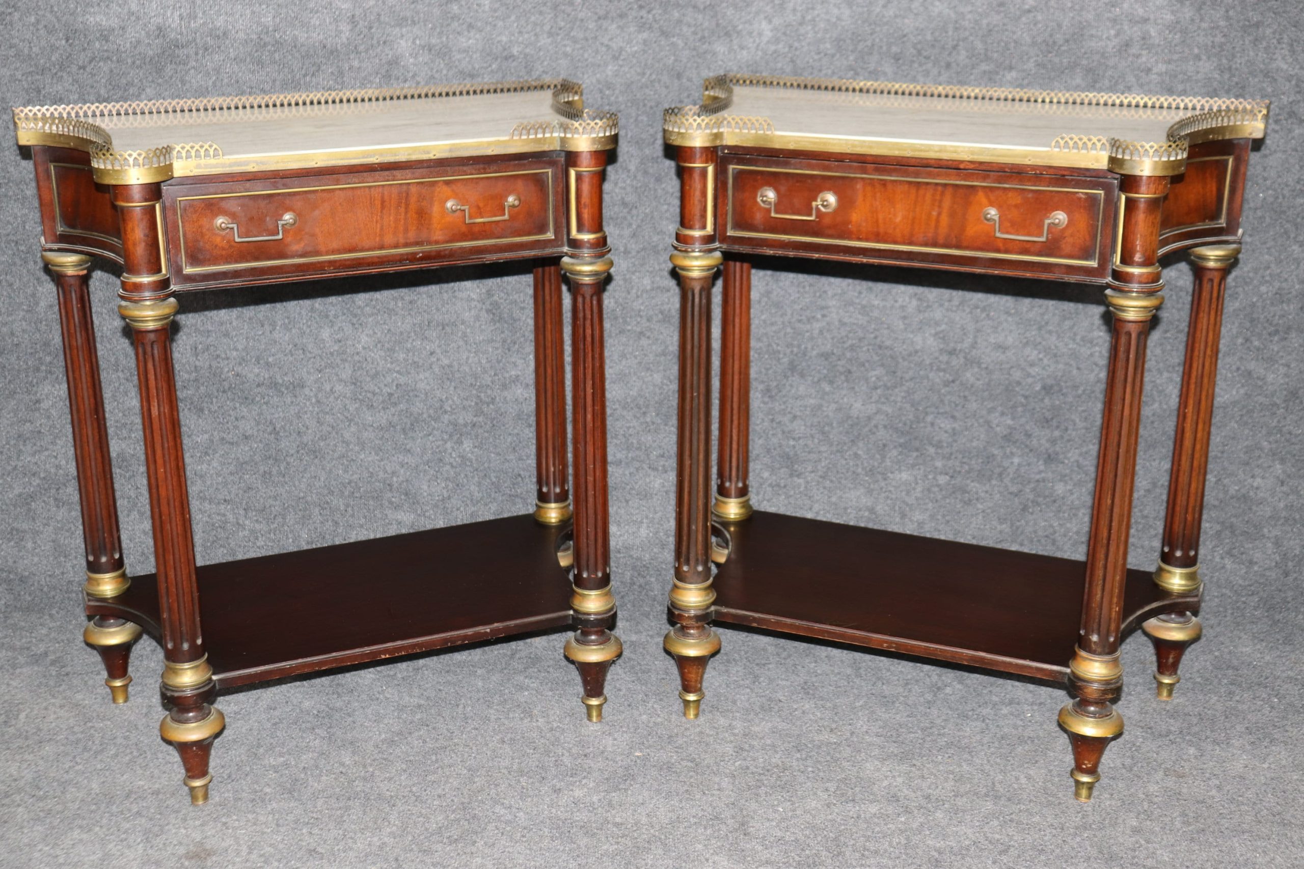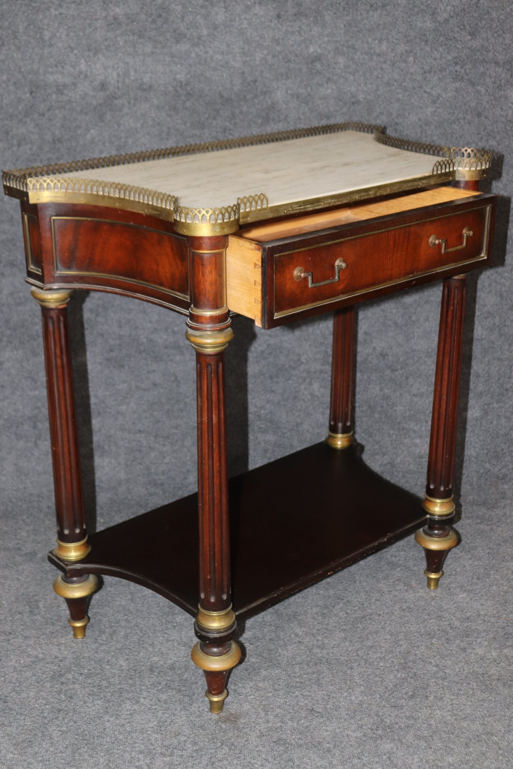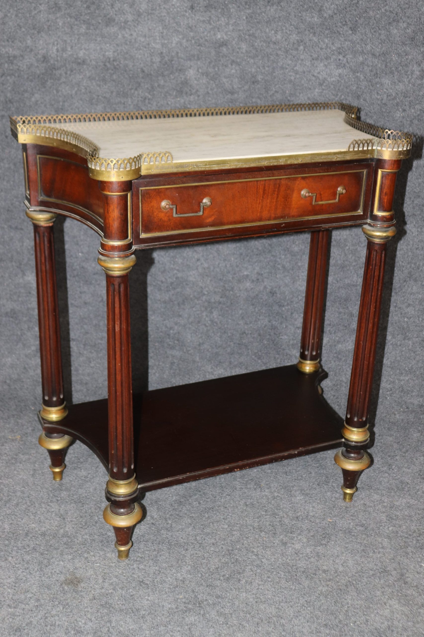 This vintage petite pair of French Louis XVI style marble top console table is made of the highest quality! These consoles are perfect for your living room, entryway, bedroom, dining room or office! They can also be paired with a variety of other styles due to their simplistic yet luxurious design! The consoles are each equipped with one drawer, perfect for storing your personal belongings. These consoles are bound to bring a lovely sense of sophistication and luxury into your home and will certainly be a conversation starter at your next gathering. The pieces are in good vintage condition with the exception of light surface scratches and some minor finish loss as to be expected from items of age and use.