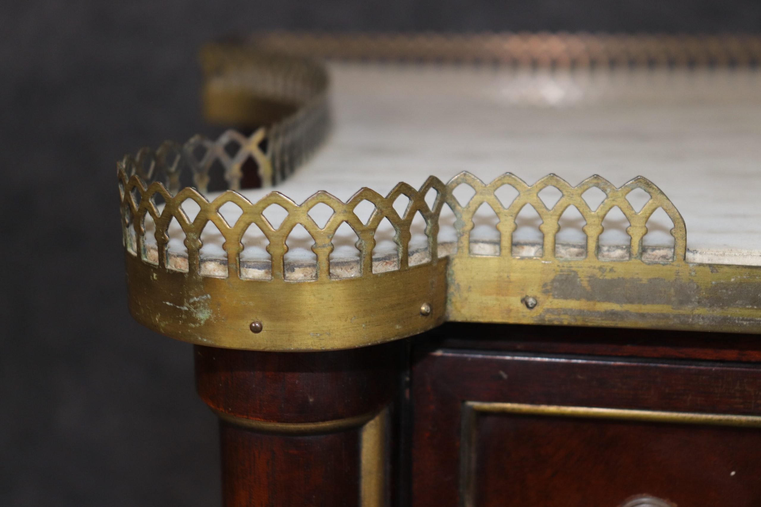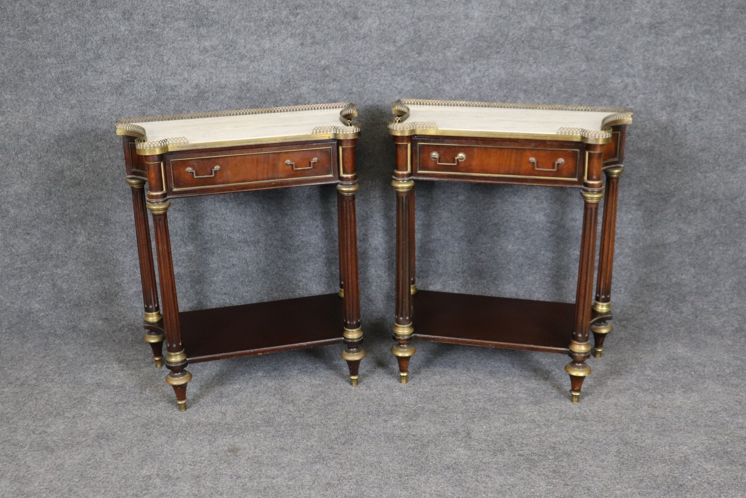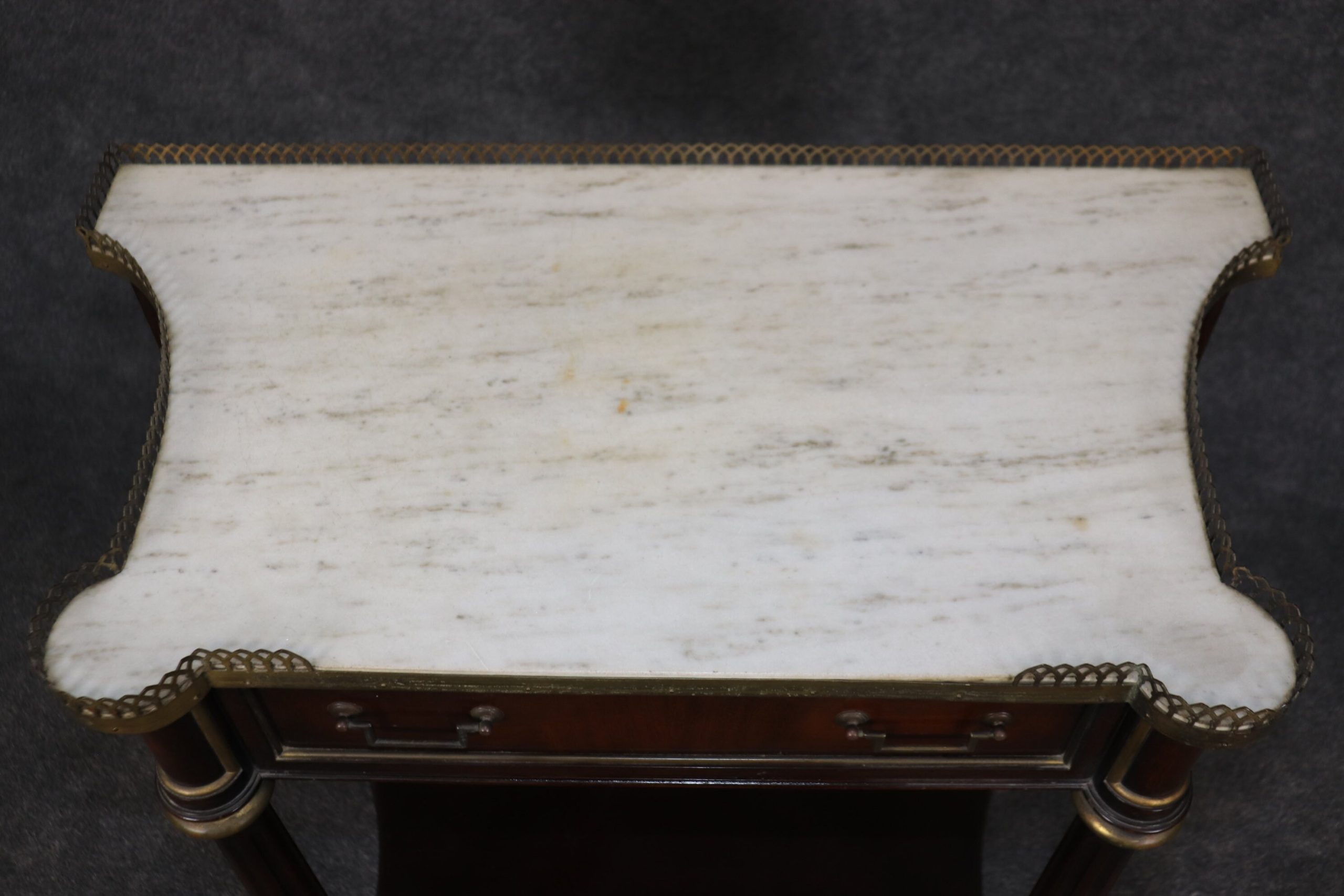 This vintage petite pair of French Louis XVI style marble top console table is made of the highest quality! These consoles are perfect for your living room, entryway, bedroom, dining room or office! They can also be paired with a variety of other styles due to their simplistic yet luxurious design! The consoles are each equipped with one drawer, perfect for storing your personal belongings. These consoles are bound to bring a lovely sense of sophistication and luxury into your home and will certainly be a conversation starter at your next gathering. The pieces are in good vintage condition with the exception of light surface scratches and some minor finish loss as to be expected from items of age and use.