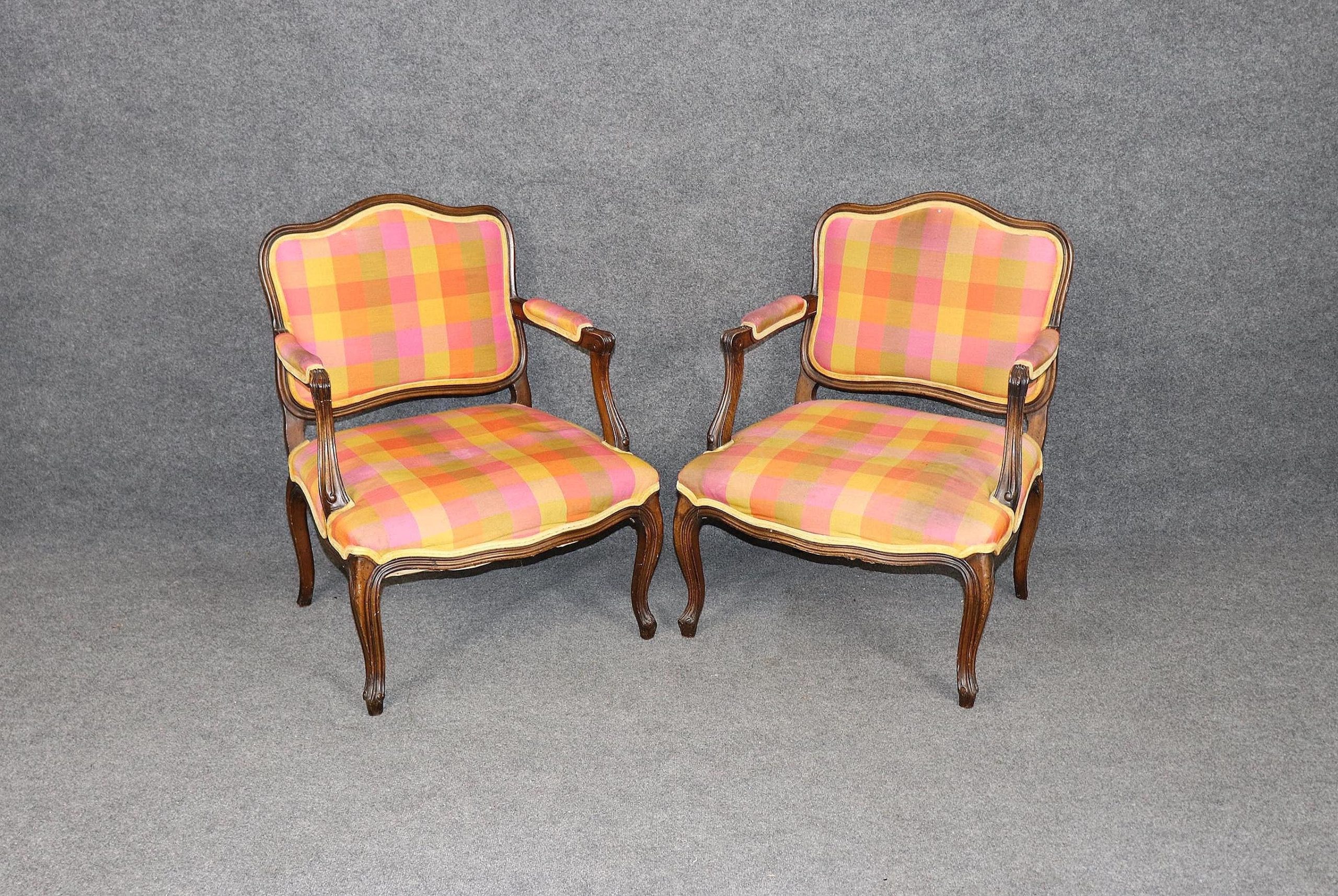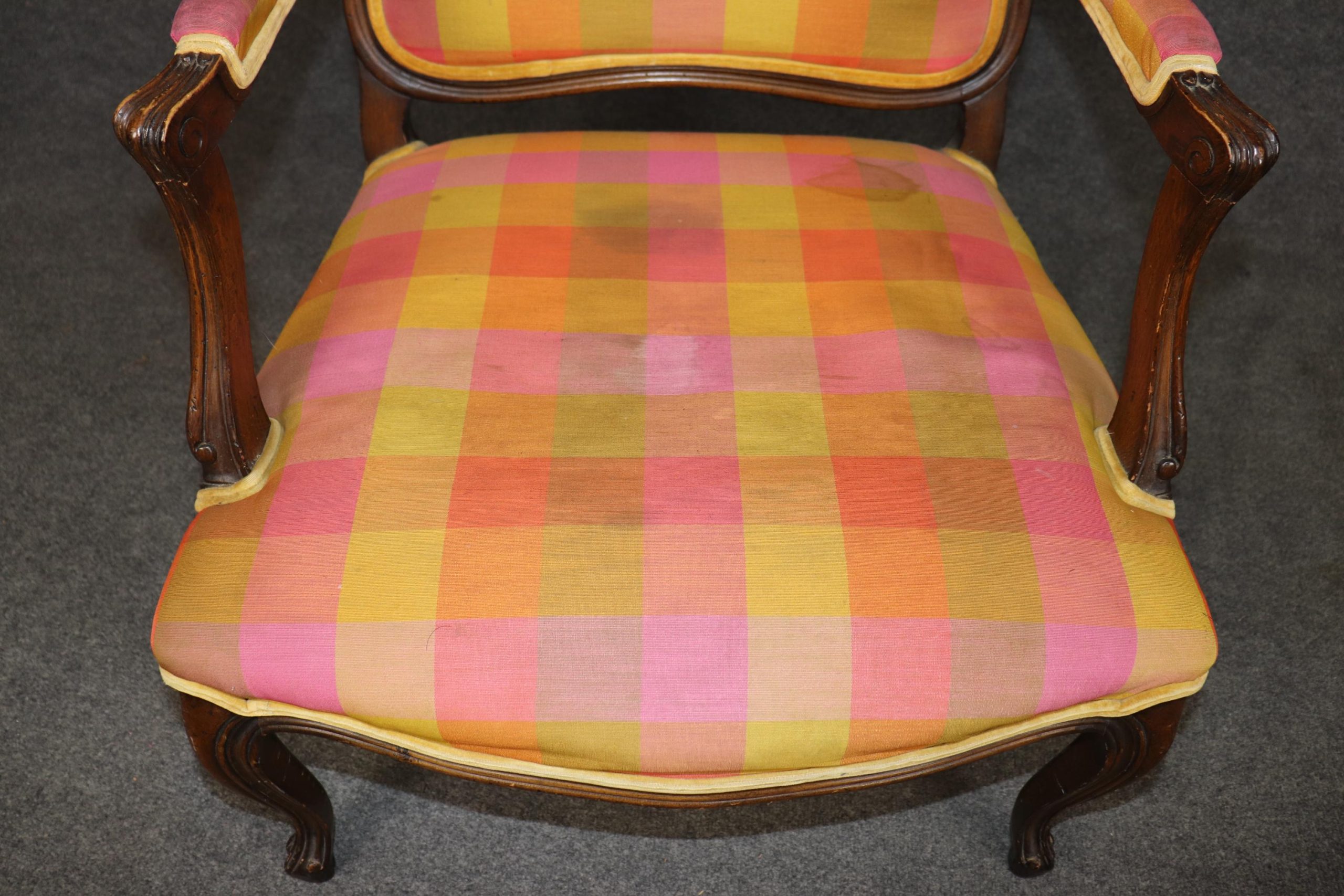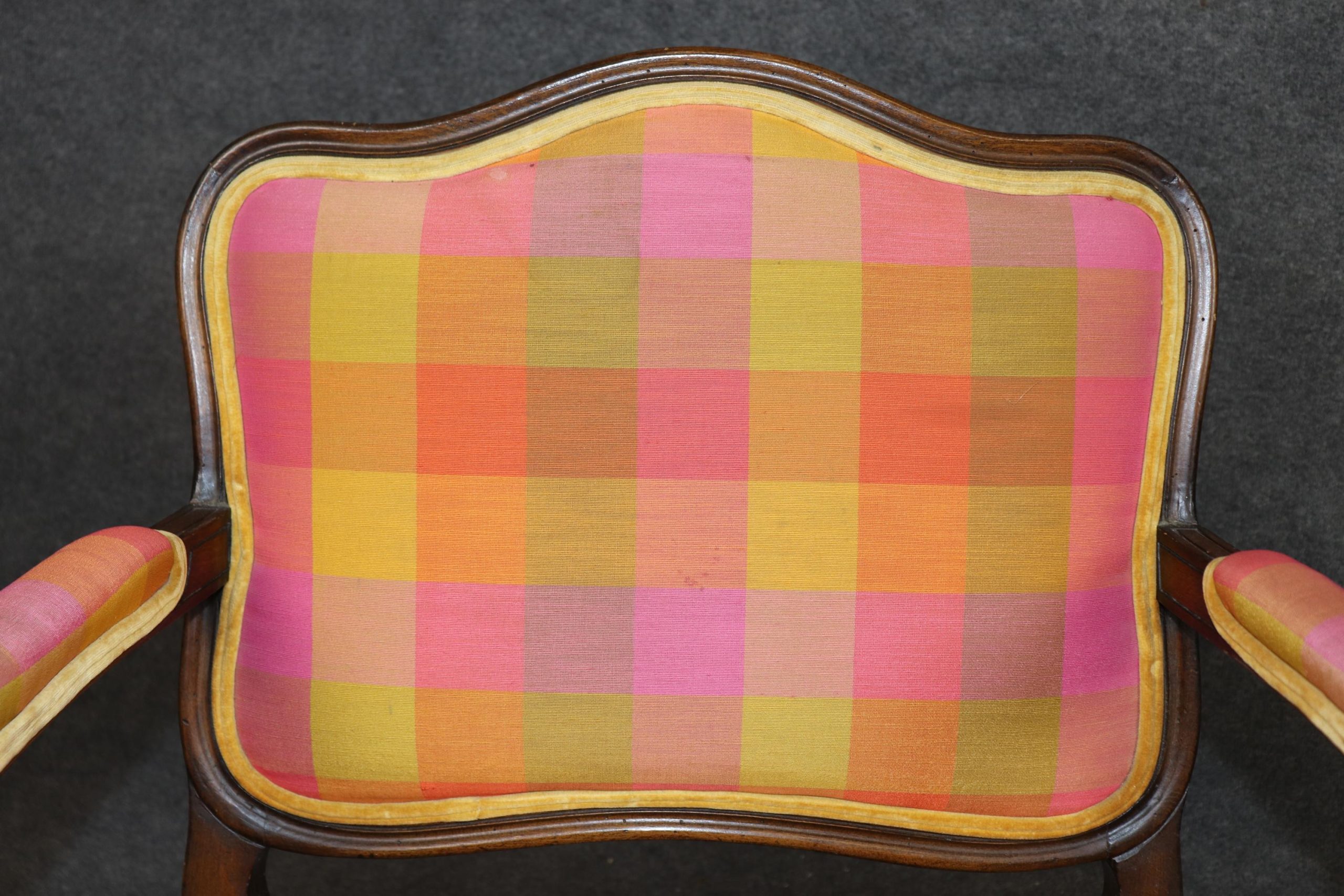 The chairs are upholstered in a vibrant multicolored plaid fabric, offering a unique juxtaposition of traditional form with a playful, contemporary flair. While the upholstery brings a burst of color and personality, it does exhibit visible staining and signs of age-related wear. For those seeking a more tailored or updated look, reupholstering is recommended—a perfect opportunity to customize these frames with your choice of fine fabric or leather.