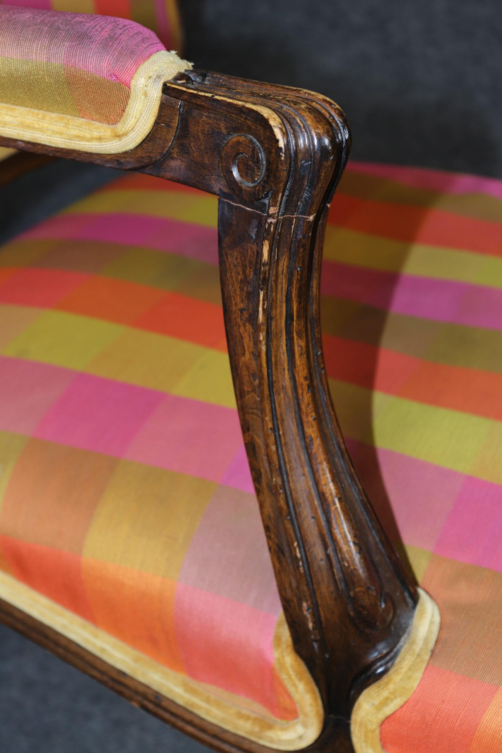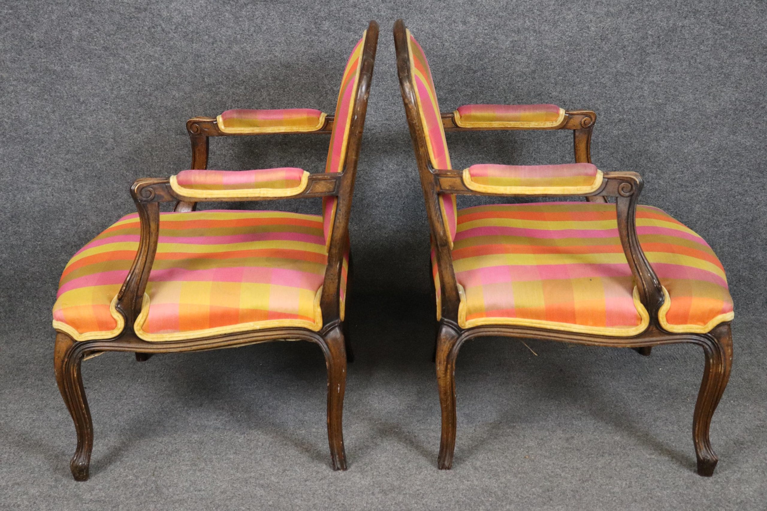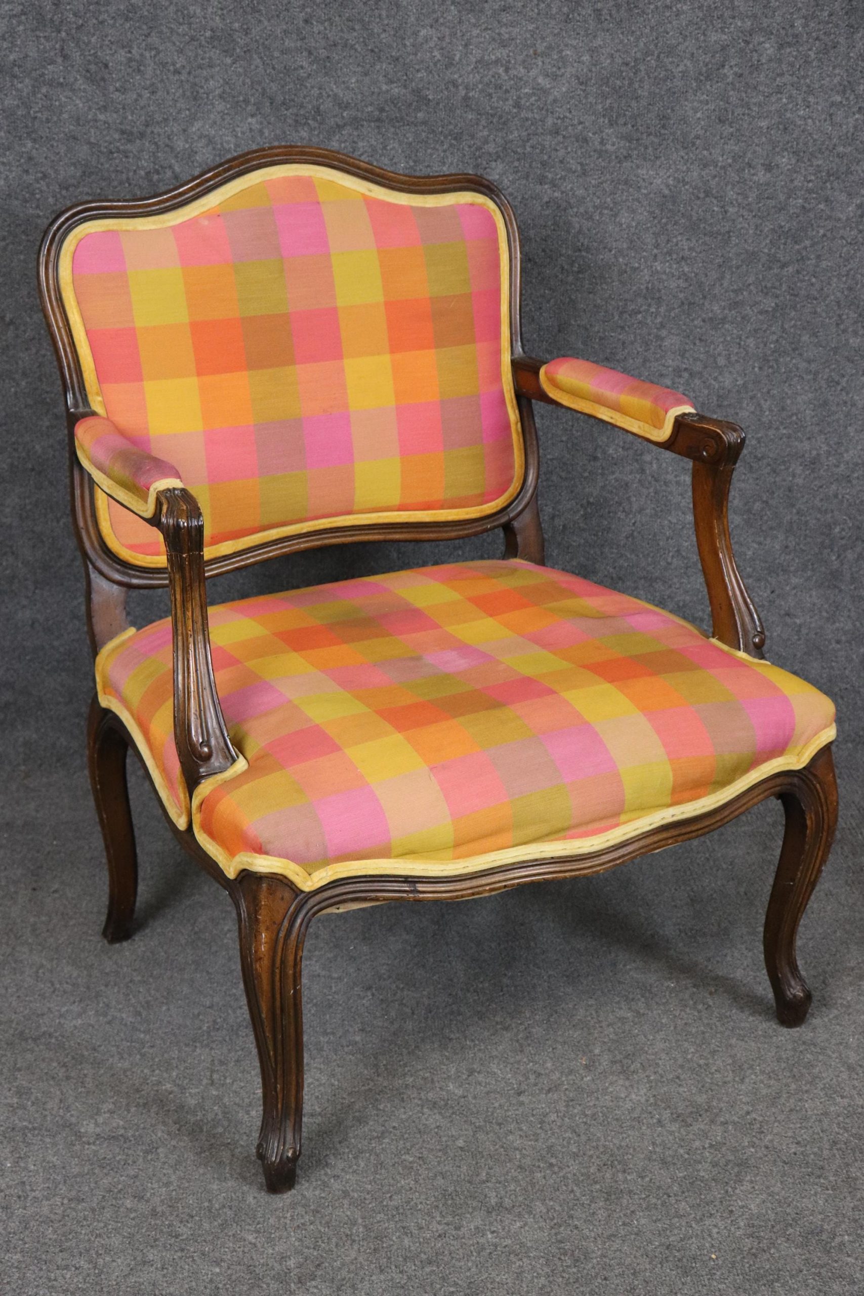 The chairs are upholstered in a vibrant multicolored plaid fabric, offering a unique juxtaposition of traditional form with a playful, contemporary flair. While the upholstery brings a burst of color and personality, it does exhibit visible staining and signs of age-related wear. For those seeking a more tailored or updated look, reupholstering is recommended—a perfect opportunity to customize these frames with your choice of fine fabric or leather.