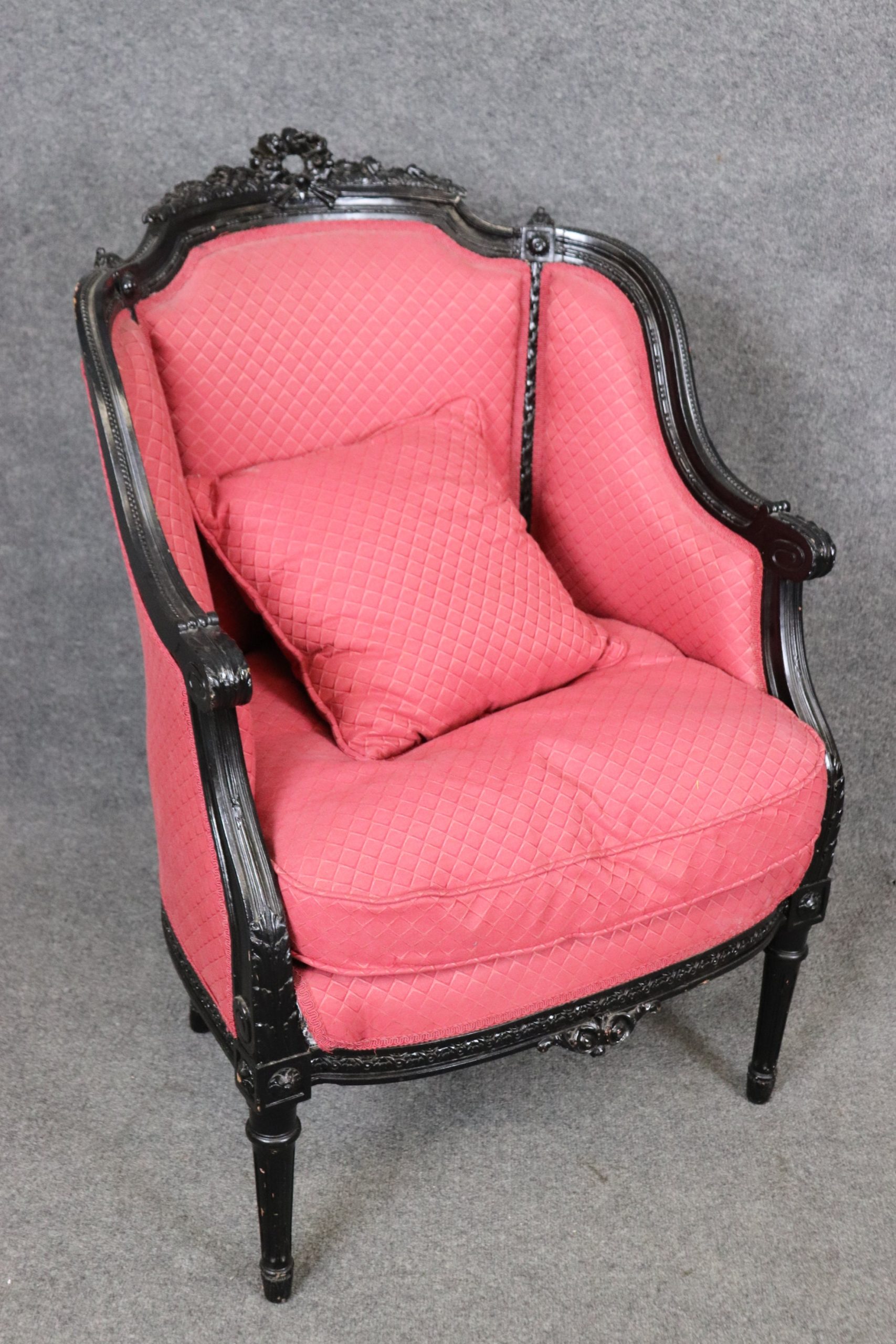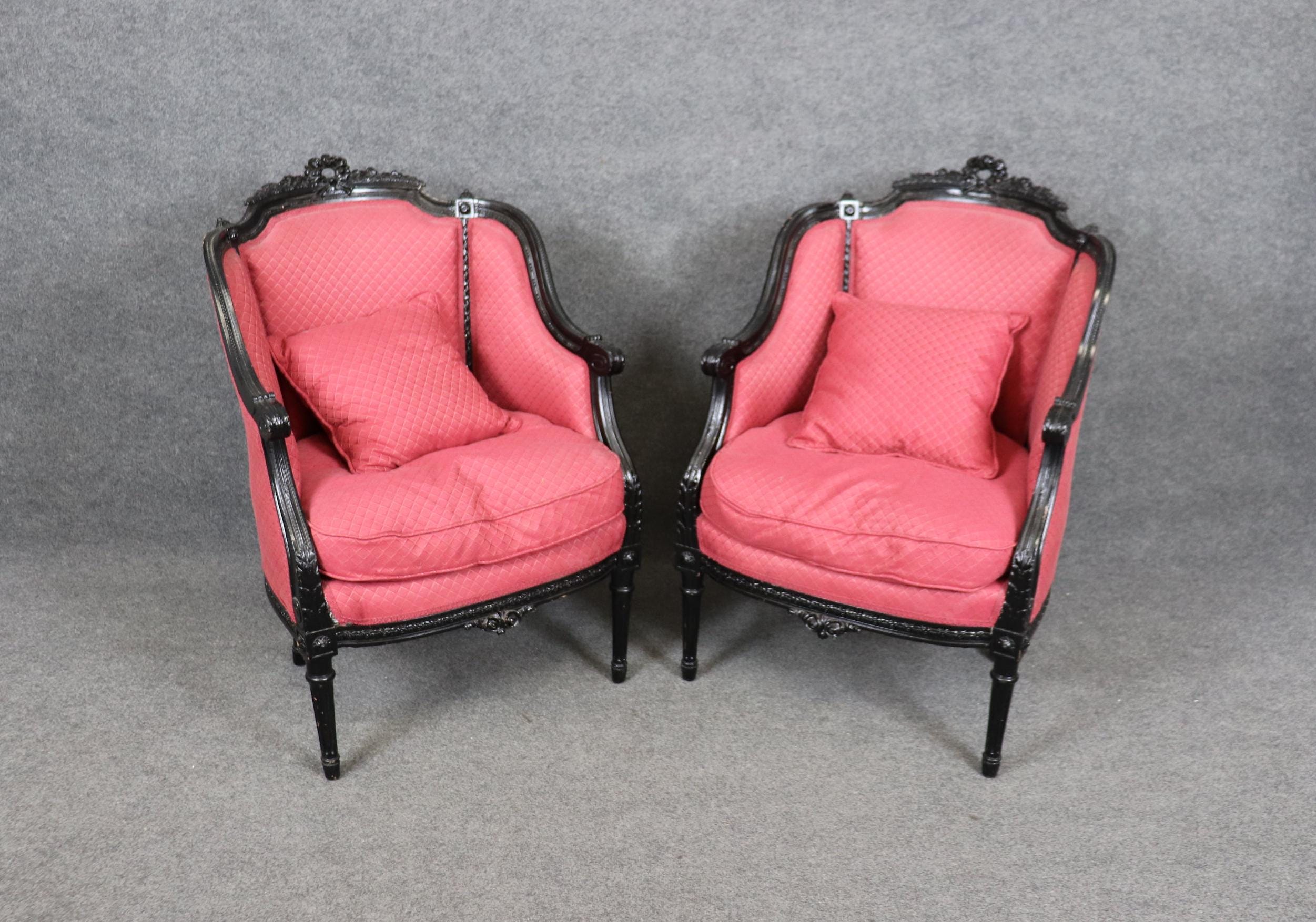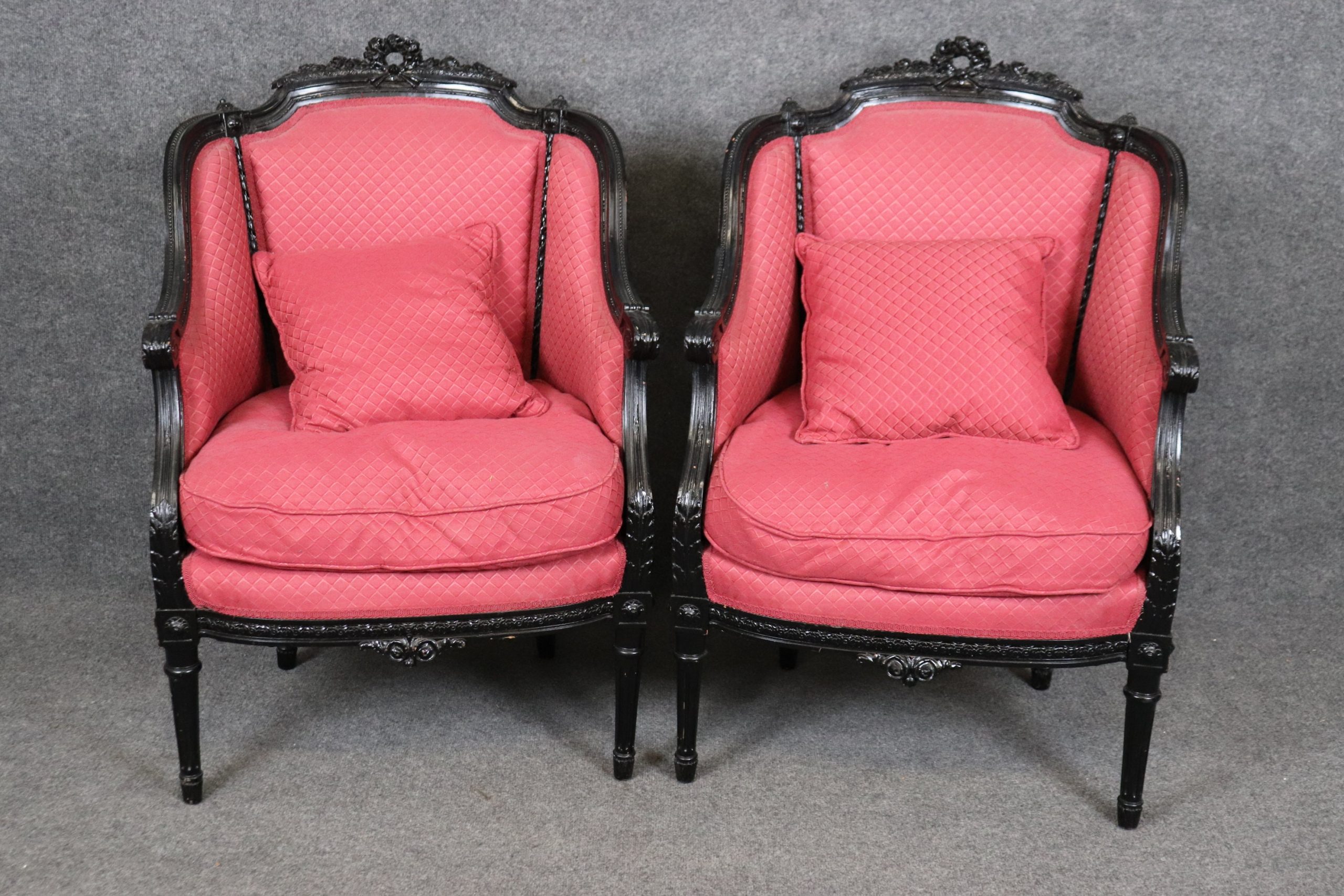 This pair of Louis XVI style ebonized black lacquer upholstered bergeres is made of the highest quality and is perfect for you and your home! If you look at the photos provided you will see the attention to detail within the carvings on the chairs. This pair is perfect for any living room, bedroom, entryway or office and is bound to bring a sense of luxury and class into your place of choosing! The chairs are in good antique/vintage condition with some light surface scratches and minor finish loss to frames.
