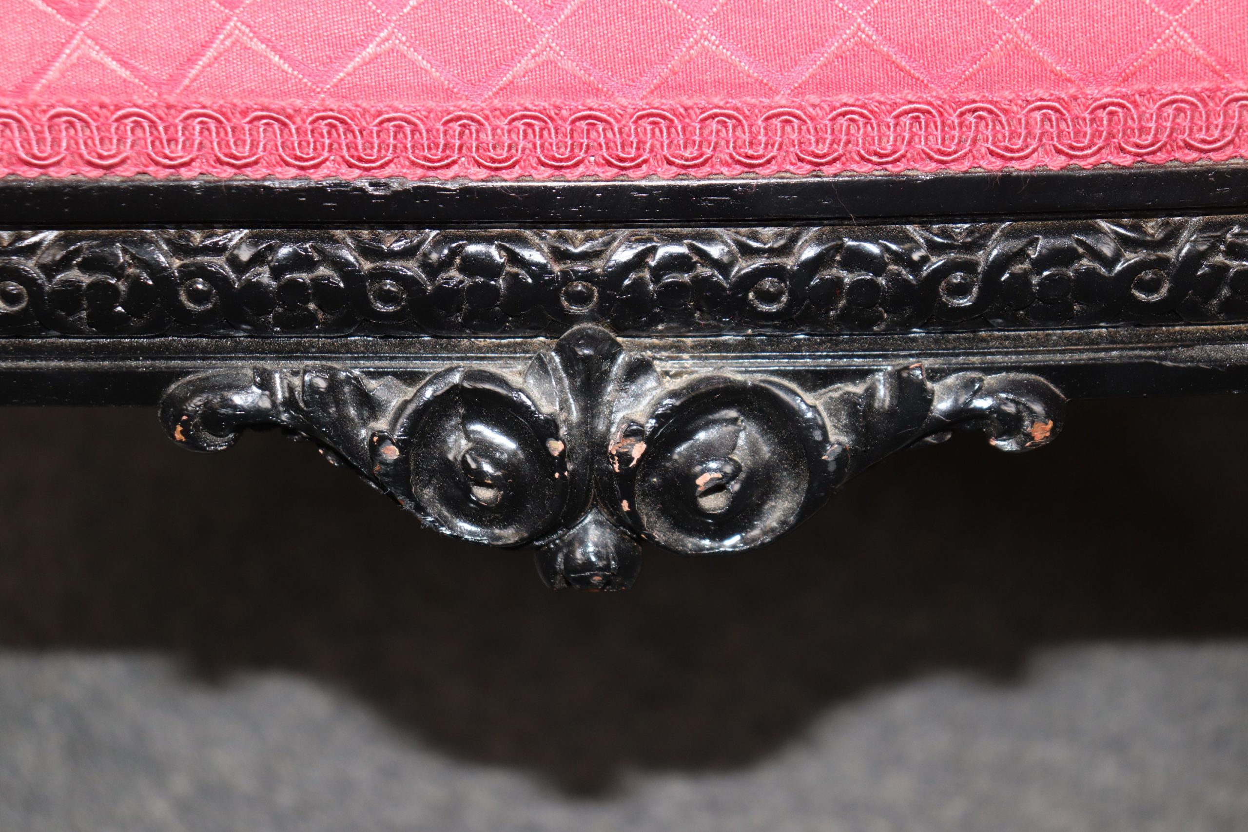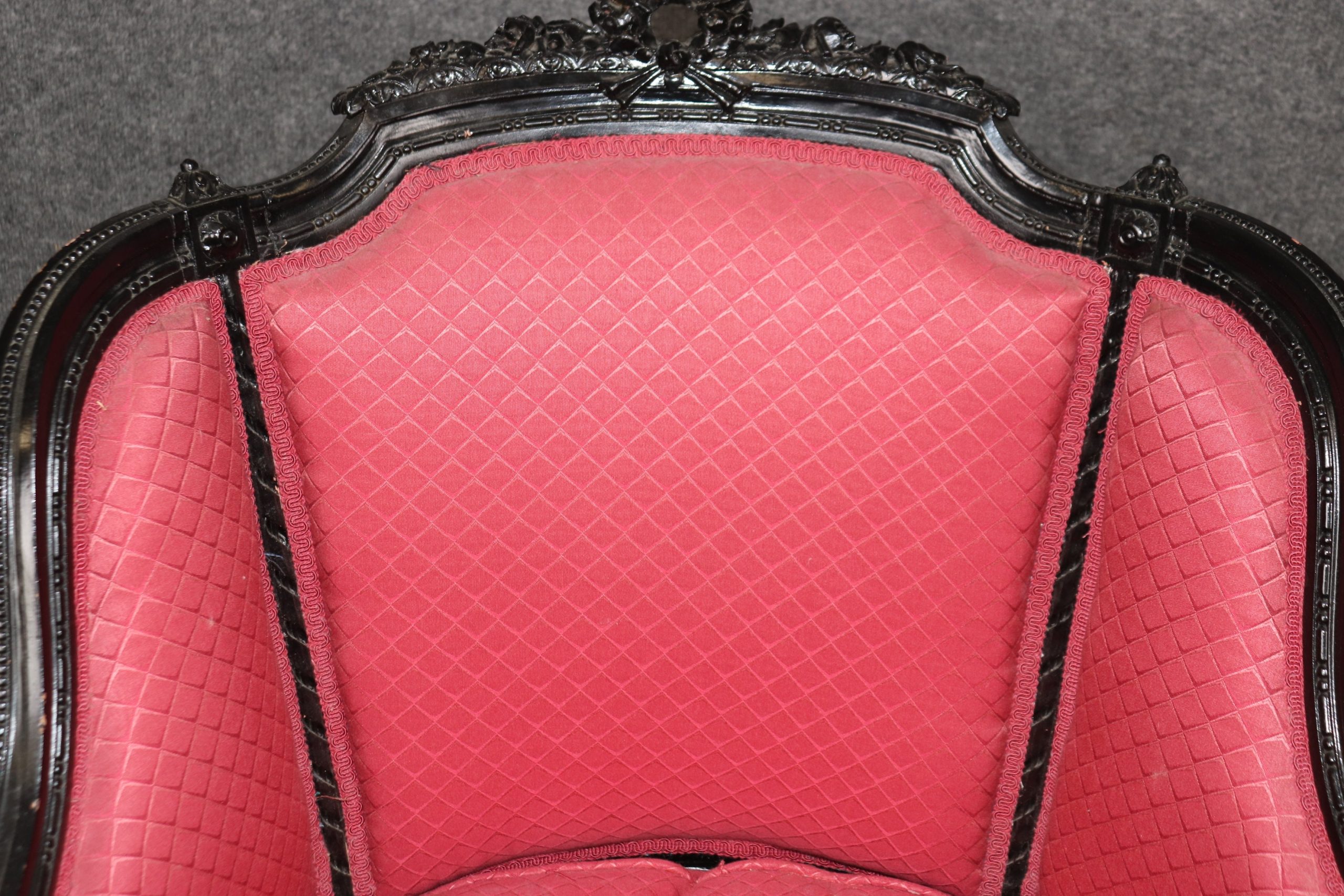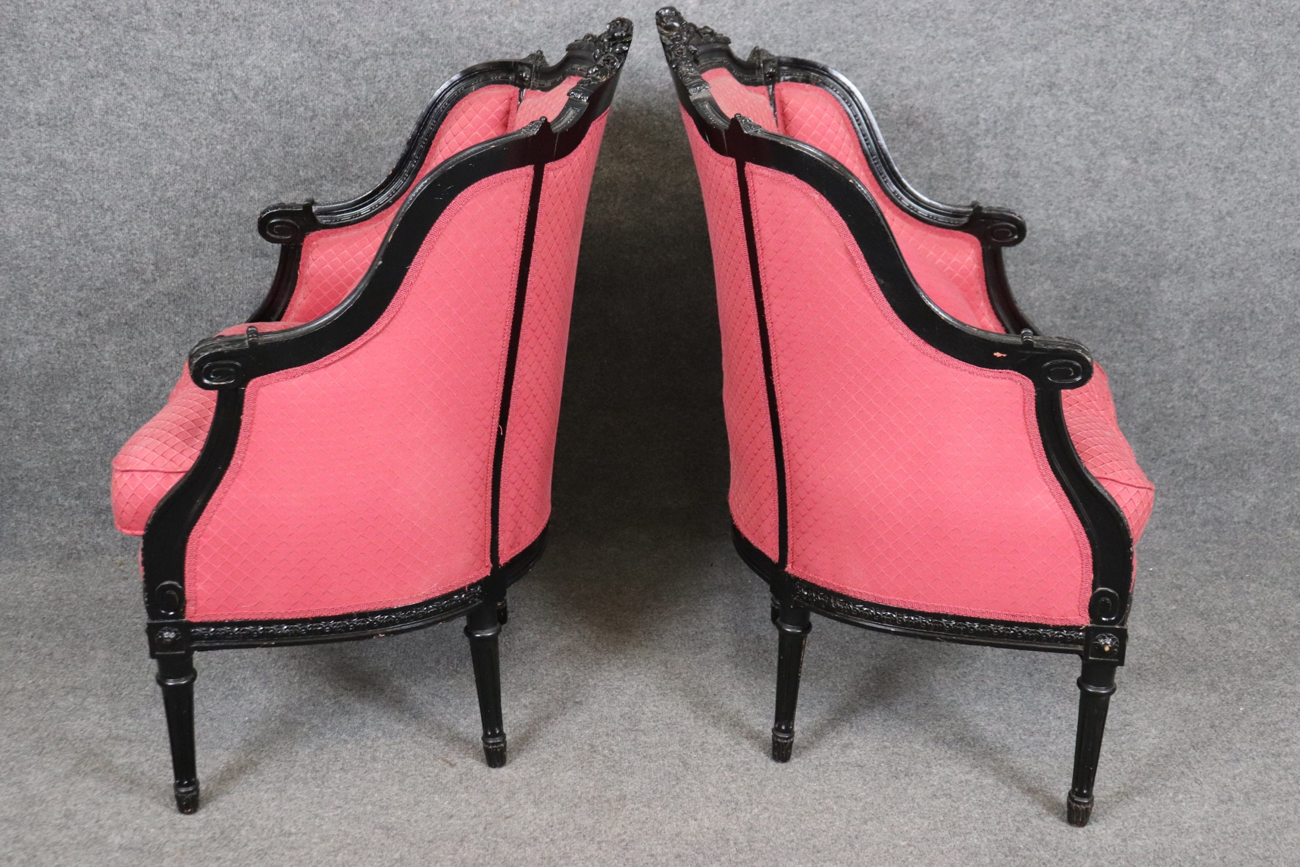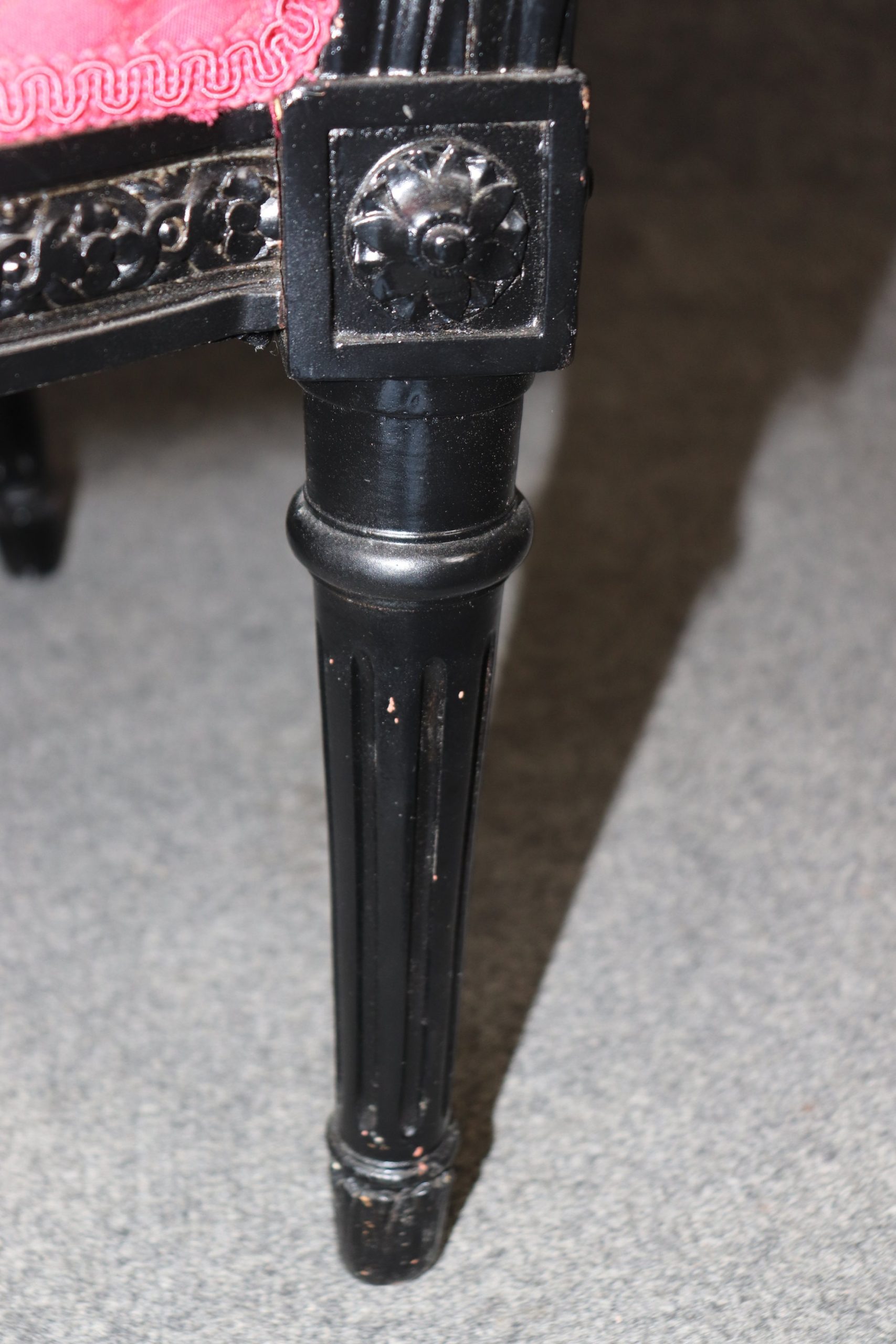 This pair of Louis XVI style ebonized black lacquer upholstered bergeres is made of the highest quality and is perfect for you and your home! If you look at the photos provided you will see the attention to detail within the carvings on the chairs. This pair is perfect for any living room, bedroom, entryway or office and is bound to bring a sense of luxury and class into your place of choosing! The chairs are in good antique/vintage condition with some light surface scratches and minor finish loss to frames.