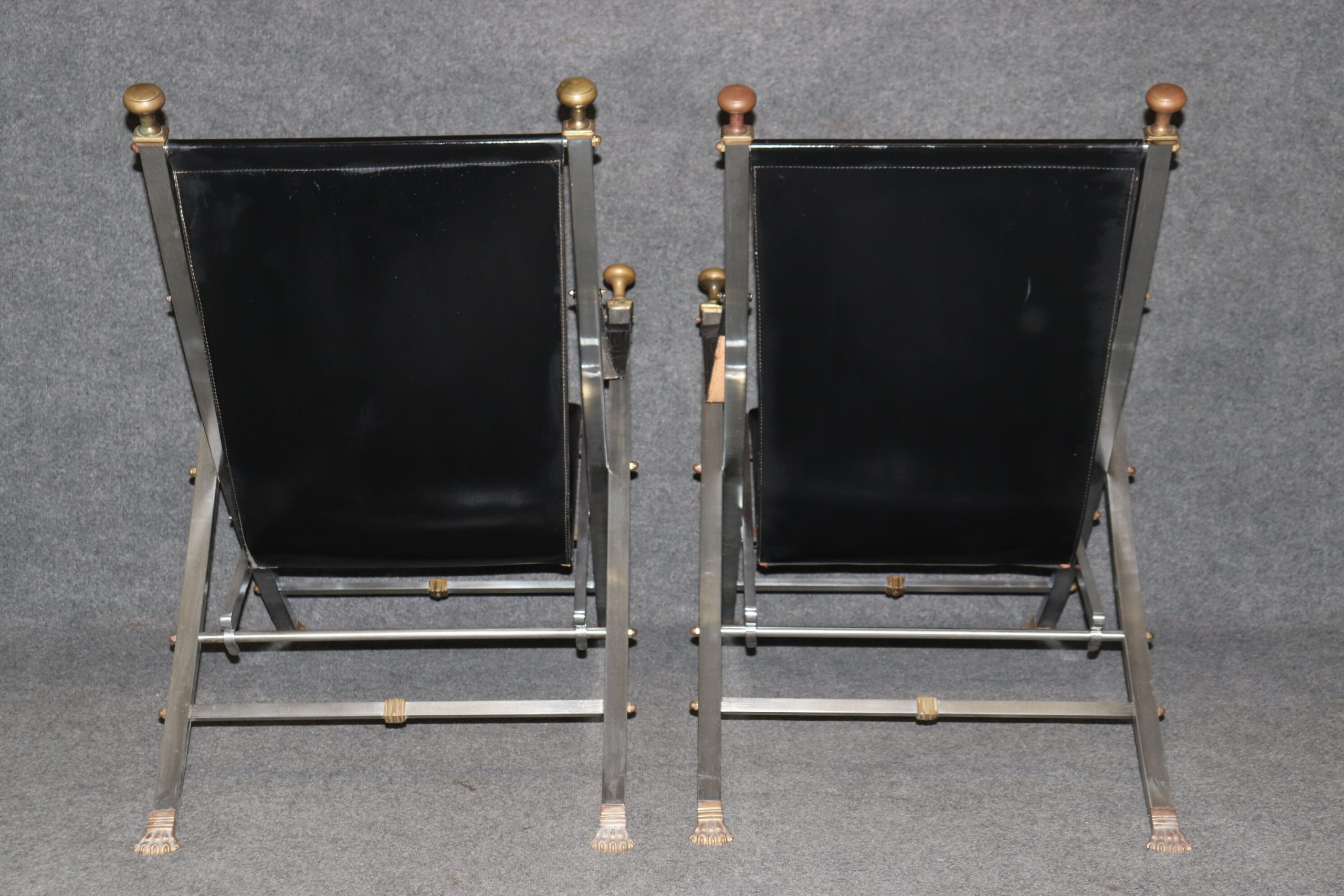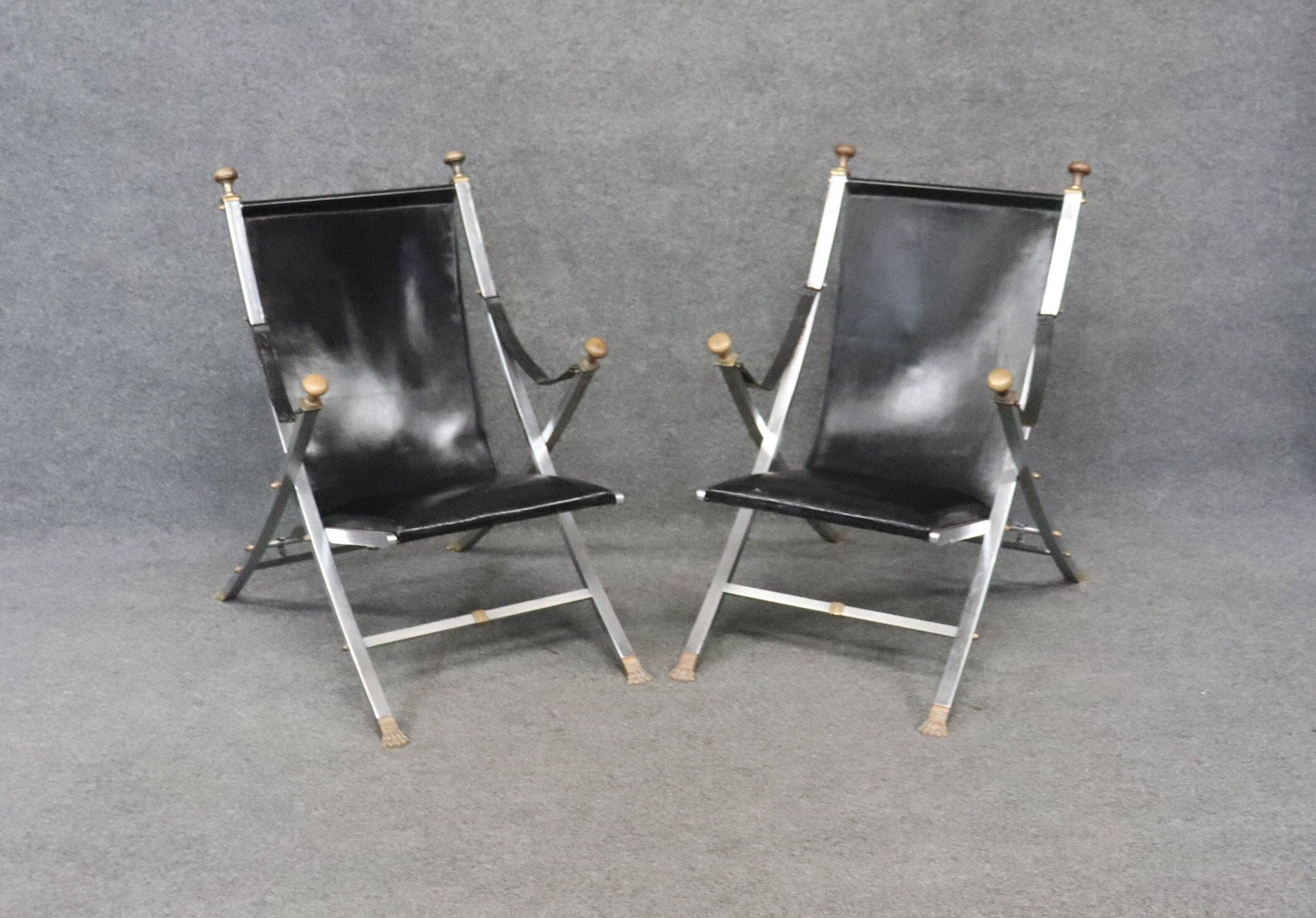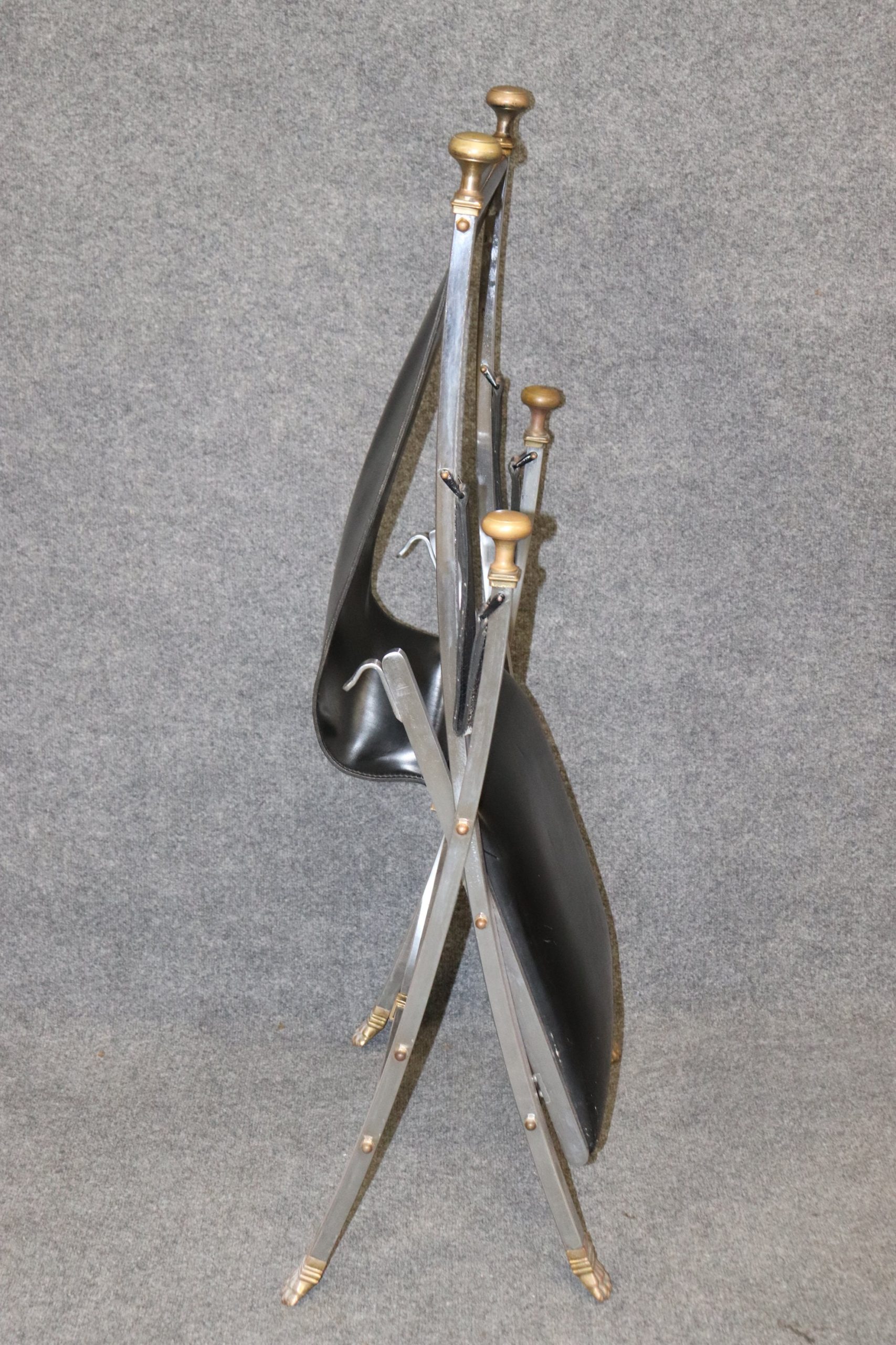 This pair of Maison Jansen Hollywood Regency style folding chairs is perfect for you and your home! This pair of chairs is bound to bring a lovely sense of sophistication and minimalistic luxury into your home or place of choosing. These chairs are equipped with black leather upholstery on steel frames. This pair of chairs are perfect for your living room, office, entryway or place of your choosing! One nice quality to these chairs is their ability to be folded up and be put away. These chairs are in vintage condition with some scratches to the leather, oxidation to the metal and a few minor missing bolts that can most likely be replaced, but otherwise good condition considering age and use.