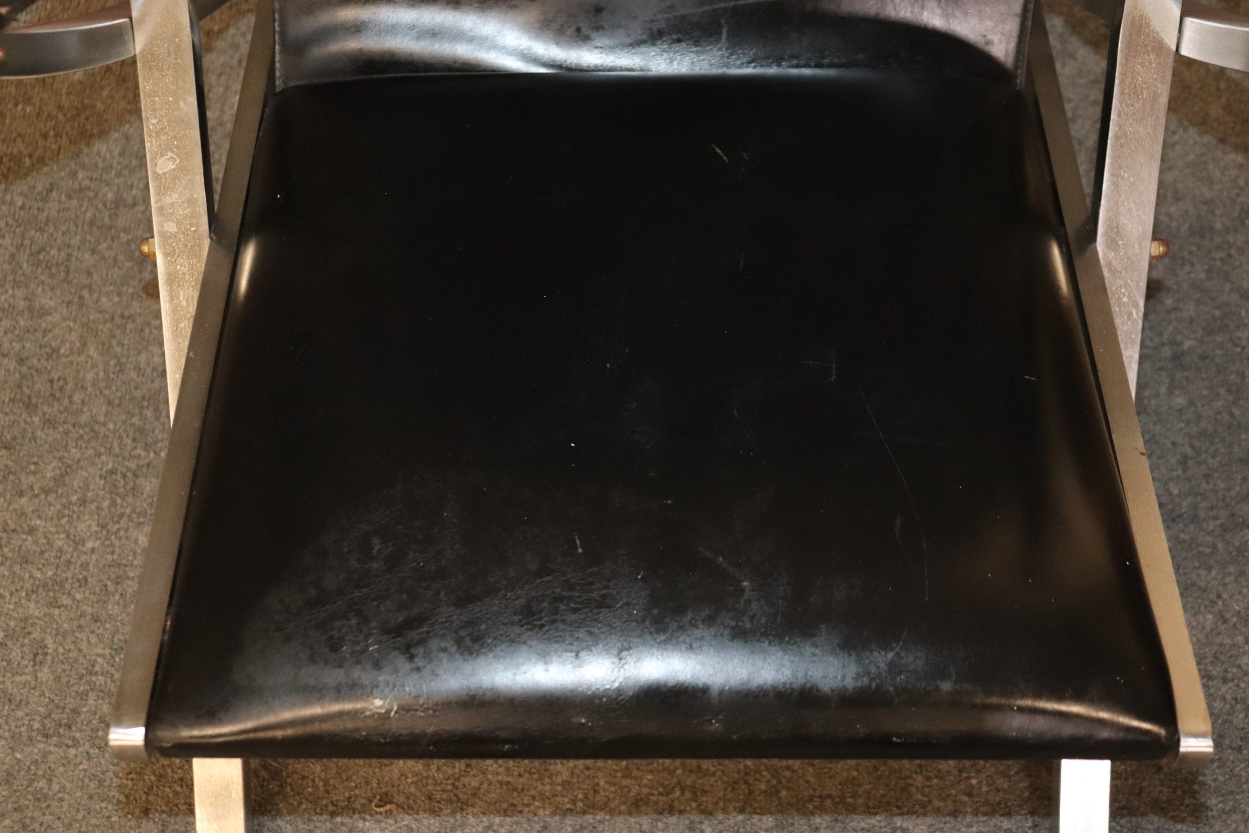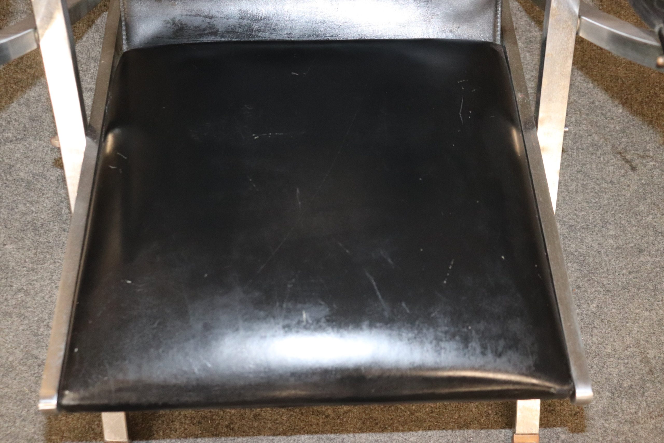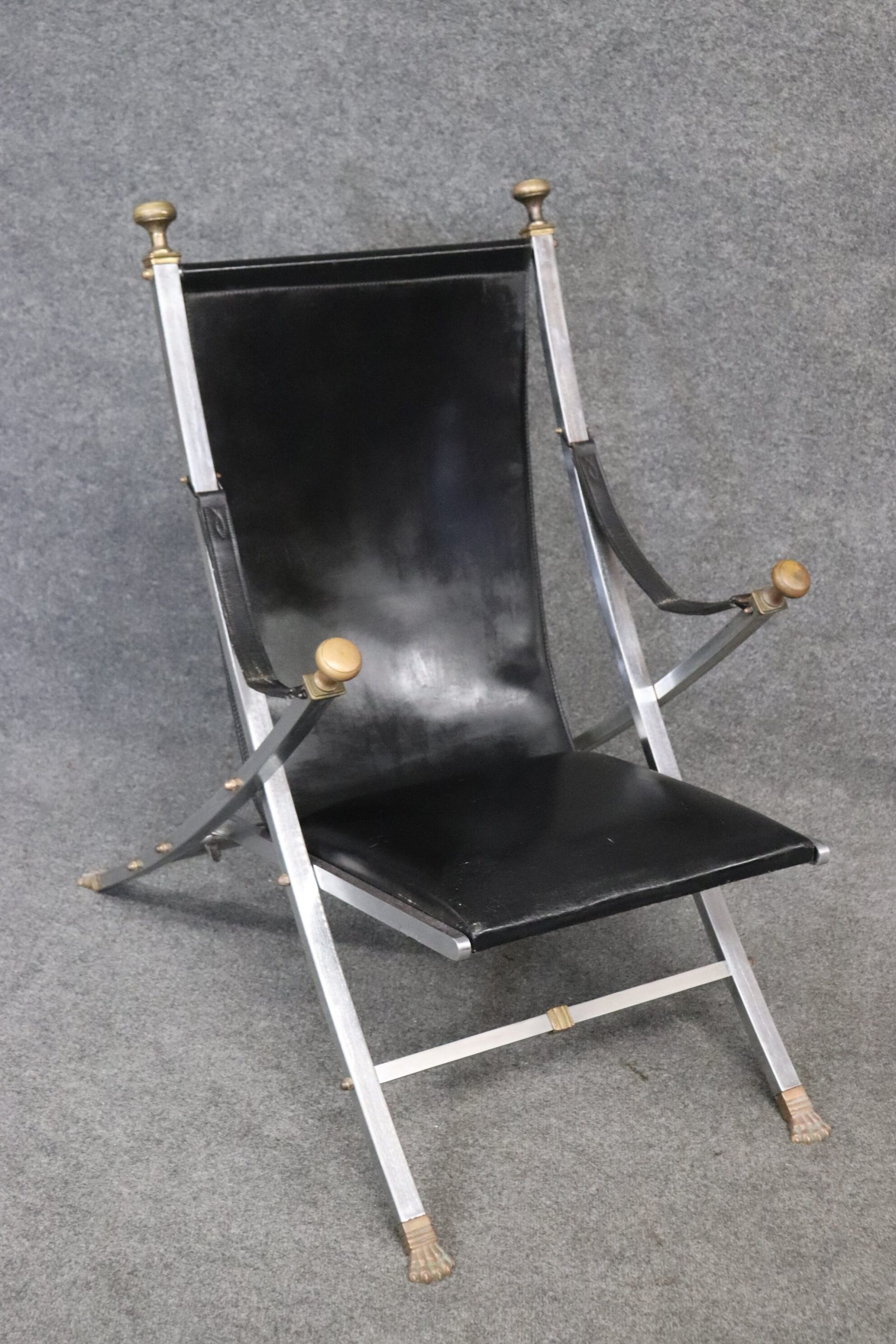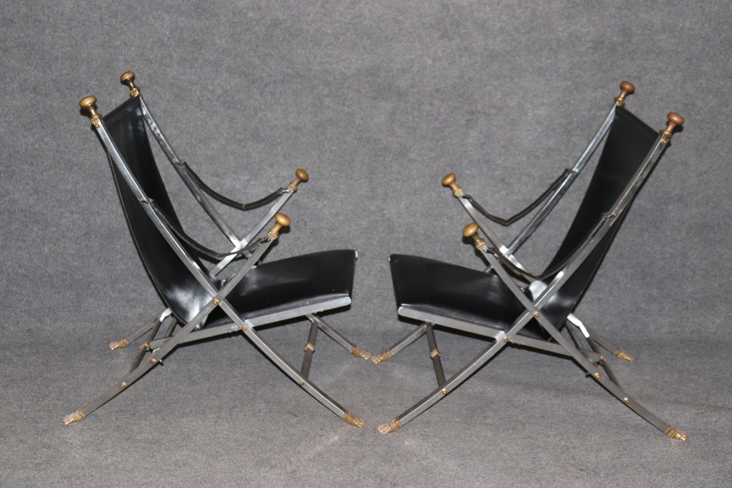 This pair of Maison Jansen Hollywood Regency style folding chairs is perfect for you and your home! This pair of chairs is bound to bring a lovely sense of sophistication and minimalistic luxury into your home or place of choosing. These chairs are equipped with black leather upholstery on steel frames. This pair of chairs are perfect for your living room, office, entryway or place of your choosing! One nice quality to these chairs is their ability to be folded up and be put away. These chairs are in vintage condition with some scratches to the leather, oxidation to the metal and a few minor missing bolts that can most likely be replaced, but otherwise good condition considering age and use.