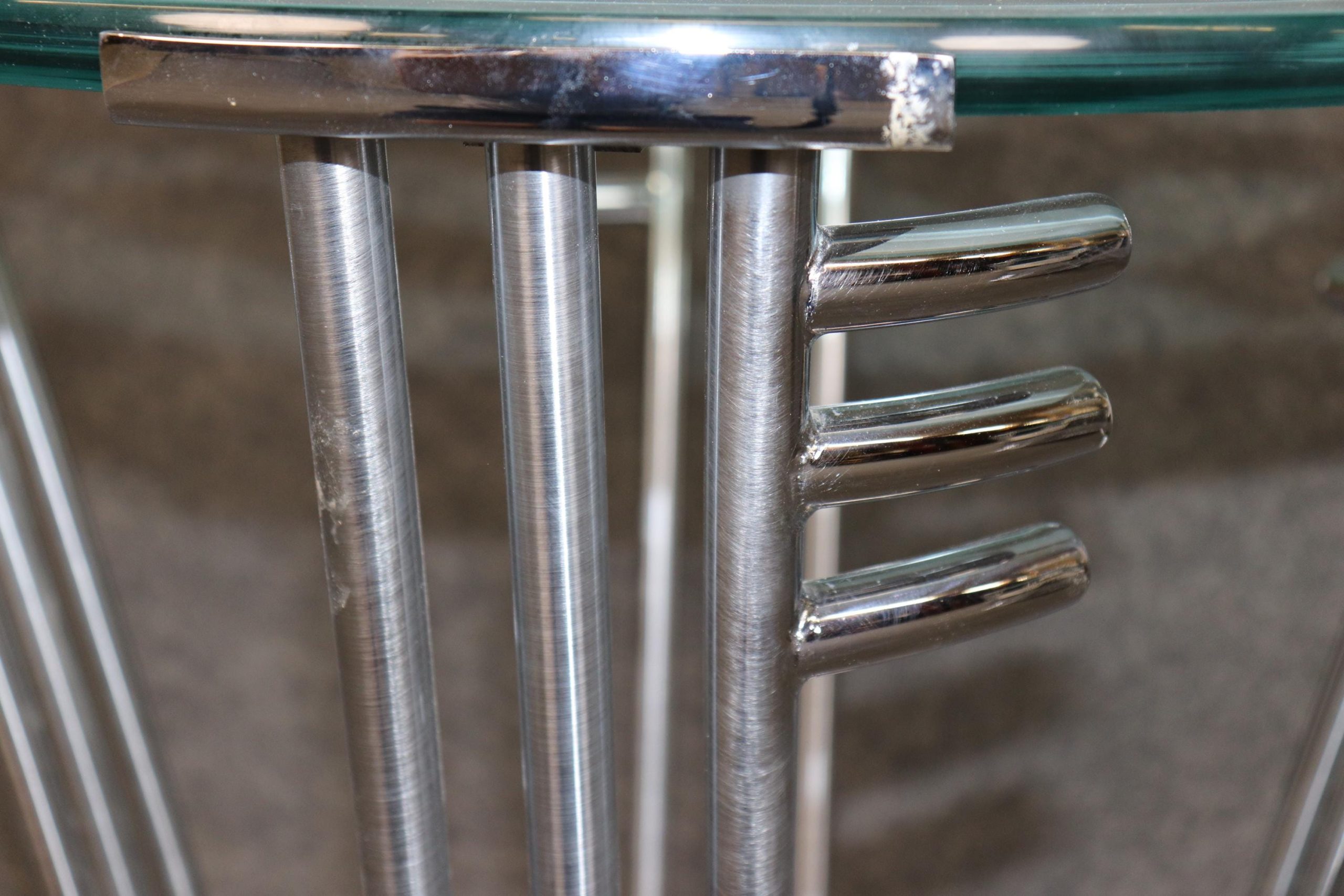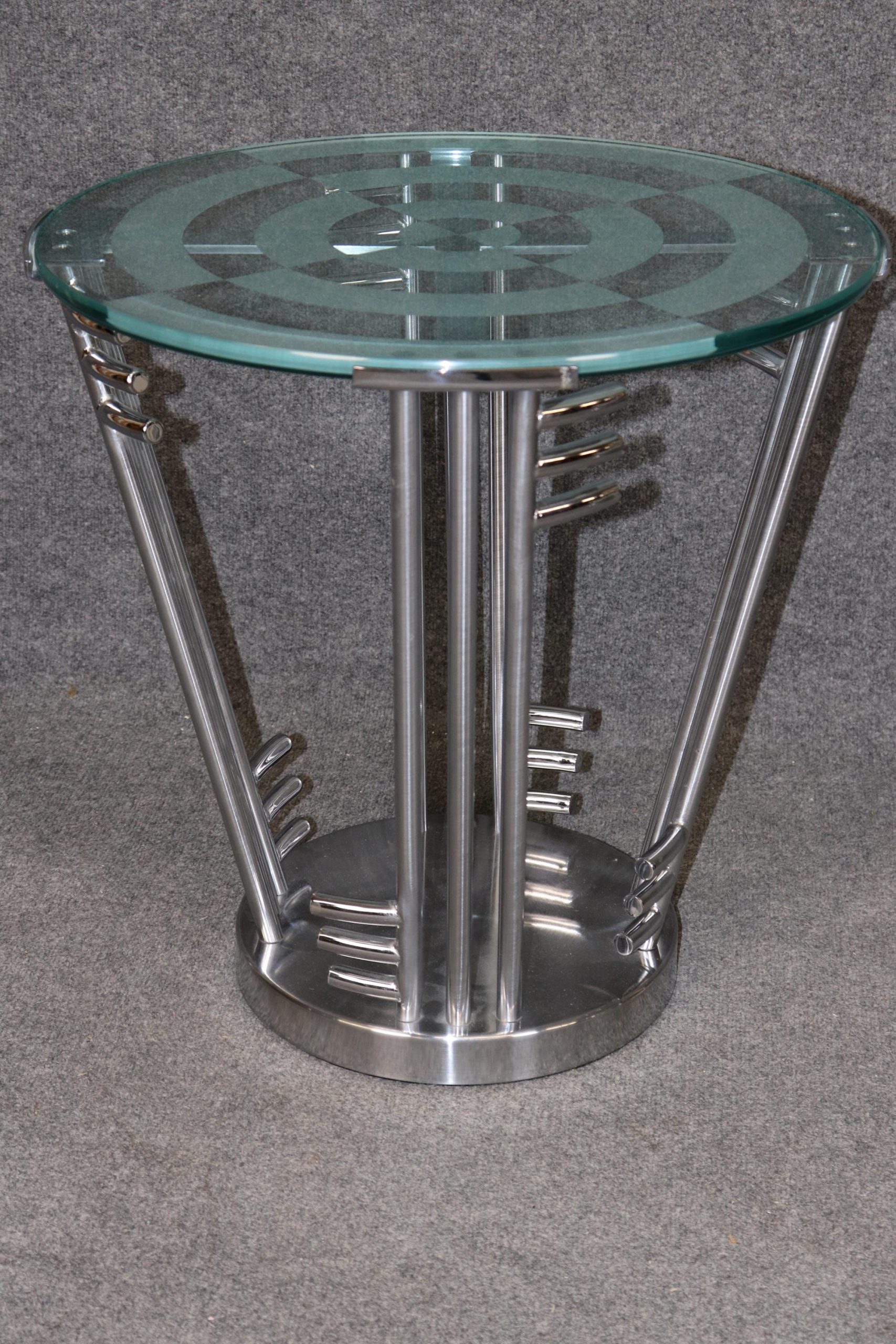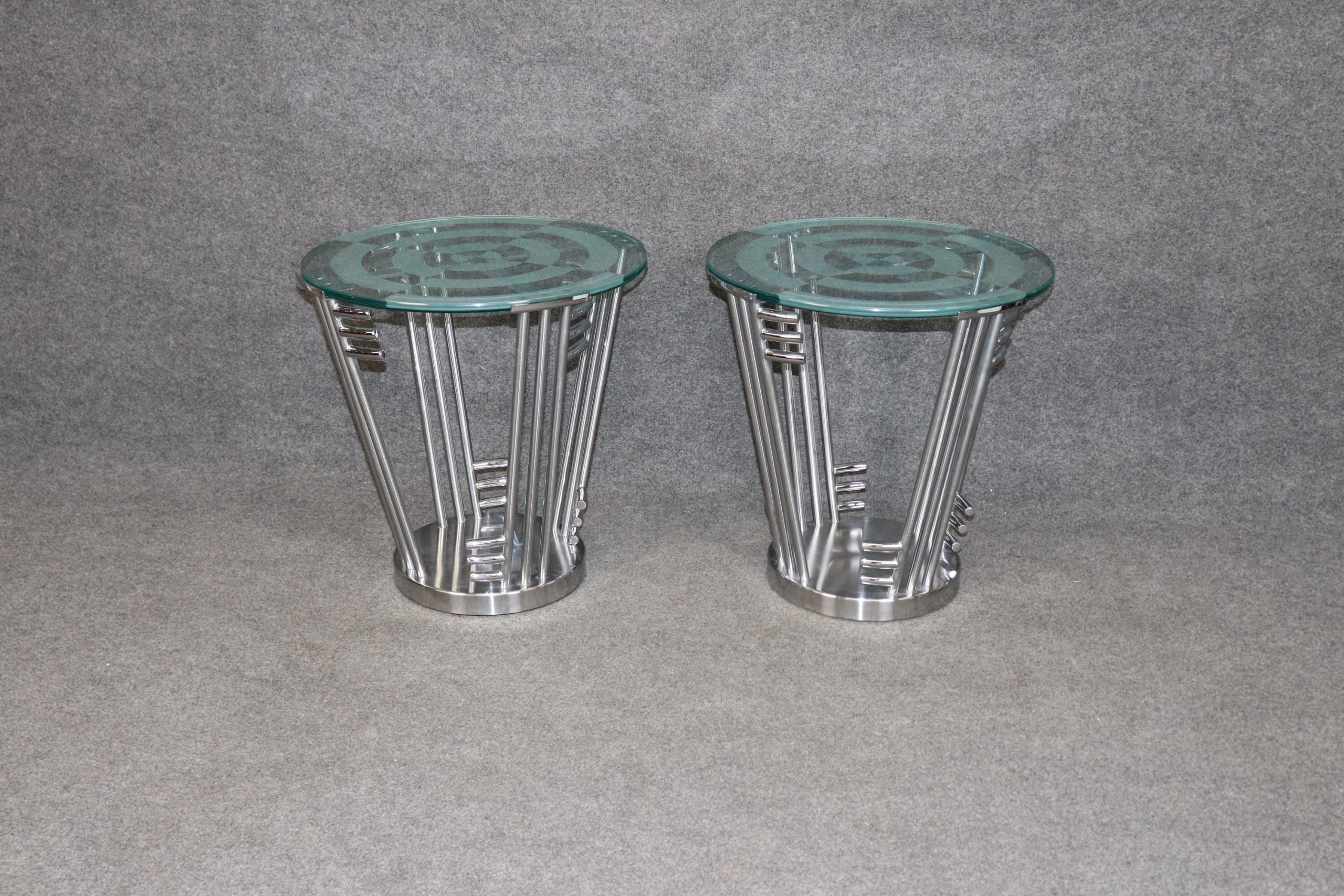 This pair of post modern contemporary etched glass and chrome end tables are made of the highest quality! The nice thing about these end tables are the fact that they bring a contemporary look into your home or place of choosing and also give off a nice sense of minimalism and character! Antique furniture and vintage pieces have stood the test of time and this bench is no exception! With their quality materials and great craftsmanship, these tables are bound to last you and your family for many years to come! The tables are in good vintage condition with light surface scratches to the glass tops as should be expected with items of this age. Otherwise good condition.