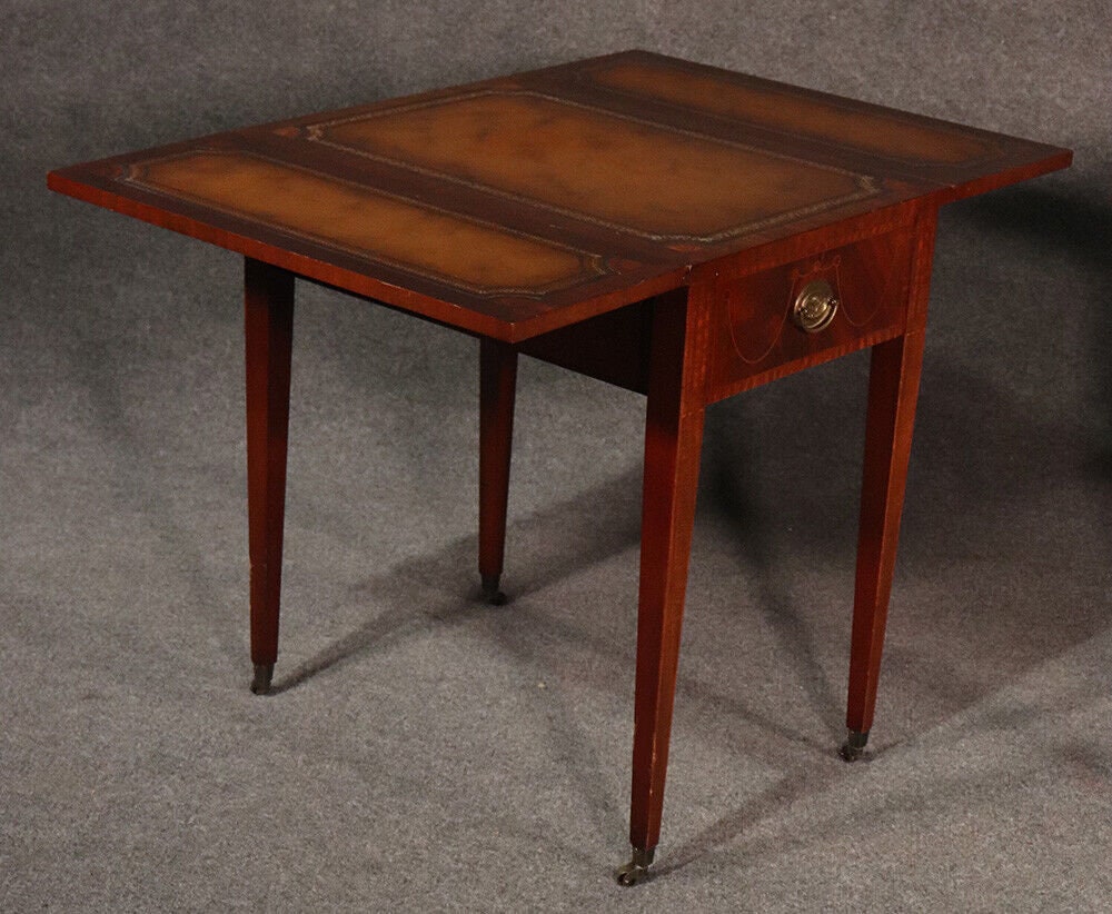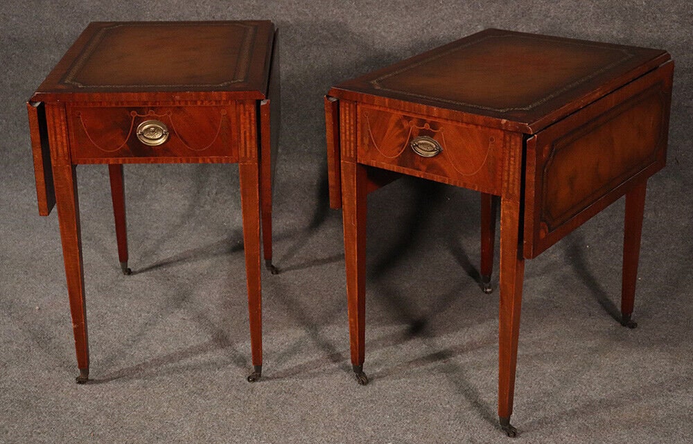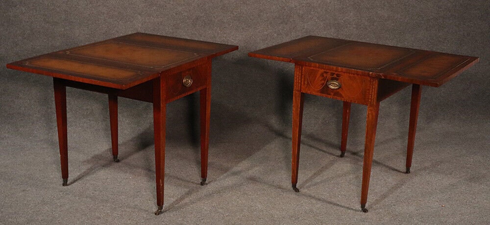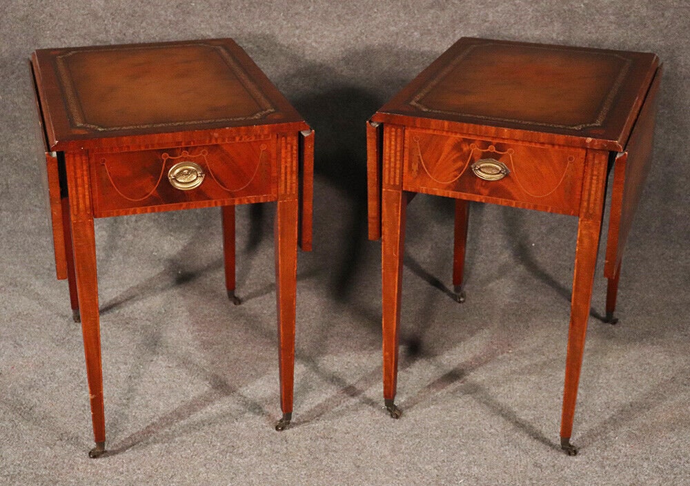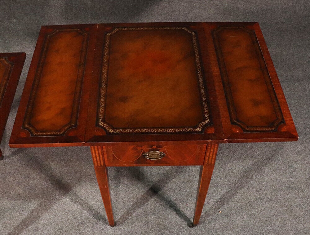 This pair of Sheraton style inlaid mahogany leather top pembroke drop leaf tables is a prime example of class and sophistication! These pieces are made of the highest quality from their high quality leather tops to the rich mahogany used making them truly special! These tables are perfect for your living room, office or anyplace of your choosing! They are in good antique condition with the exception of minor surface scratches as to be expected of antique items. There is a slight difference in the hardware of the tables, but it is hardly noticeable when spaced apart. Otherwise, in good condition!
