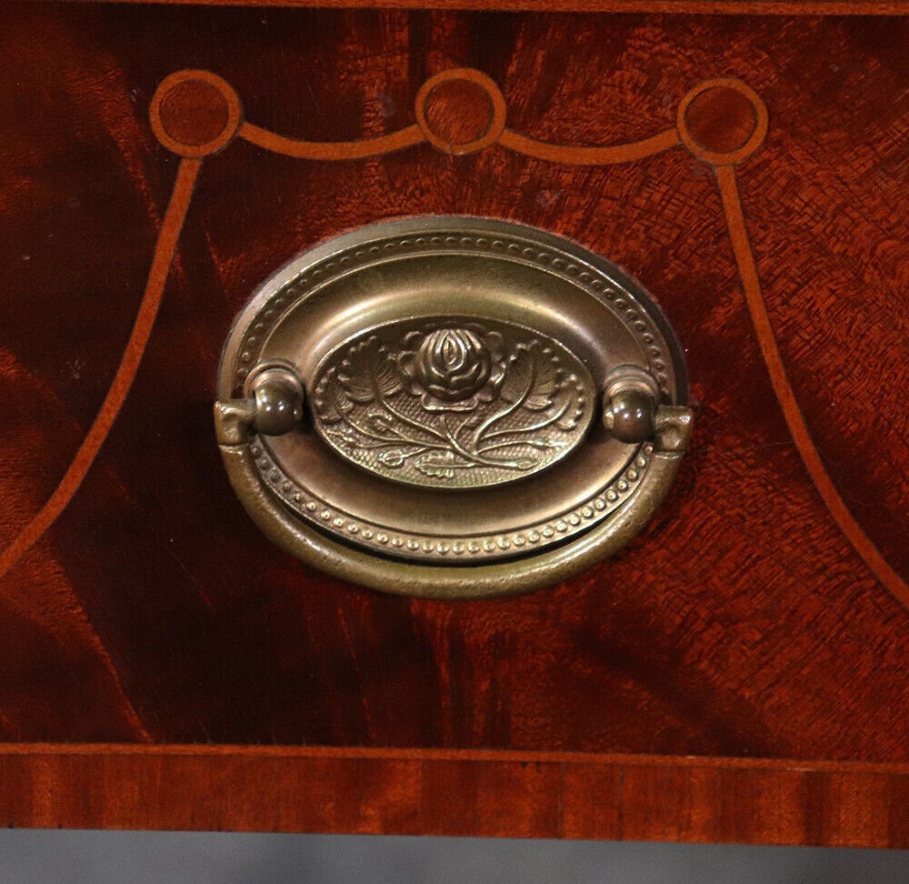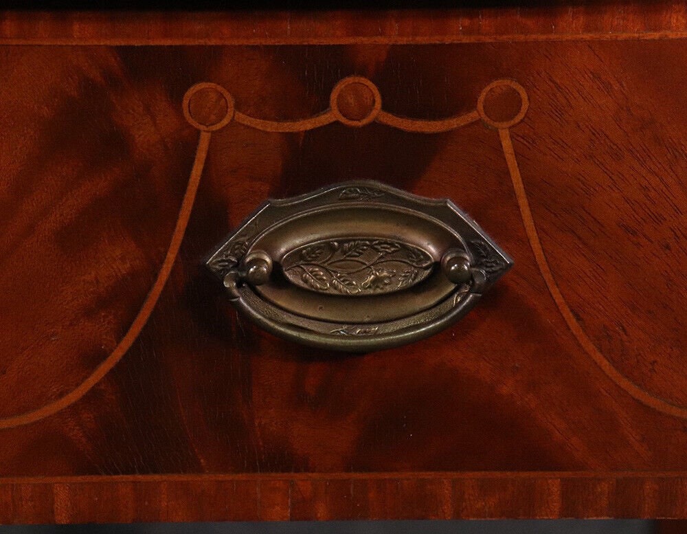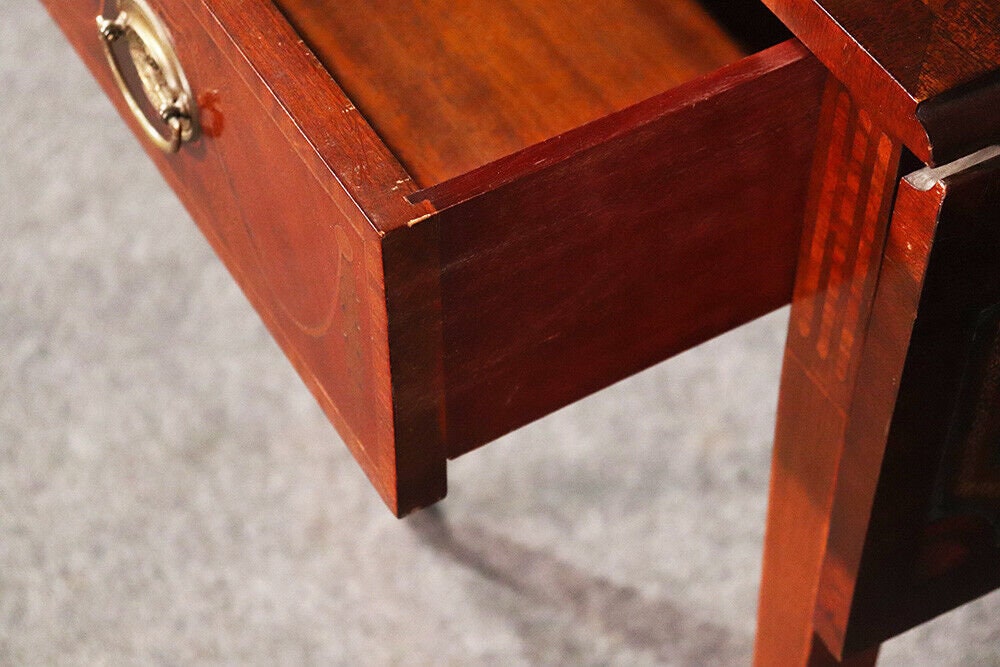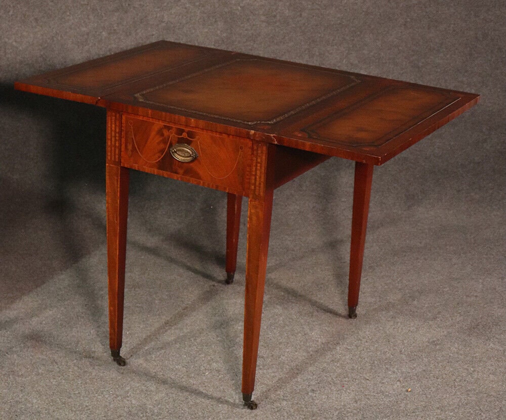 This pair of Sheraton style inlaid mahogany leather top pembroke drop leaf tables is a prime example of class and sophistication! These pieces are made of the highest quality from their high quality leather tops to the rich mahogany used making them truly special! These tables are perfect for your living room, office or anyplace of your choosing! They are in good antique condition with the exception of minor surface scratches as to be expected of antique items. There is a slight difference in the hardware of the tables, but it is hardly noticeable when spaced apart. Otherwise, in good condition!