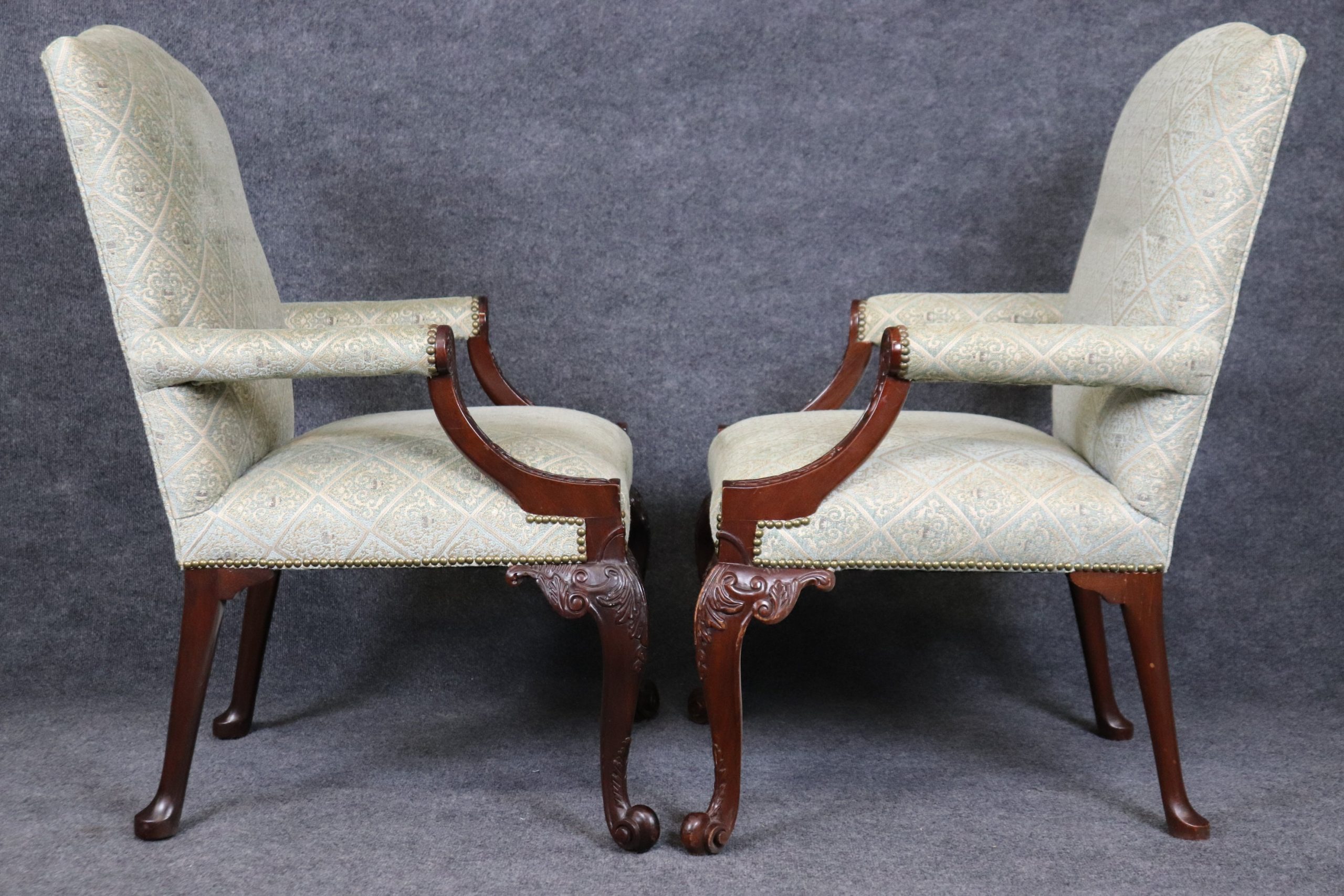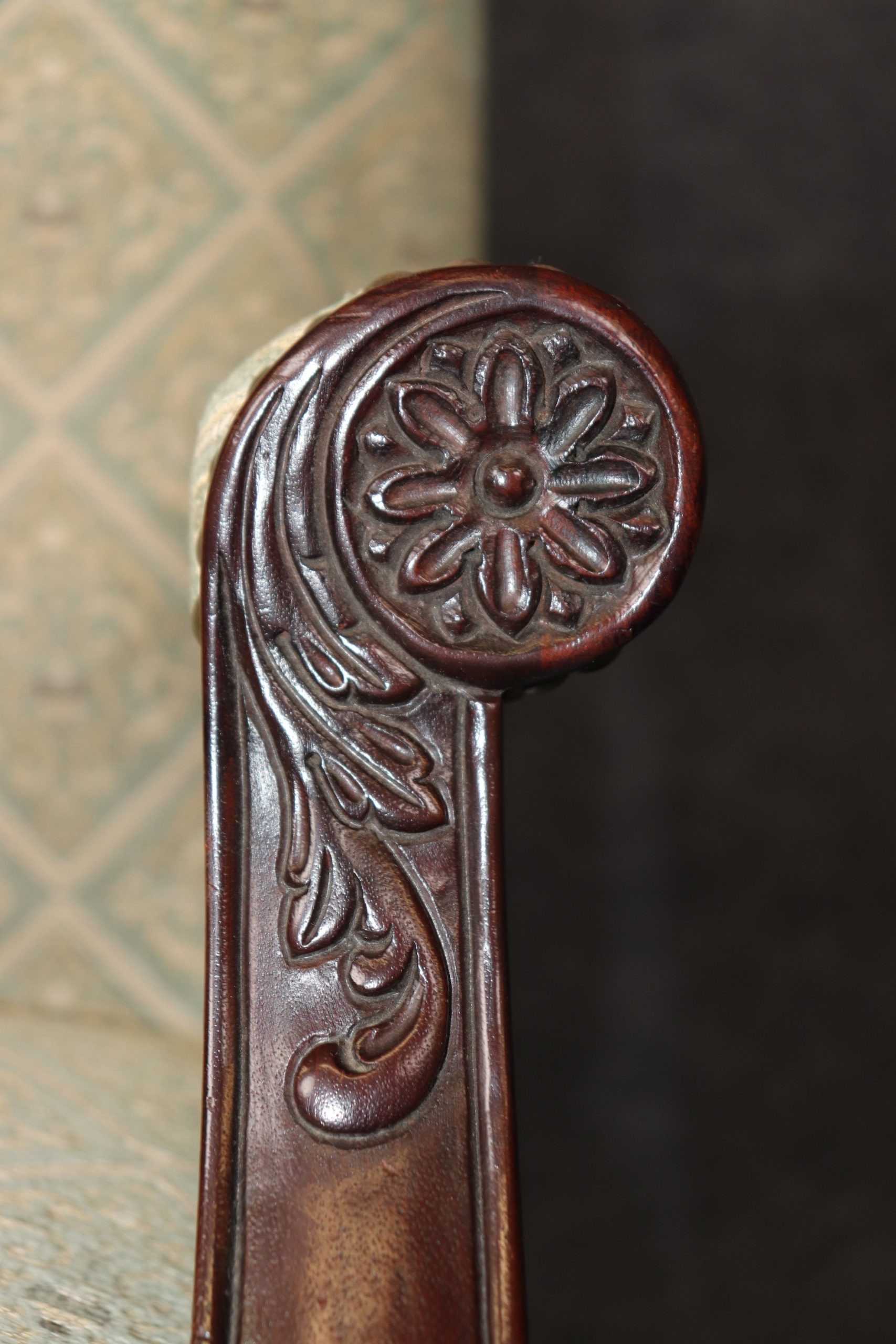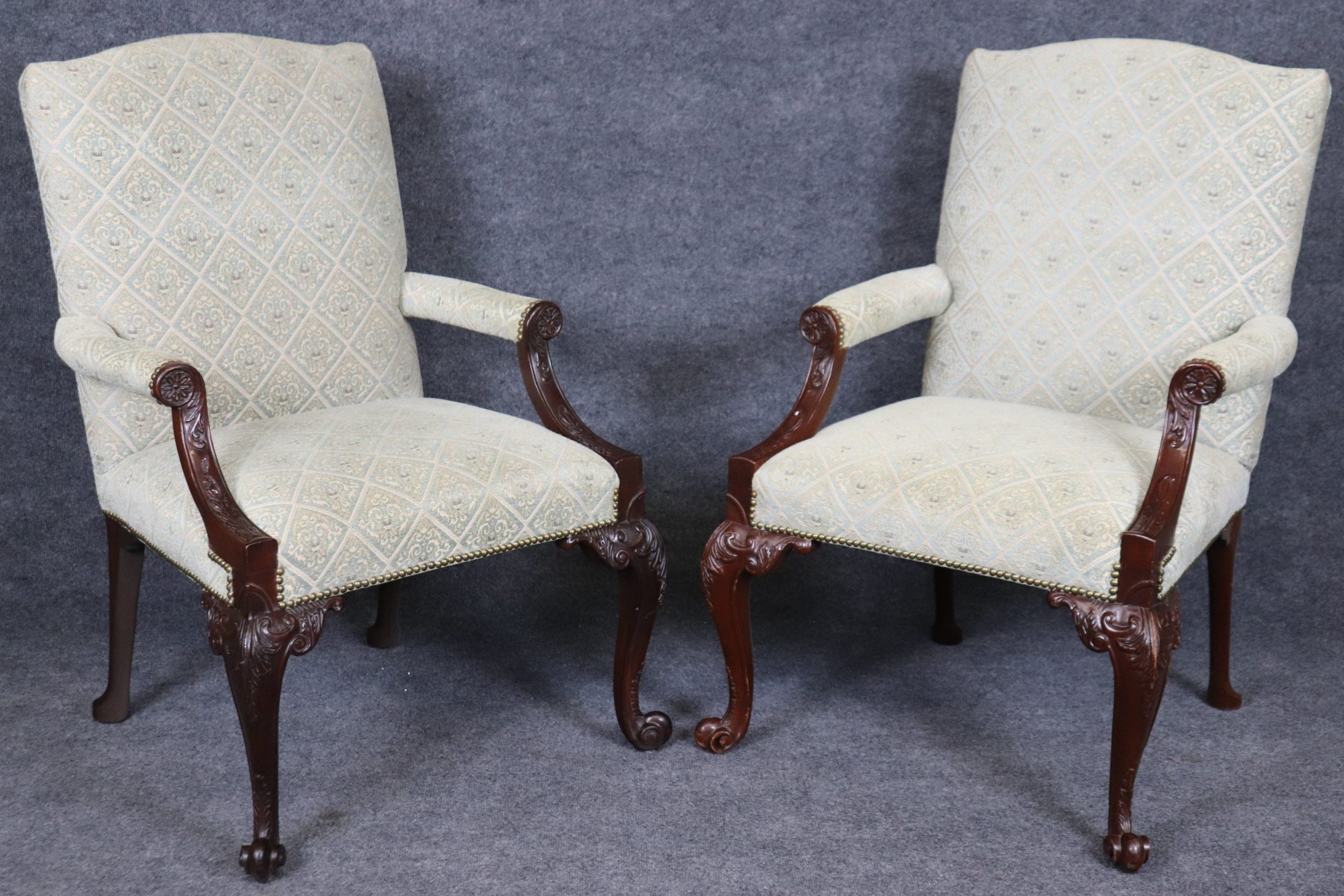 This pair of Chippendale style carved mahogany open armchairs is made of the highest quality and is perfect for you and your home! If you look at the photos provided, you will see the attention to detail within the carved frames, as well as the luxurious upholstery. This pair is perfect for any living room, bedroom, entryway or office and is bound to bring a sense of luxury and class into your place of choosing! One tell tale sign that this pair is made with high end materials is the fact that each chair is fairly heavy something that you wont find in furniture from Ikea or other big name retailers in todays world. Antique furniture and vintage pieces have stood the test of time and this pair of chairs is no exception! With their quality materials and great craftsmanship this pair will last you and your family for years to come! This pair is in good vintage condition with some light surface scratches, minor wear to upholstery and minor finish loss to frames. Otherwise, good condition.