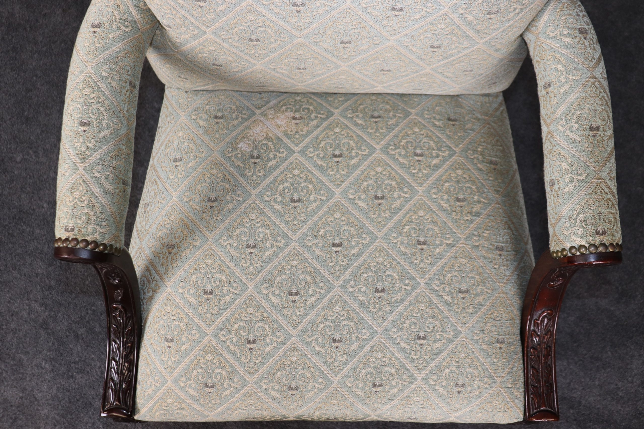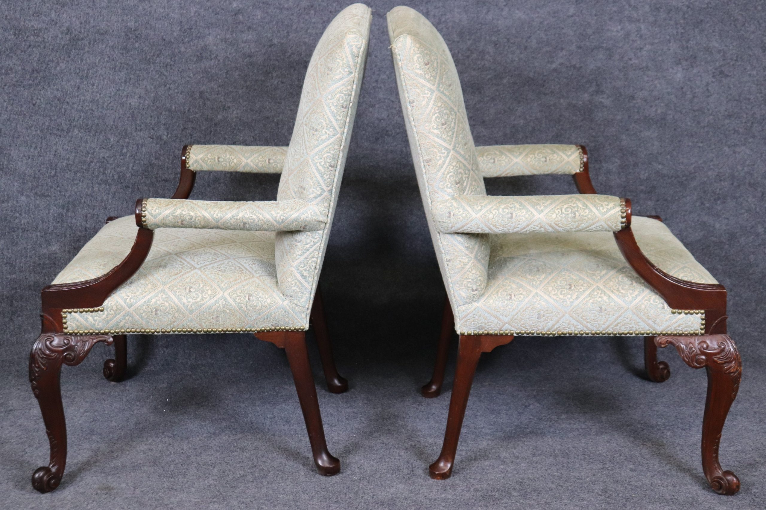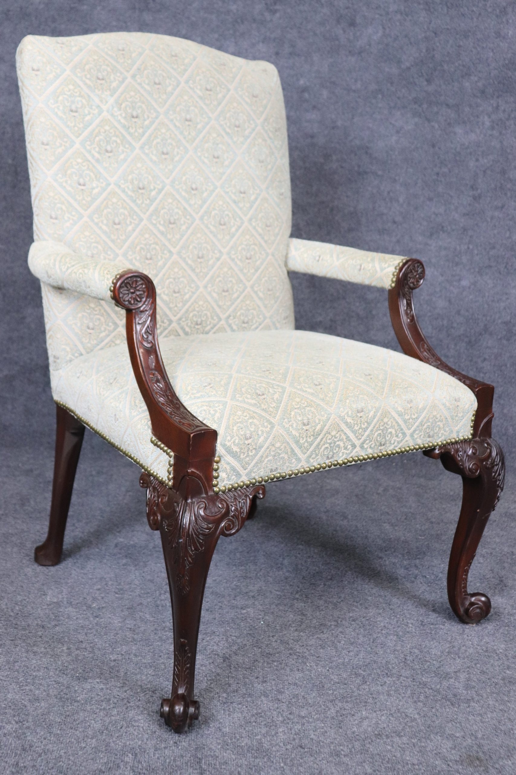 This pair of Chippendale style carved mahogany open armchairs is made of the highest quality and is perfect for you and your home! If you look at the photos provided, you will see the attention to detail within the carved frames, as well as the luxurious upholstery. This pair is perfect for any living room, bedroom, entryway or office and is bound to bring a sense of luxury and class into your place of choosing! One tell tale sign that this pair is made with high end materials is the fact that each chair is fairly heavy something that you wont find in furniture from Ikea or other big name retailers in todays world. Antique furniture and vintage pieces have stood the test of time and this pair of chairs is no exception! With their quality materials and great craftsmanship this pair will last you and your family for years to come! This pair is in good vintage condition with some light surface scratches, minor wear to upholstery and minor finish loss to frames. Otherwise, good condition.
