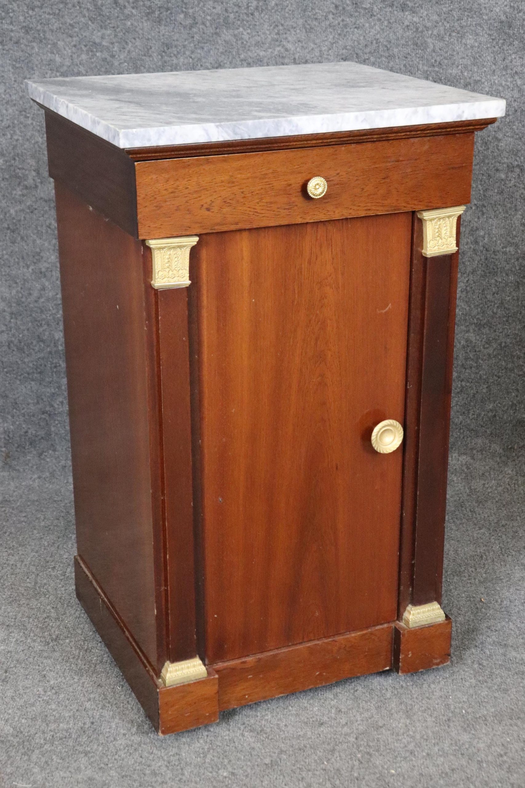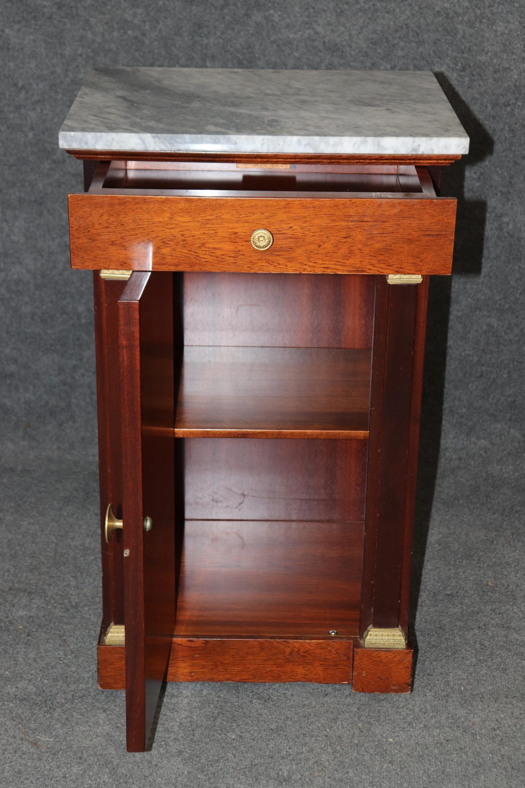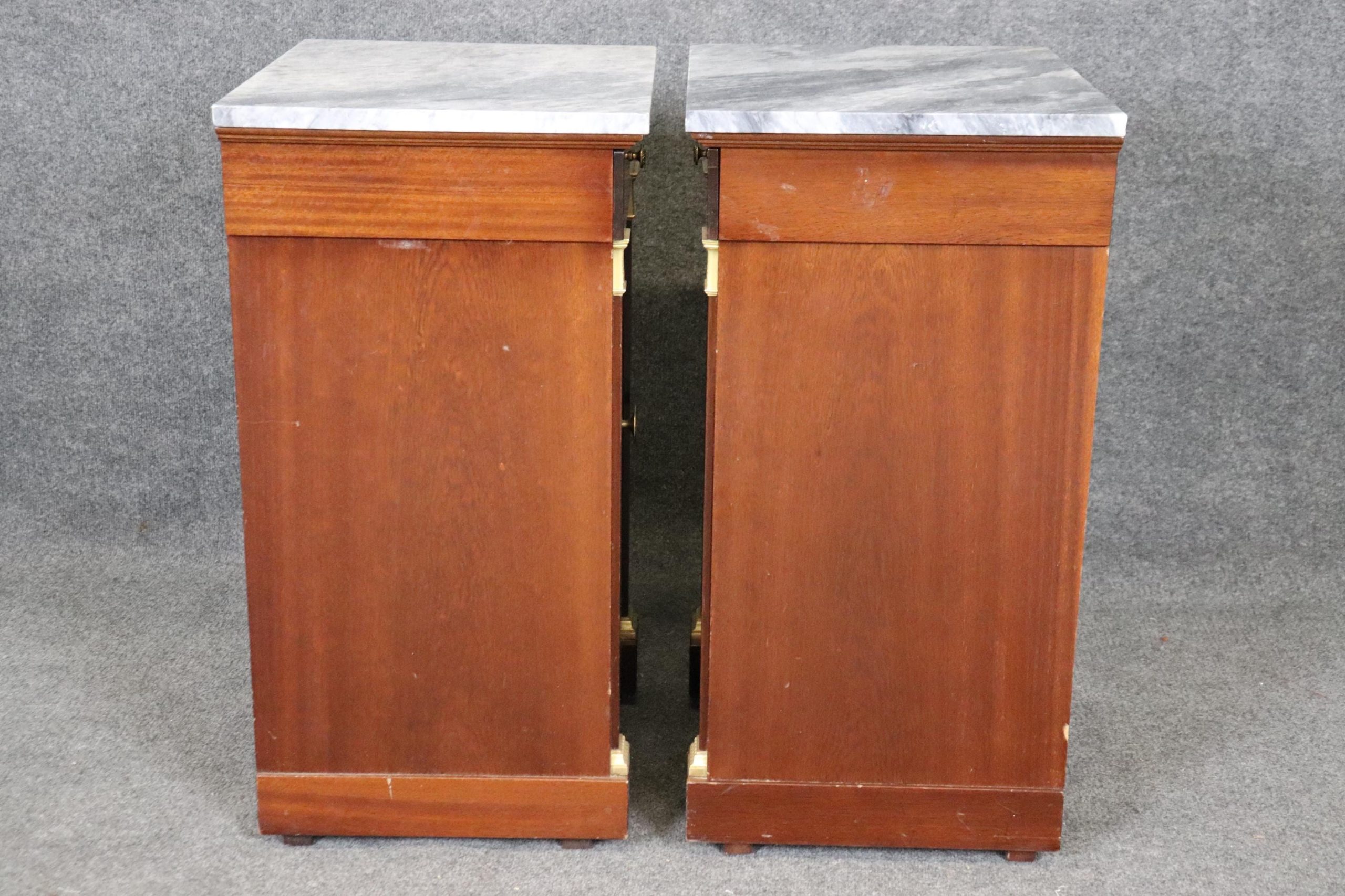 This vintage pair of French Empire style marble top nightstands is truly unique and made with great detail and quality! This pair is perfect for use as a pair of nightstands as well as a pair of end tables or side tables. Each end table has 1 drawer over a door containing 1 shelf, perfect for storing your personal belongings! If you look at the photos provided, you can see the attention to detail in the sophisticated brass mounts. This pair is bound to bring a luxurious and classy look into your home and will have your guests mesmerized by their detail and how unique they are! Antique furniture and vintage pieces have stood the test of time and this pair of nightstands is no exception. With their quality materials and great craftsmanship this pair is bound to last you and your family for many years to come. The pair is in vintage condition with minor finish loss to the pair as well as some light surface scratches, but otherwise good condition.