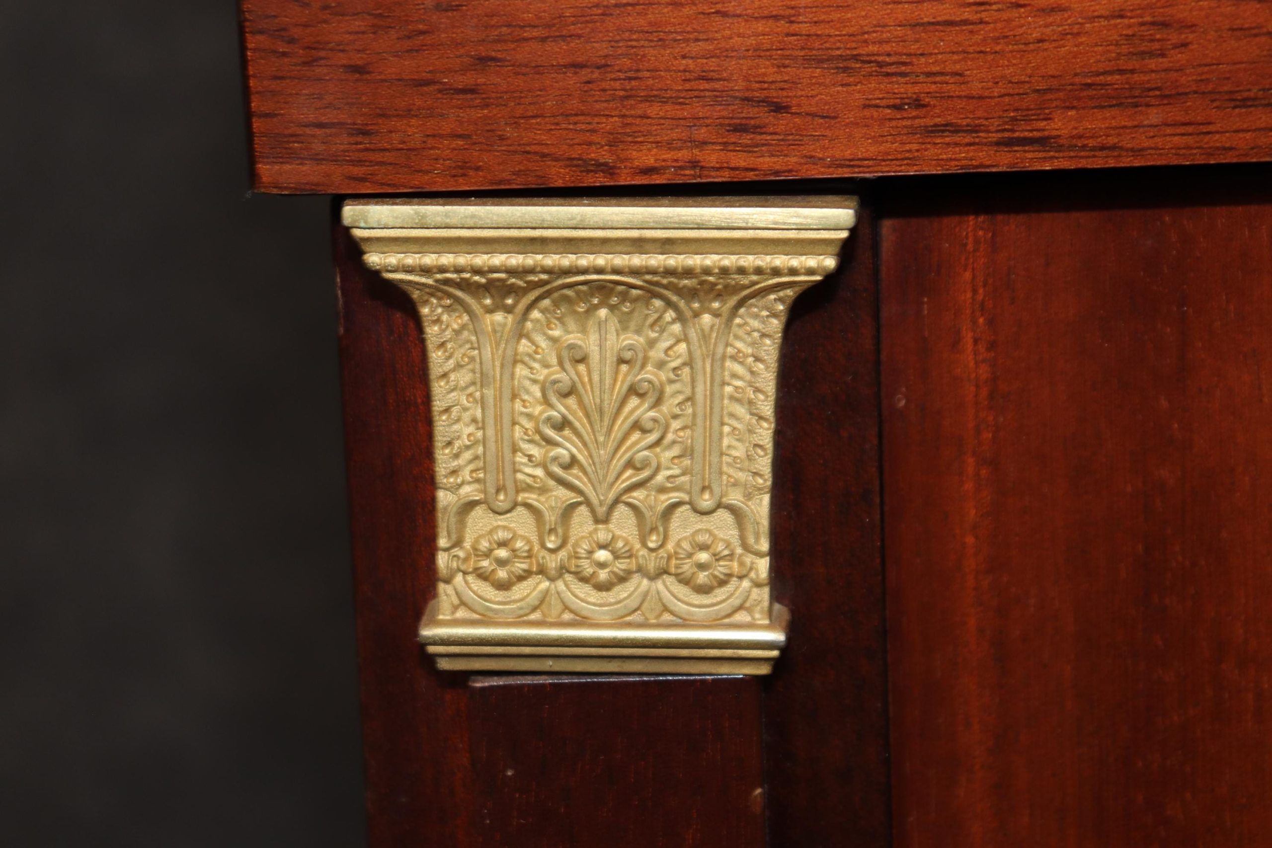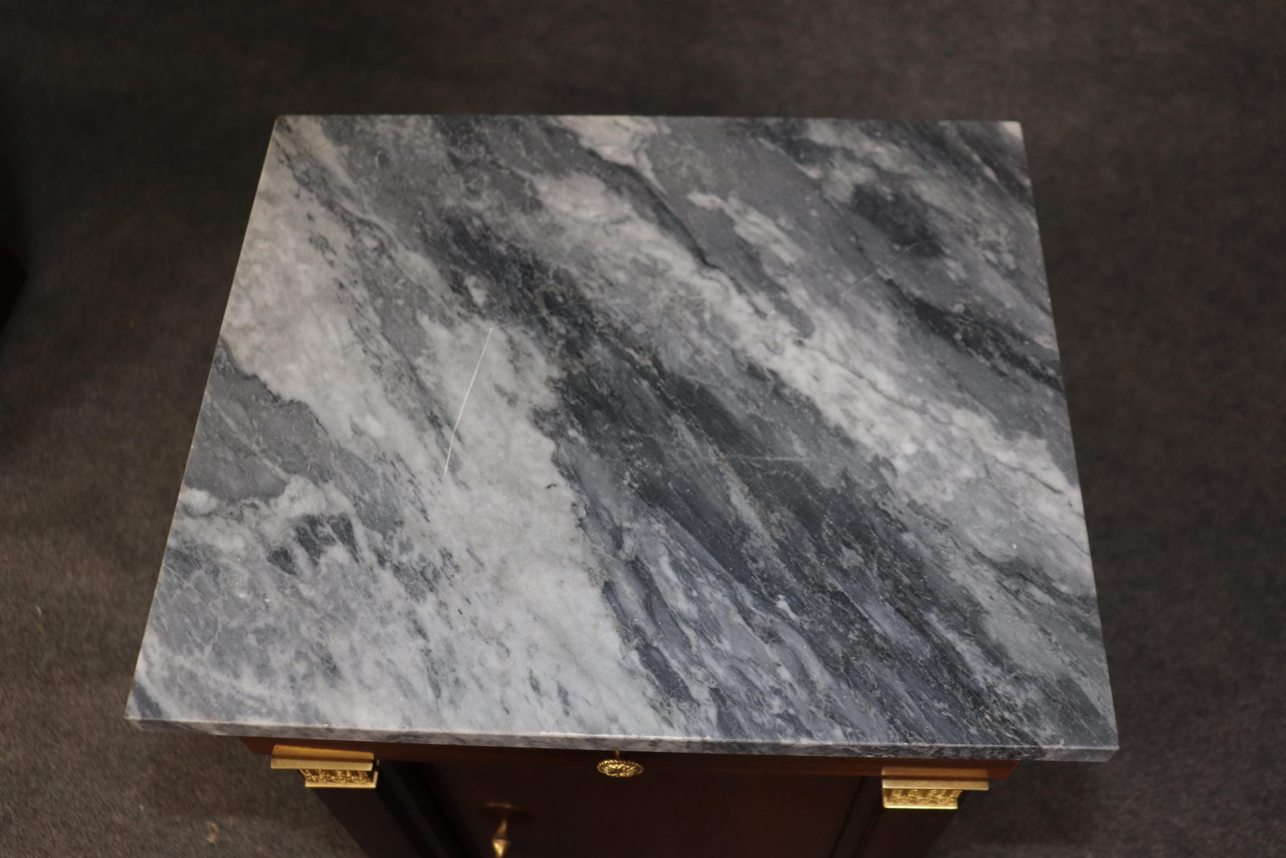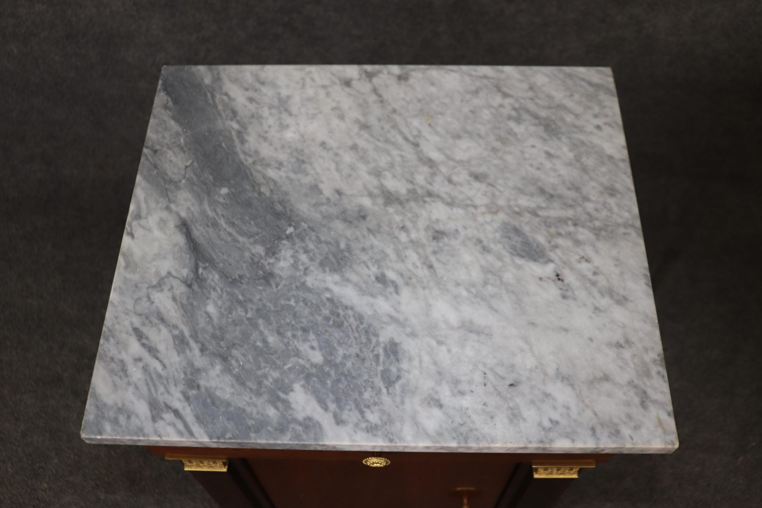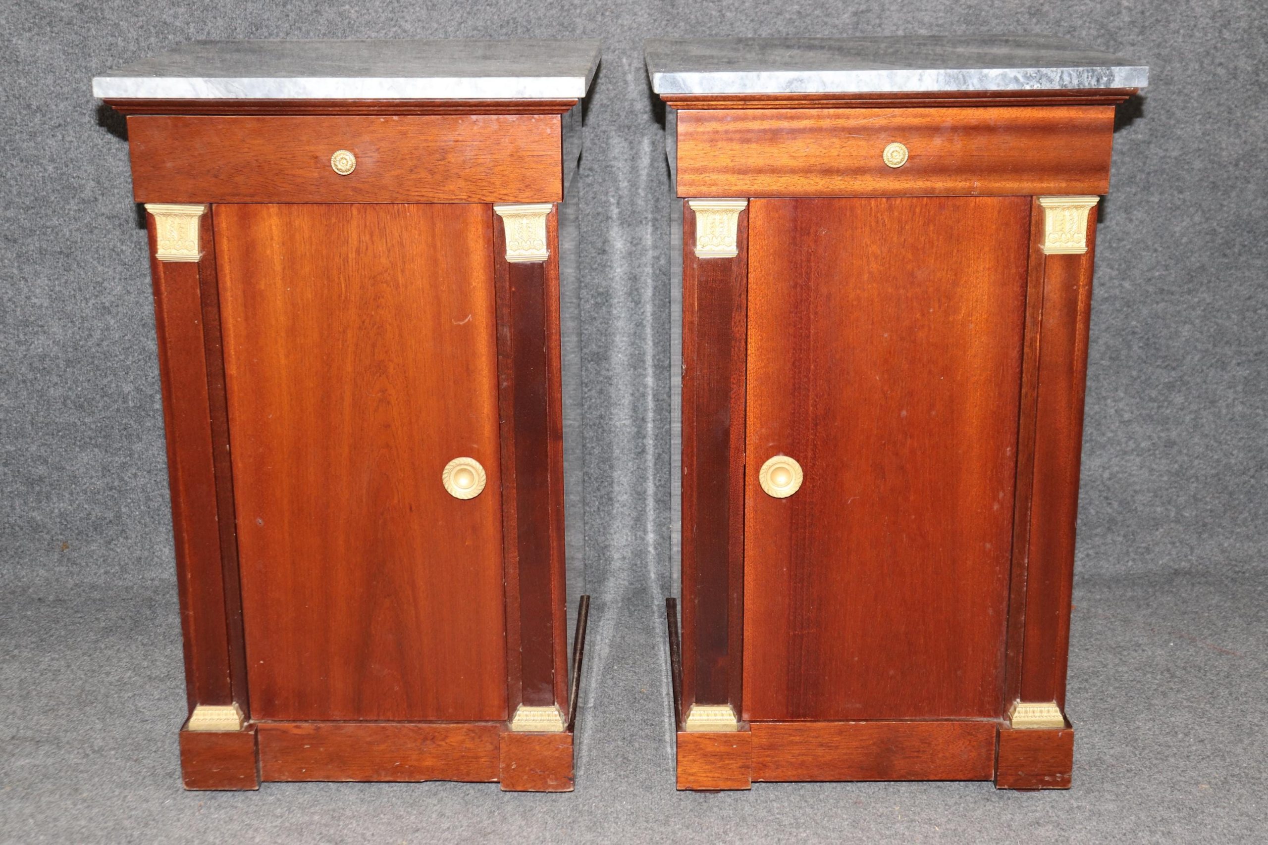 This vintage pair of French Empire style marble top nightstands is truly unique and made with great detail and quality! This pair is perfect for use as a pair of nightstands as well as a pair of end tables or side tables. Each end table has 1 drawer over a door containing 1 shelf, perfect for storing your personal belongings! If you look at the photos provided, you can see the attention to detail in the sophisticated brass mounts. This pair is bound to bring a luxurious and classy look into your home and will have your guests mesmerized by their detail and how unique they are! Antique furniture and vintage pieces have stood the test of time and this pair of nightstands is no exception. With their quality materials and great craftsmanship this pair is bound to last you and your family for many years to come. The pair is in vintage condition with minor finish loss to the pair as well as some light surface scratches, but otherwise good condition.